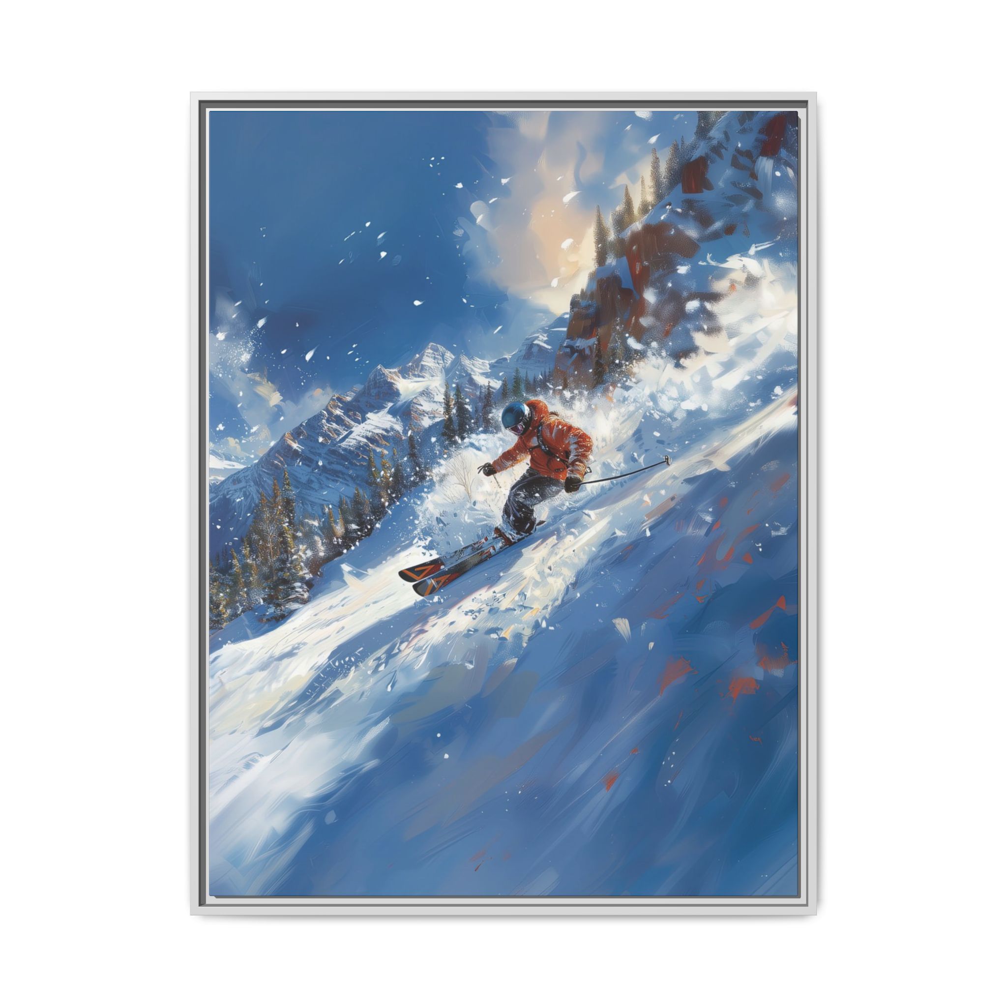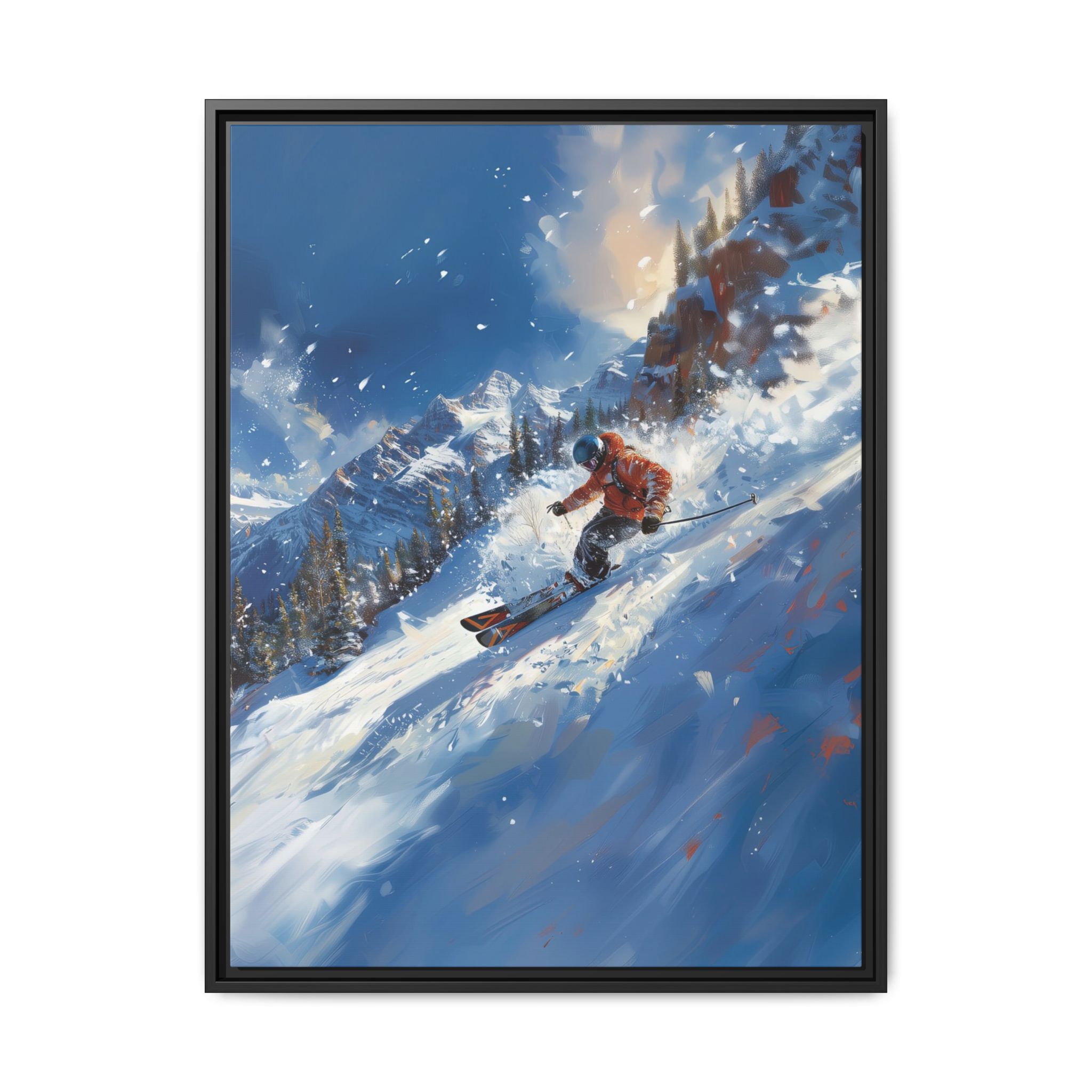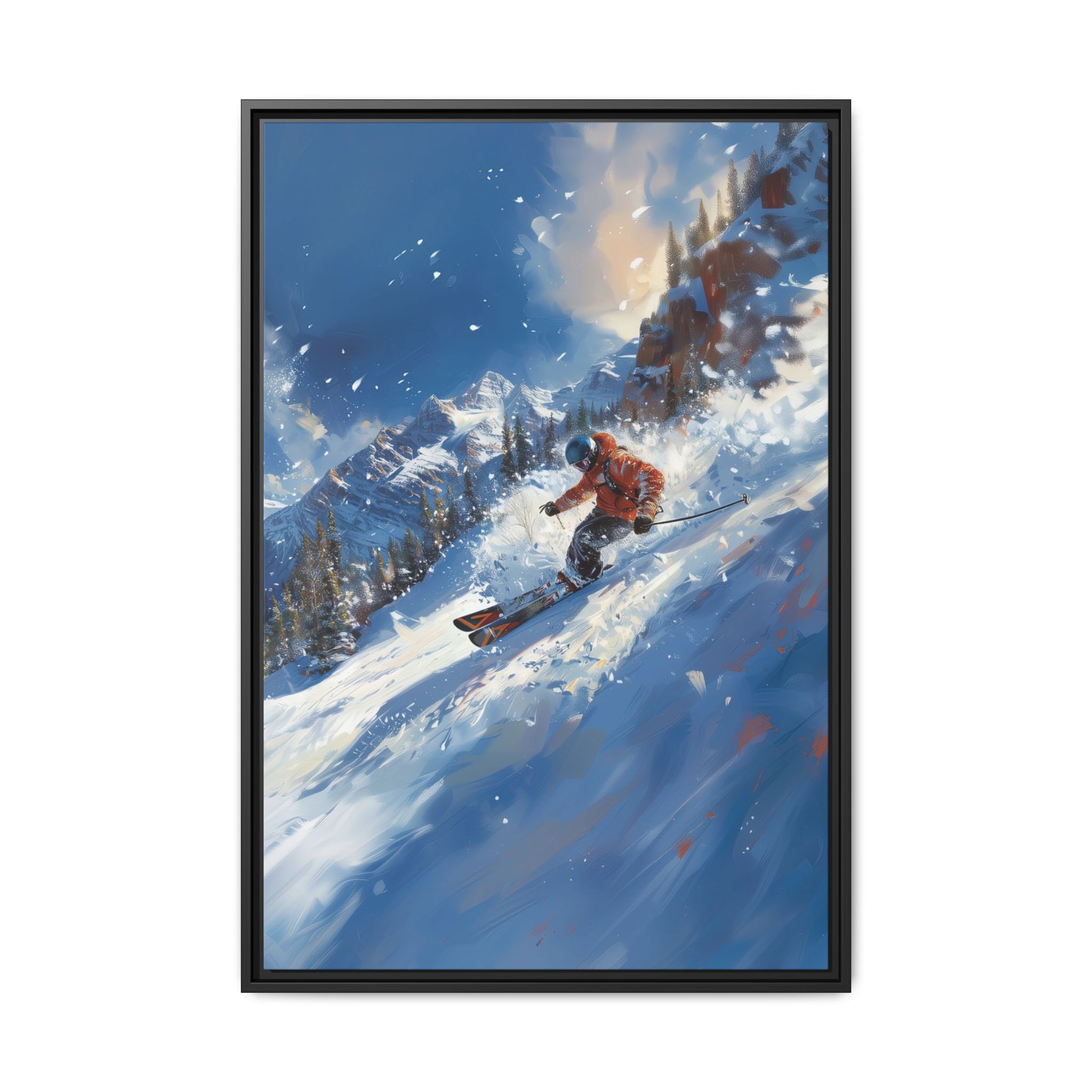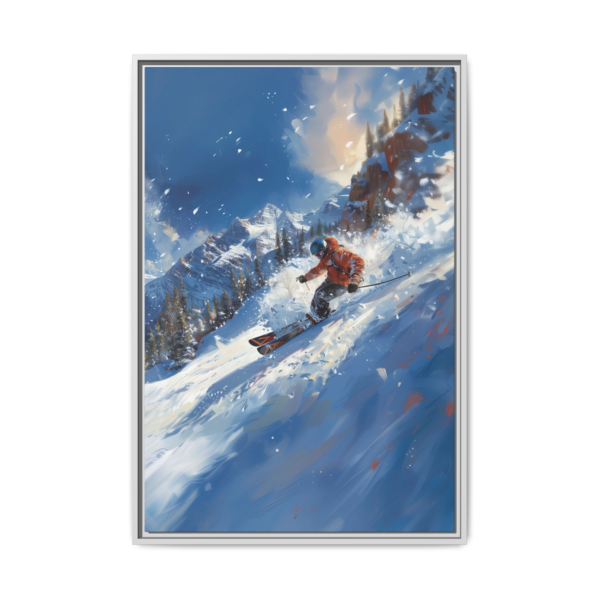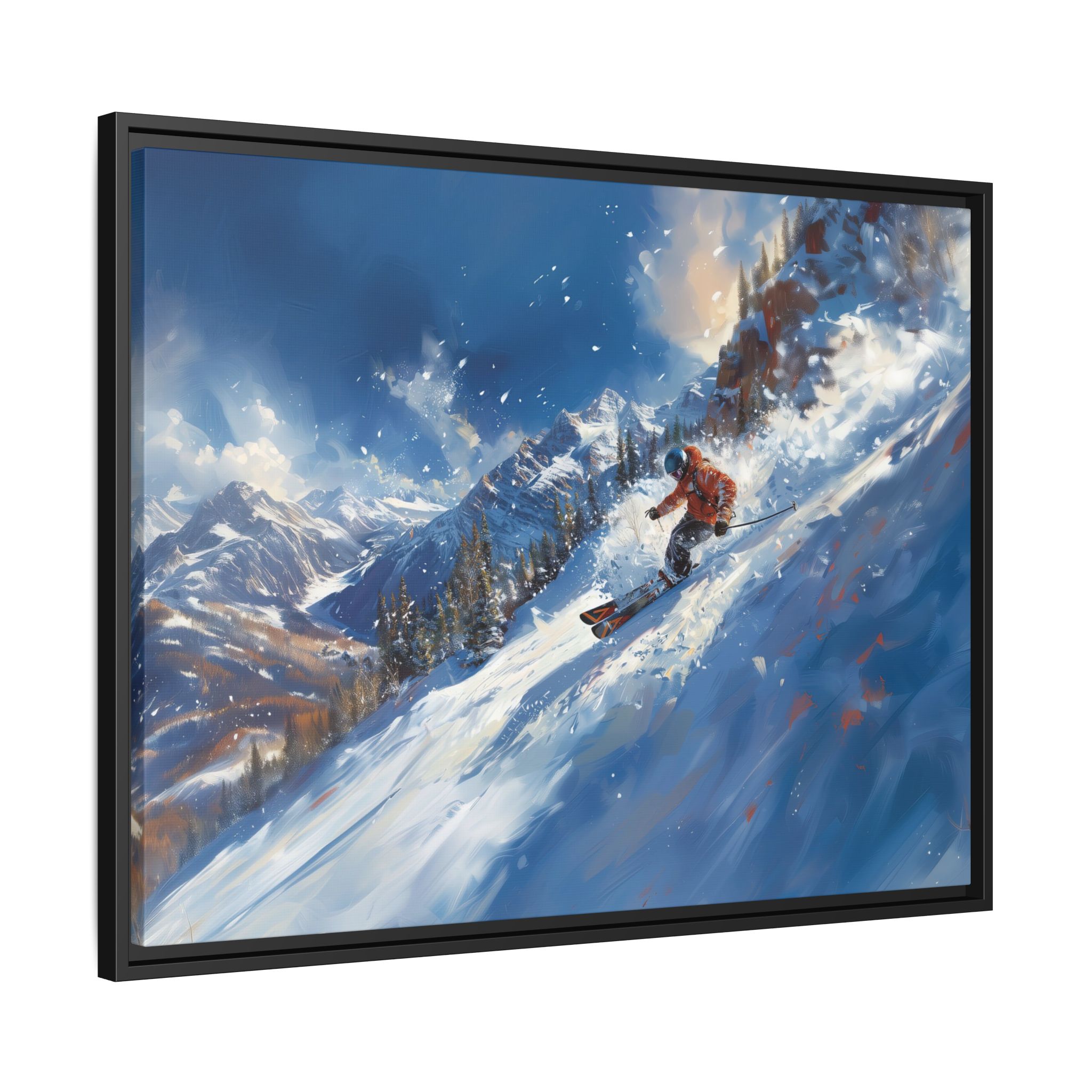 A dynamic action scene of skiers free skiing down the slopes in deep snow, a beutiful action landscape with intensity and excitement. The high-speed motion creates swirling snow clouds around them as they land on a snowy mountain slope. Experience the excitement of skiing with this dynamic action style canvas print. Perfect for adrenaline junkies and winter sports enthusiasts, this canvas brings intensity and motion to any room. Ideal for winter decor, sports enthusiasts, and anyone looking to add a thrilling touch to their space.