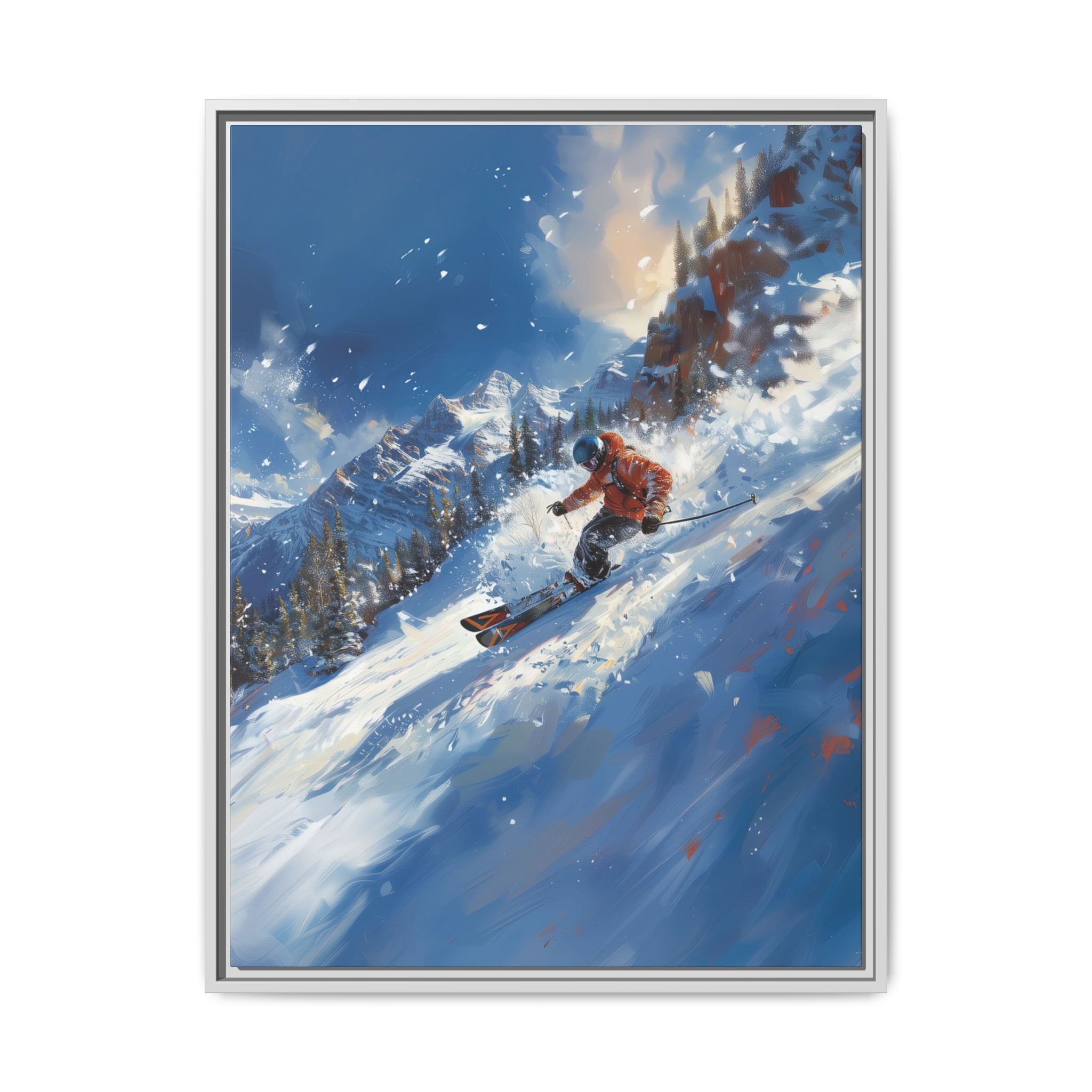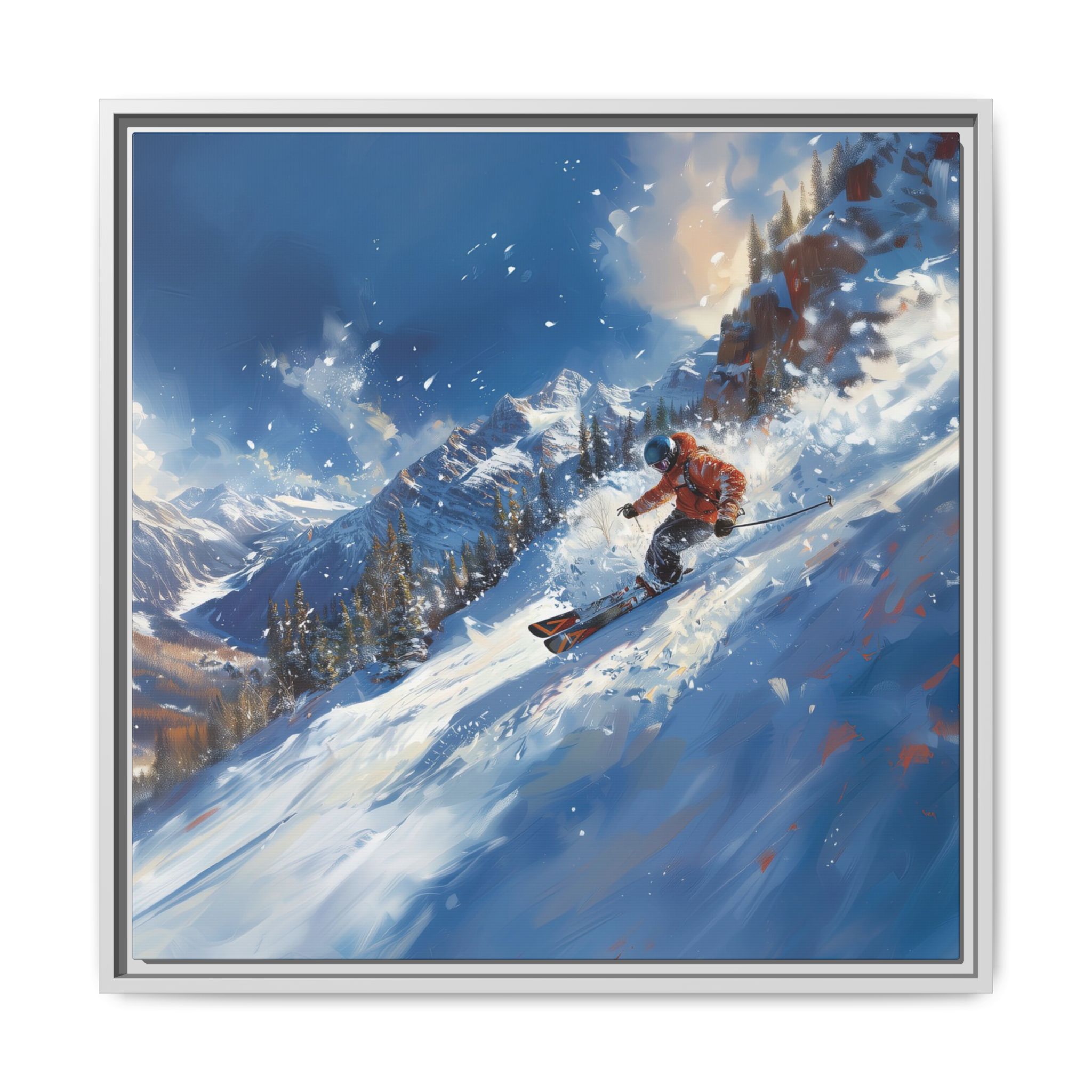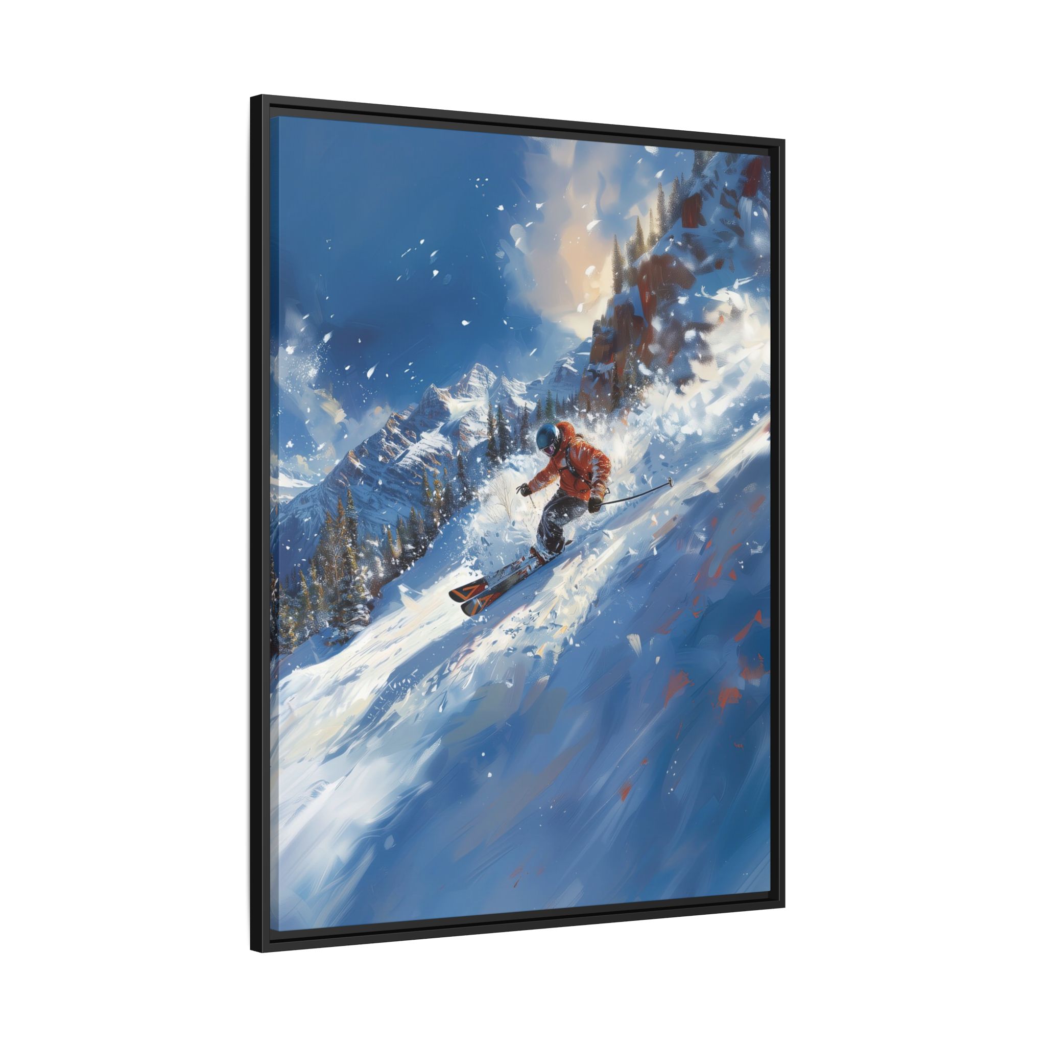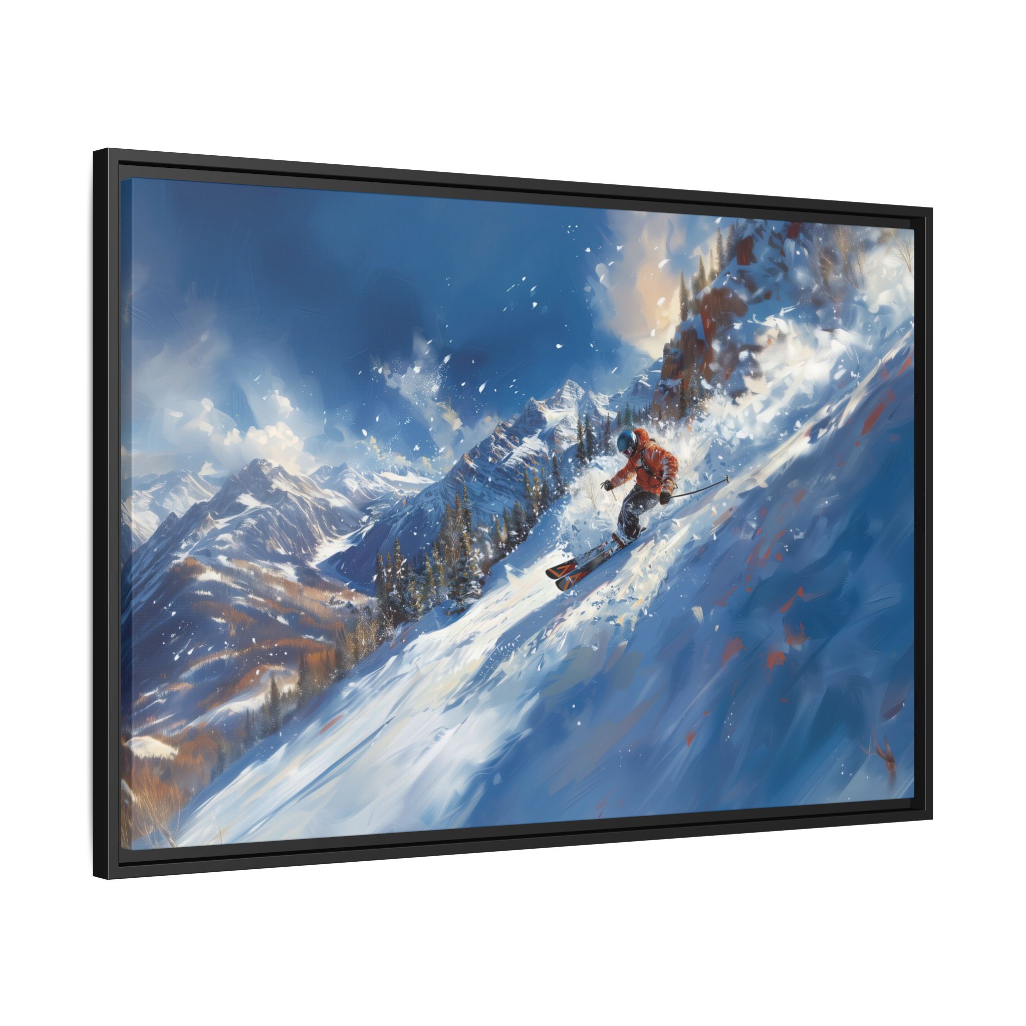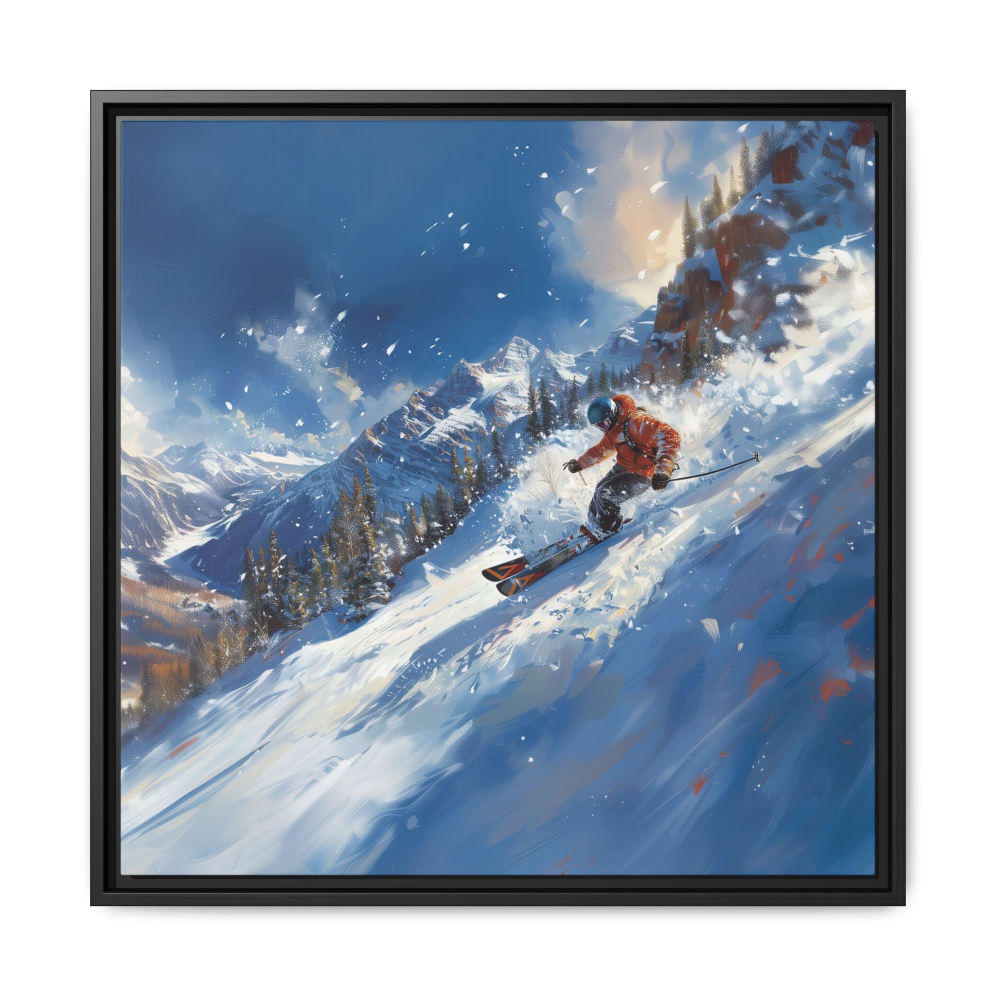 A dynamic action scene of skiers free skiing down the slopes in deep snow, a beutiful action landscape with intensity and excitement. The high-speed motion creates swirling snow clouds around them as they land on a snowy mountain slope. Experience the excitement of skiing with this dynamic action style canvas print. Perfect for adrenaline junkies and winter sports enthusiasts, this canvas brings intensity and motion to any room. Ideal for winter decor, sports enthusiasts, and anyone looking to add a thrilling touch to their space.