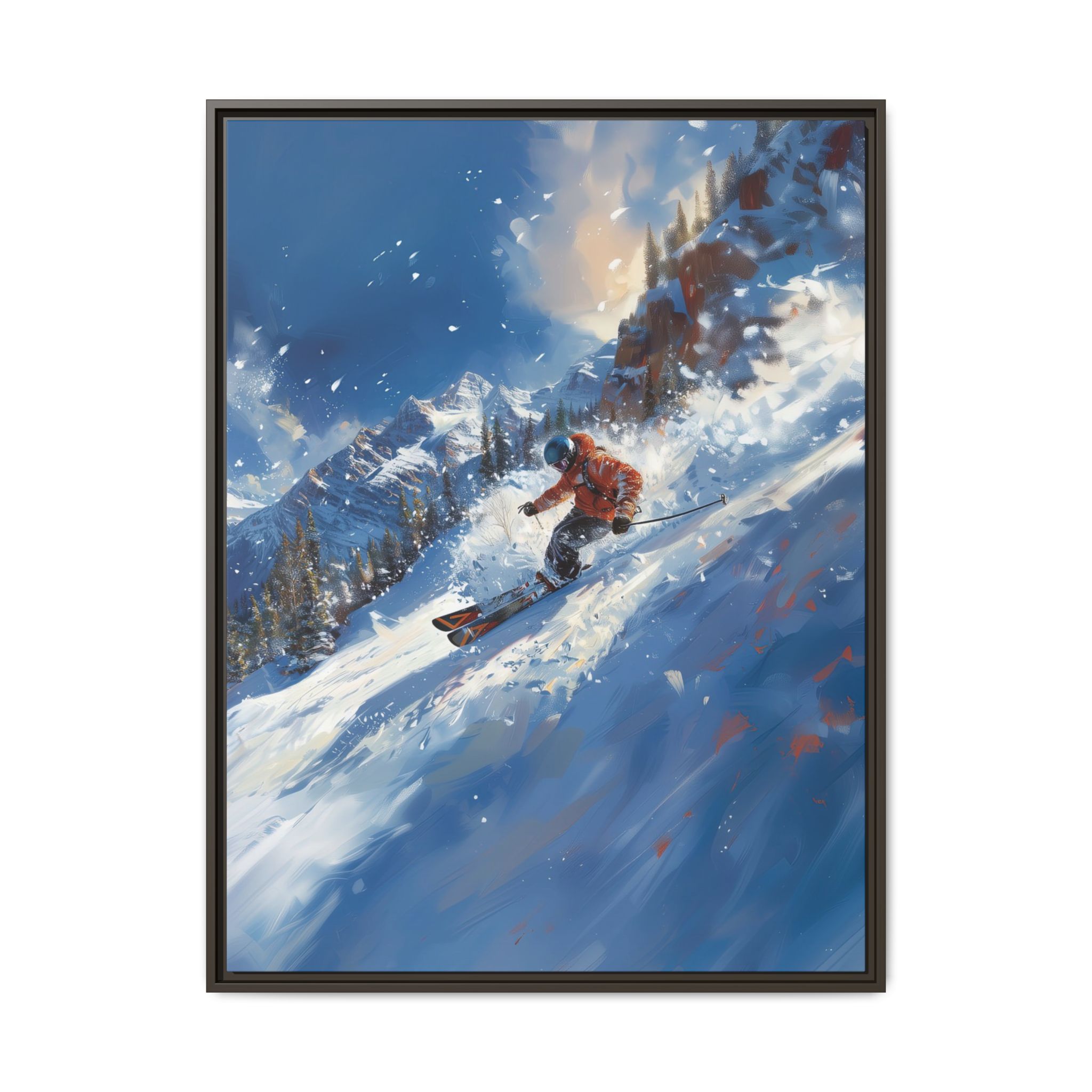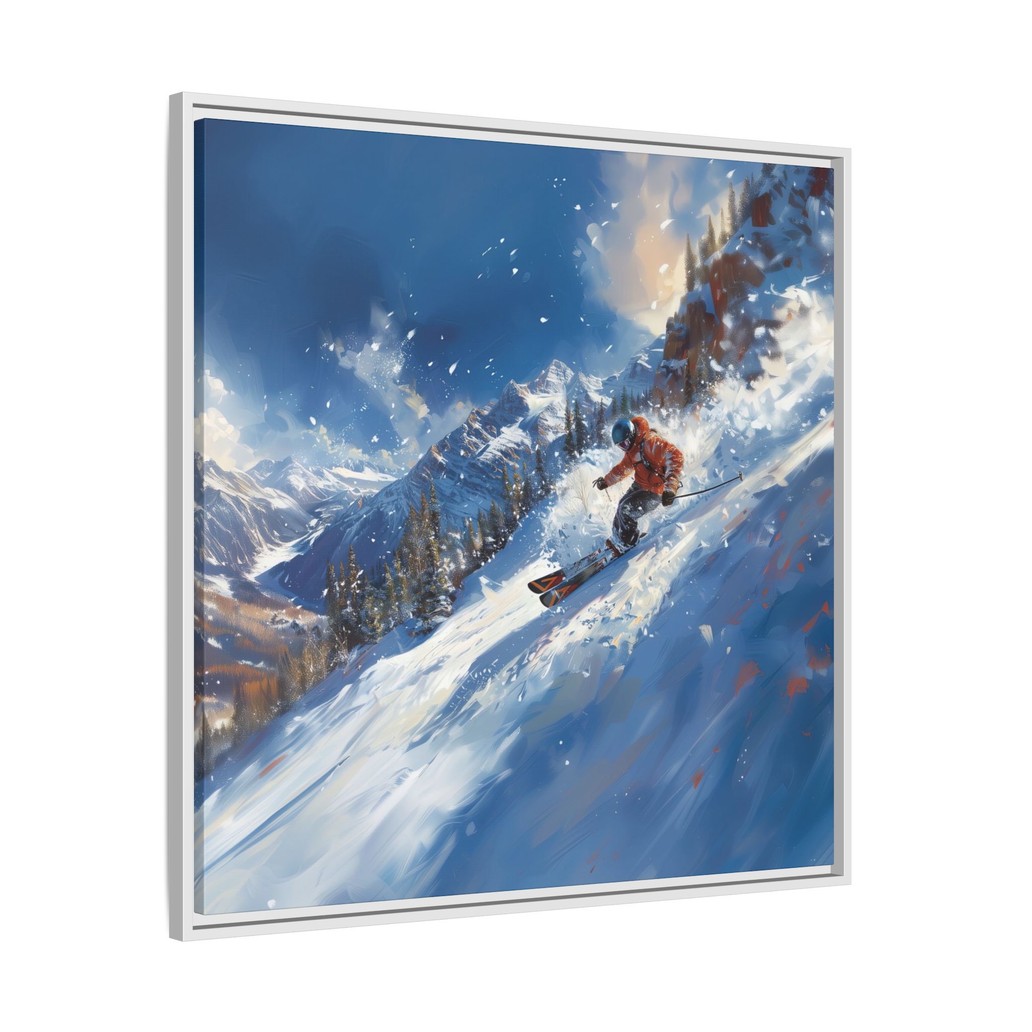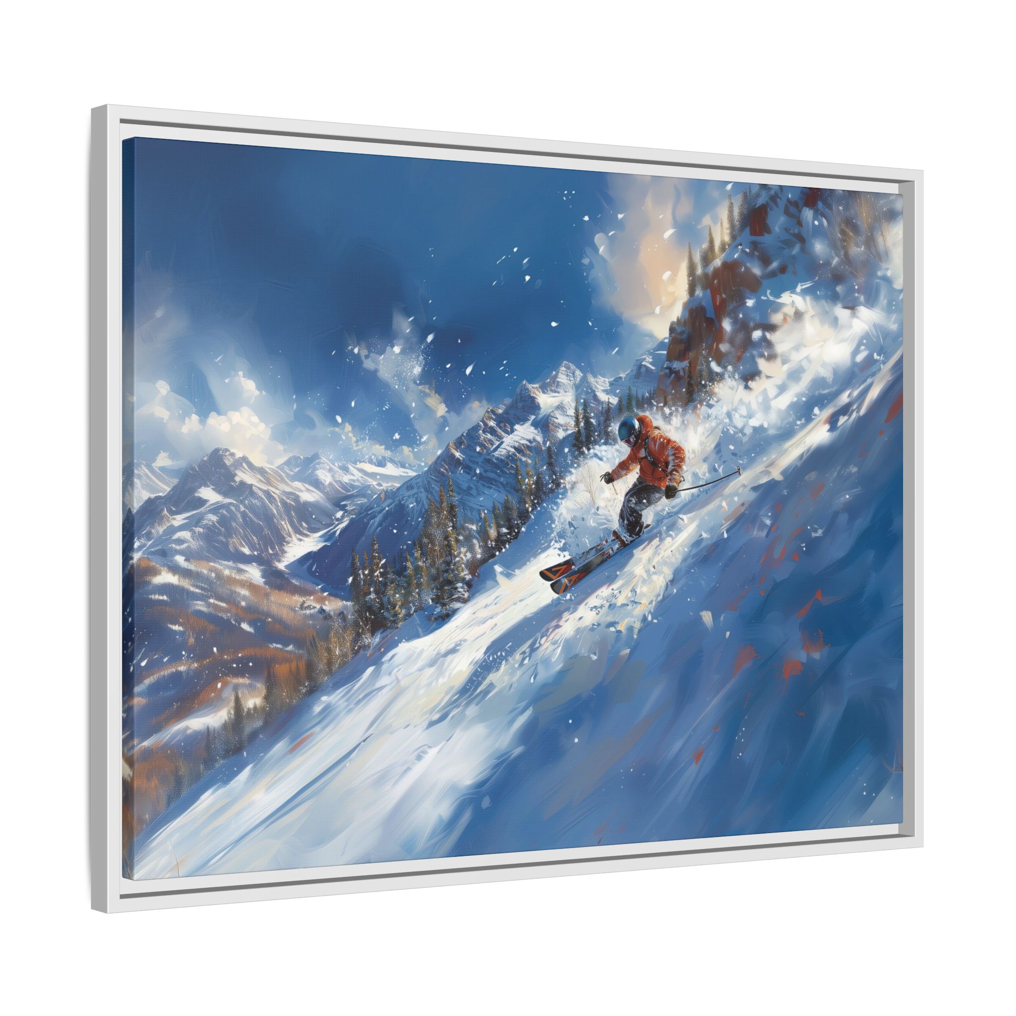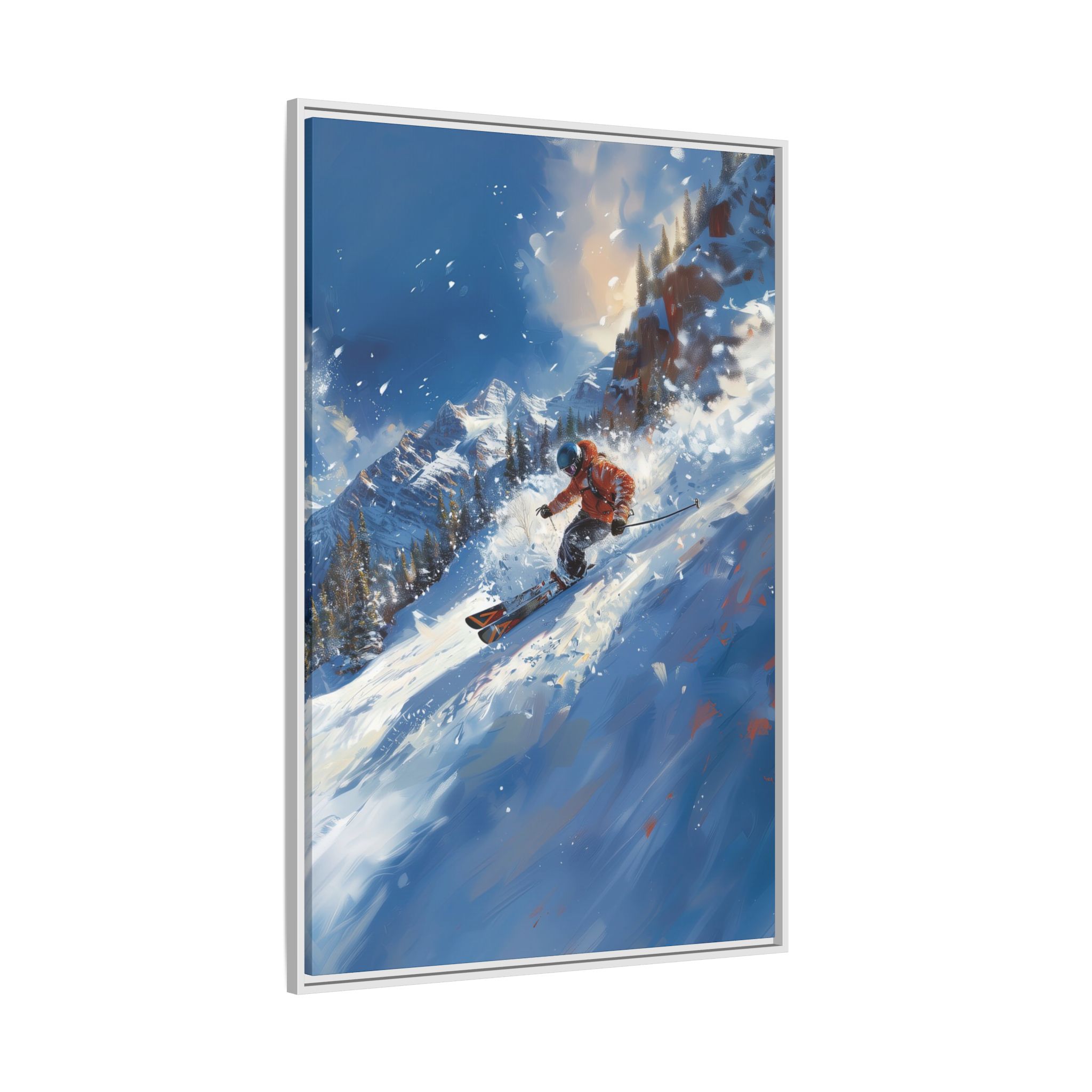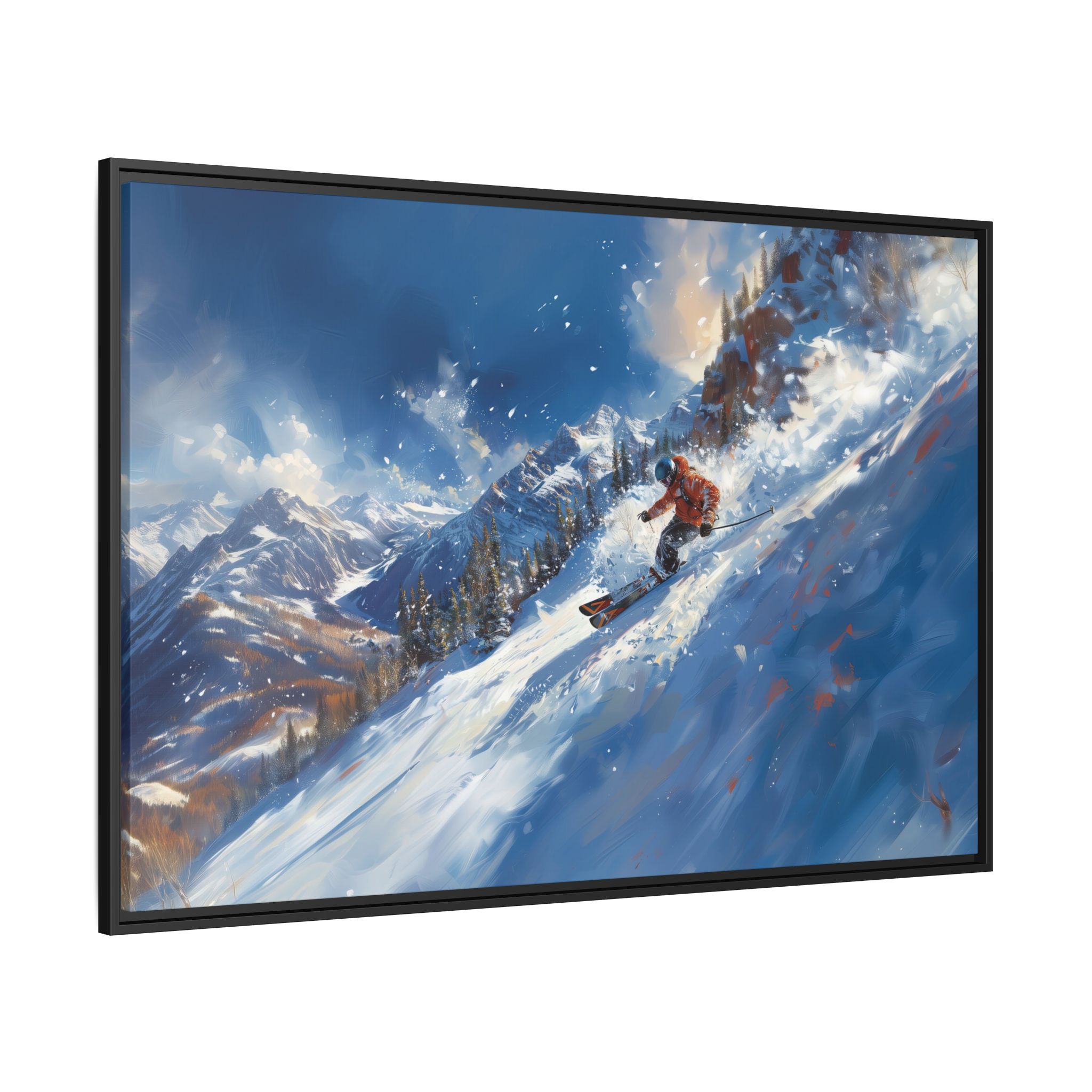 A dynamic action scene of skiers free skiing down the slopes in deep snow, a beutiful action landscape with intensity and excitement. The high-speed motion creates swirling snow clouds around them as they land on a snowy mountain slope. Experience the excitement of skiing with this dynamic action style canvas print. Perfect for adrenaline junkies and winter sports enthusiasts, this canvas brings intensity and motion to any room. Ideal for winter decor, sports enthusiasts, and anyone looking to add a thrilling touch to their space.