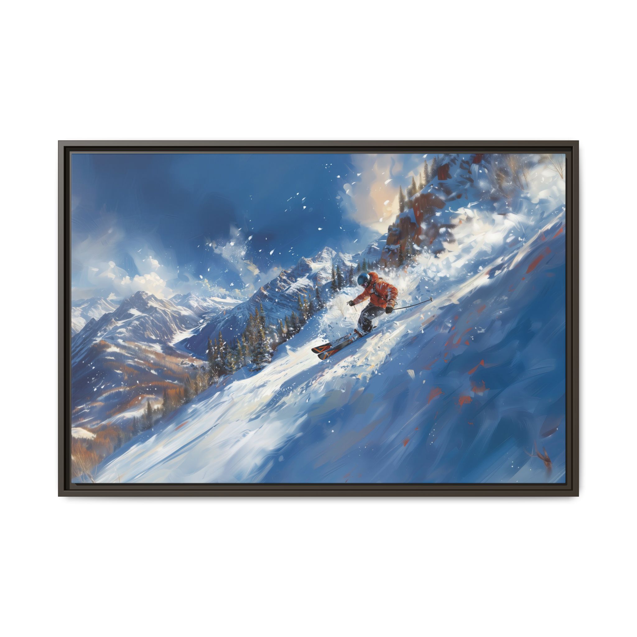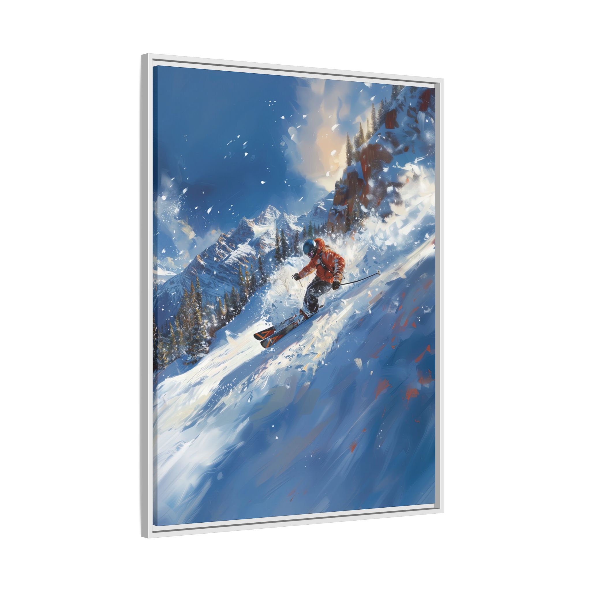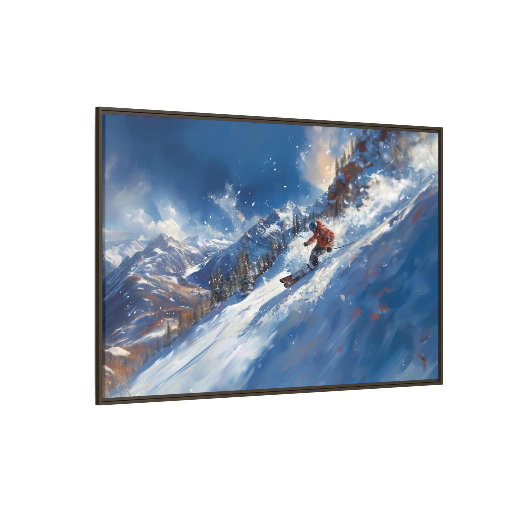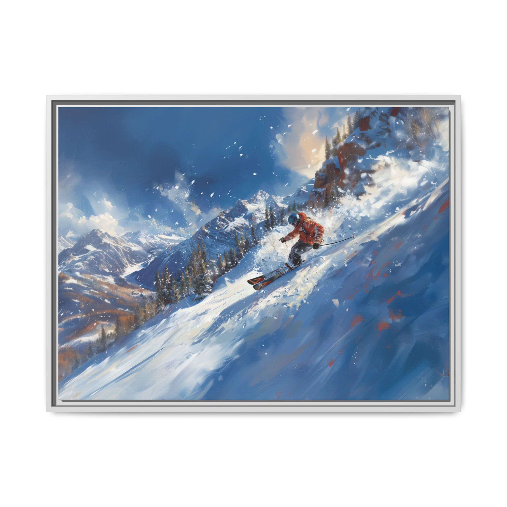 A dynamic action scene of skiers free skiing down the slopes in deep snow, a beutiful action landscape with intensity and excitement. The high-speed motion creates swirling snow clouds around them as they land on a snowy mountain slope. Experience the excitement of skiing with this dynamic action style canvas print. Perfect for adrenaline junkies and winter sports enthusiasts, this canvas brings intensity and motion to any room. Ideal for winter decor, sports enthusiasts, and anyone looking to add a thrilling touch to their space.