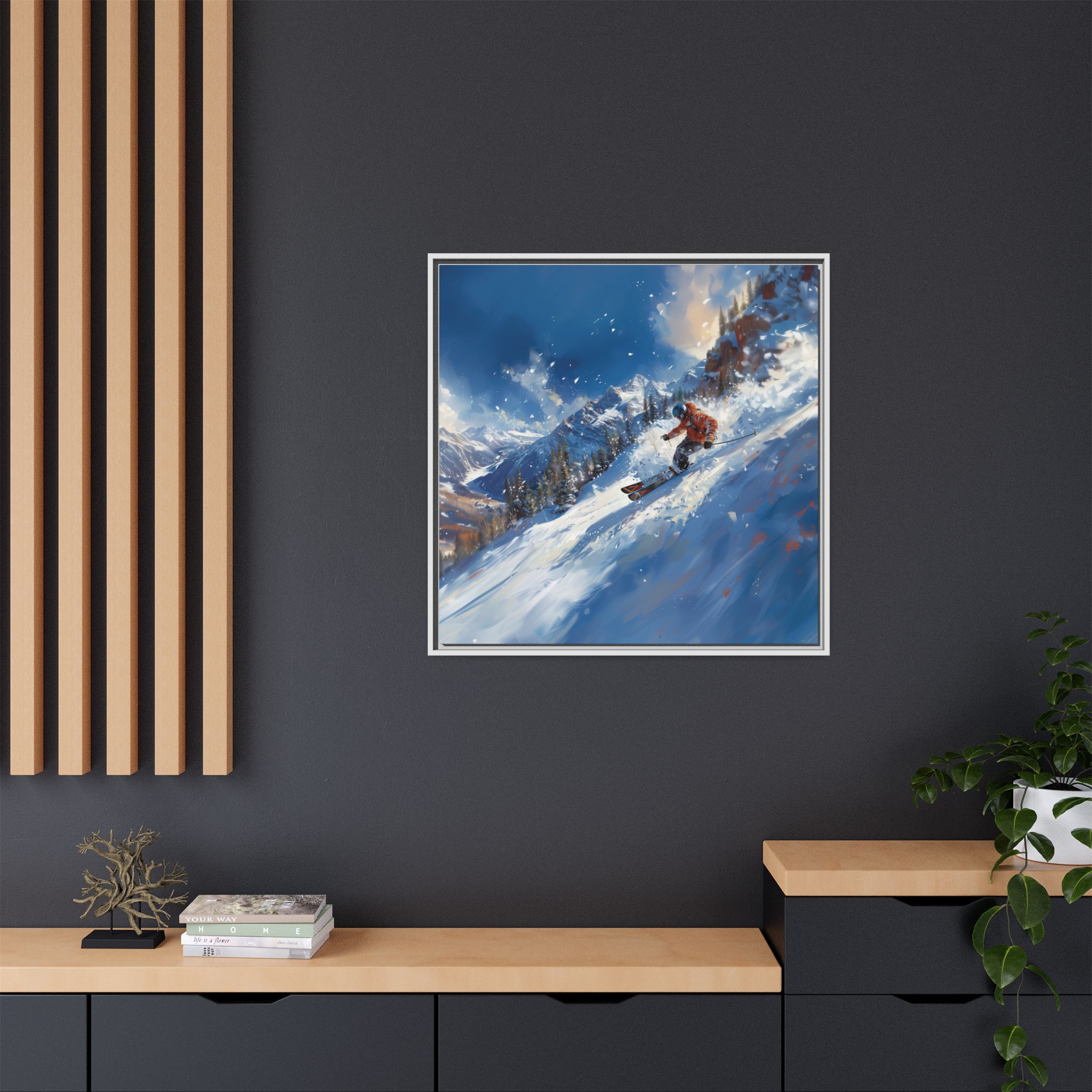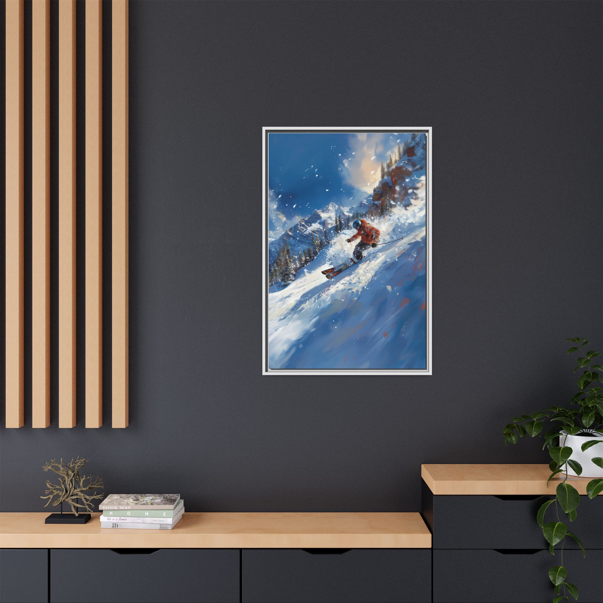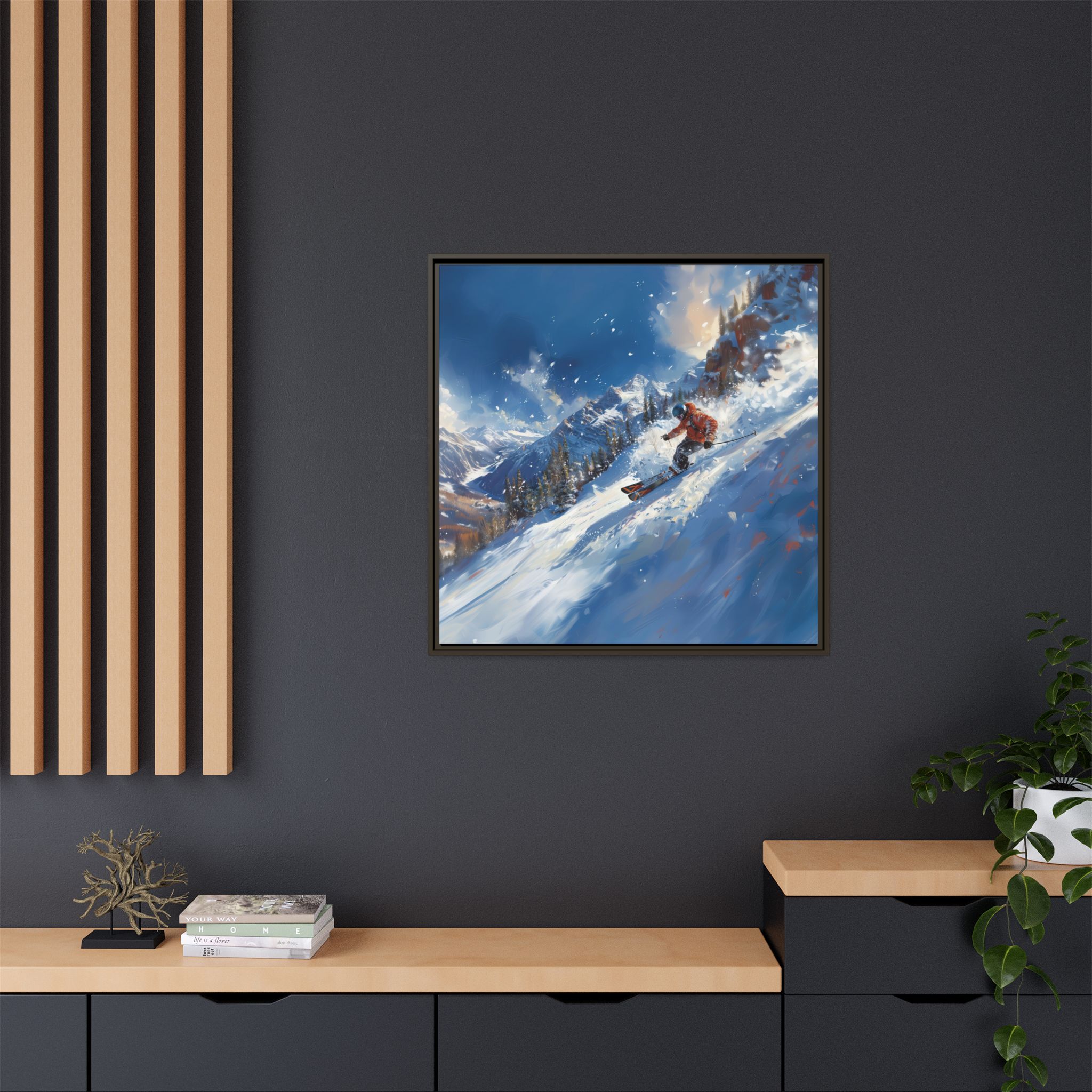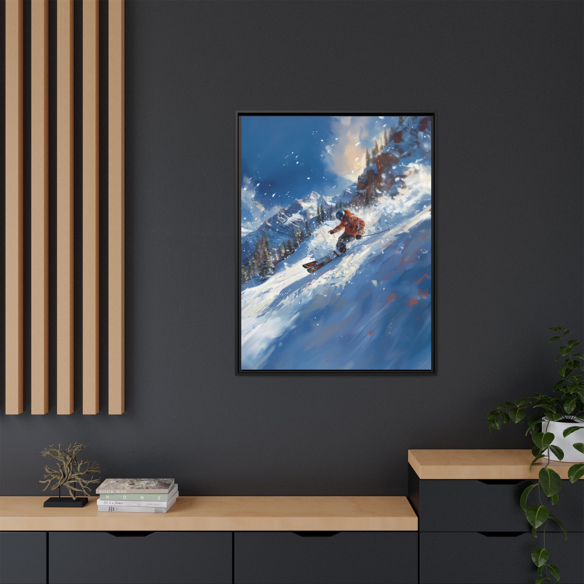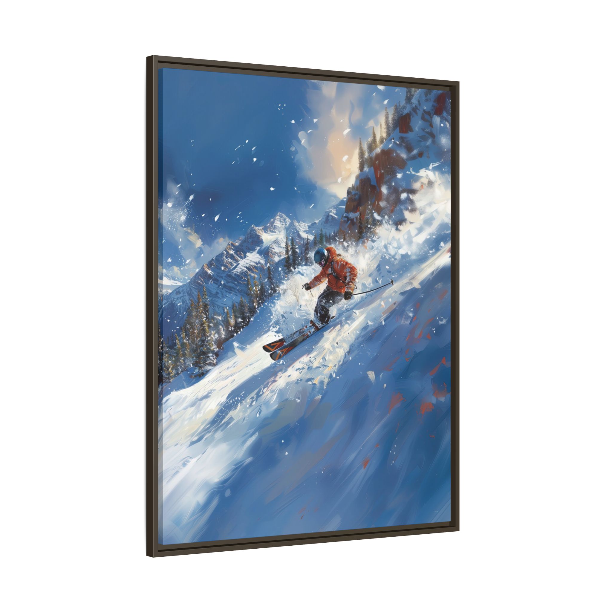 A dynamic action scene of skiers free skiing down the slopes in deep snow, a beutiful action landscape with intensity and excitement. The high-speed motion creates swirling snow clouds around them as they land on a snowy mountain slope. Experience the excitement of skiing with this dynamic action style canvas print. Perfect for adrenaline junkies and winter sports enthusiasts, this canvas brings intensity and motion to any room. Ideal for winter decor, sports enthusiasts, and anyone looking to add a thrilling touch to their space.