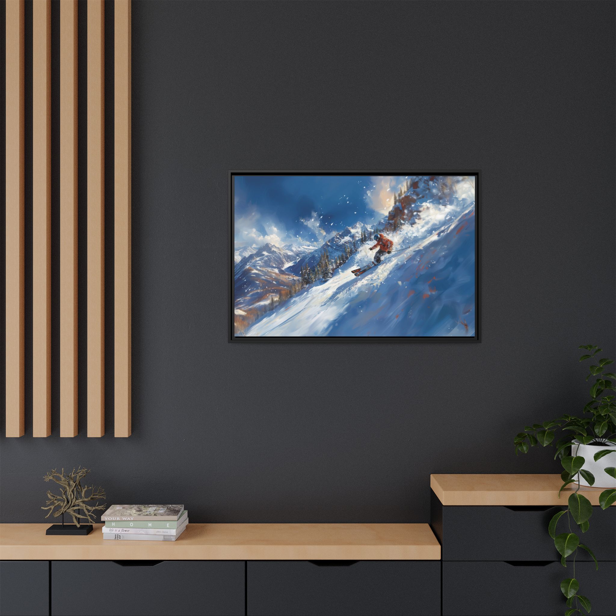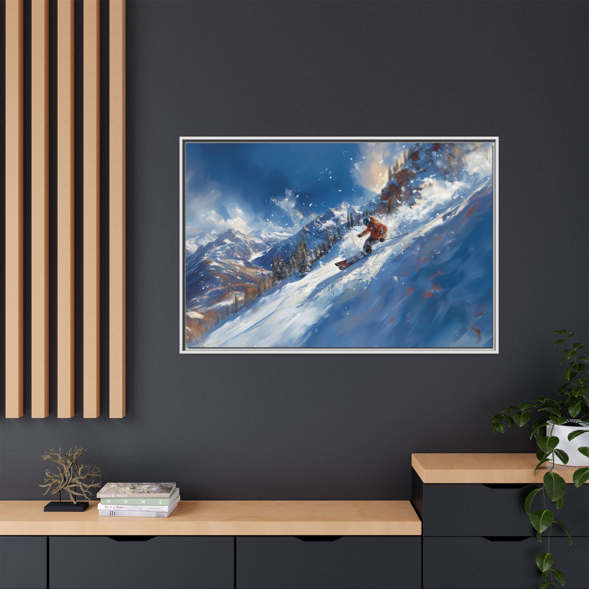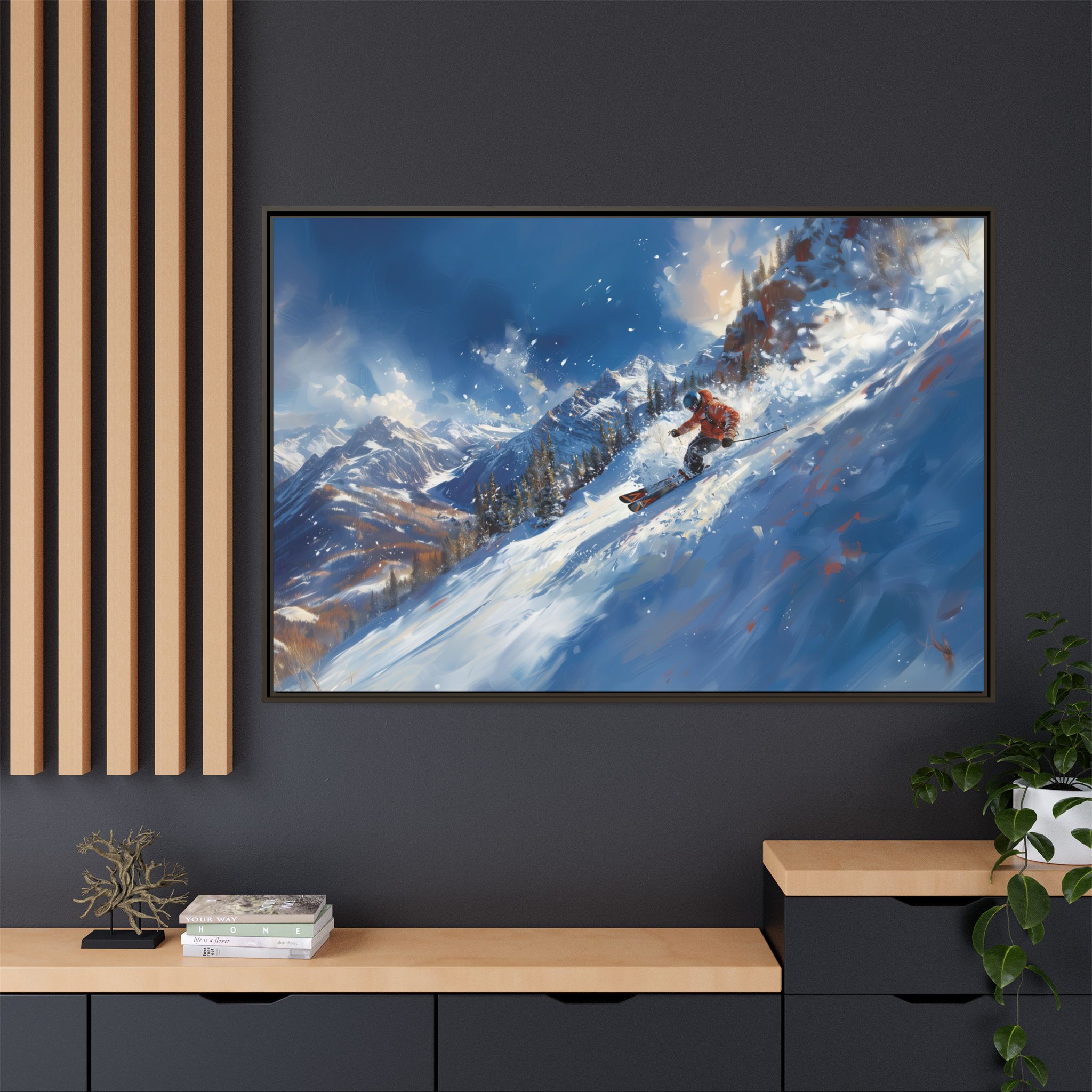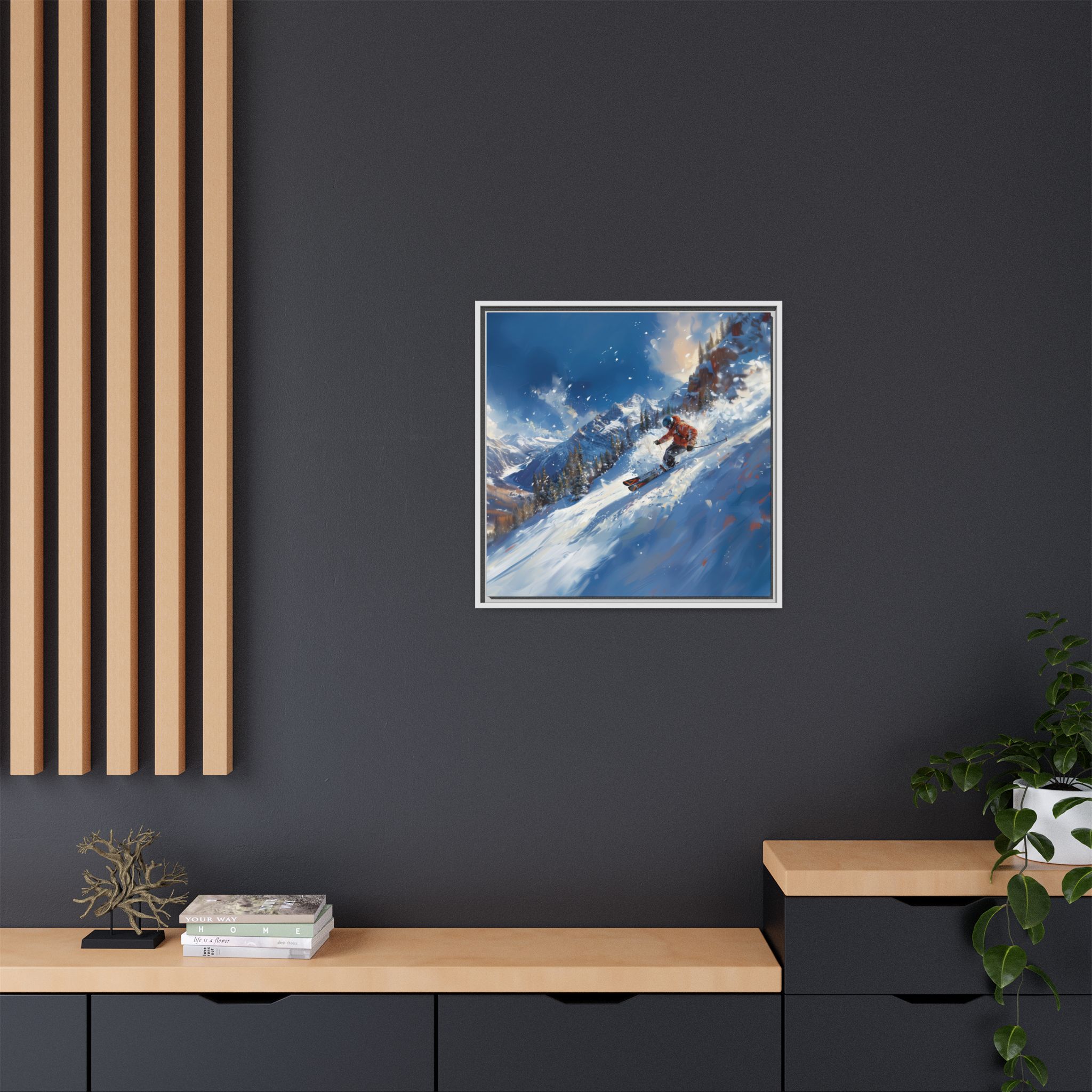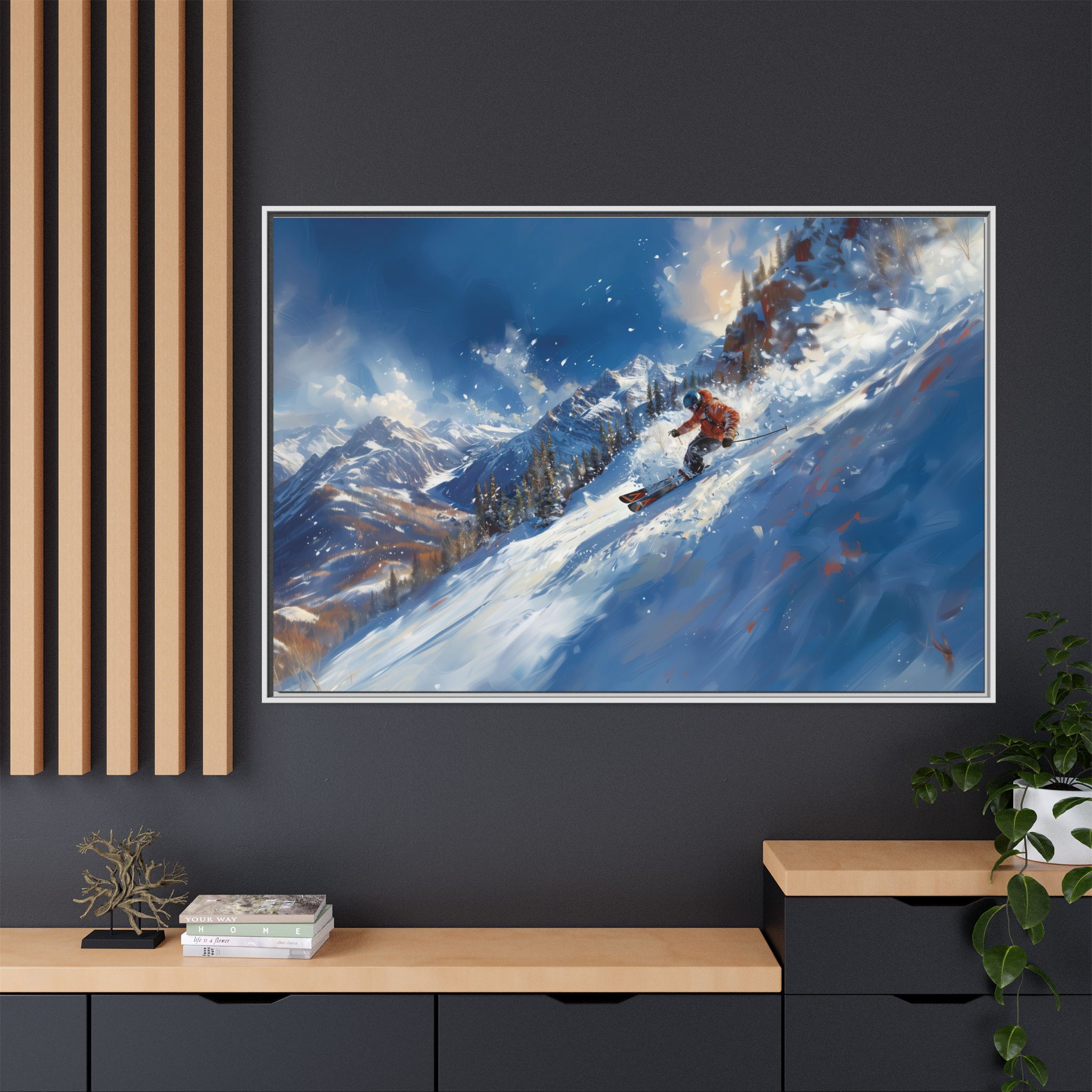A dynamic action scene of skiers free skiing down the slopes in deep snow, a beutiful action landscape with intensity and excitement. The high-speed motion creates swirling snow clouds around them as they land on a snowy mountain slope. Experience the excitement of skiing with this dynamic action style canvas print. Perfect for adrenaline junkies and winter sports enthusiasts, this canvas brings intensity and motion to any room. Ideal for winter decor, sports enthusiasts, and anyone looking to add a thrilling touch to their space.