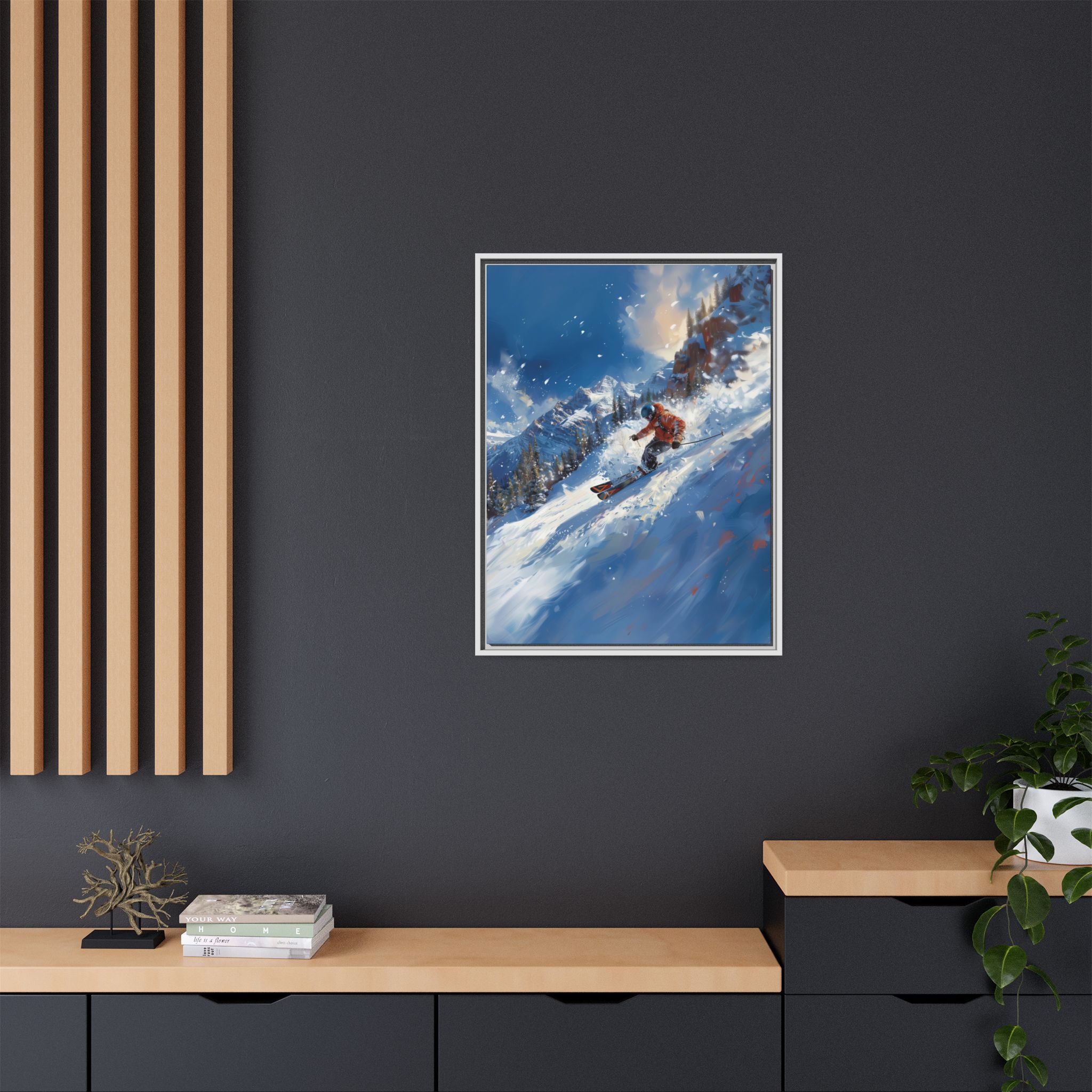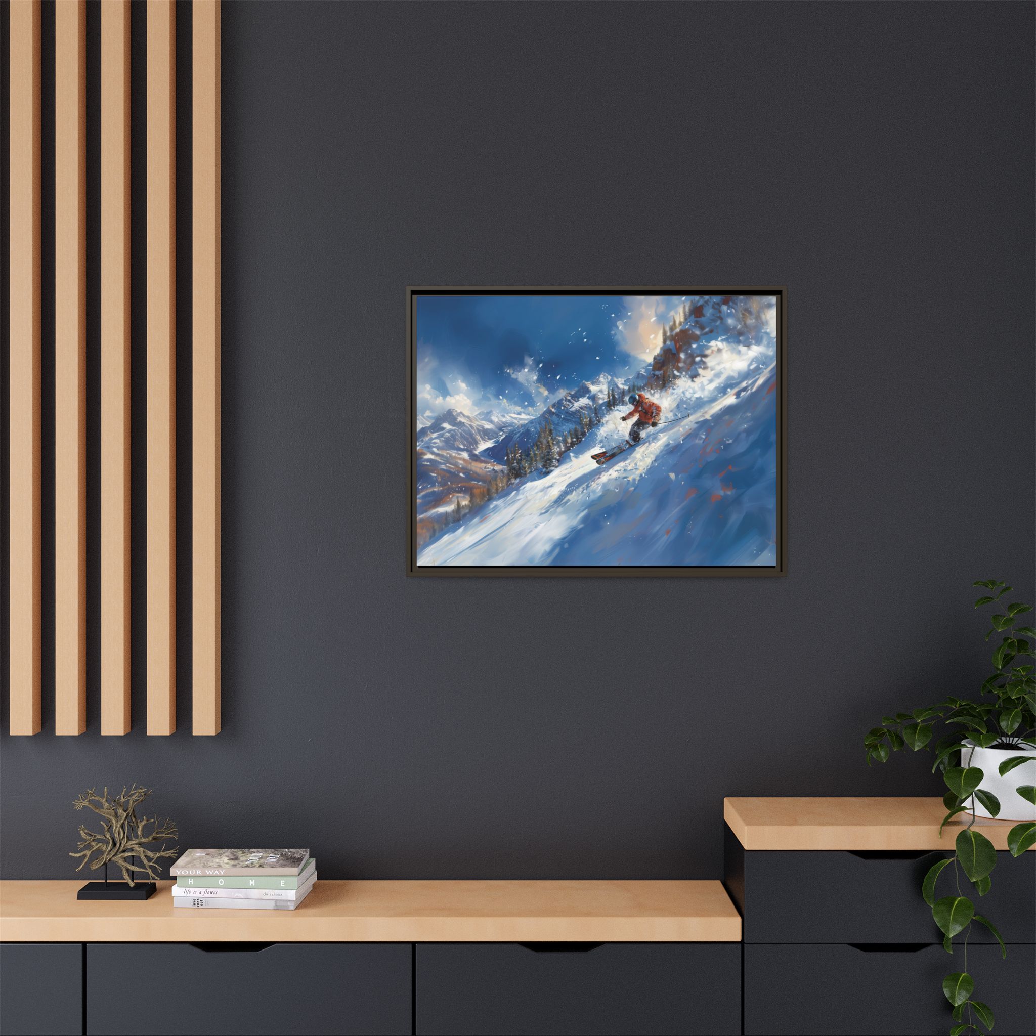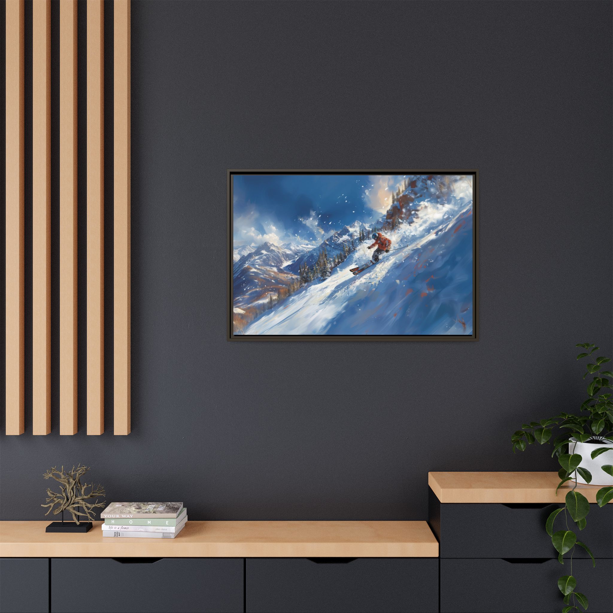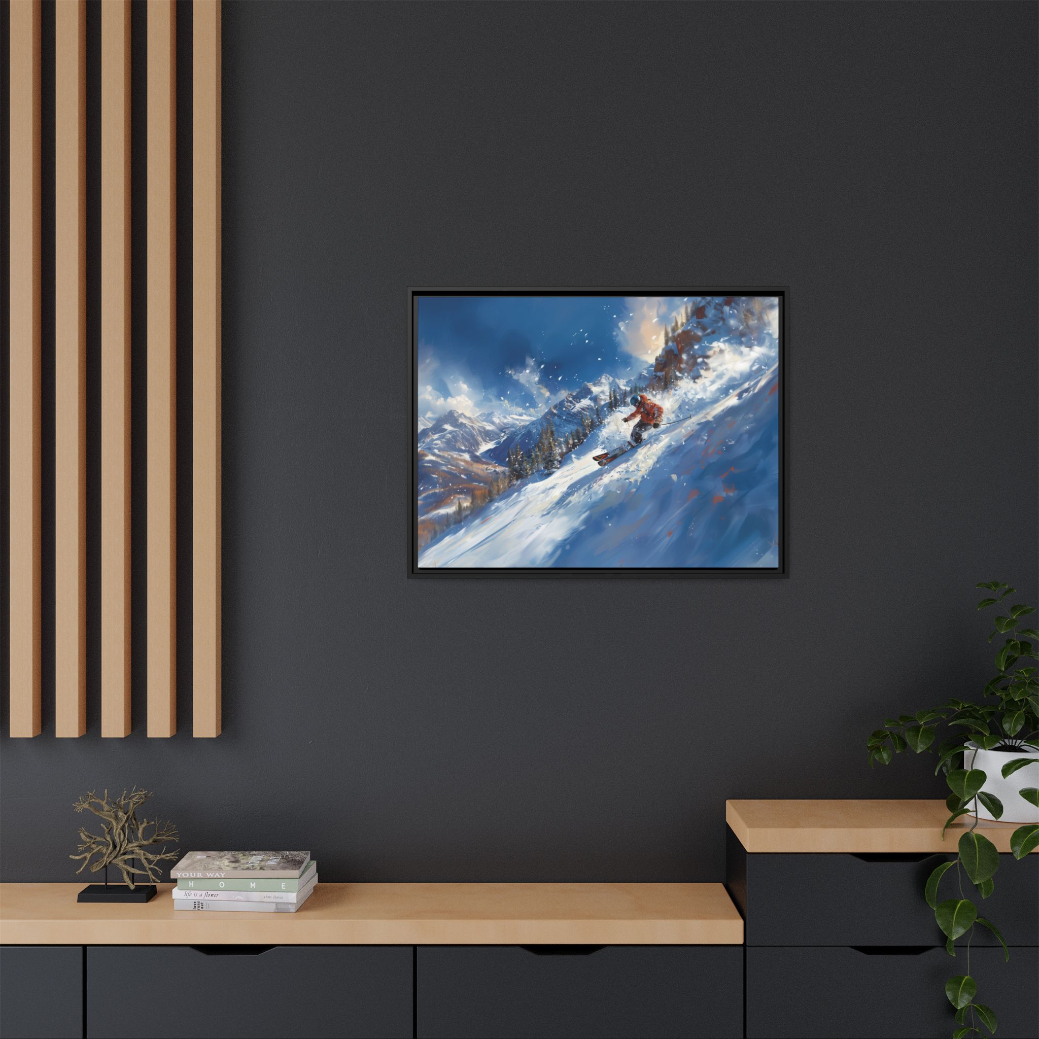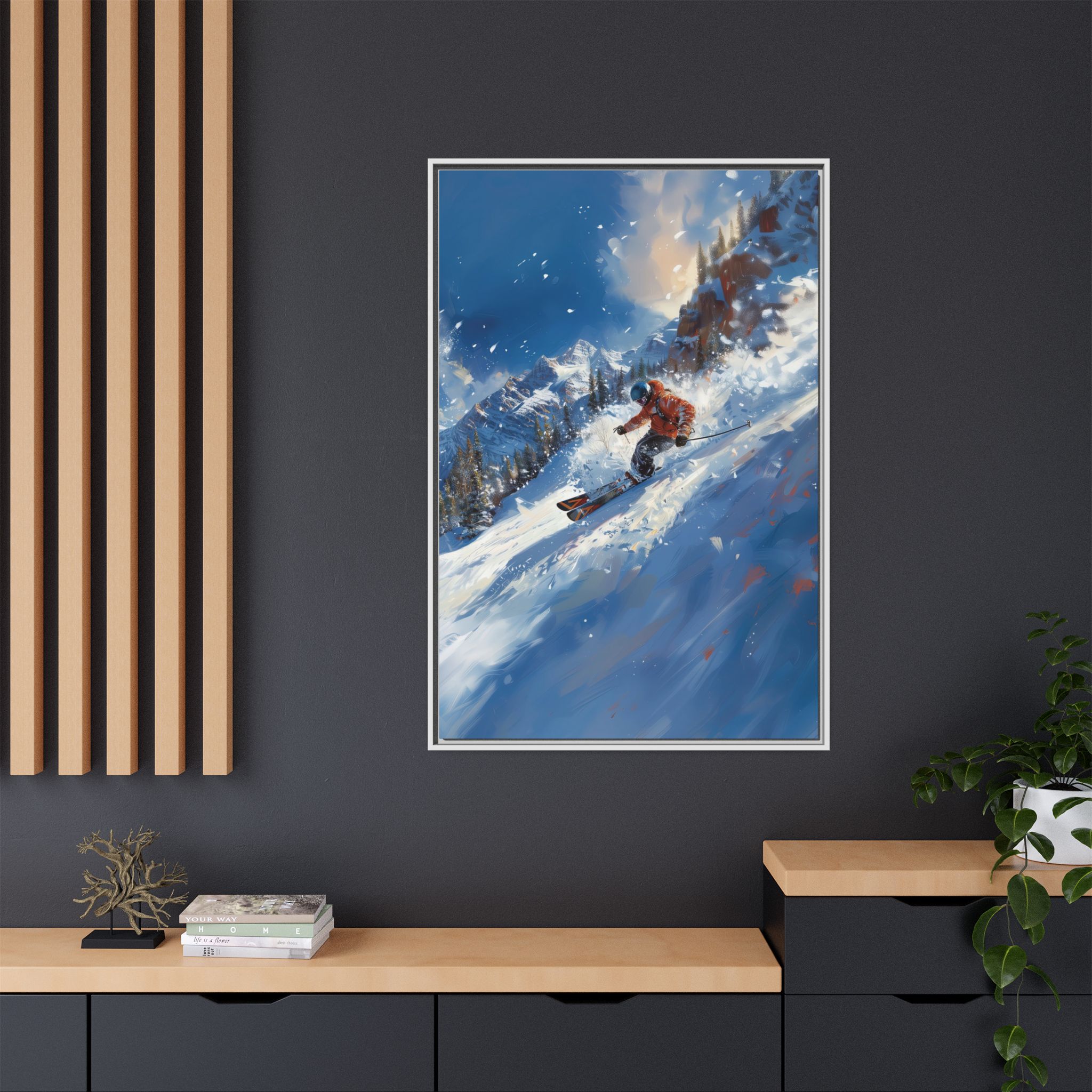 A dynamic action scene of skiers free skiing down the slopes in deep snow, a beutiful action landscape with intensity and excitement. The high-speed motion creates swirling snow clouds around them as they land on a snowy mountain slope. Experience the excitement of skiing with this dynamic action style canvas print. Perfect for adrenaline junkies and winter sports enthusiasts, this canvas brings intensity and motion to any room. Ideal for winter decor, sports enthusiasts, and anyone looking to add a thrilling touch to their space.