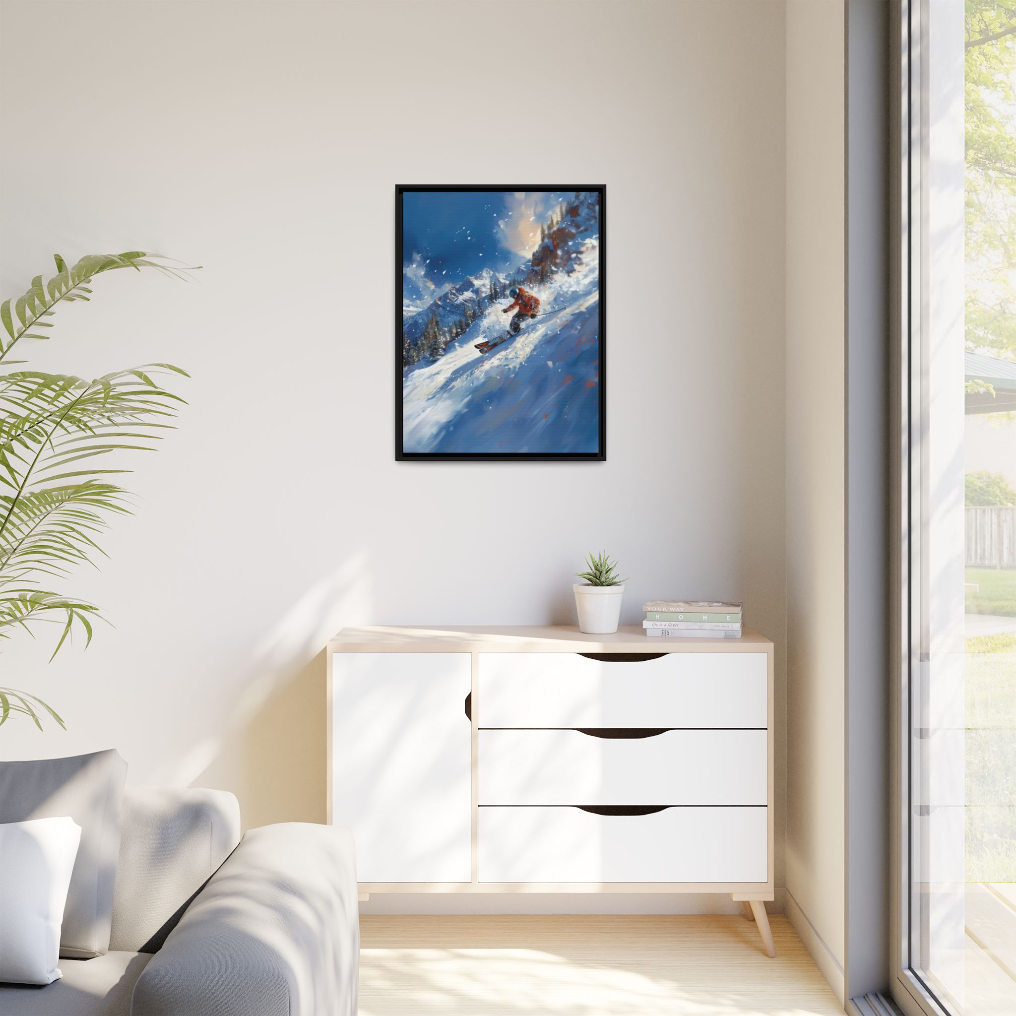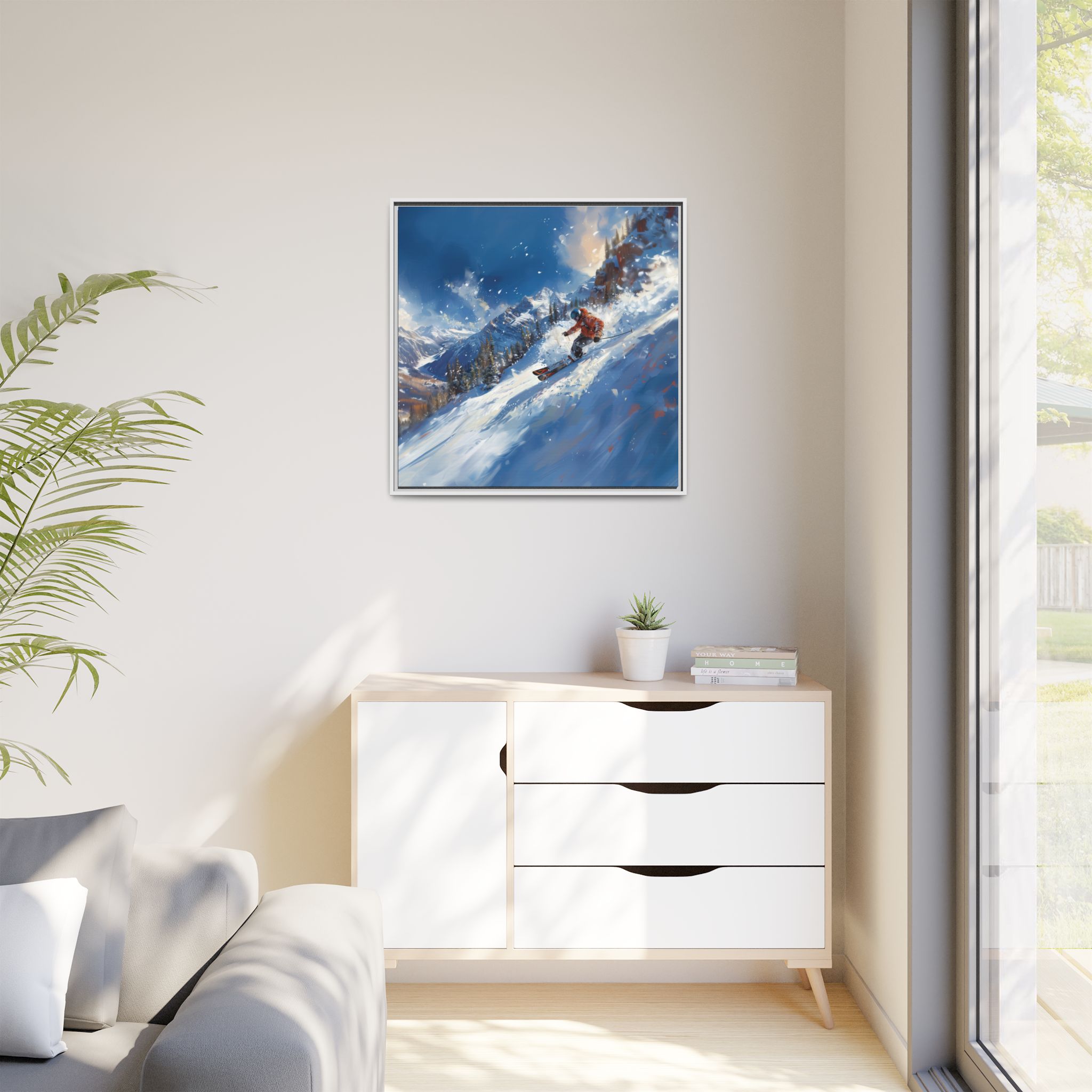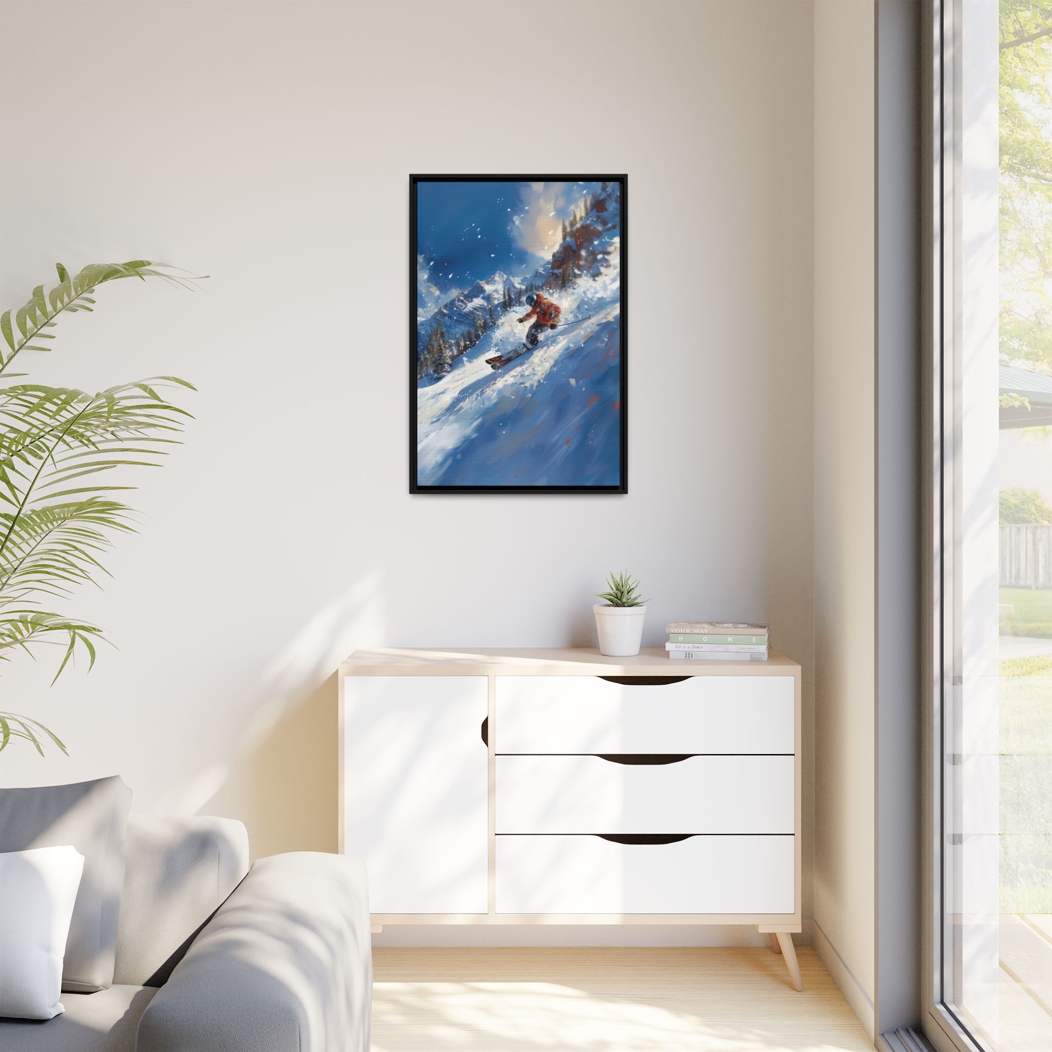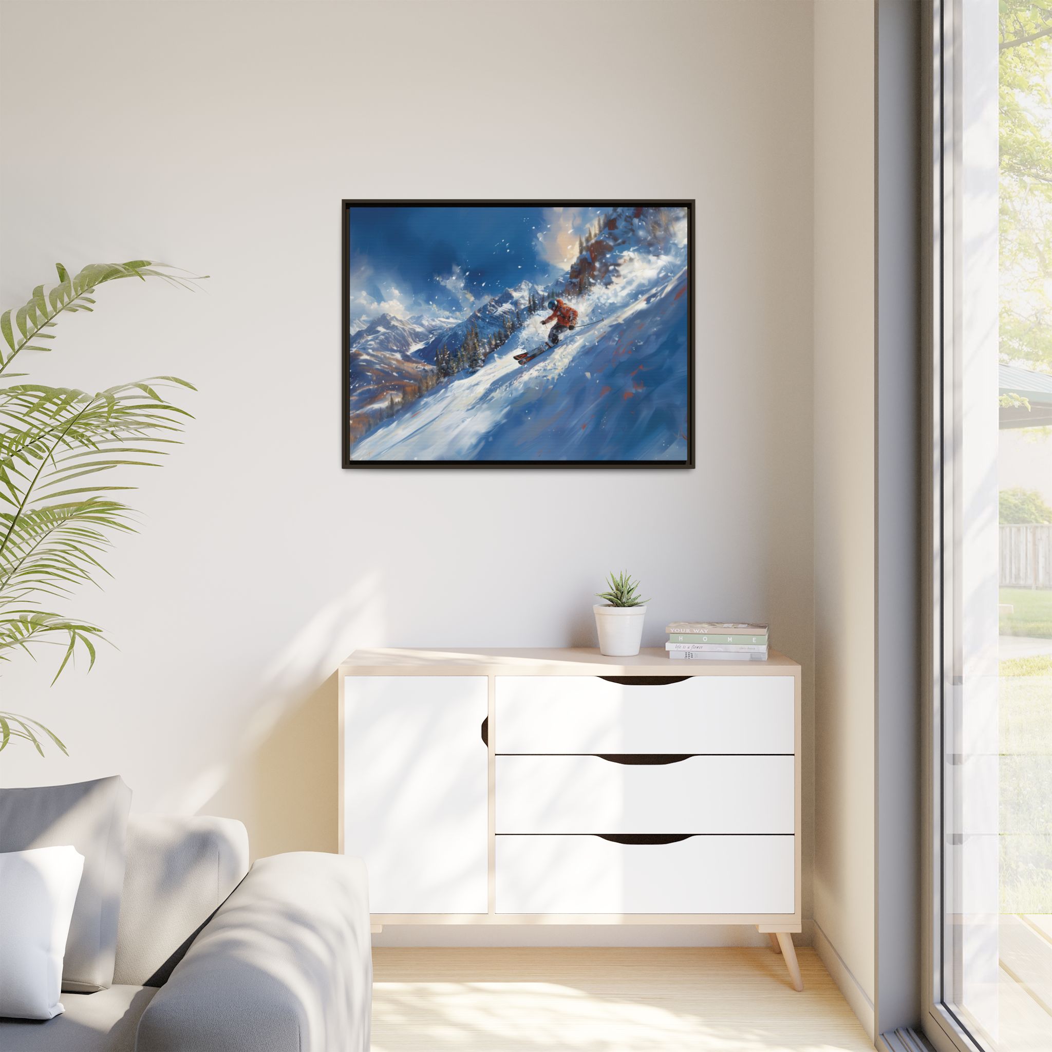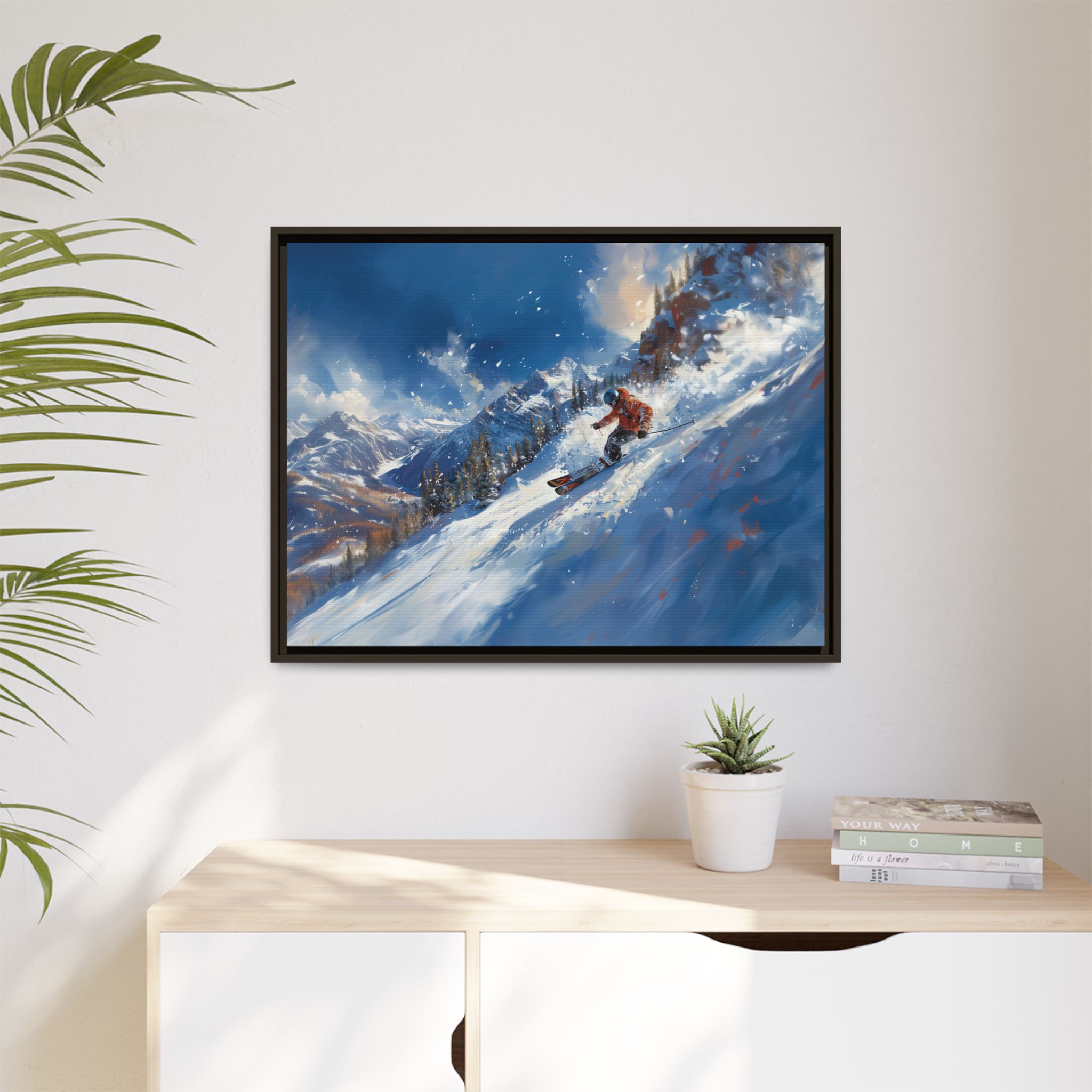 A dynamic action scene of skiers free skiing down the slopes in deep snow, a beutiful action landscape with intensity and excitement. The high-speed motion creates swirling snow clouds around them as they land on a snowy mountain slope. Experience the excitement of skiing with this dynamic action style canvas print. Perfect for adrenaline junkies and winter sports enthusiasts, this canvas brings intensity and motion to any room. Ideal for winter decor, sports enthusiasts, and anyone looking to add a thrilling touch to their space.