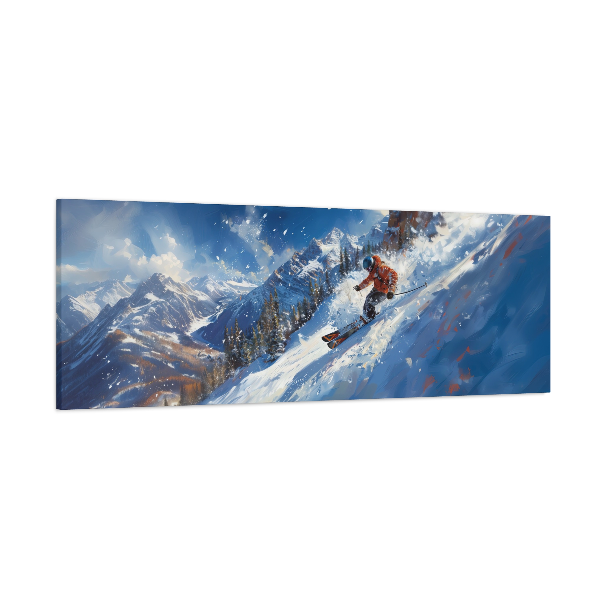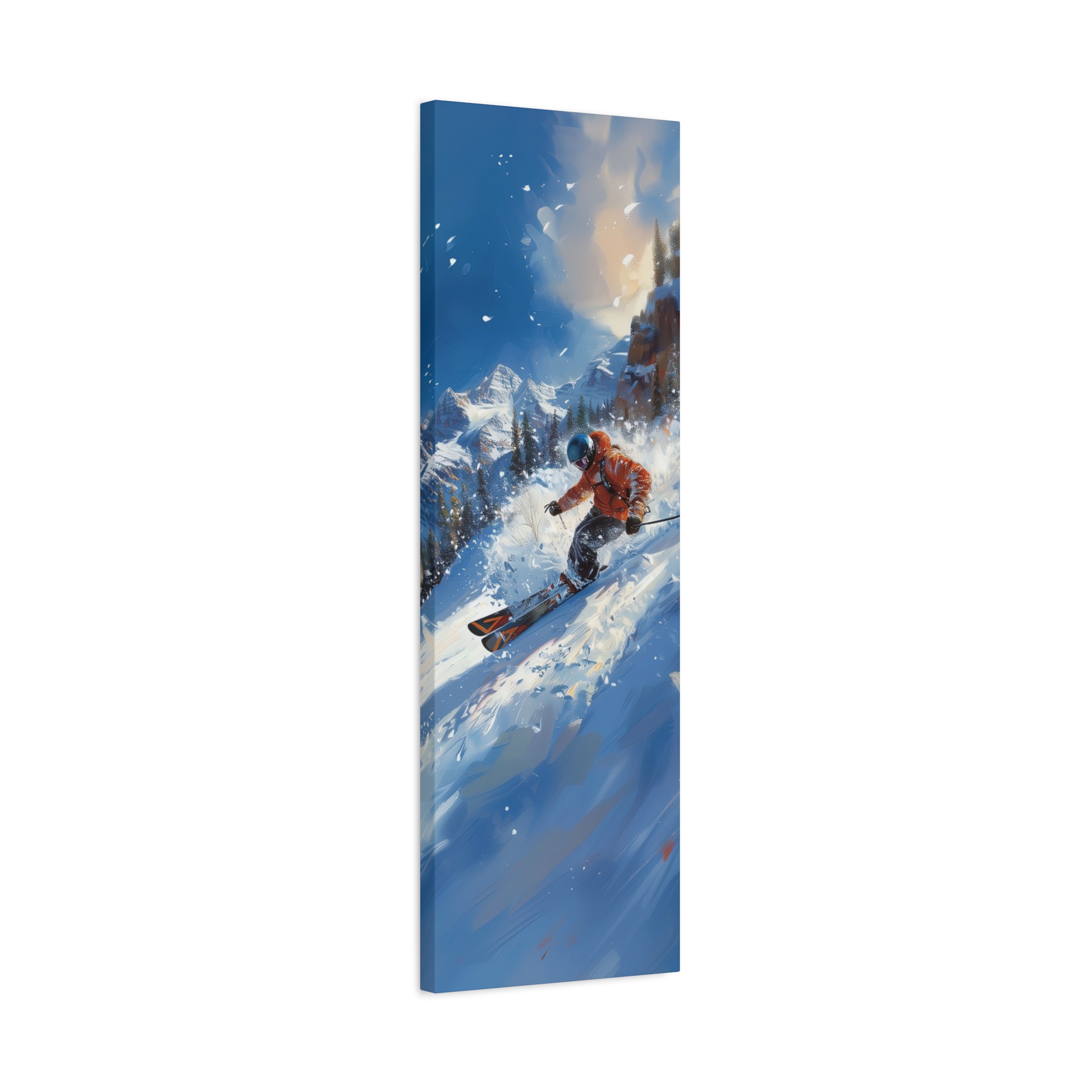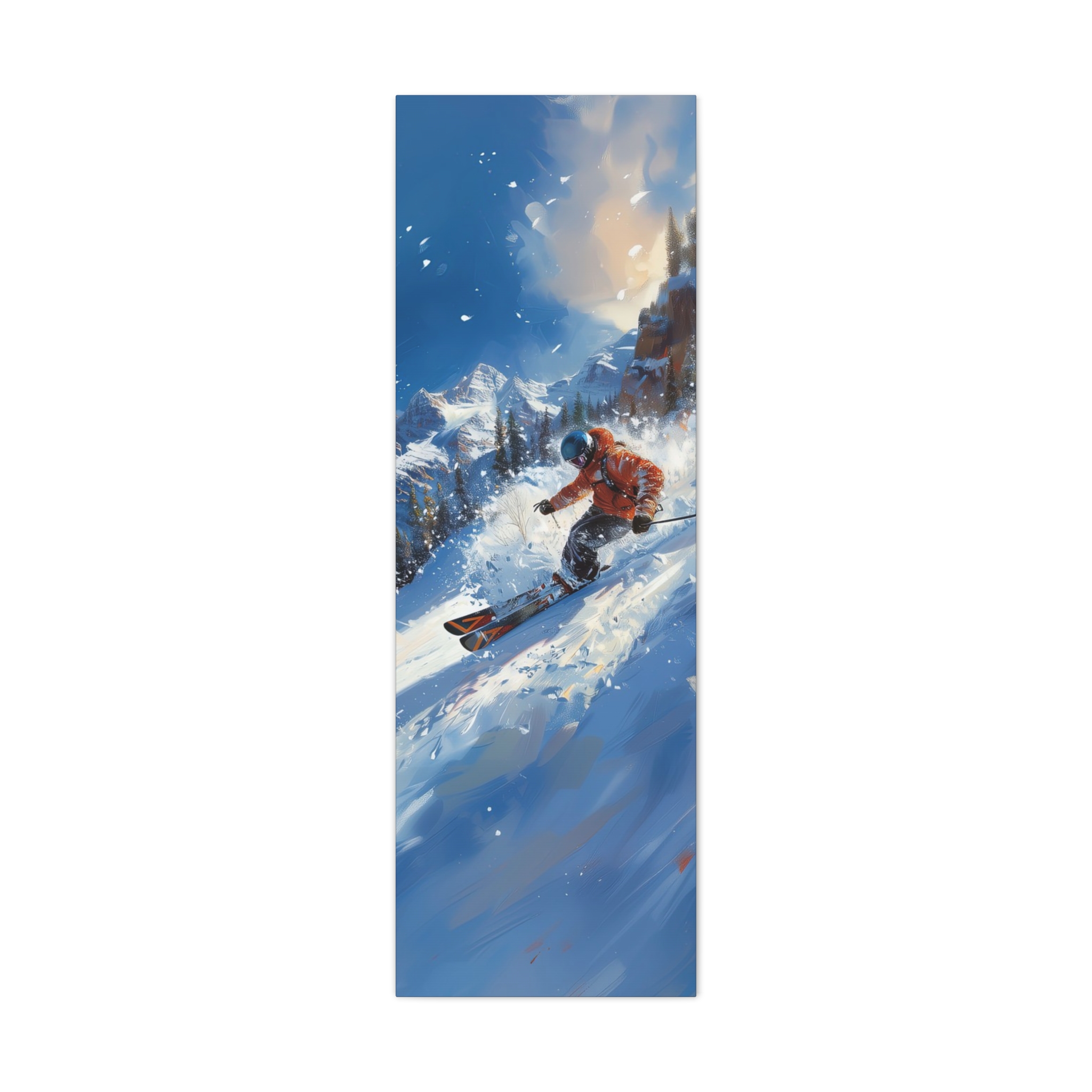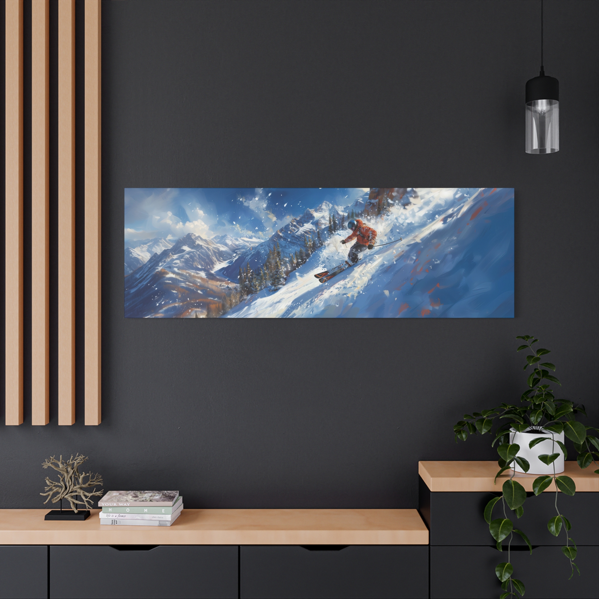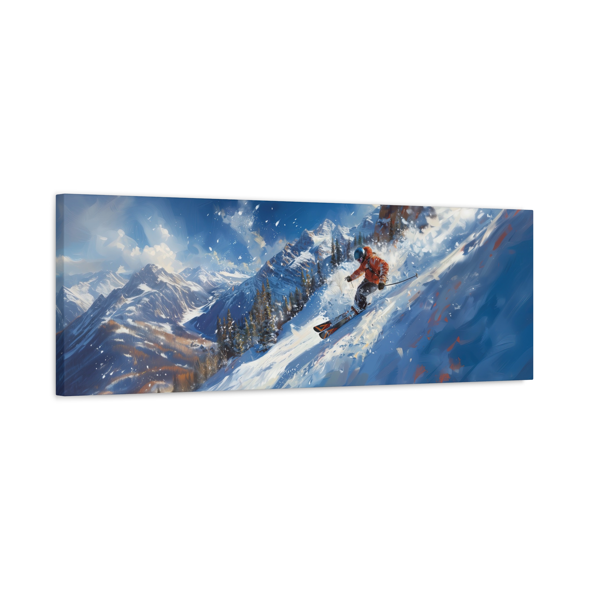 A dynamic action scene of skiers free skiing down the slopes in deep snow, a beutiful action landscape with intensity and excitement. The high-speed motion creates swirling snow clouds around them as they land on a snowy mountain slope. Experience the excitement of skiing with this dynamic action style canvas print. Perfect for adrenaline junkies and winter sports enthusiasts, this canvas brings intensity and motion to any room. Ideal for winter decor, sports enthusiasts, and anyone looking to add a thrilling touch to their space.