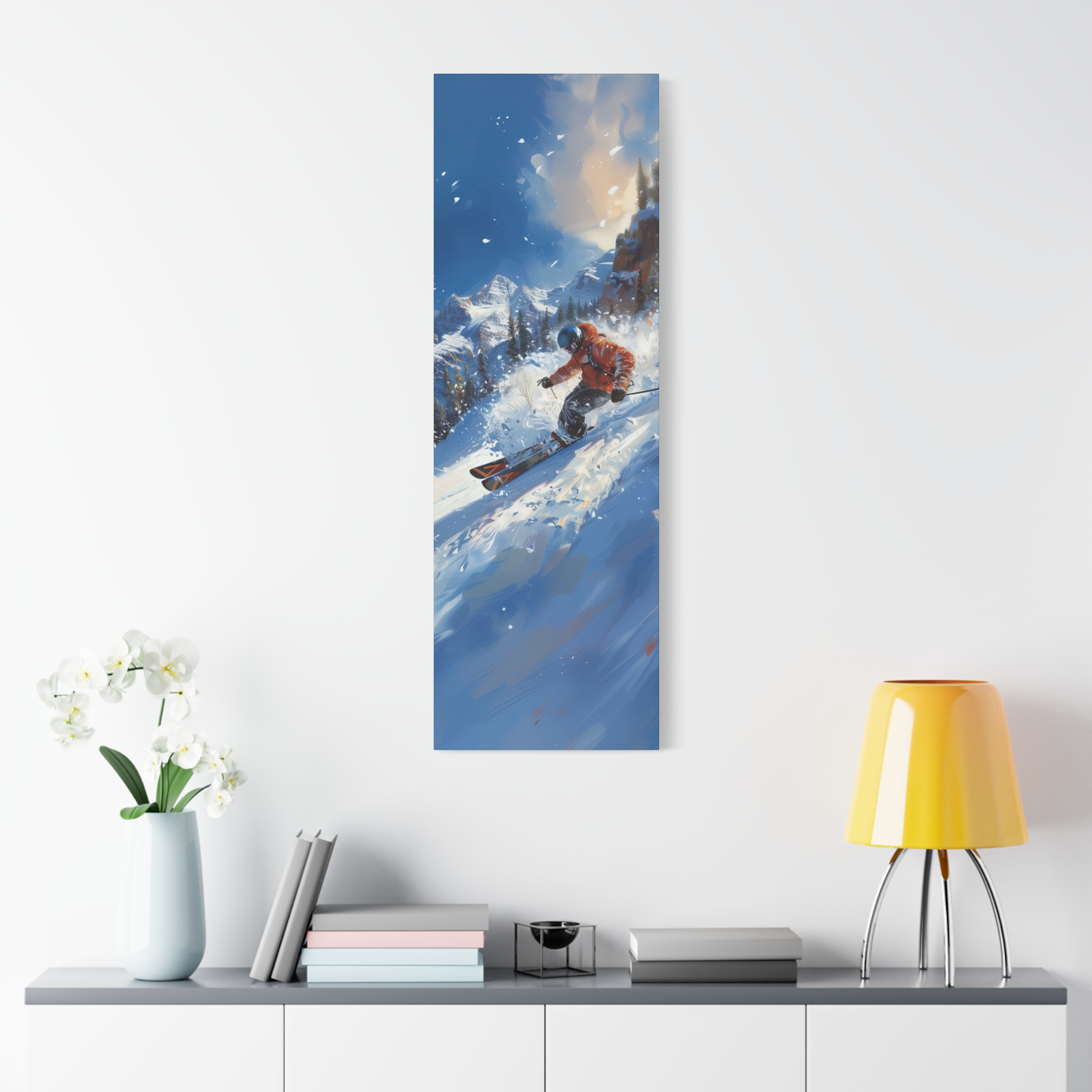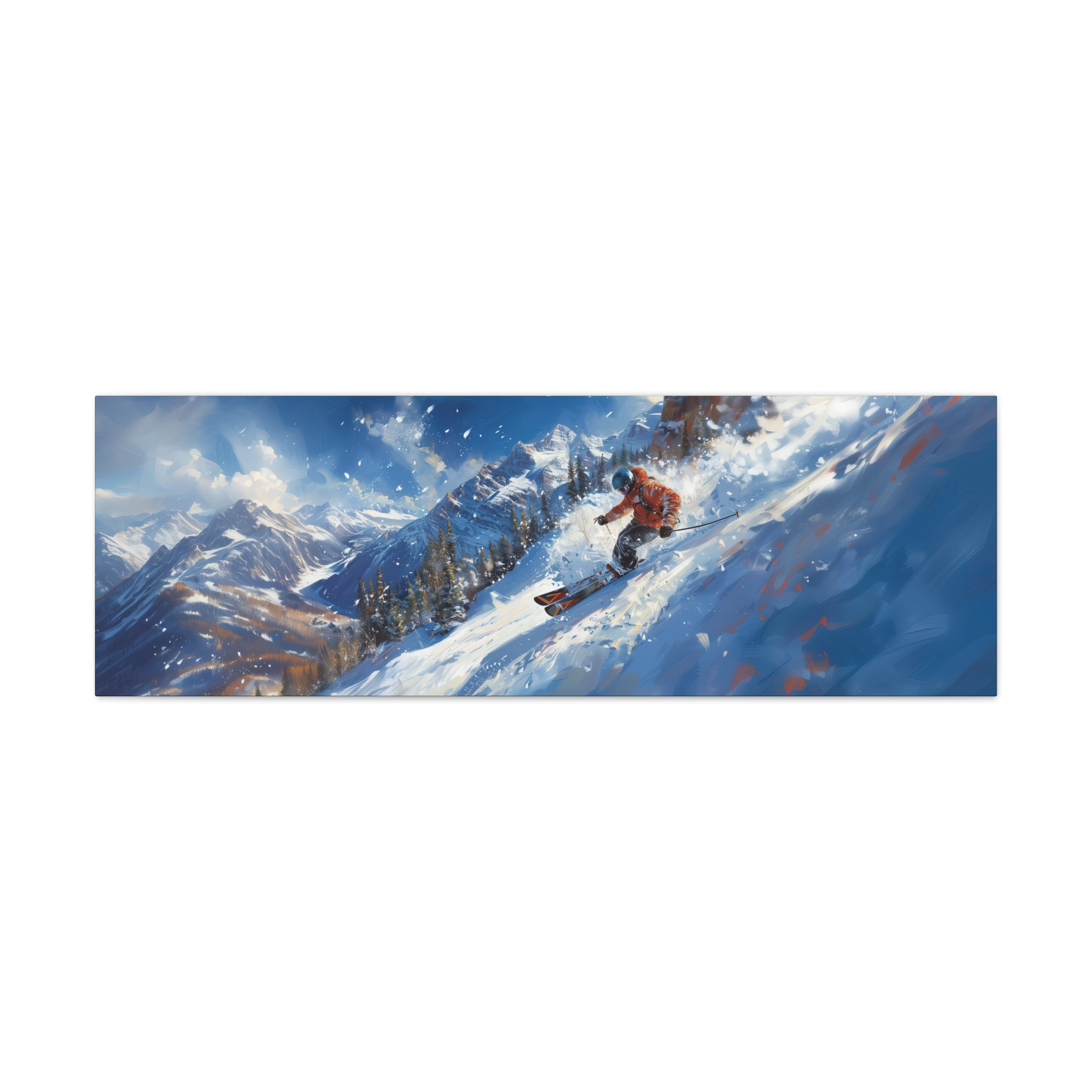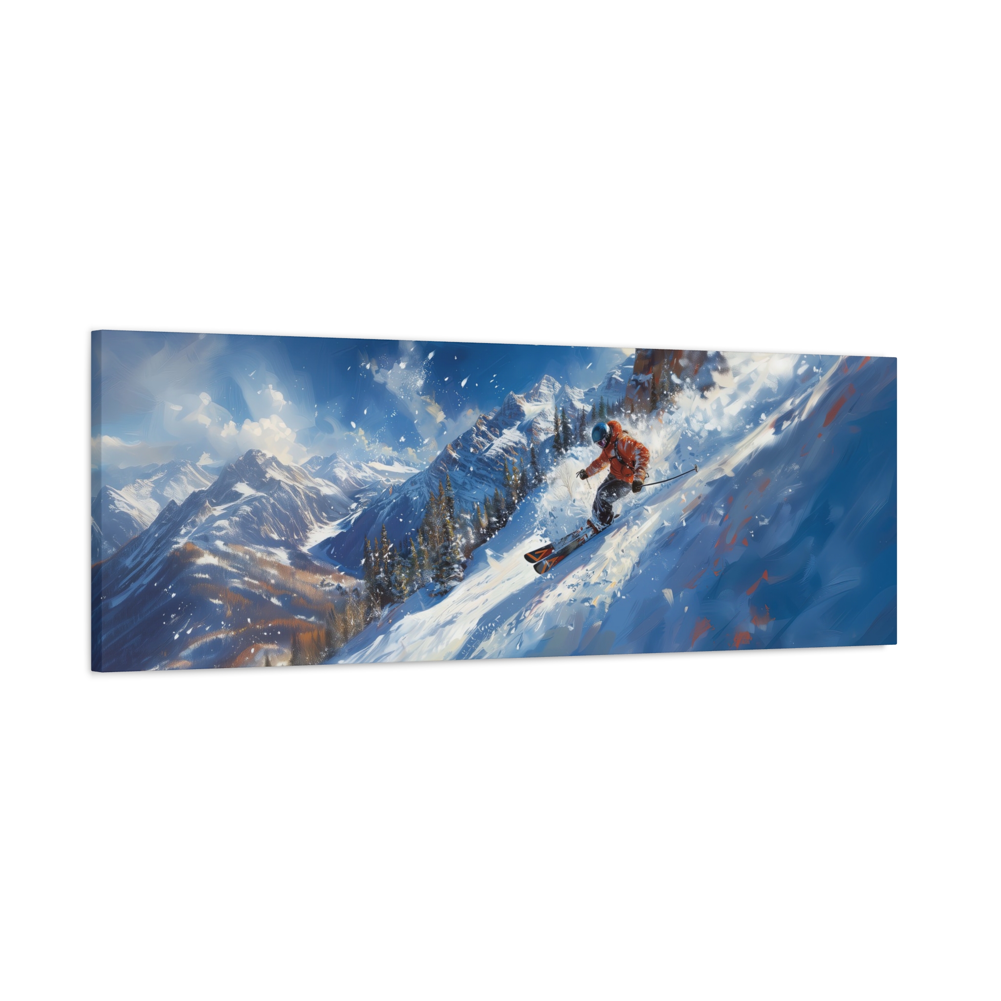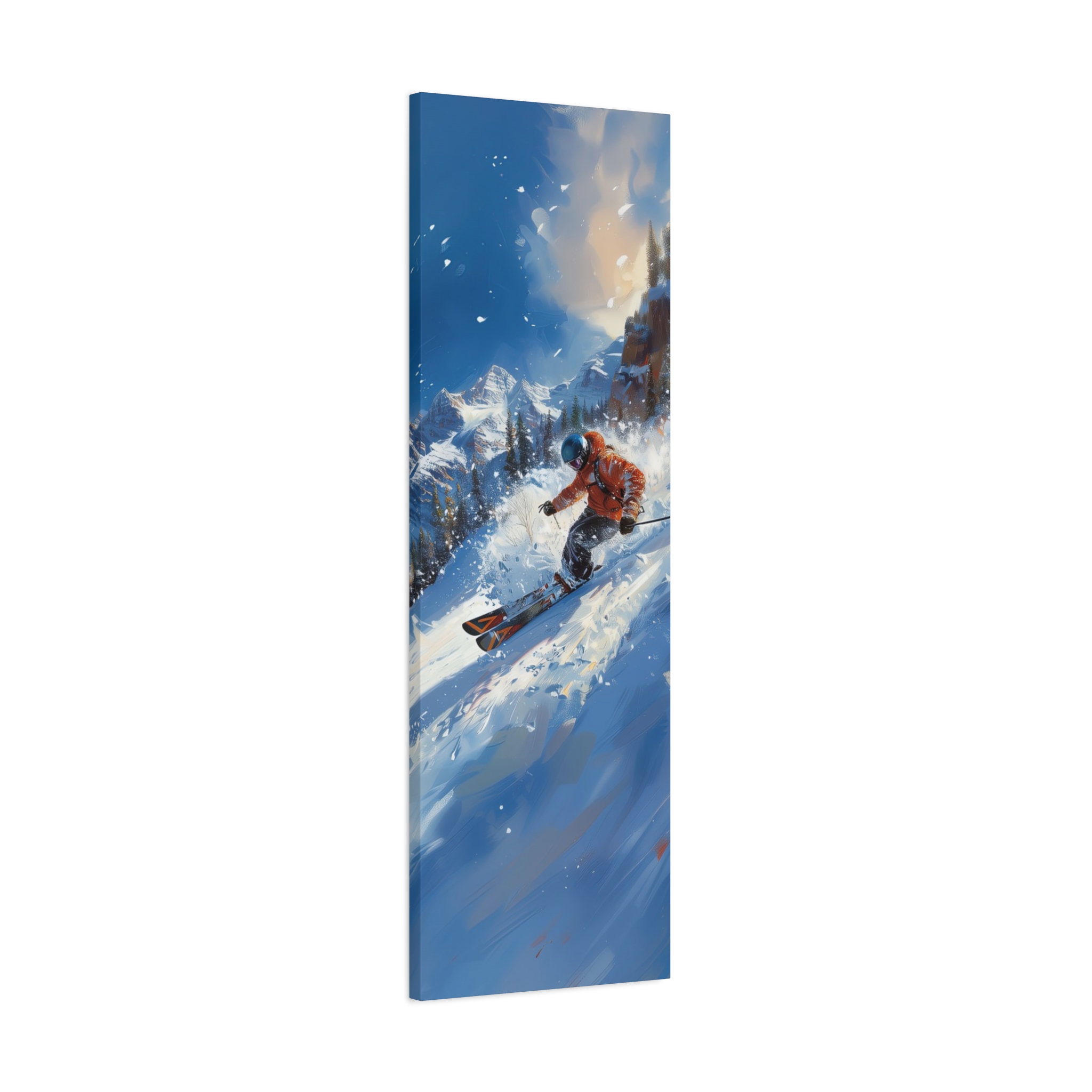 A dynamic action scene of skiers free skiing down the slopes in deep snow, a beutiful action landscape with intensity and excitement. The high-speed motion creates swirling snow clouds around them as they land on a snowy mountain slope. Experience the excitement of skiing with this dynamic action style canvas print. Perfect for adrenaline junkies and winter sports enthusiasts, this canvas brings intensity and motion to any room. Ideal for winter decor, sports enthusiasts, and anyone looking to add a thrilling touch to their space.
