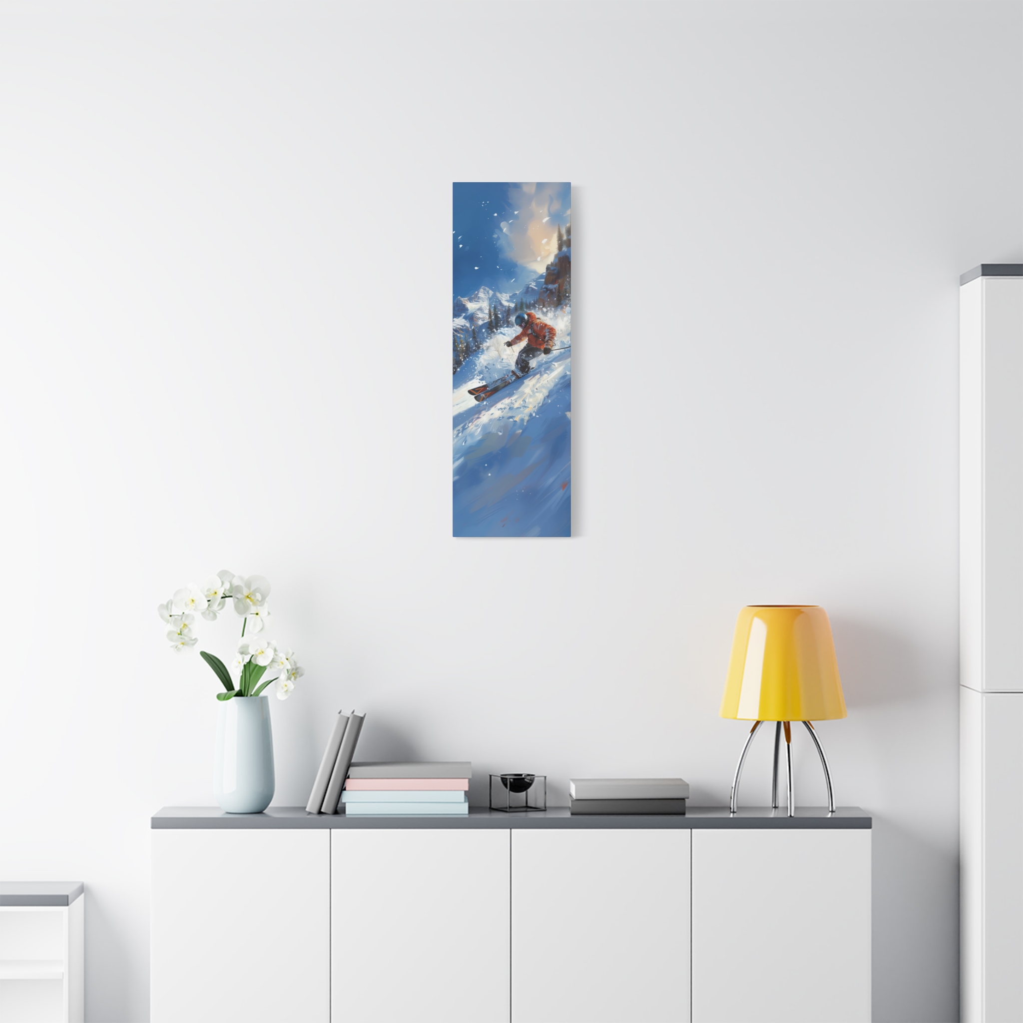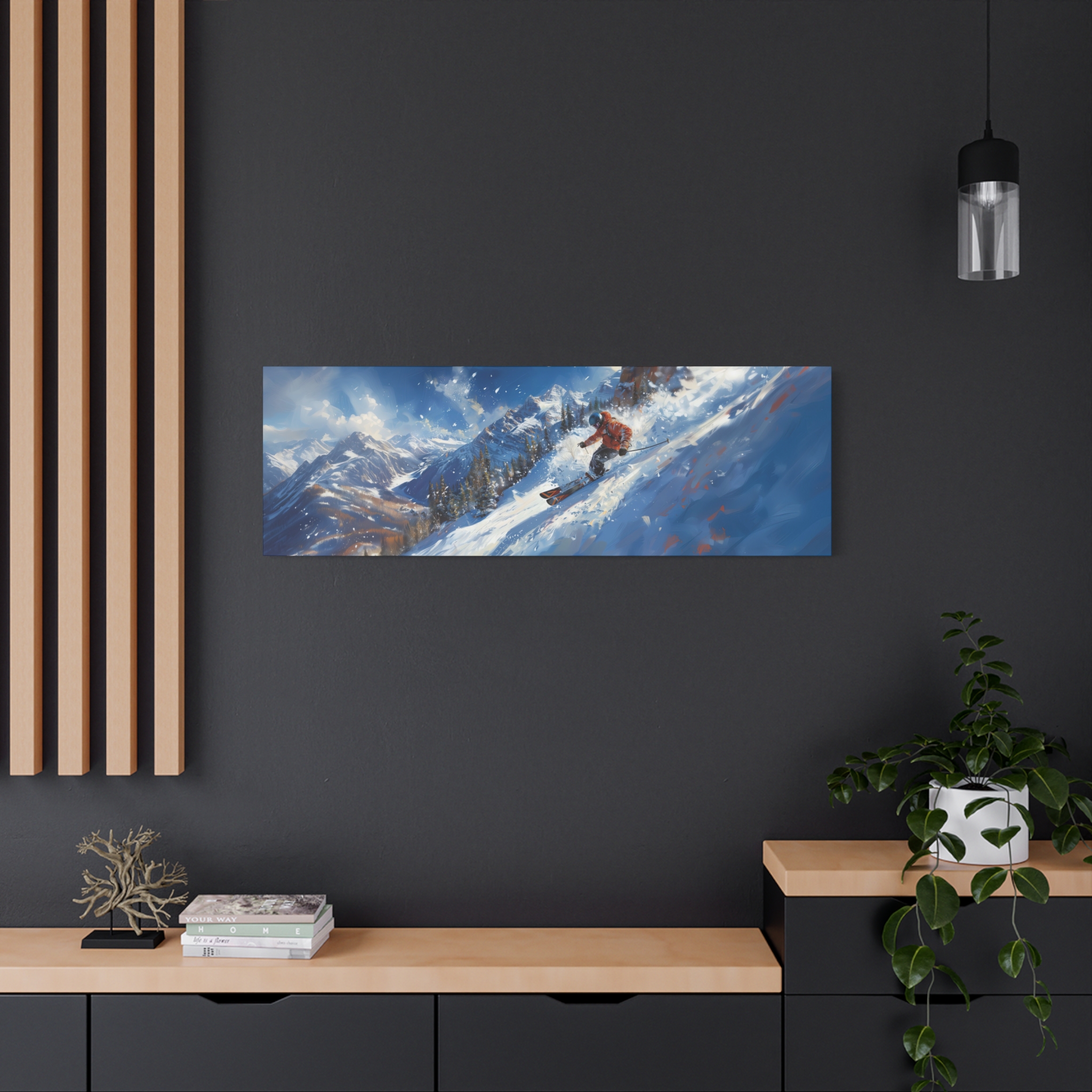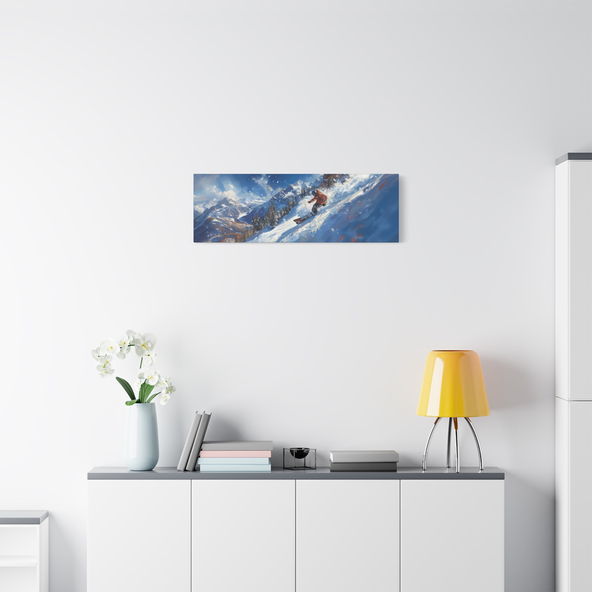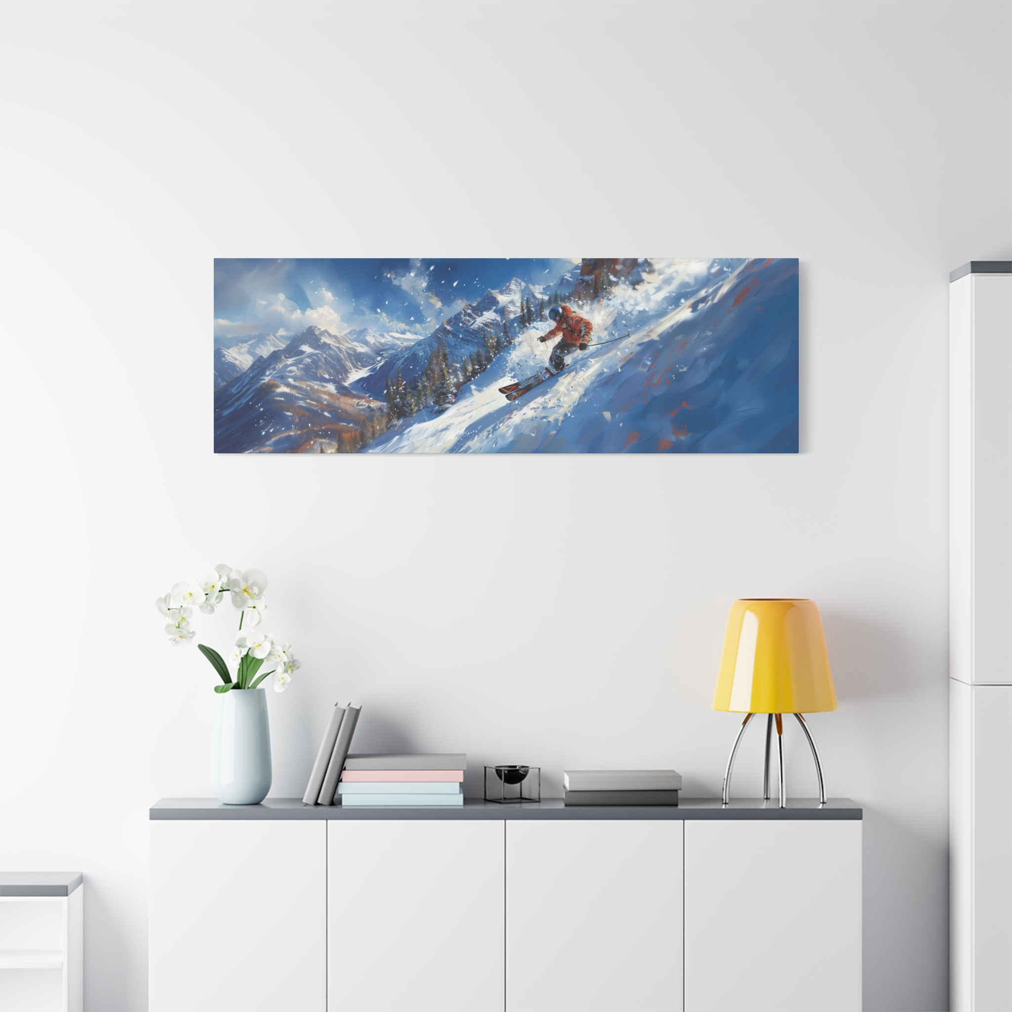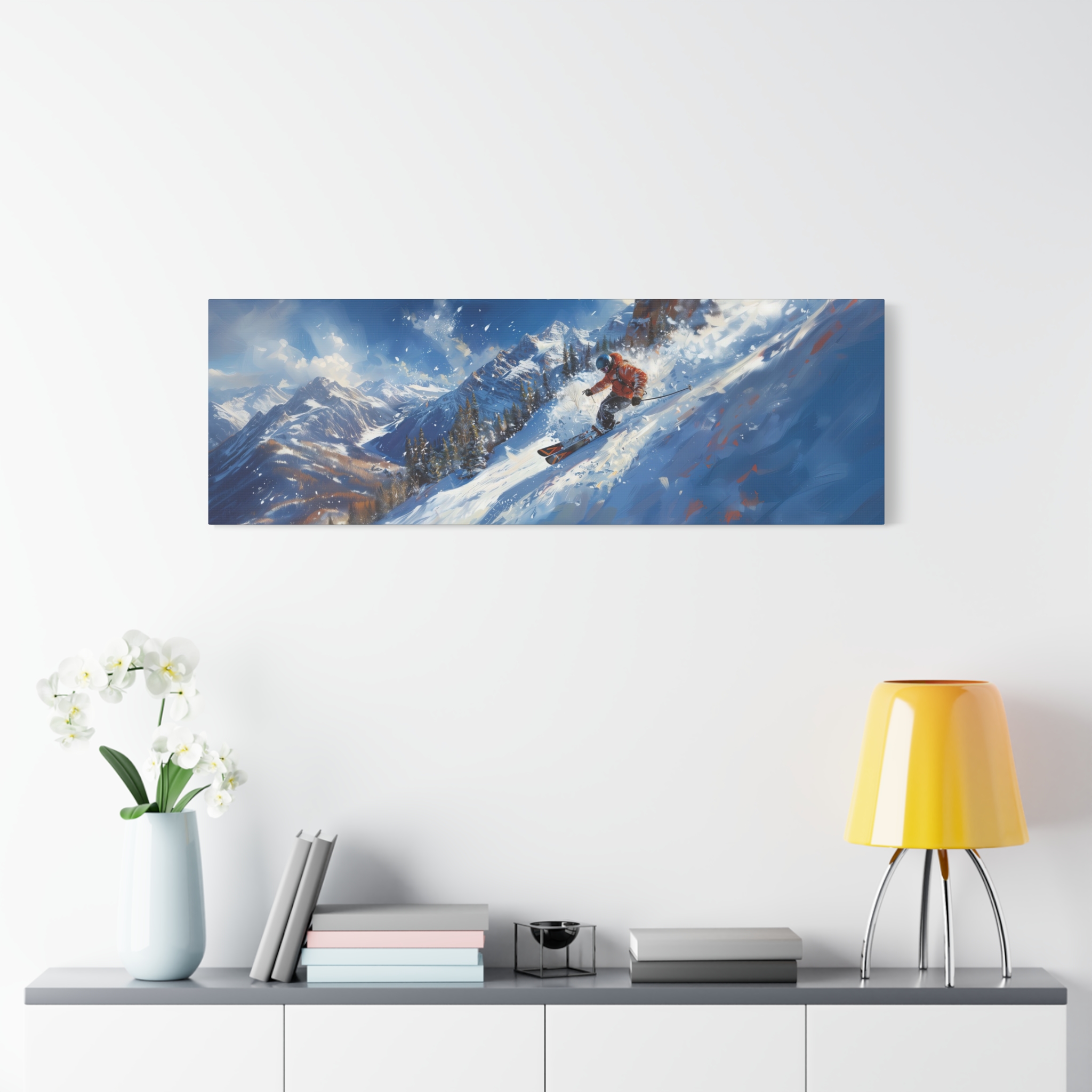 A dynamic action scene of skiers free skiing down the slopes in deep snow, a beutiful action landscape with intensity and excitement. The high-speed motion creates swirling snow clouds around them as they land on a snowy mountain slope. Experience the excitement of skiing with this dynamic action style canvas print. Perfect for adrenaline junkies and winter sports enthusiasts, this canvas brings intensity and motion to any room. Ideal for winter decor, sports enthusiasts, and anyone looking to add a thrilling touch to their space.