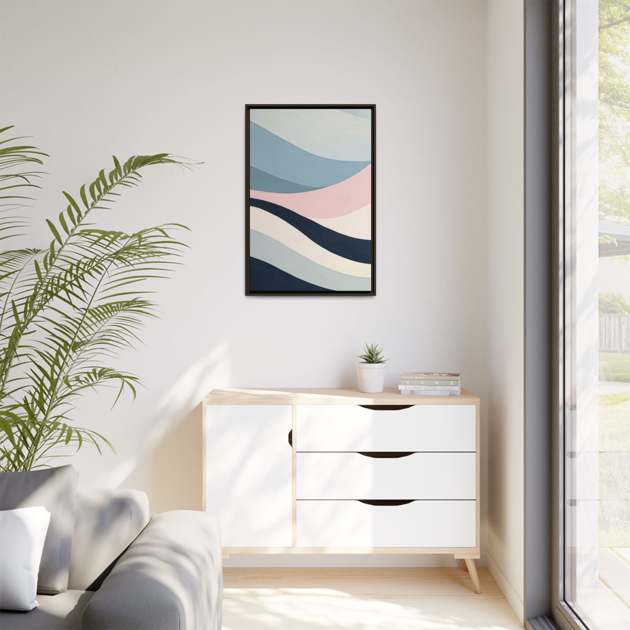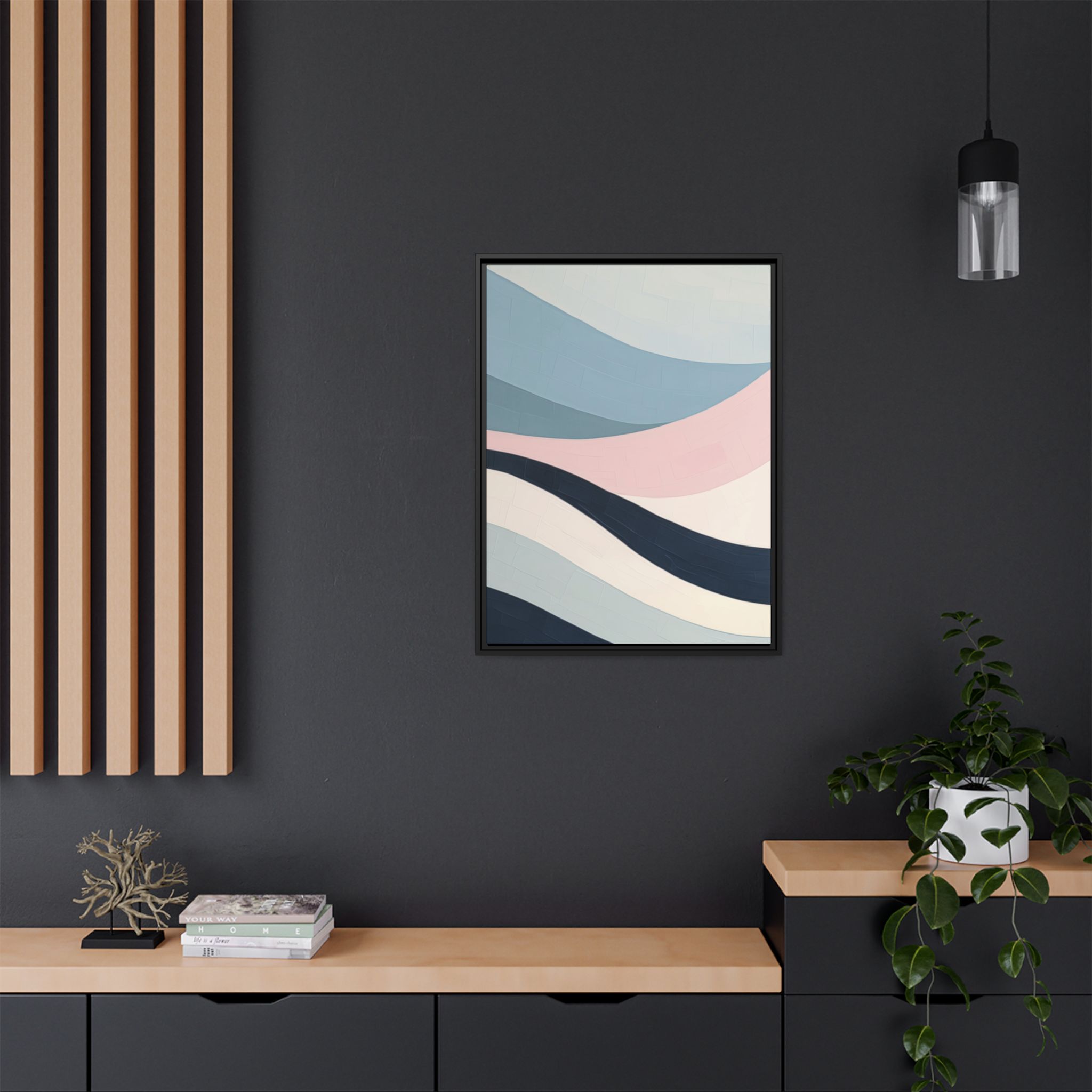 Custom digitally printed artwork on a quality canvas. .Every print in a black pinewood frame will look sleek and beautiful in any interior. The artwork will be printed on the cotton-polyester canvas with a special proprietary coating to make sure it stays vibrant for ages. Environmentally-conscious – it’s made from sustainably sourced materials (Forest Stewardship Council certified) and custom printed on demand no warehouse stocks and no waste. Choose between the designer specified sizes. The sawtooth hanging hardware is already attached.