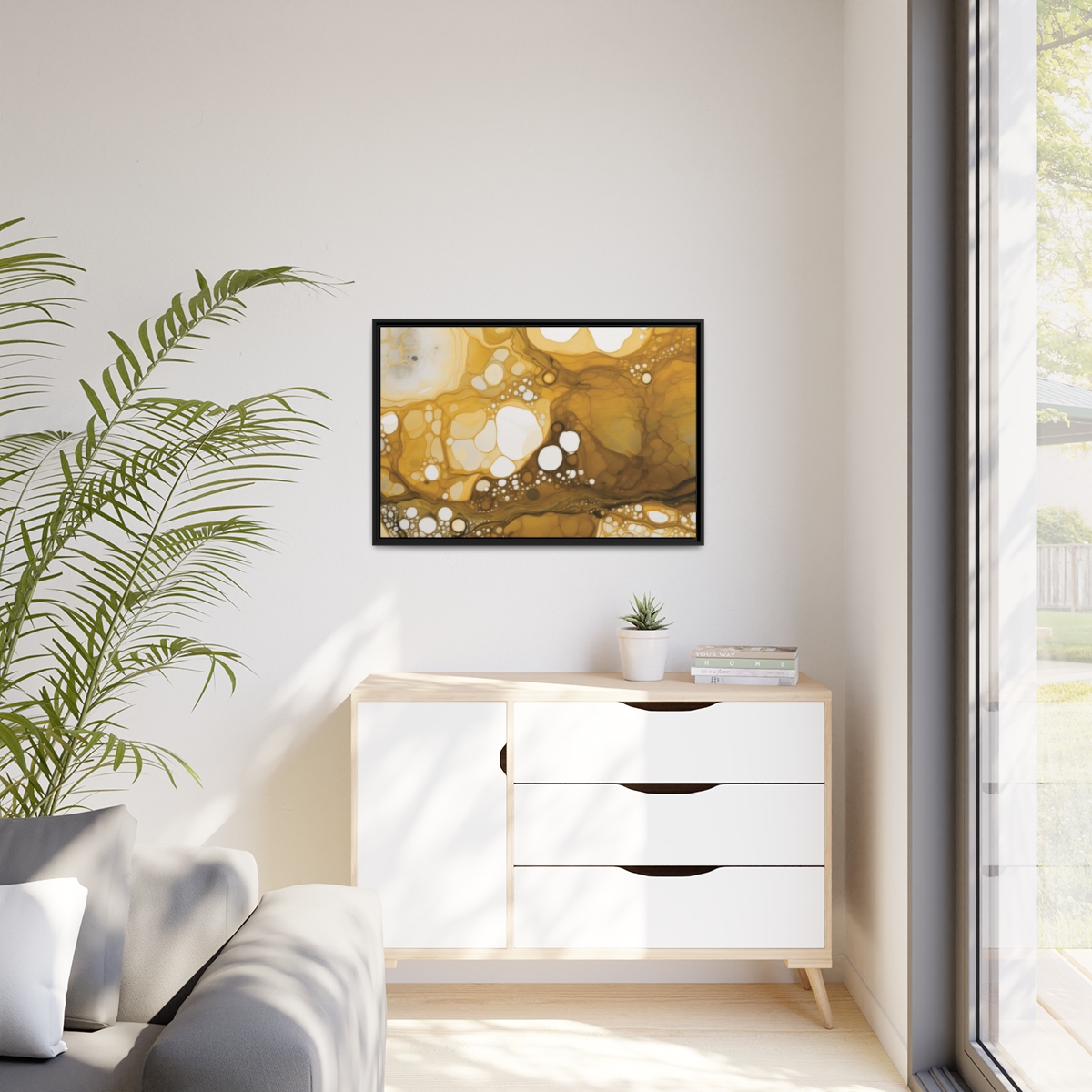 Custom digitally printed artwork on a quality canvas. .Every print in a black pinewood frame will look sleek and beautiful in any interior. The artwork will be printed on the cotton-polyester canvas with a special proprietary coating to make sure it stays vibrant for ages. Environmentally-conscious – it’s made from sustainably sourced materials (Forest Stewardship Council certified) and custom printed on demand no warehouse stocks and no waste. Choose between the designer specified sizes. The sawtooth hanging hardware is already attached.