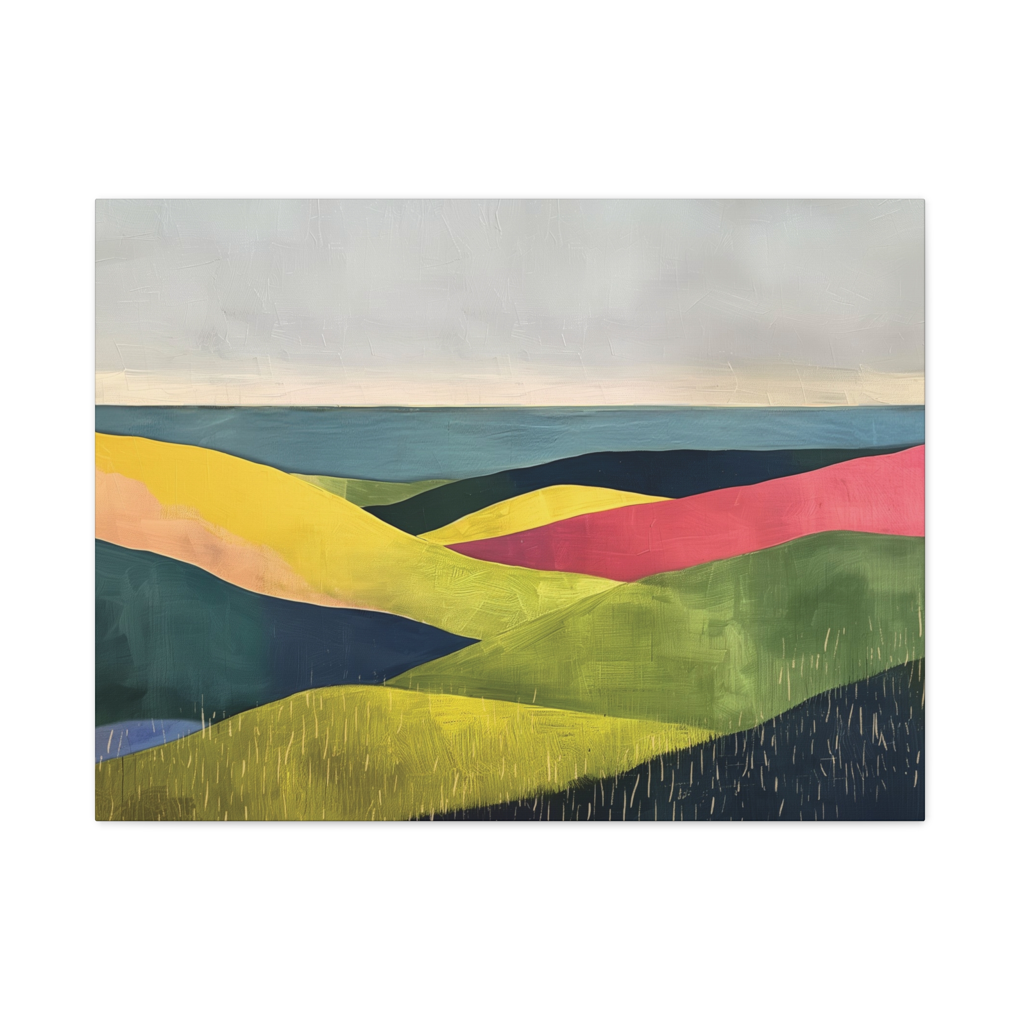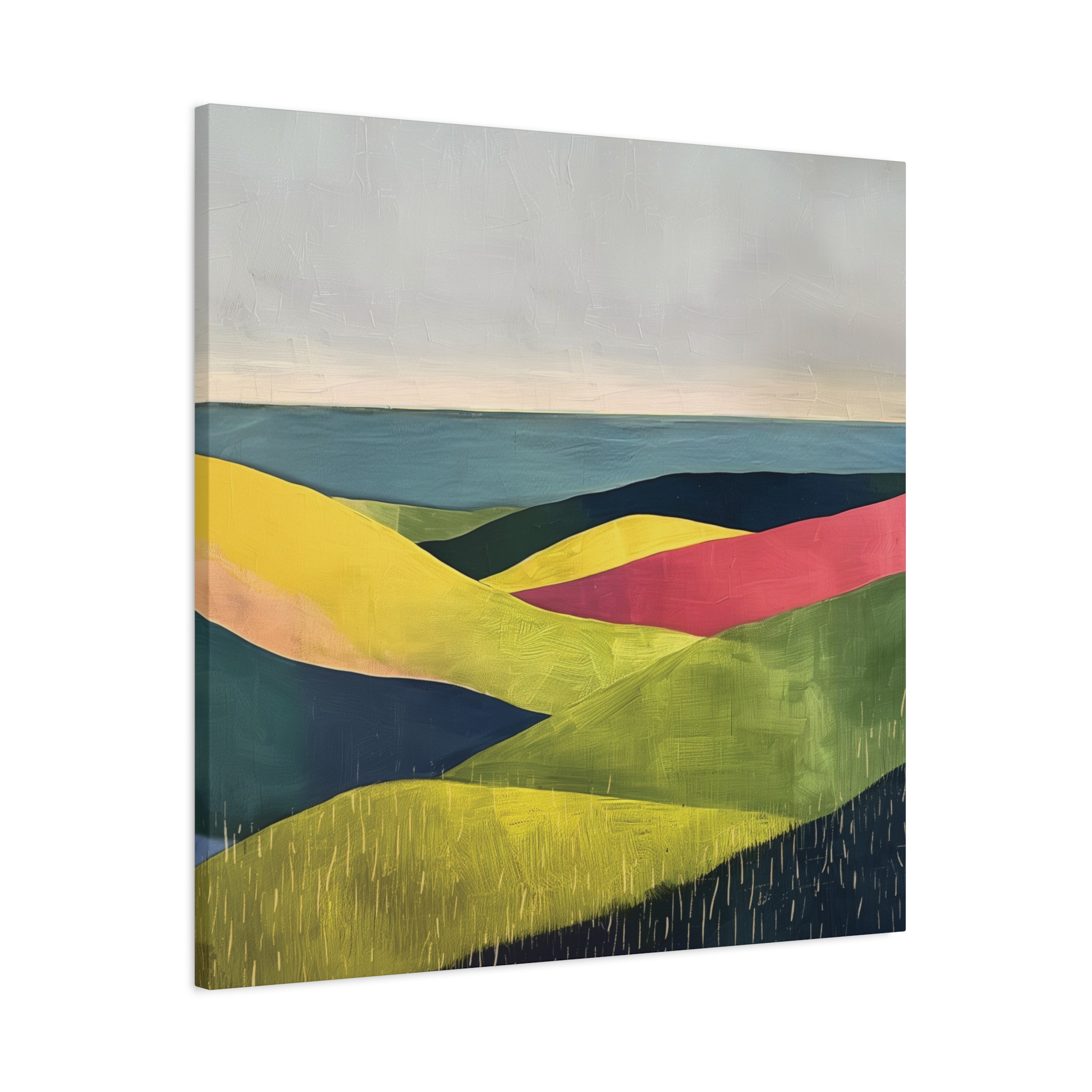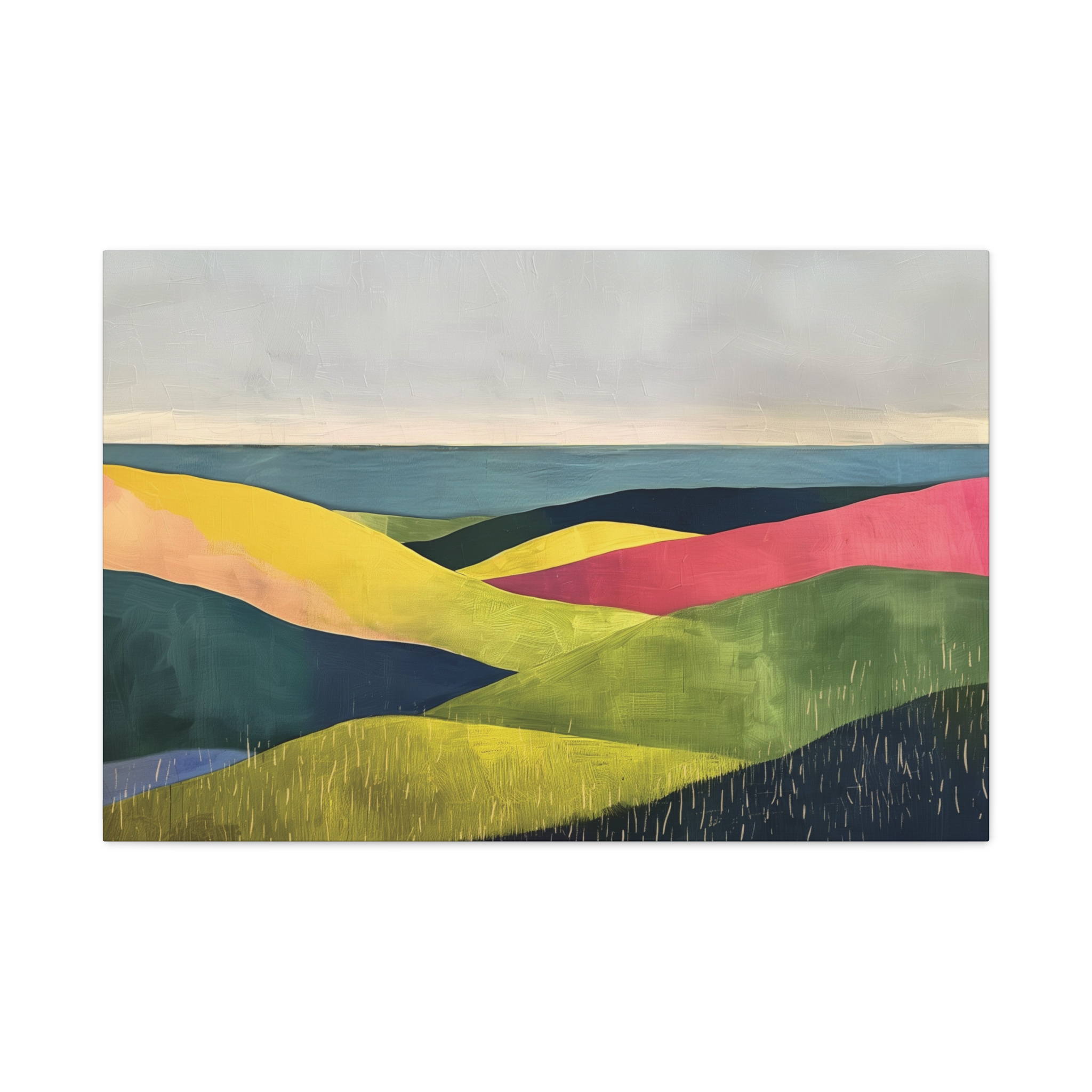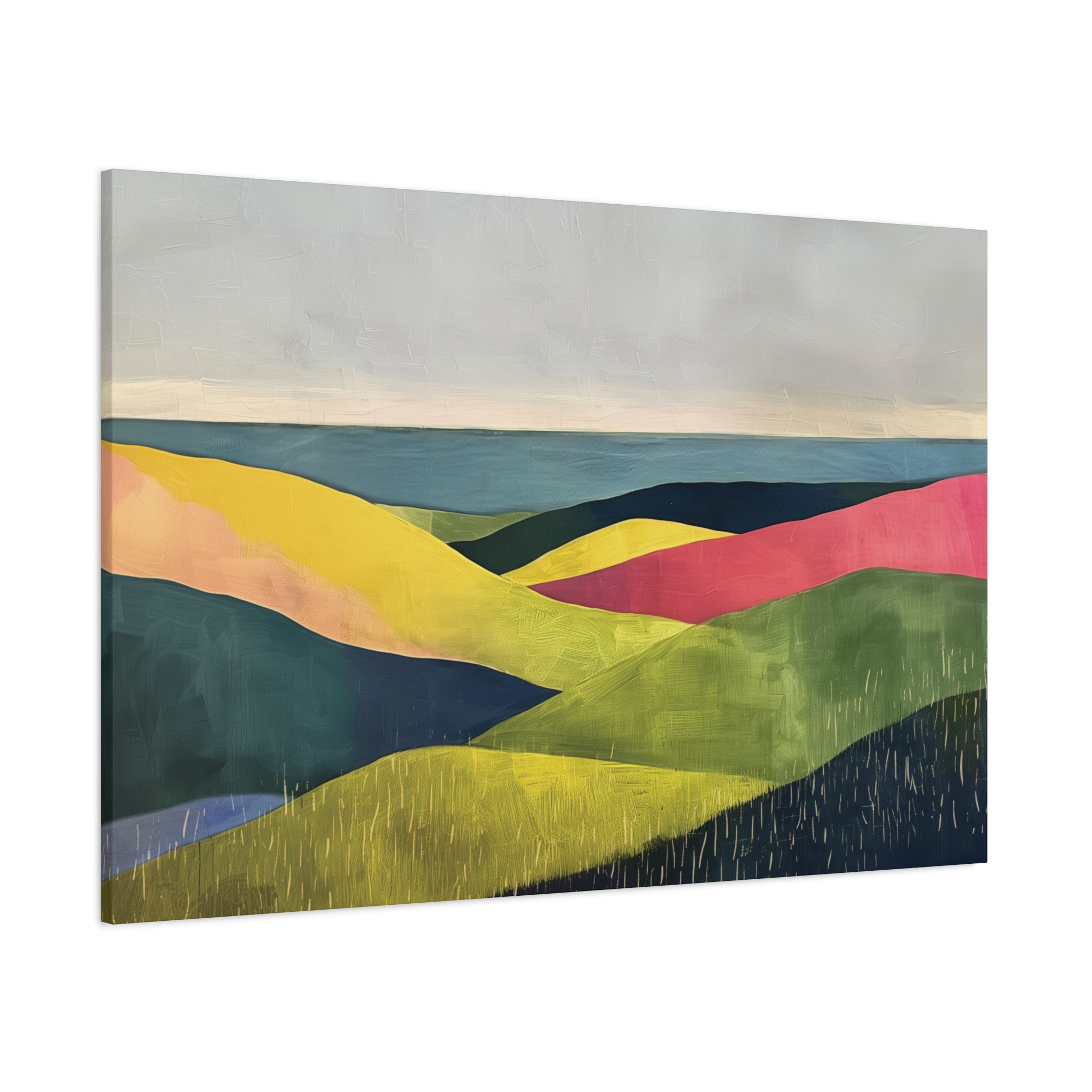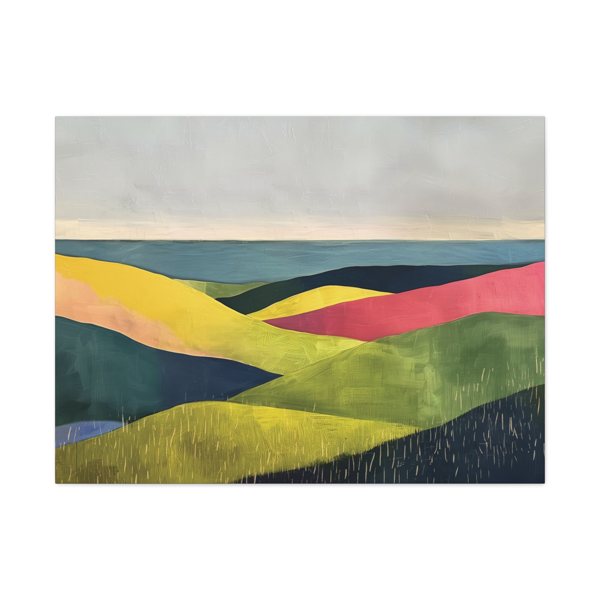 A colorful landscape with delicate aged paint texture. Perfect for adding a touch of sophistication to any room, this canvas is relevant for home decor enthusiasts, art lovers, and those looking to elevate their space. Ideal for gifting during birthdays, housewarmings, or as a special treat for yourself.