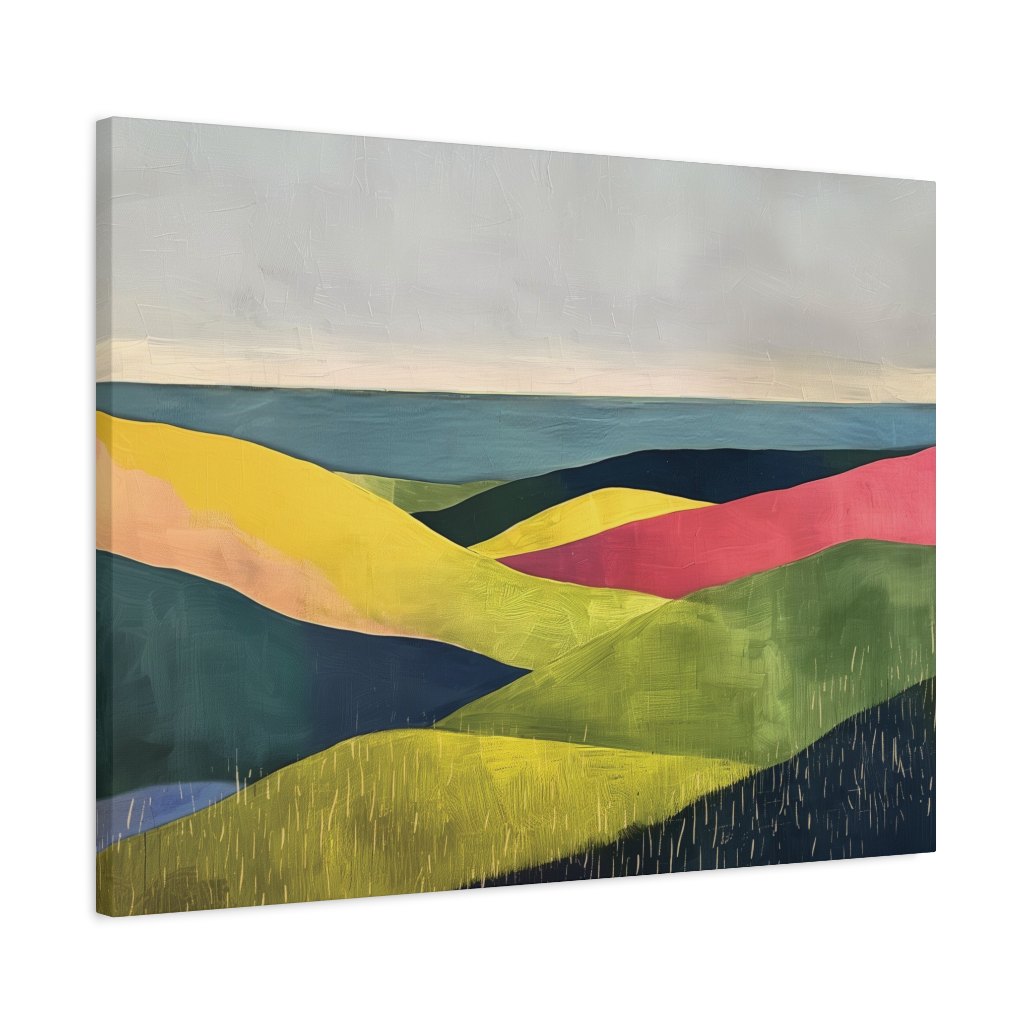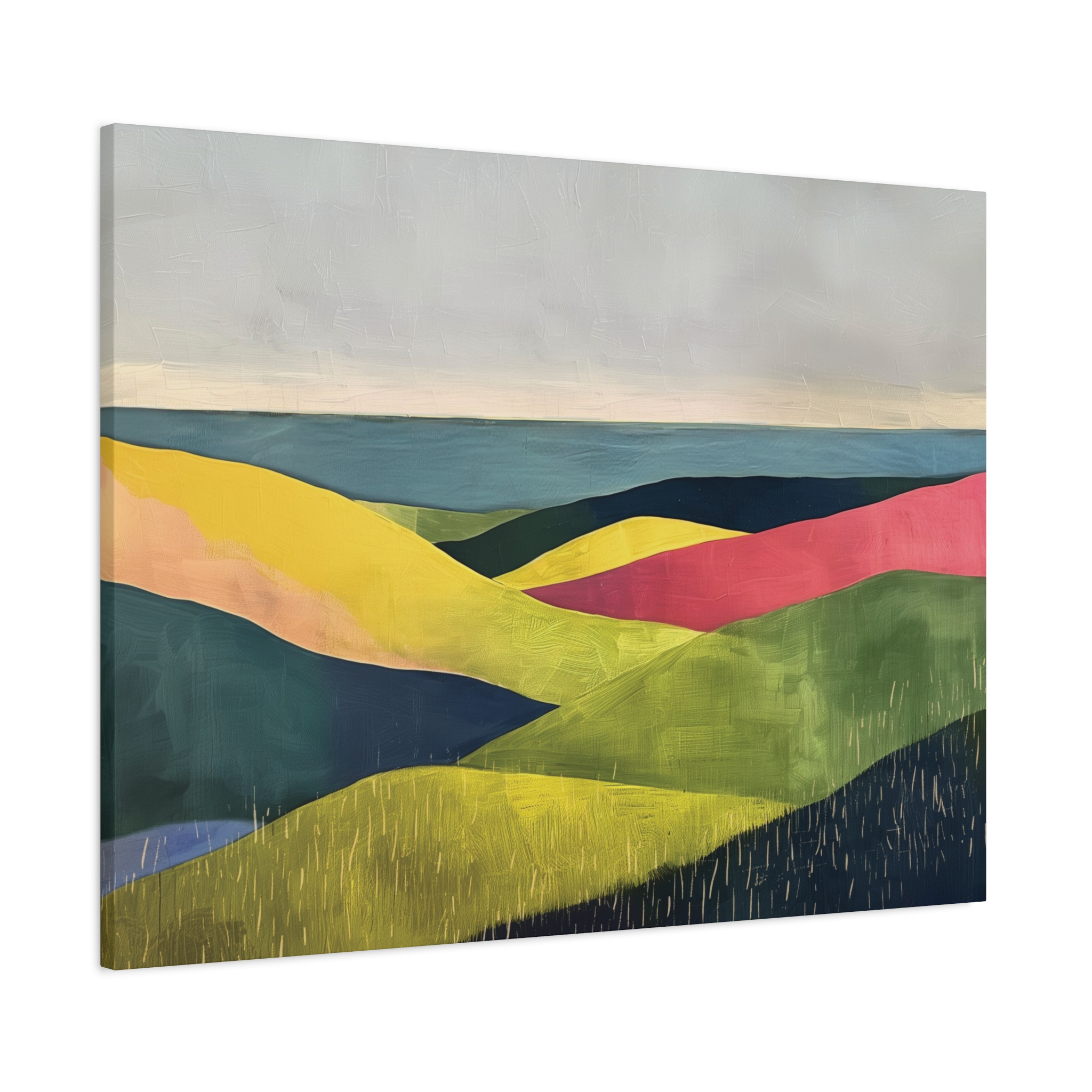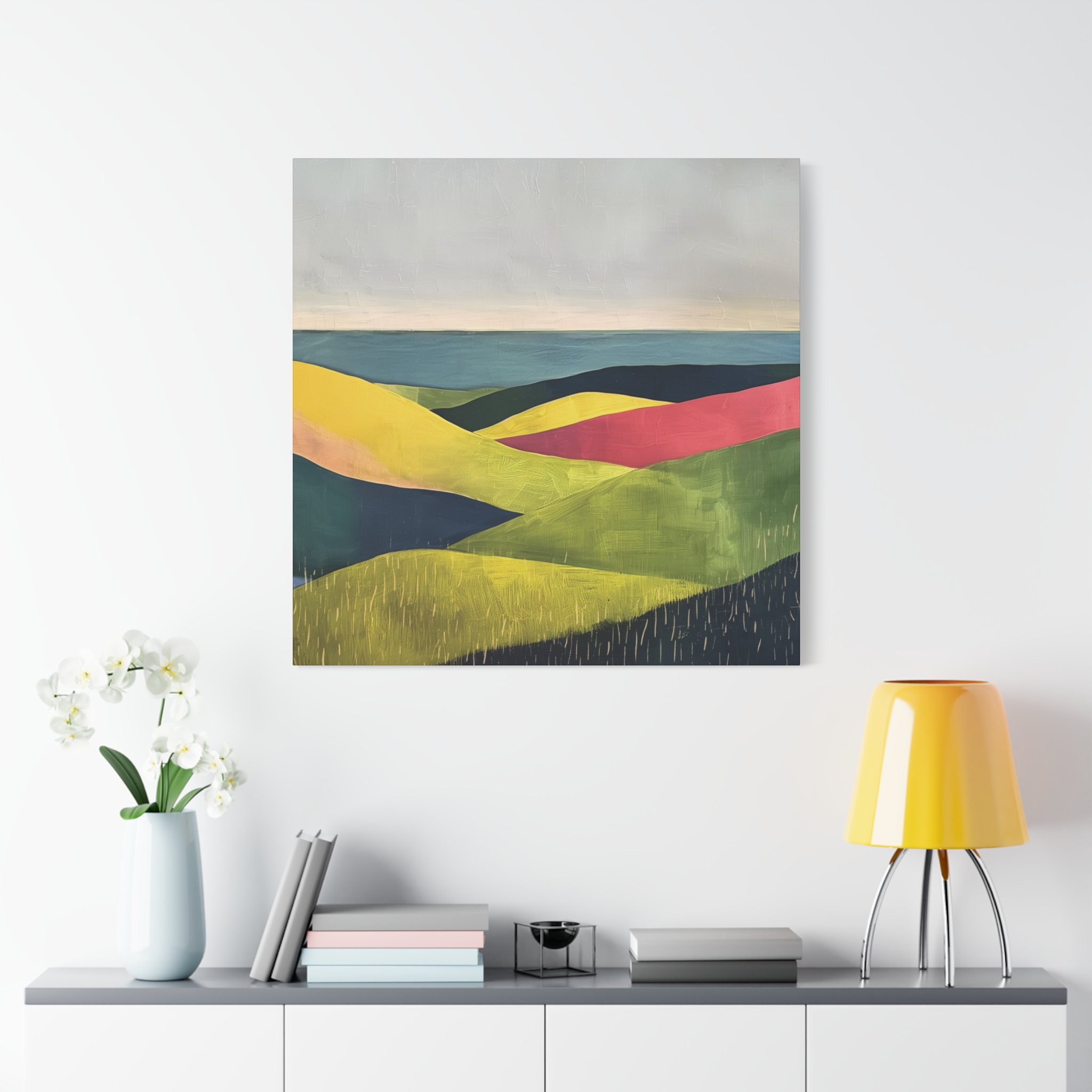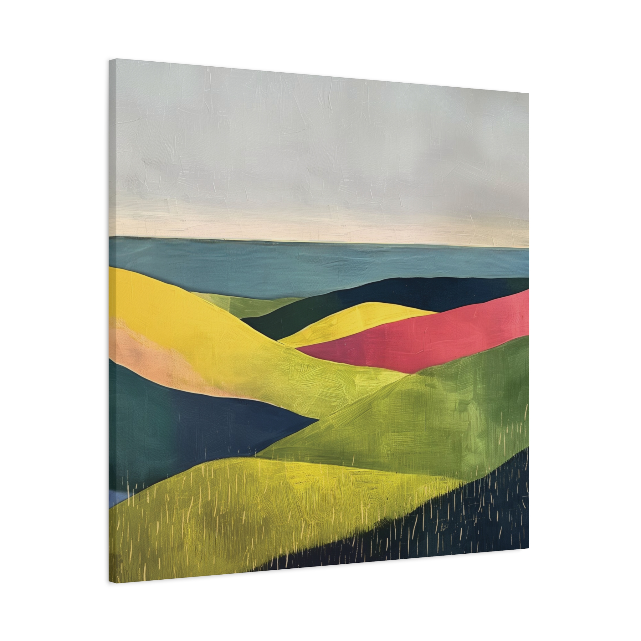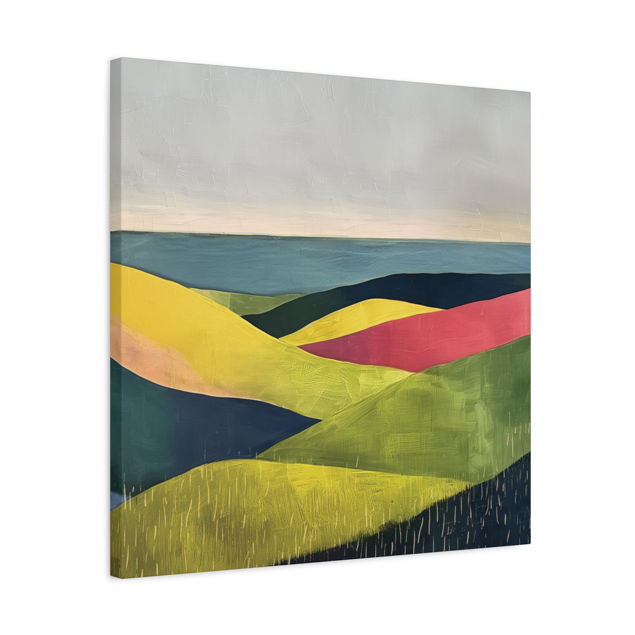 A colorful landscape with delicate aged paint texture. Perfect for adding a touch of sophistication to any room, this canvas is relevant for home decor enthusiasts, art lovers, and those looking to elevate their space. Ideal for gifting during birthdays, housewarmings, or as a special treat for yourself.