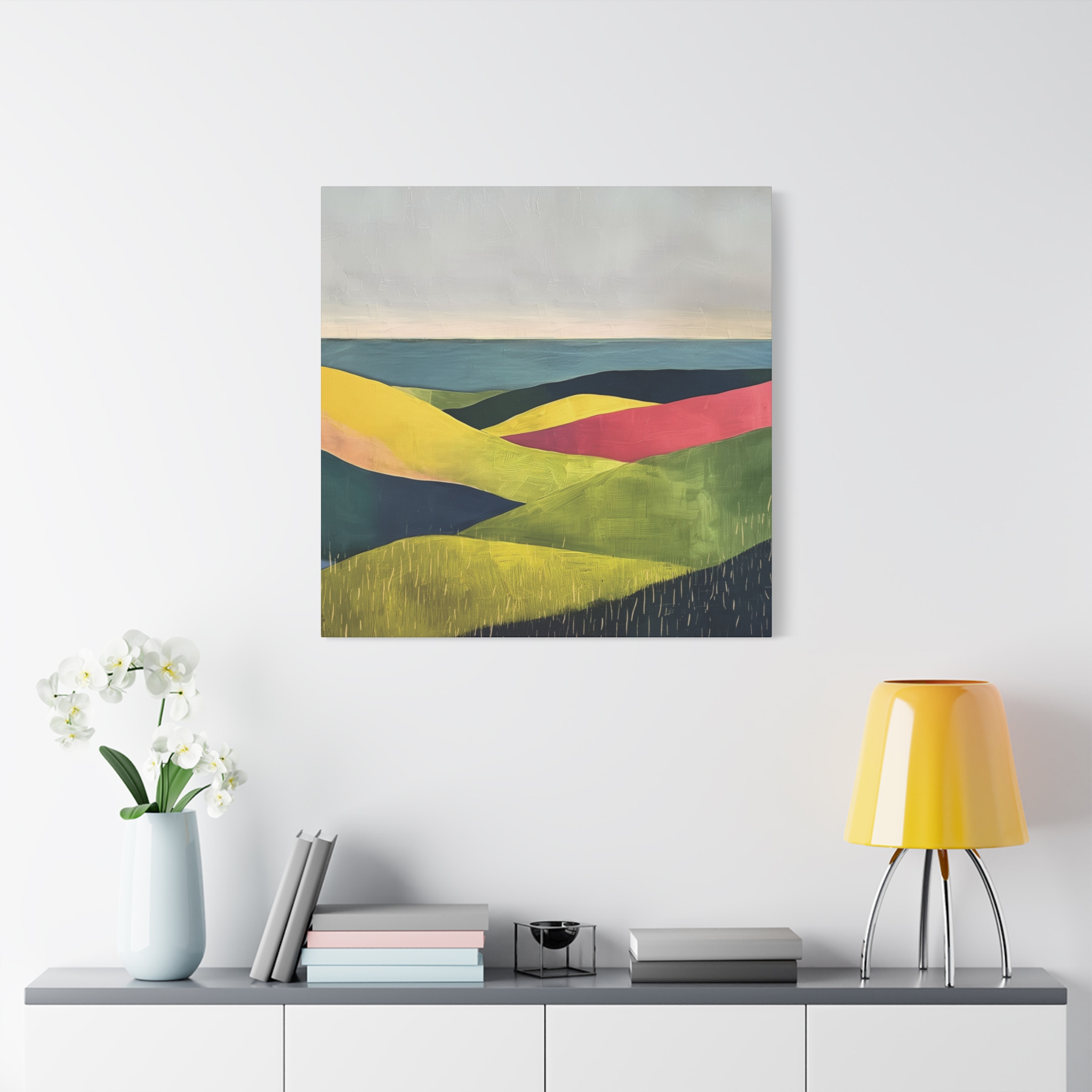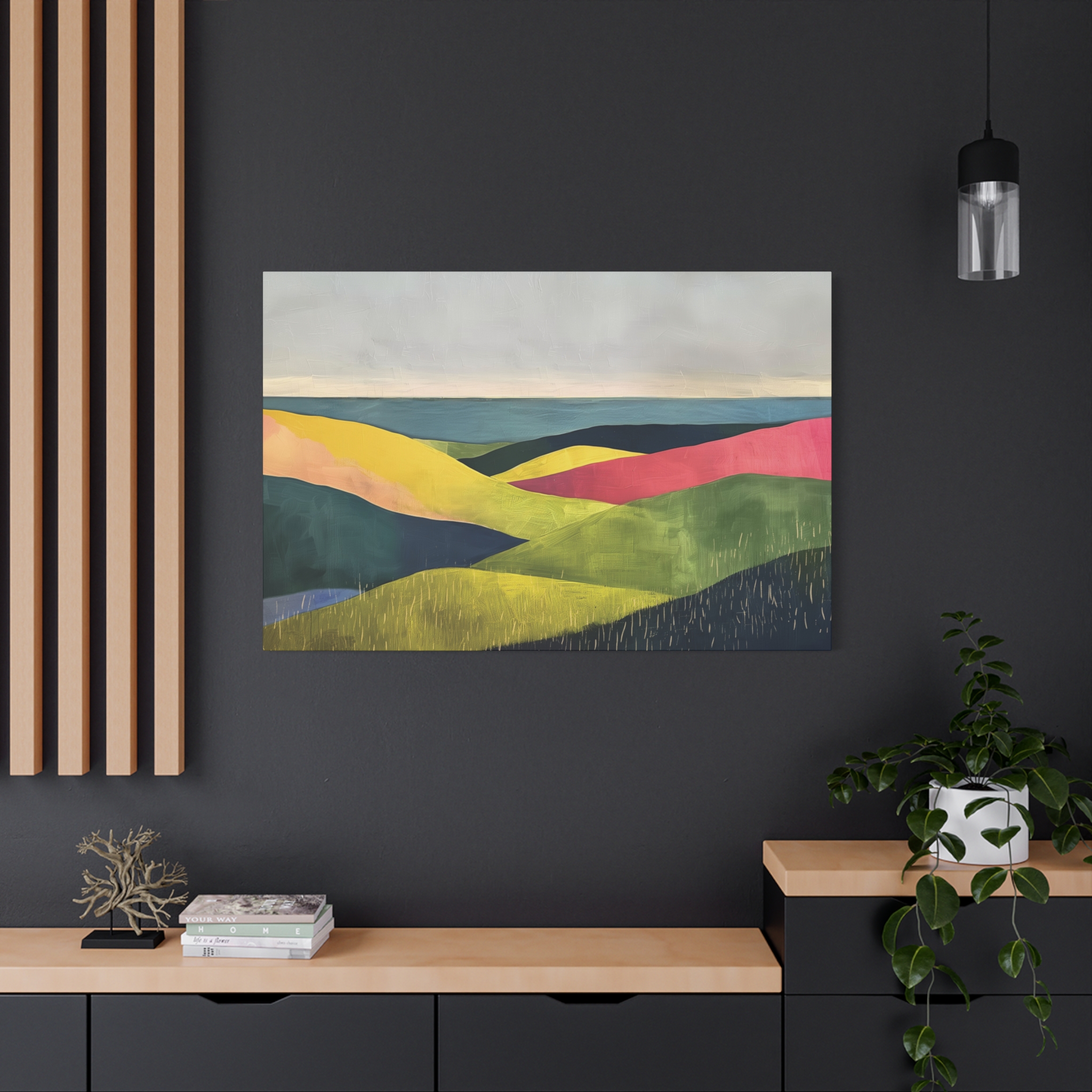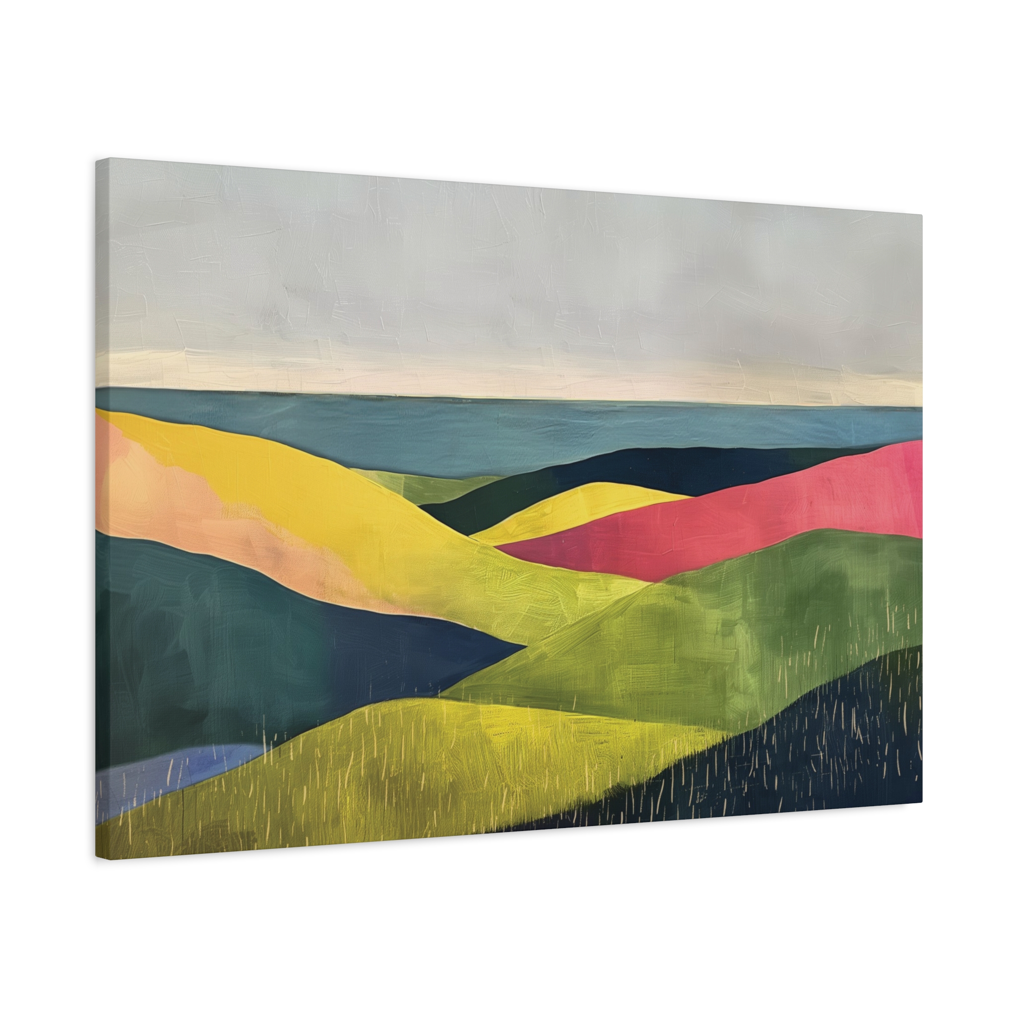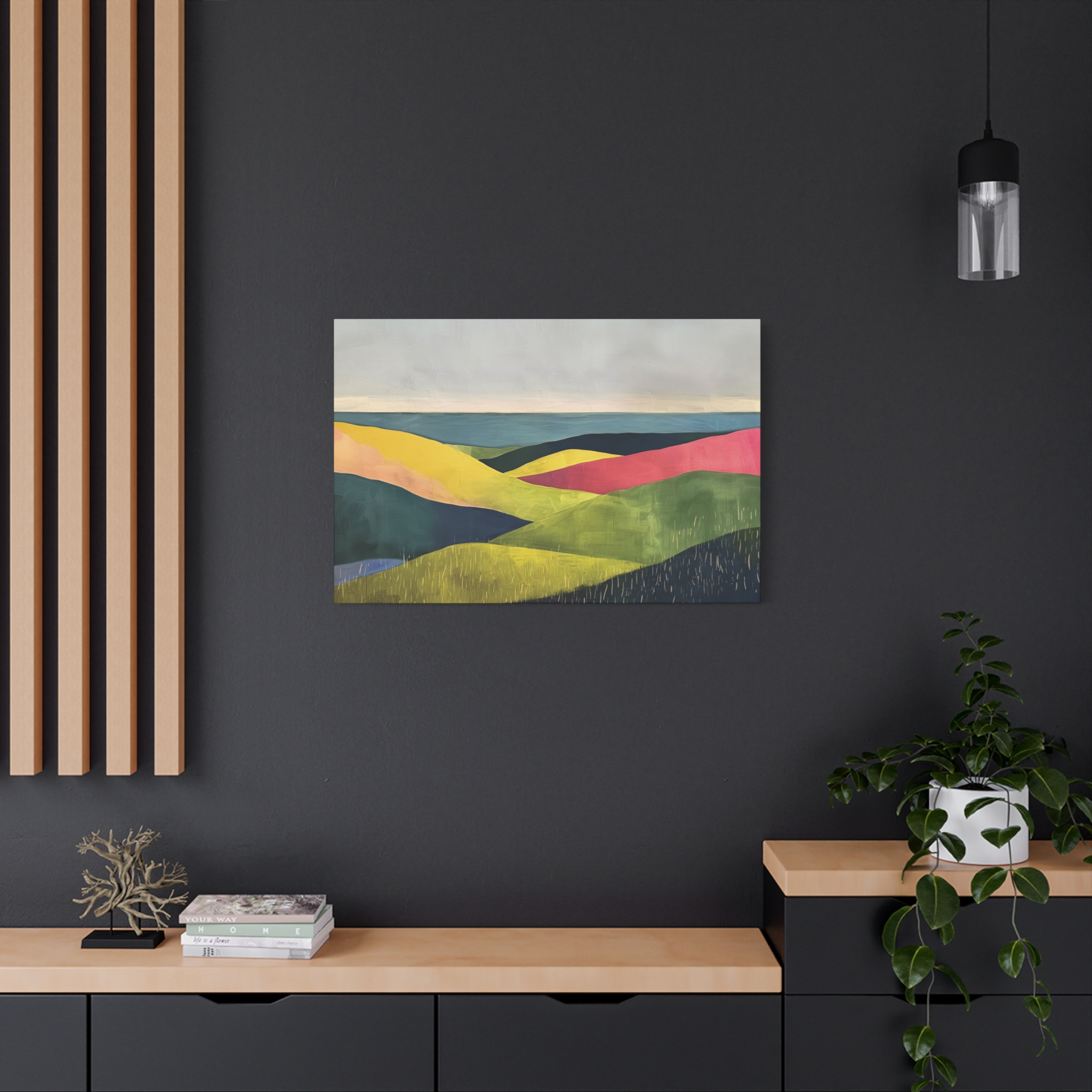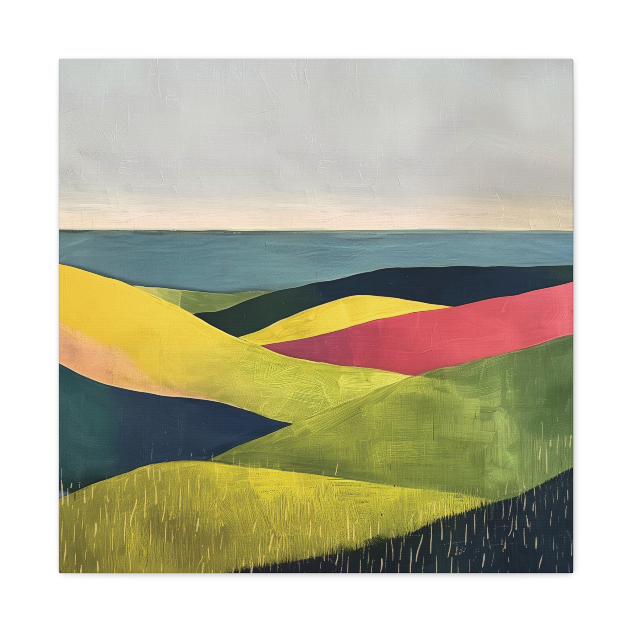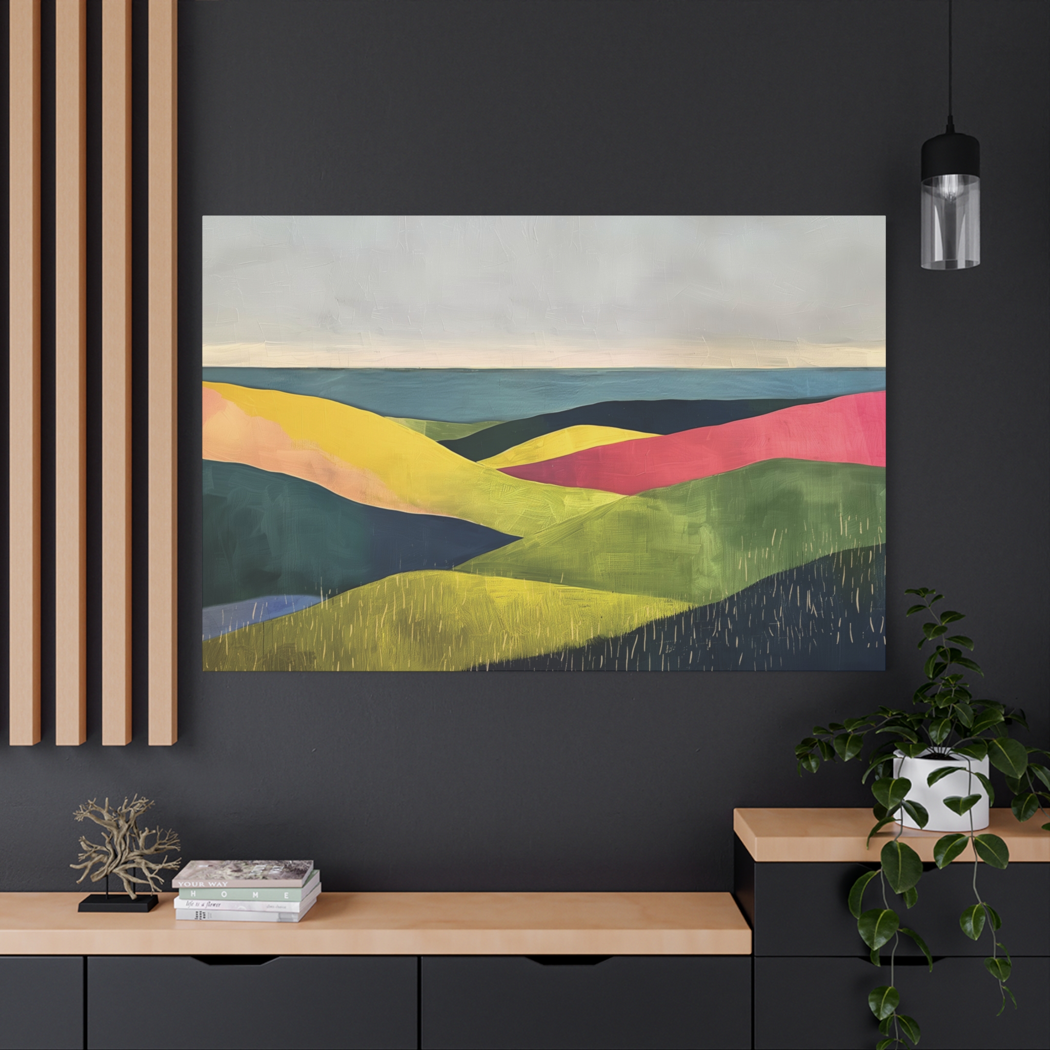 A colorful landscape with delicate aged paint texture. Perfect for adding a touch of sophistication to any room, this canvas is relevant for home decor enthusiasts, art lovers, and those looking to elevate their space. Ideal for gifting during birthdays, housewarmings, or as a special treat for yourself.