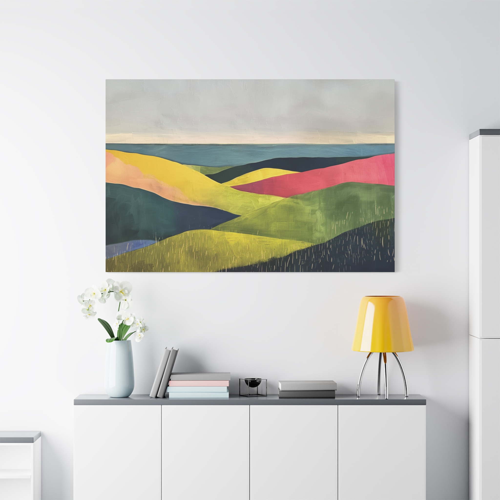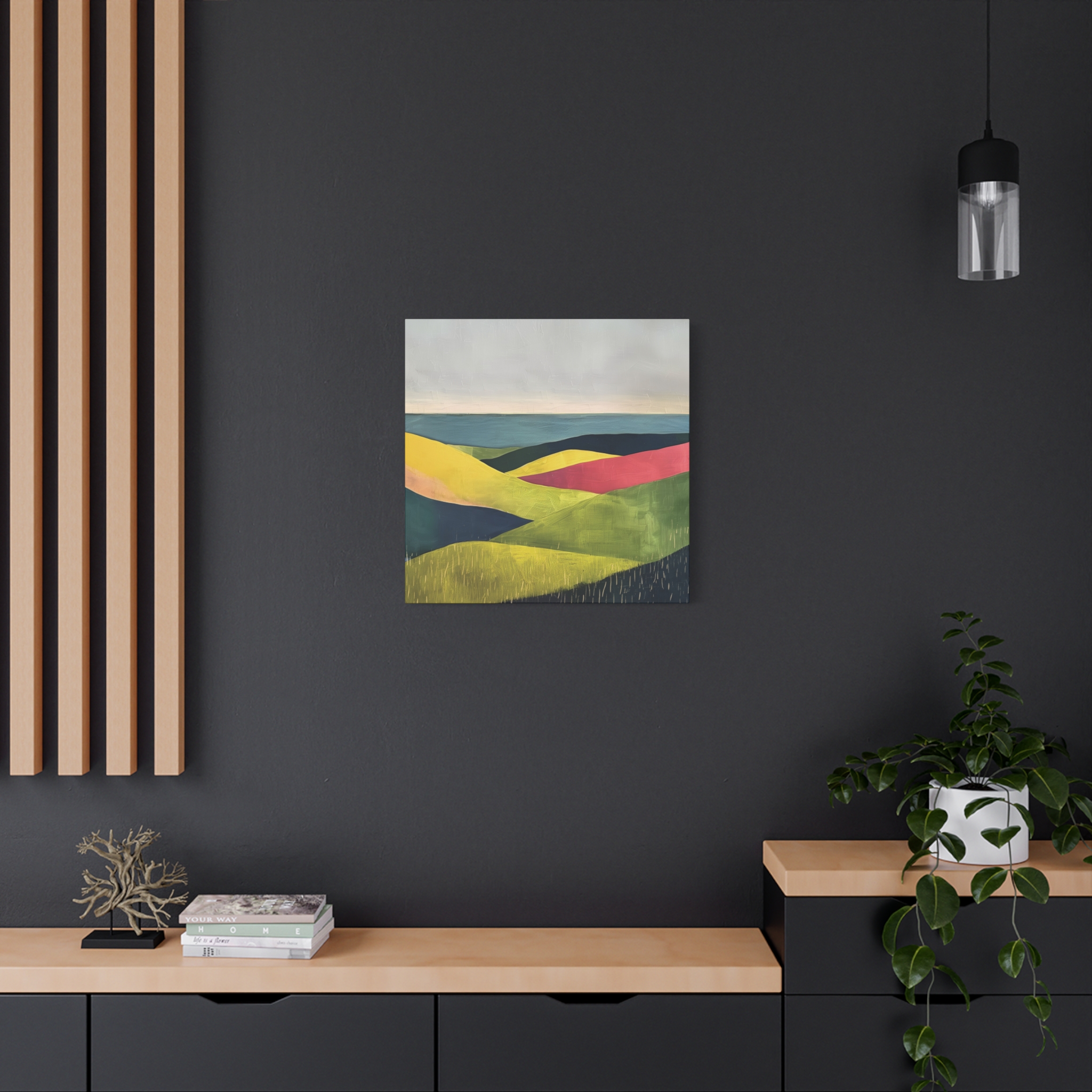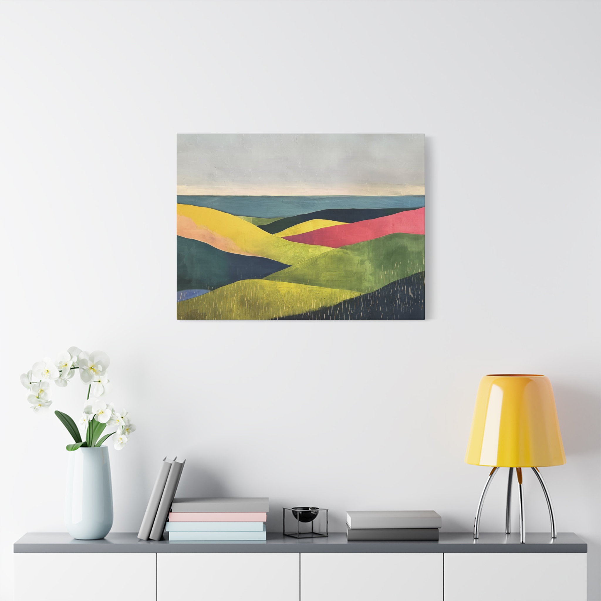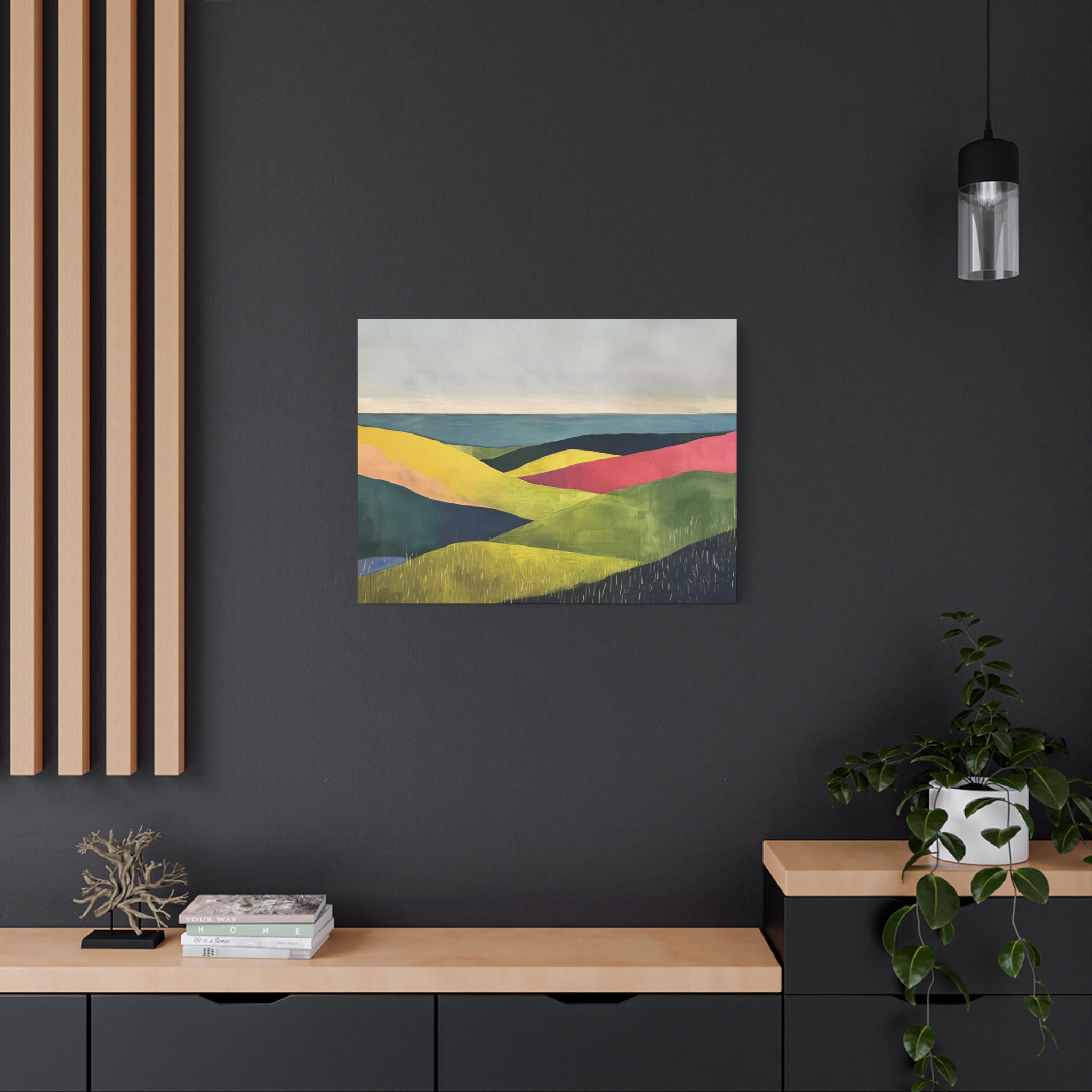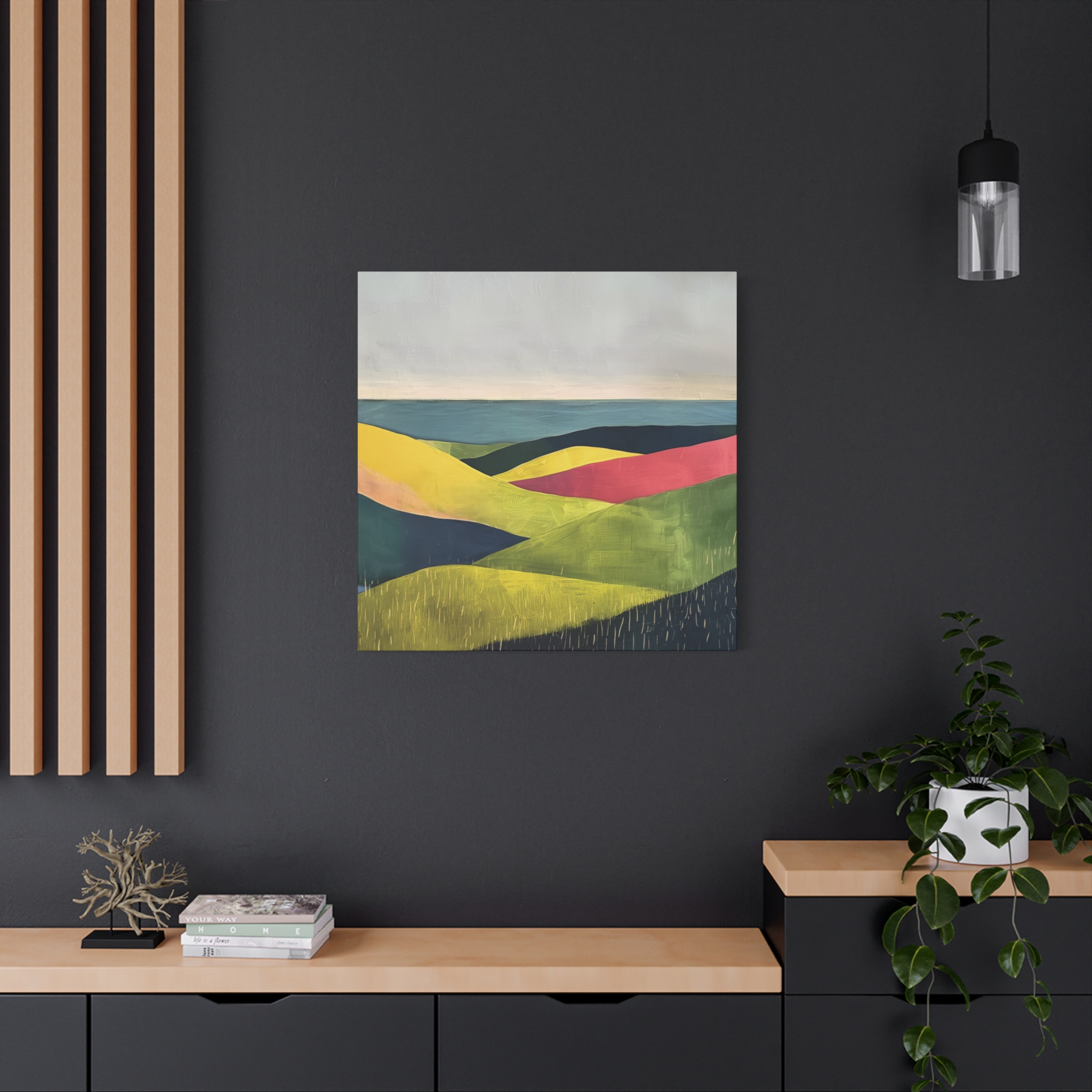 A colorful landscape with delicate aged paint texture. Perfect for adding a touch of sophistication to any room, this canvas is relevant for home decor enthusiasts, art lovers, and those looking to elevate their space. Ideal for gifting during birthdays, housewarmings, or as a special treat for yourself.
