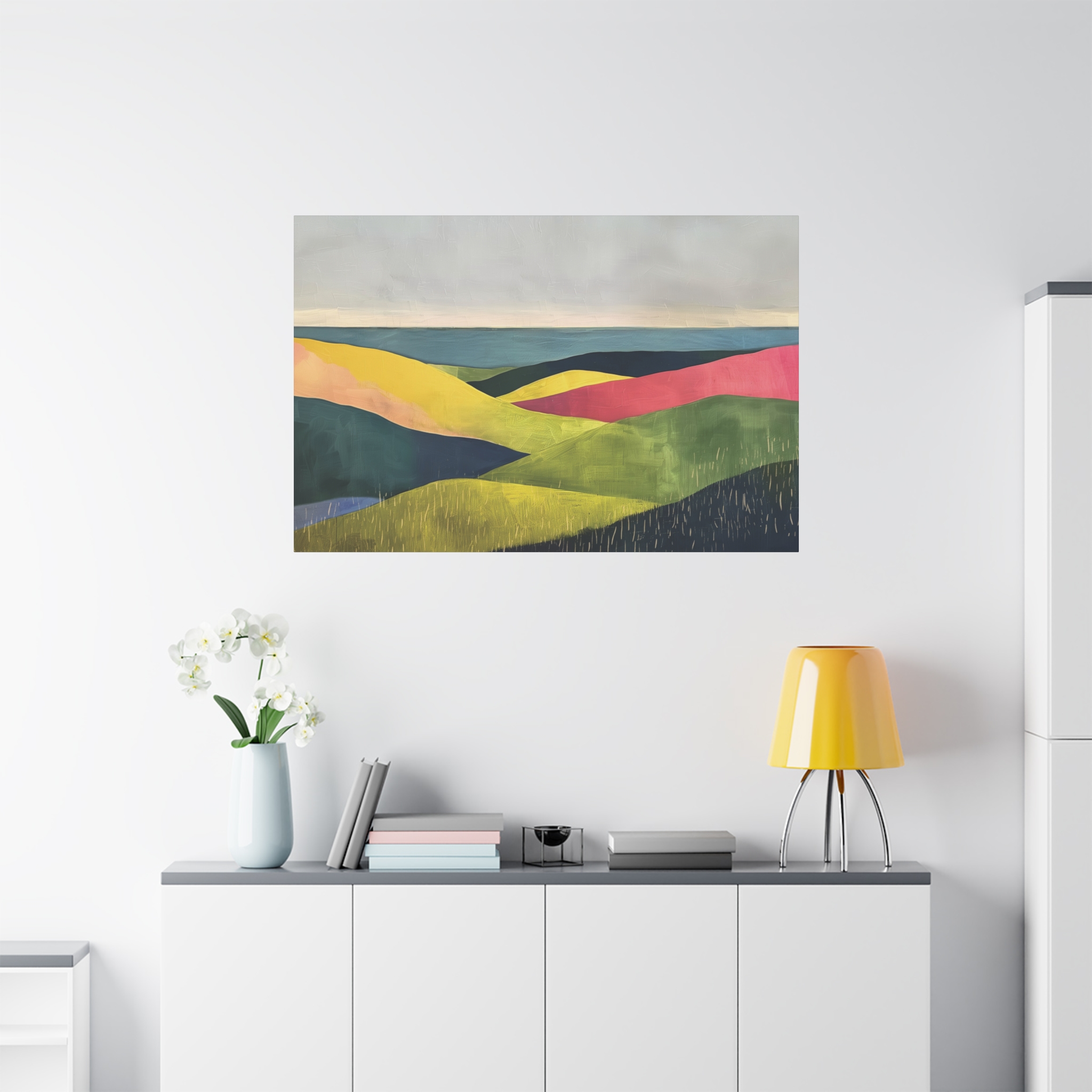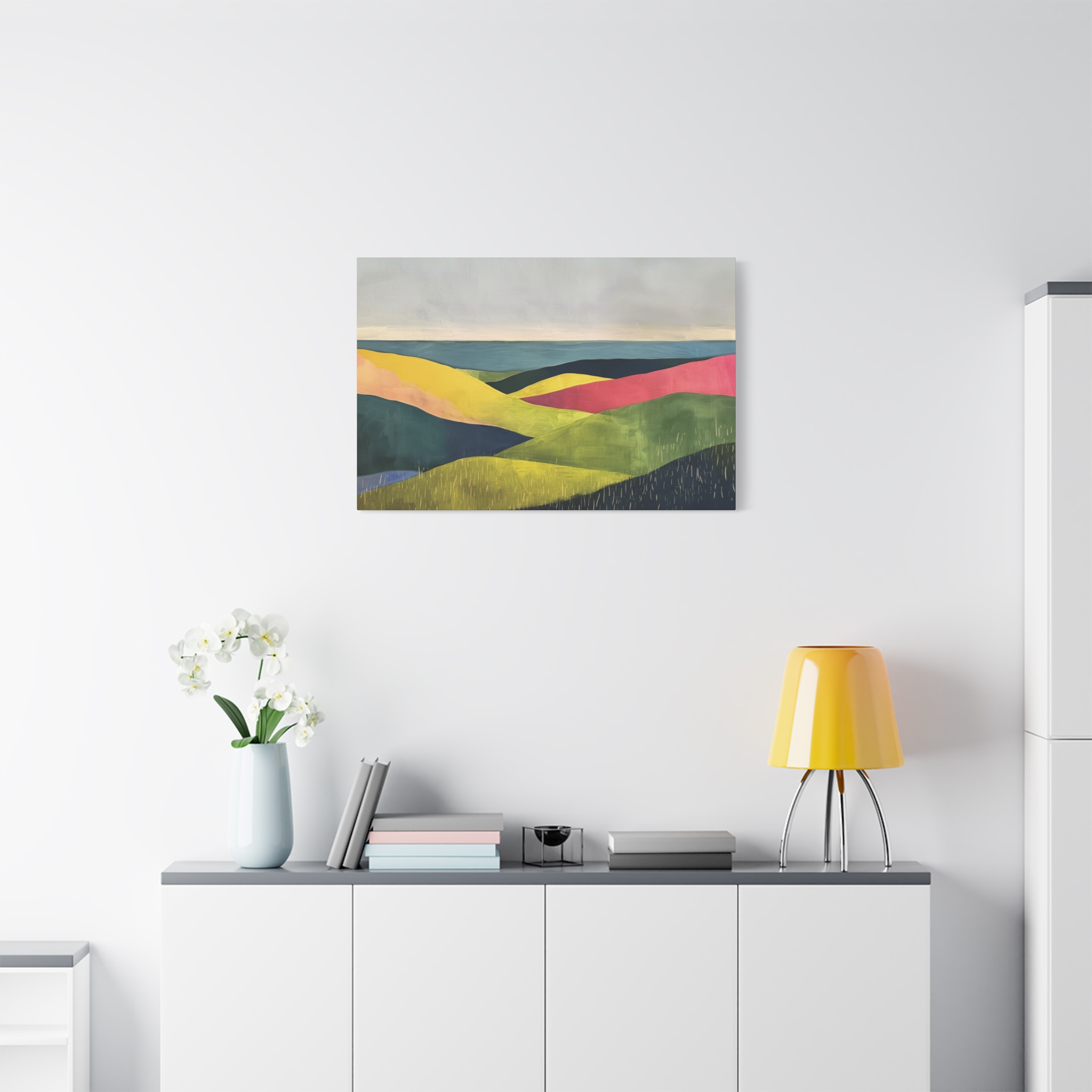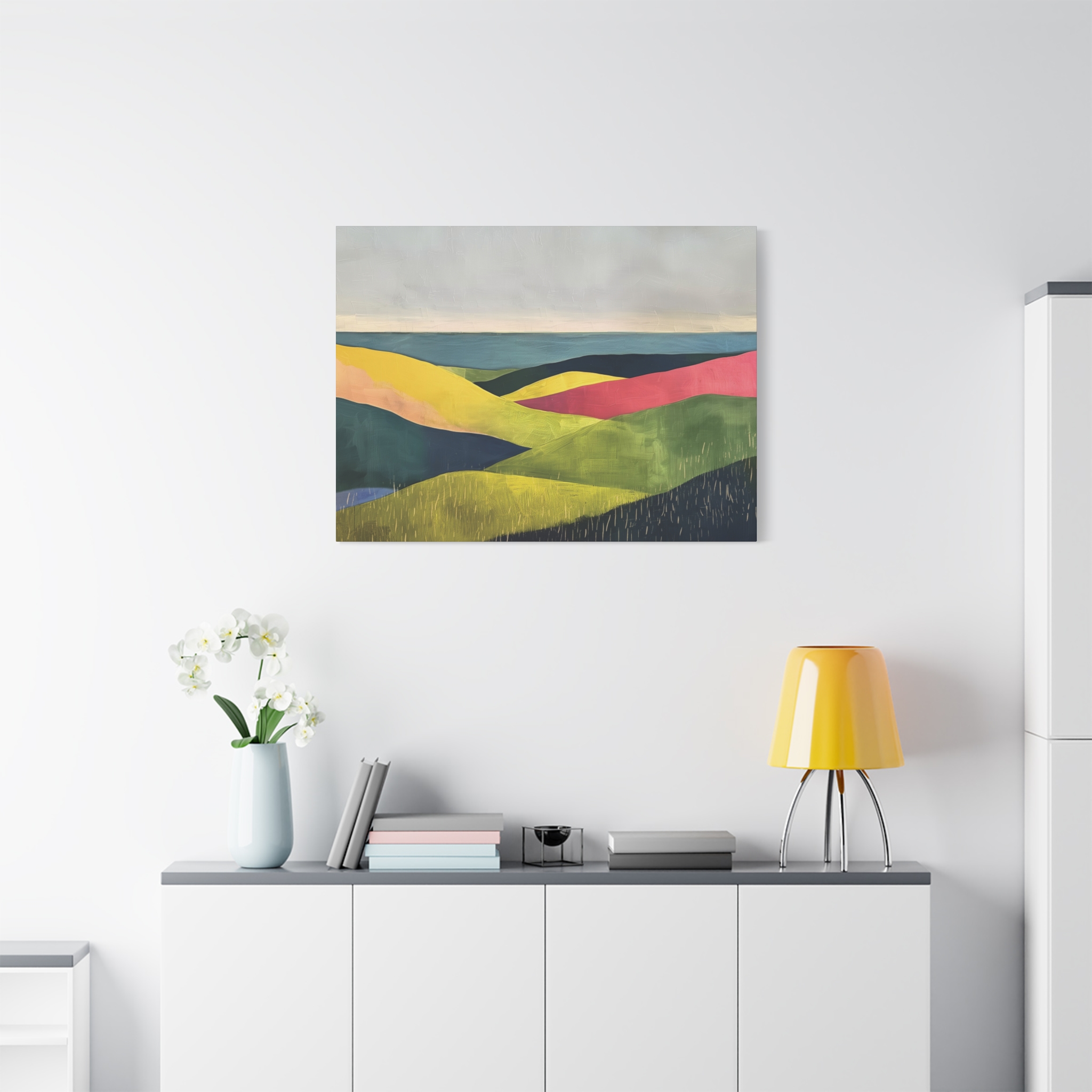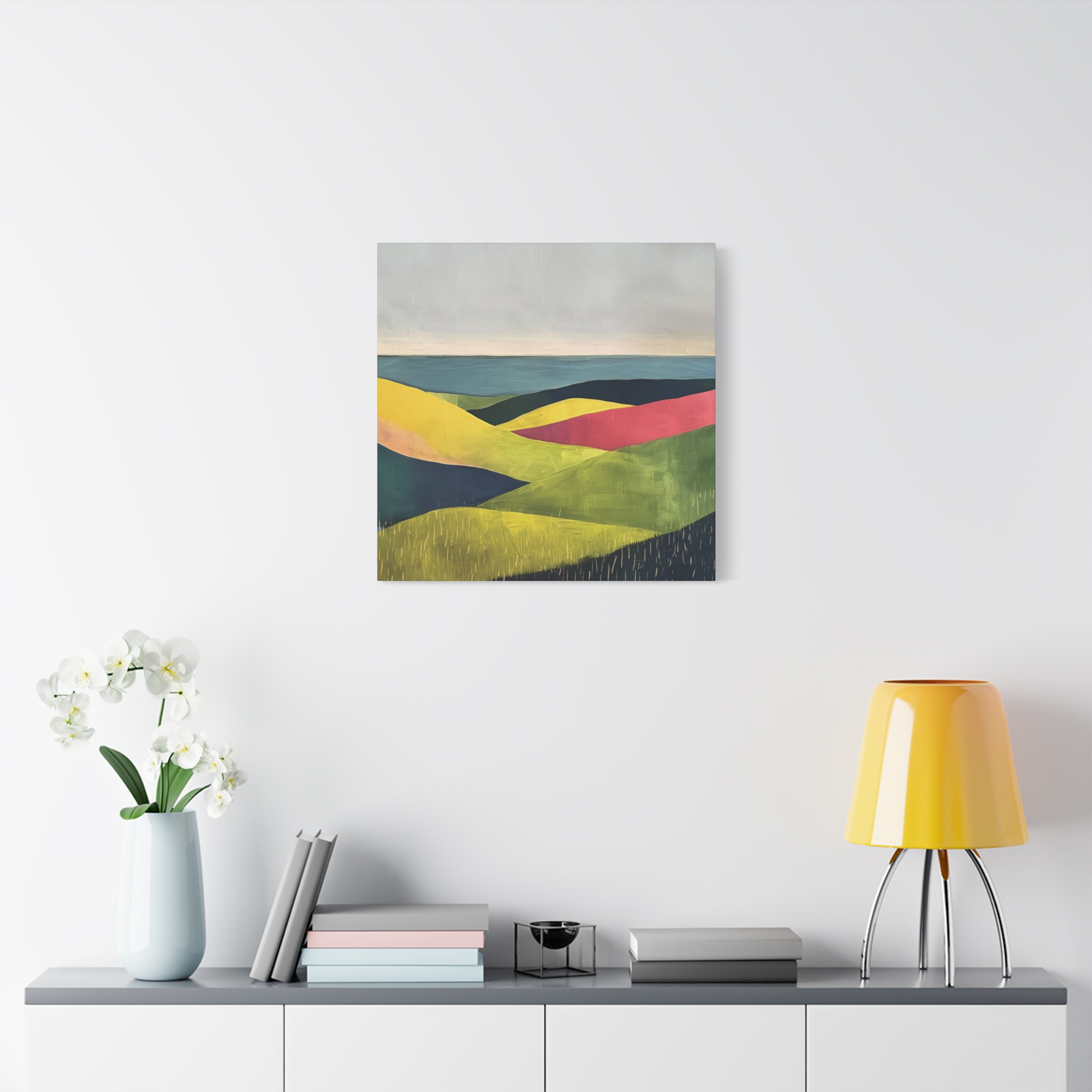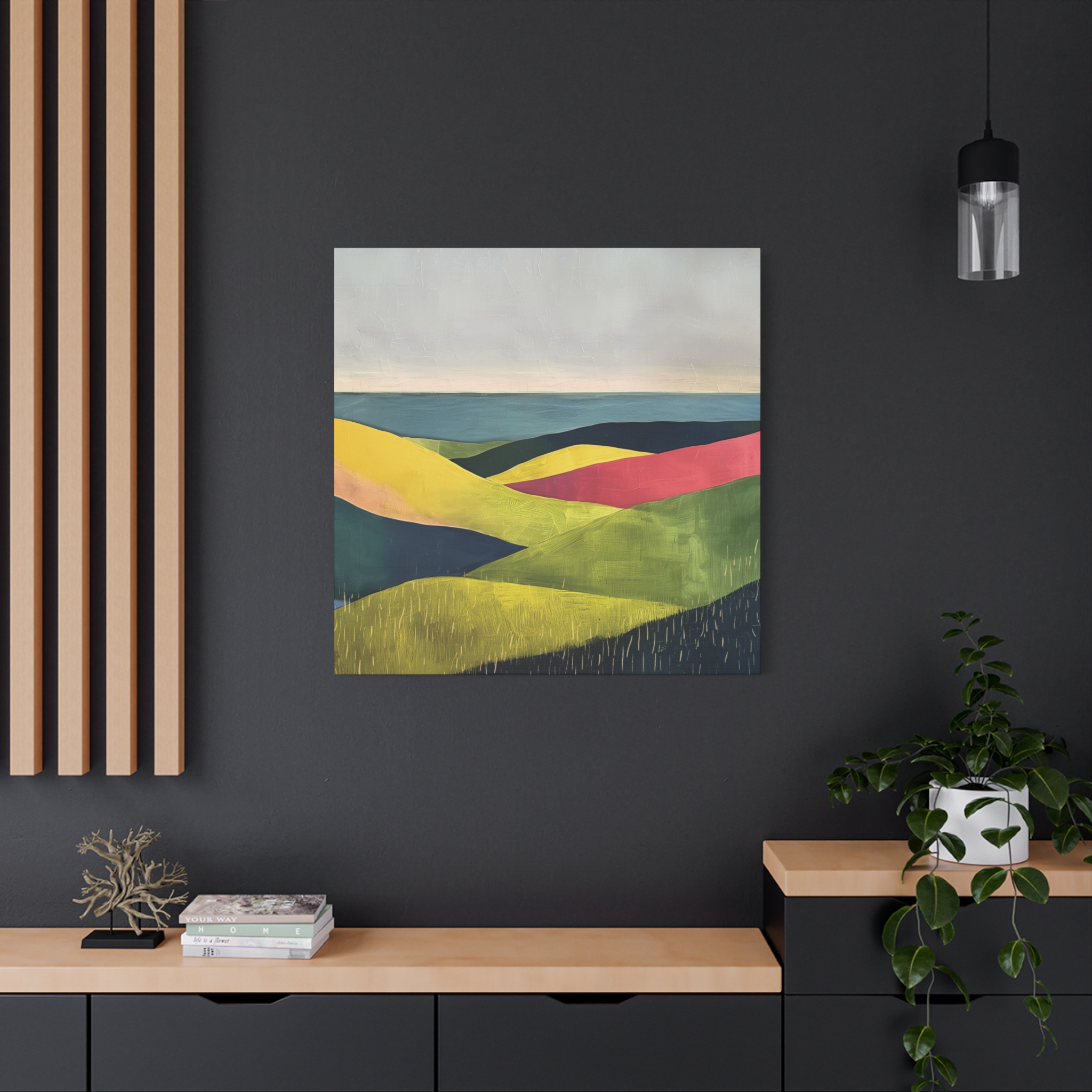 A colorful landscape with delicate aged paint texture. Perfect for adding a touch of sophistication to any room, this canvas is relevant for home decor enthusiasts, art lovers, and those looking to elevate their space. Ideal for gifting during birthdays, housewarmings, or as a special treat for yourself.