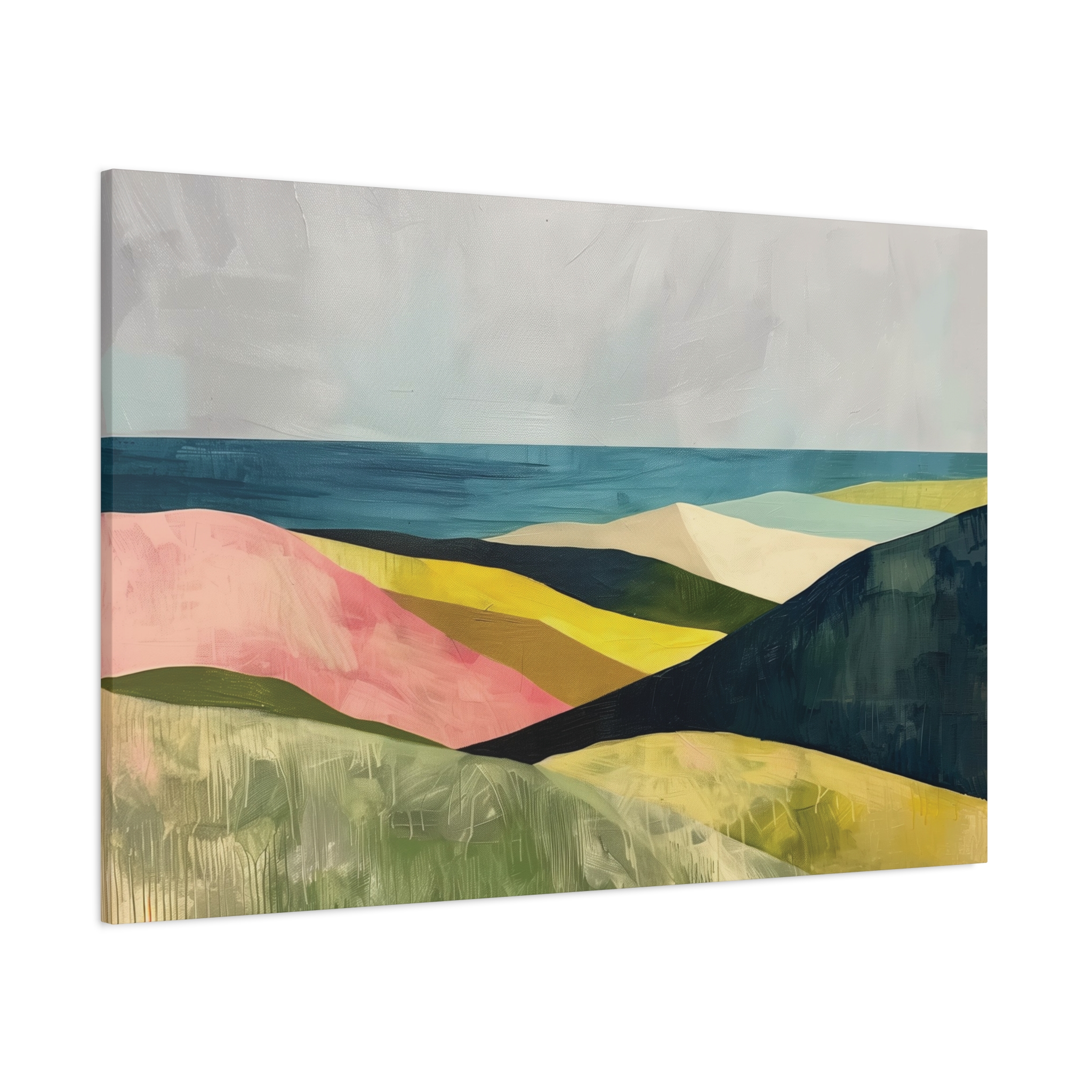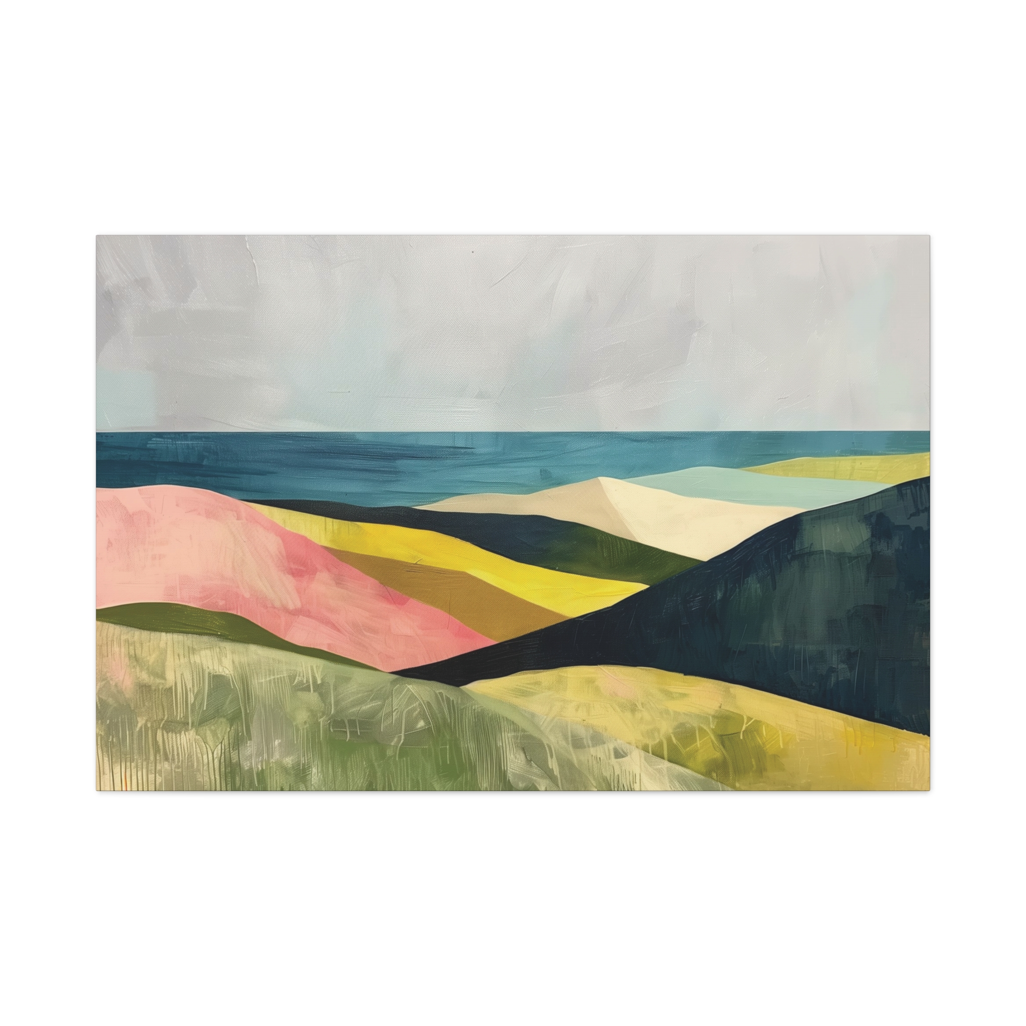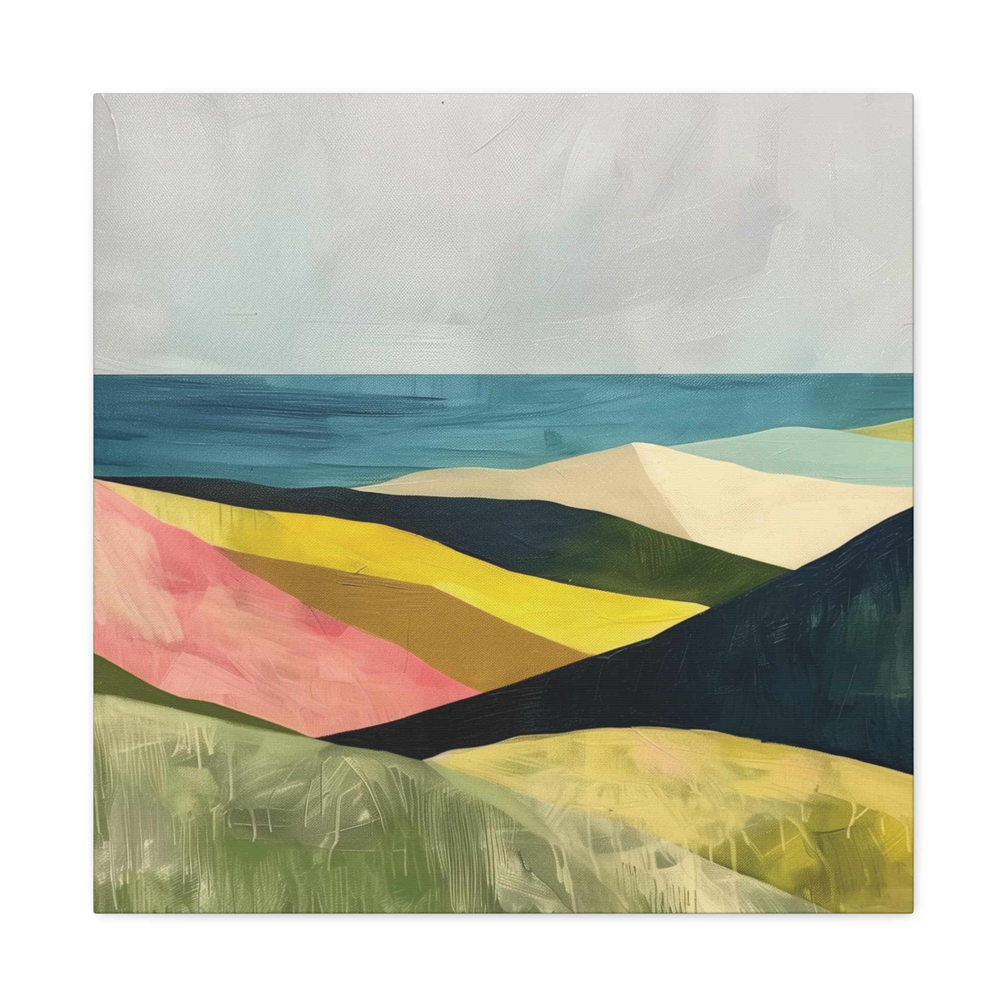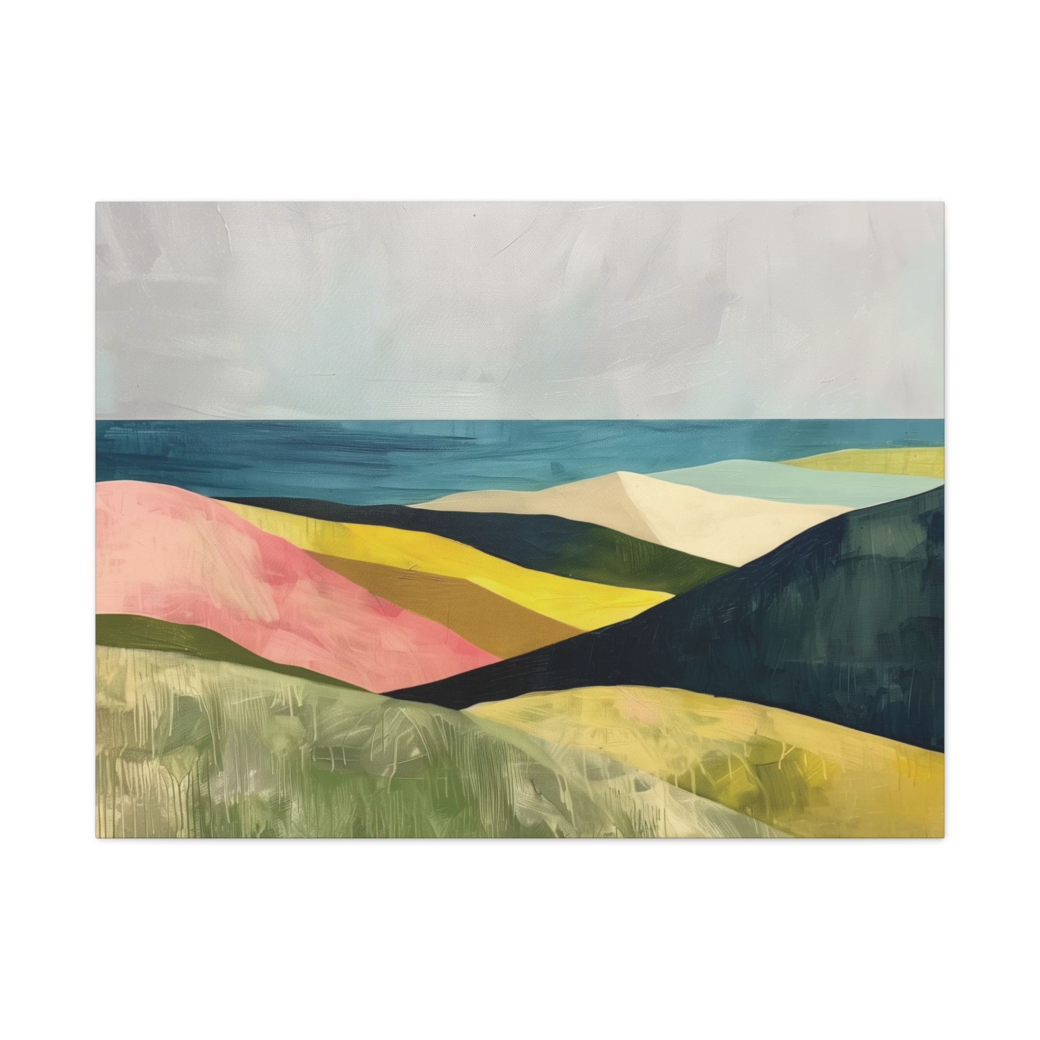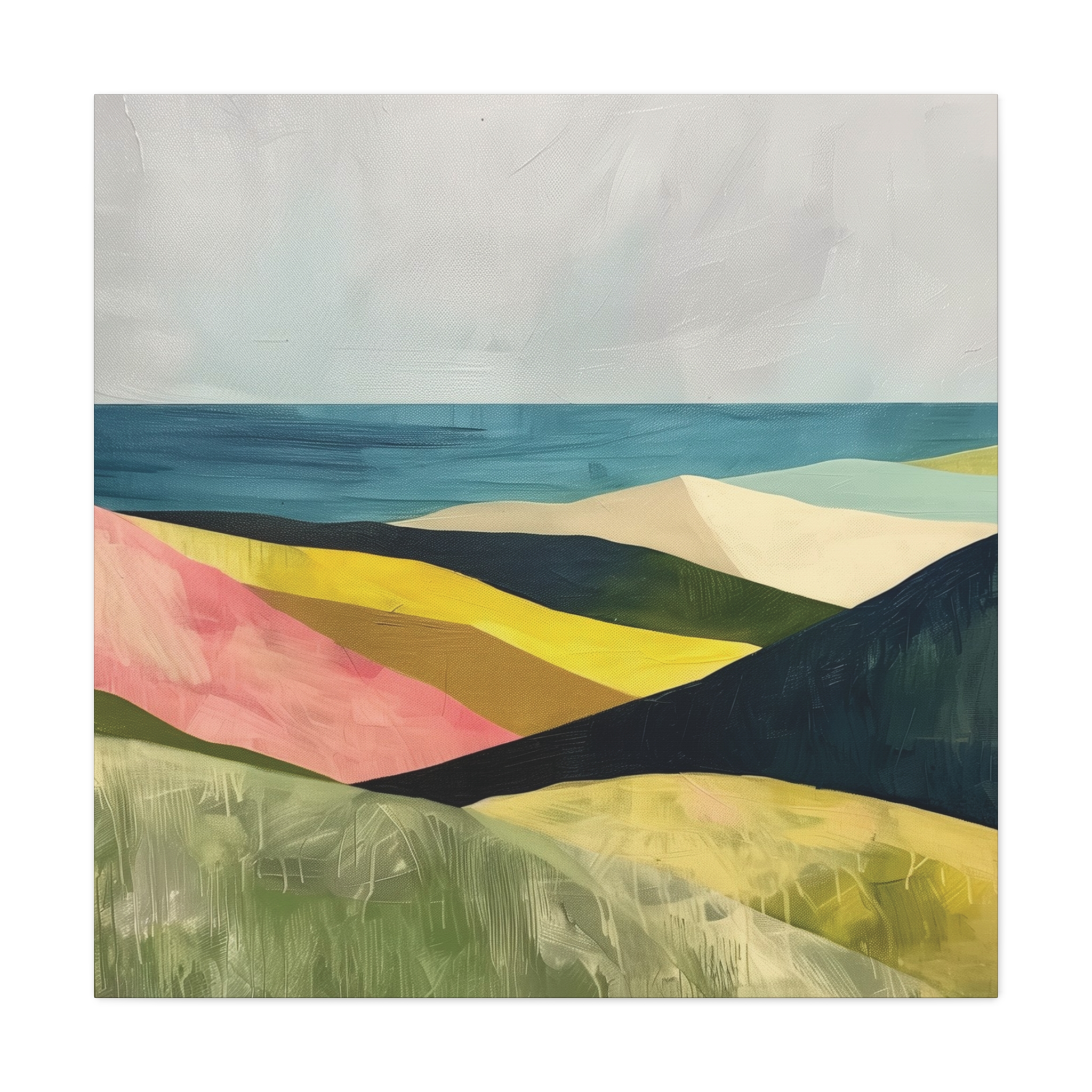 A colorful landscape with delicate aged paint texture. Perfect for adding a touch of sophistication to any room, this canvas is relevant for home decor enthusiasts, art lovers, and those looking to elevate their space. Ideal for gifting during birthdays, housewarmings, or as a special treat for yourself.