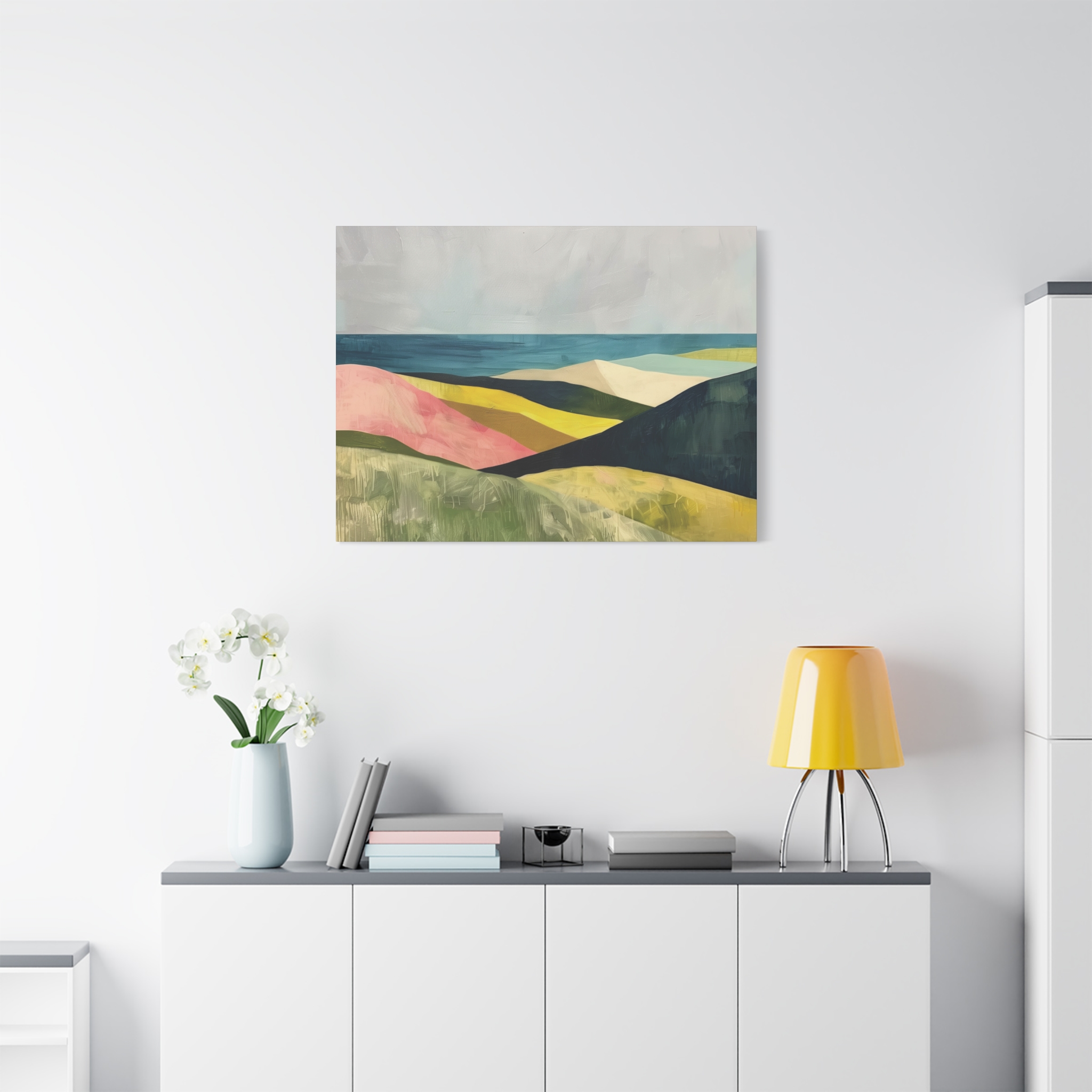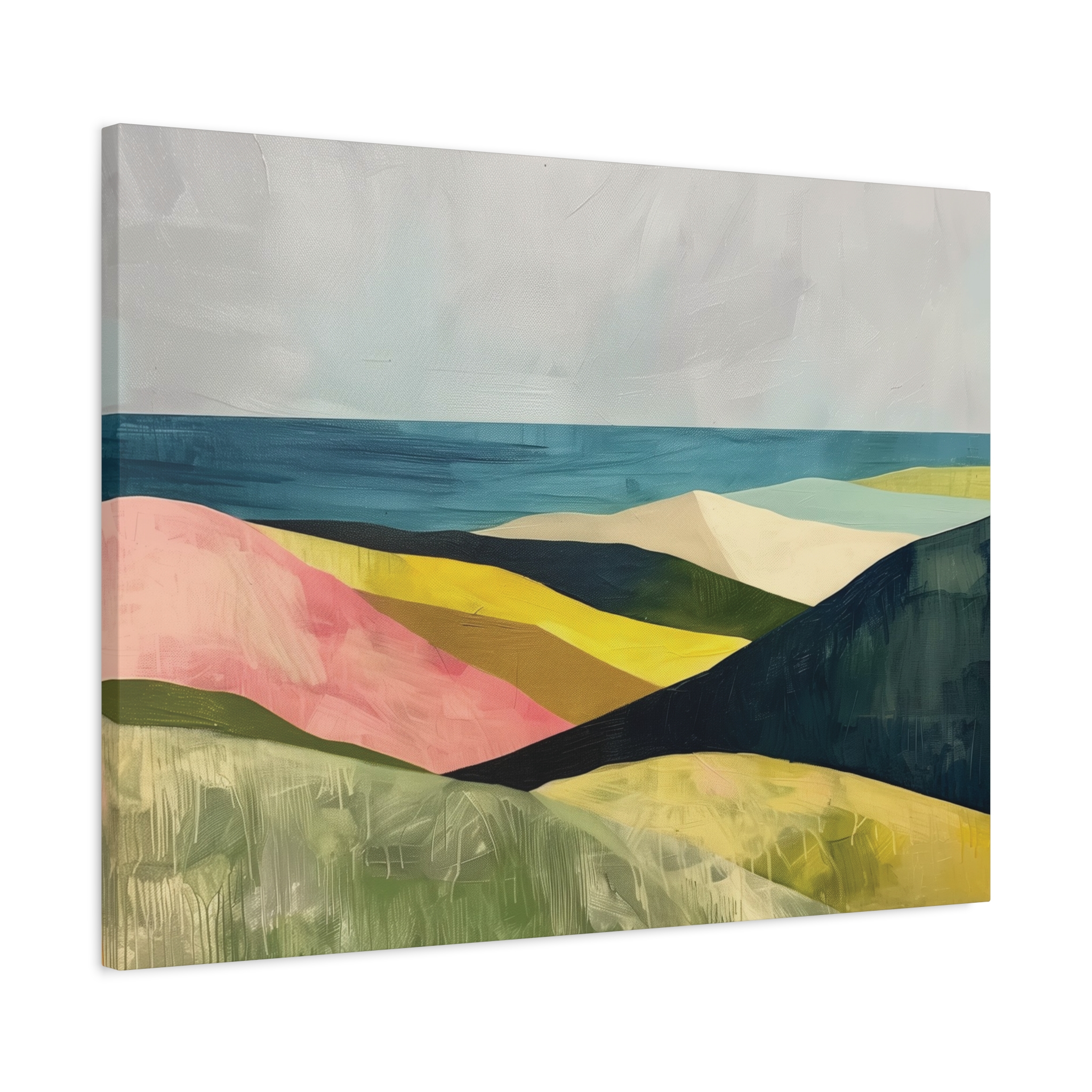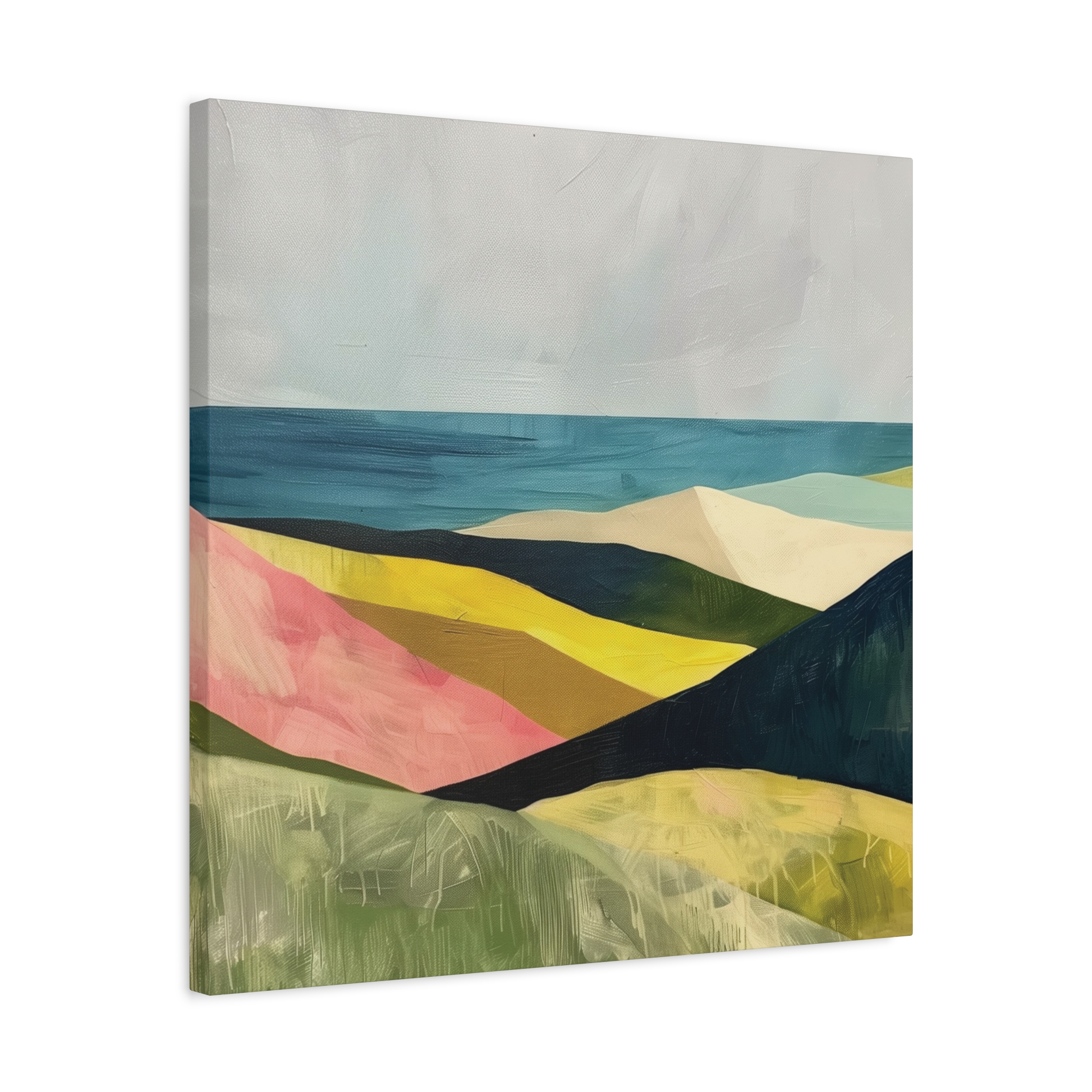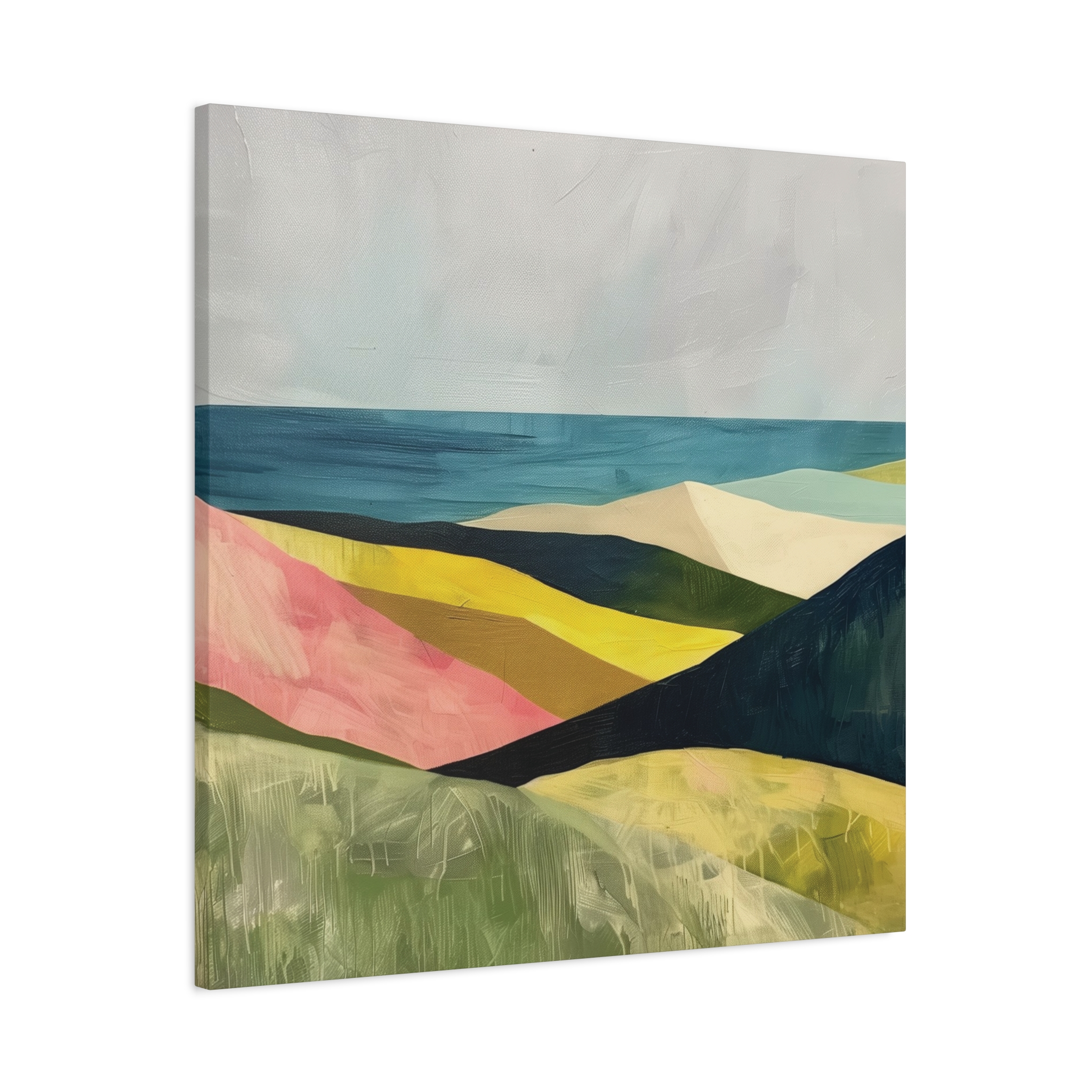 A colorful landscape with delicate aged paint texture. Perfect for adding a touch of sophistication to any room, this canvas is relevant for home decor enthusiasts, art lovers, and those looking to elevate their space. Ideal for gifting during birthdays, housewarmings, or as a special treat for yourself.