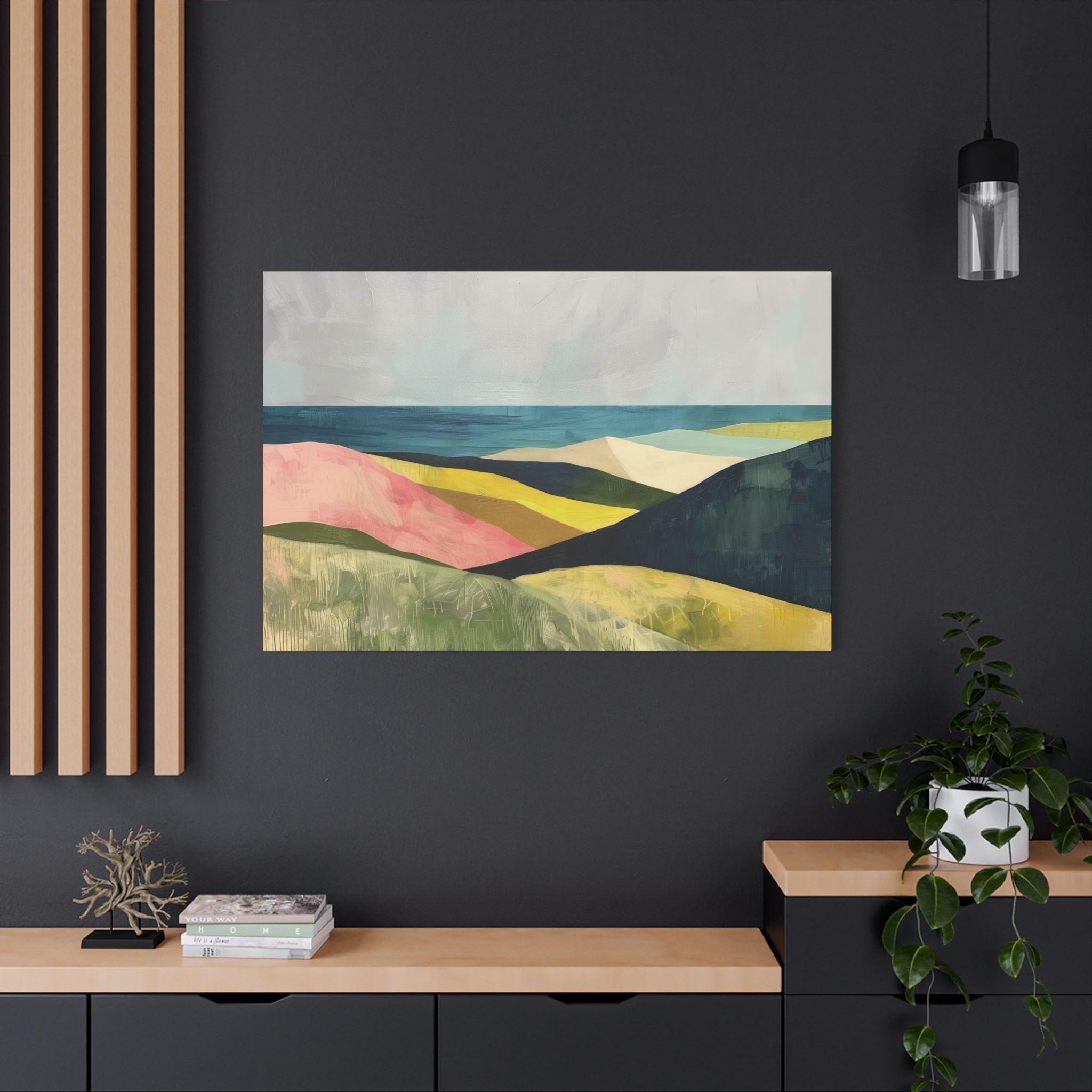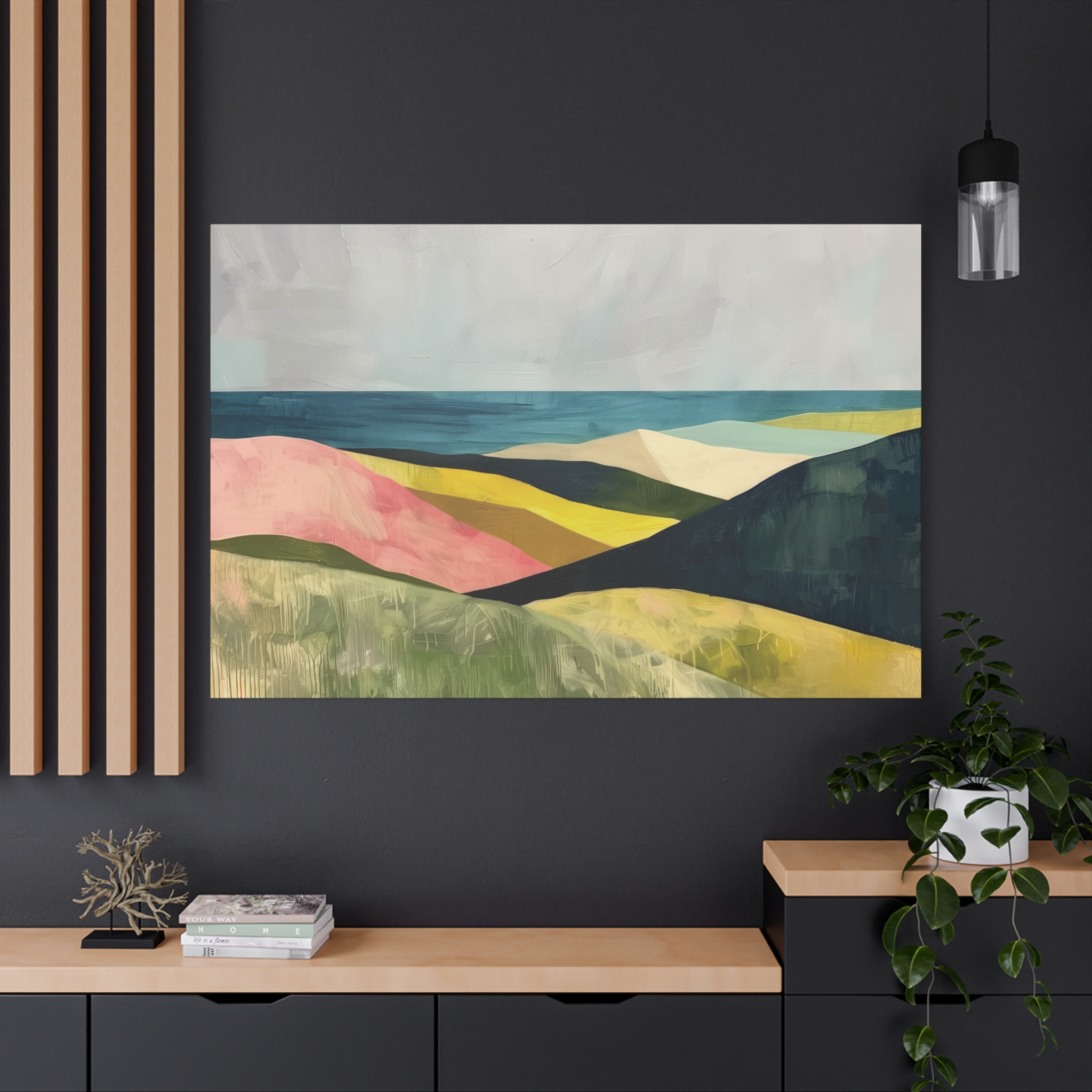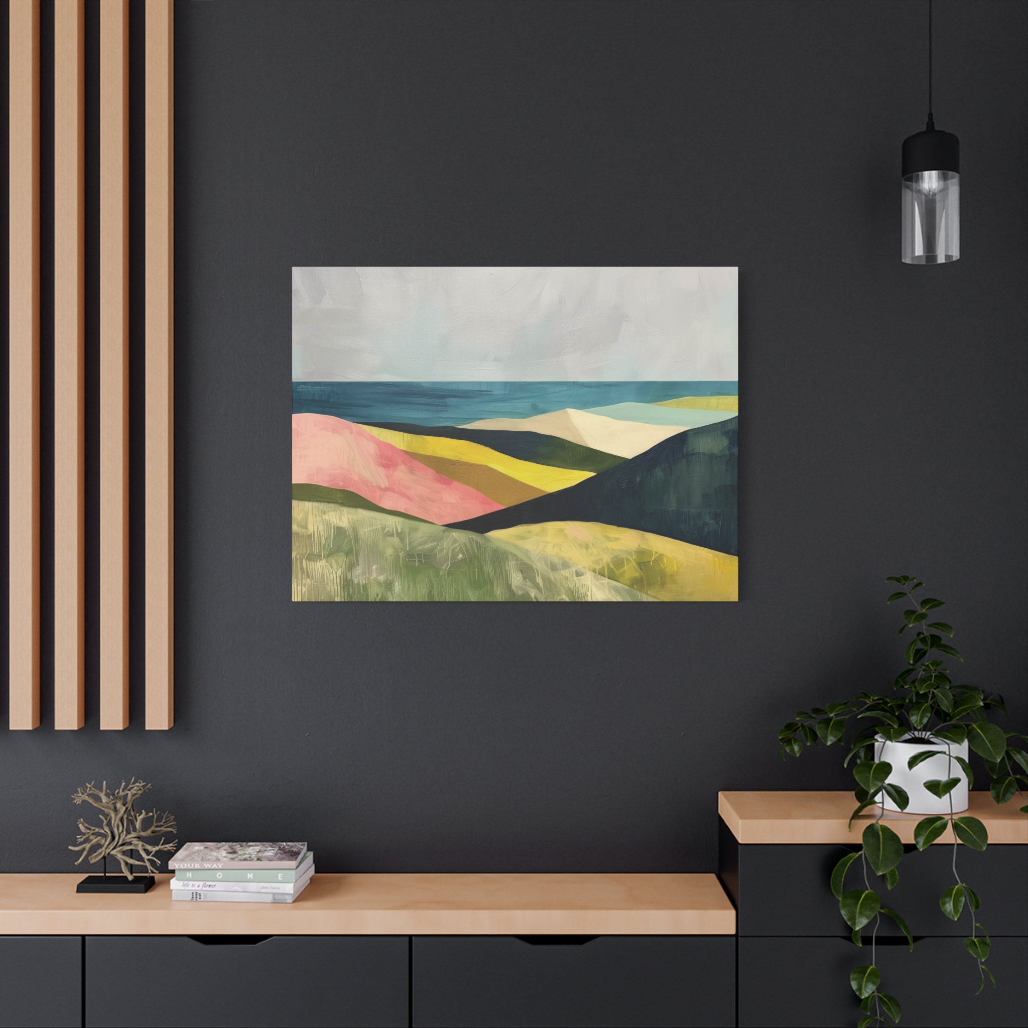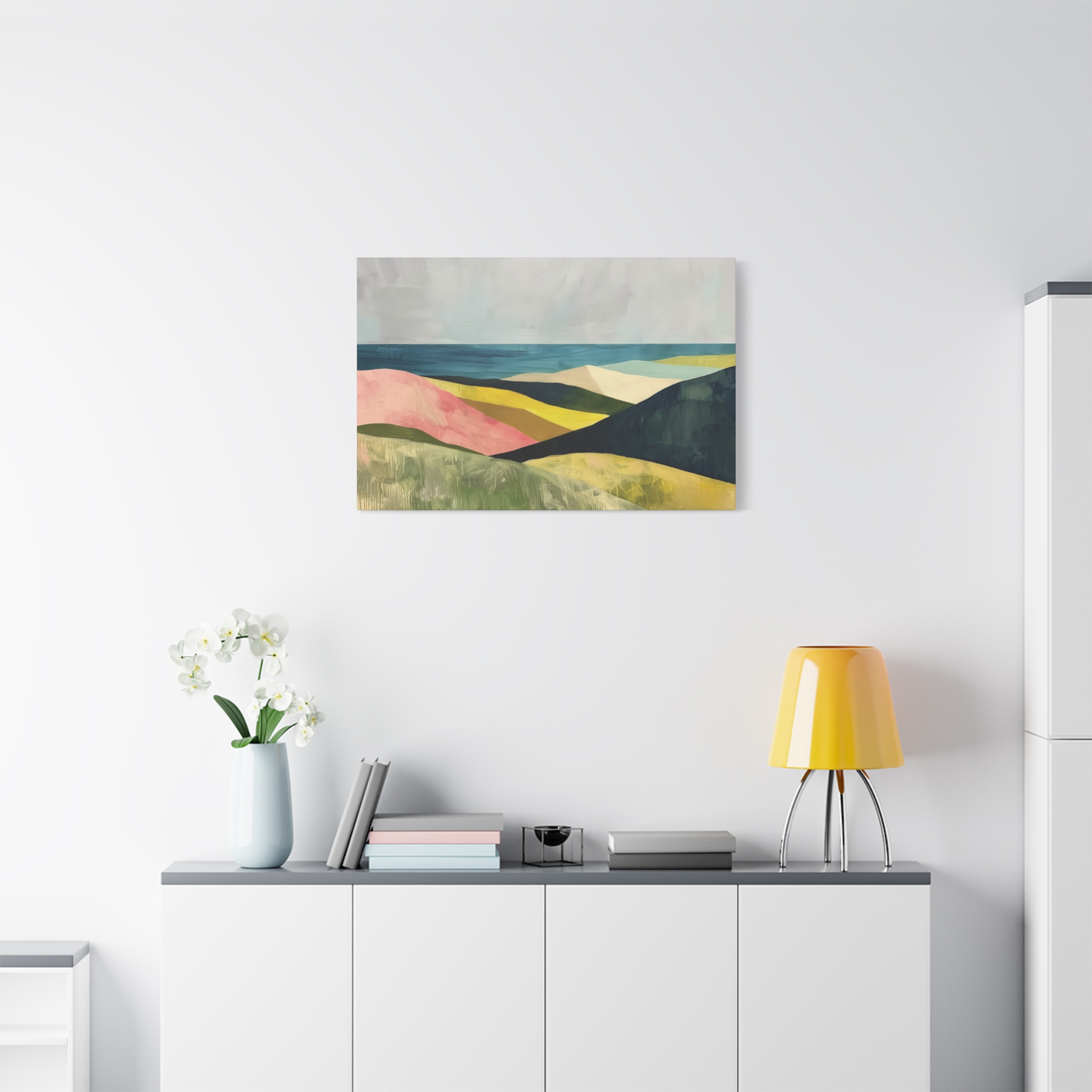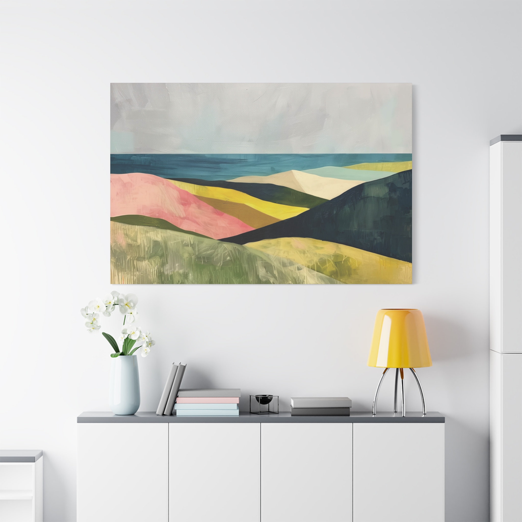 A colorful landscape with delicate aged paint texture. Perfect for adding a touch of sophistication to any room, this canvas is relevant for home decor enthusiasts, art lovers, and those looking to elevate their space. Ideal for gifting during birthdays, housewarmings, or as a special treat for yourself.