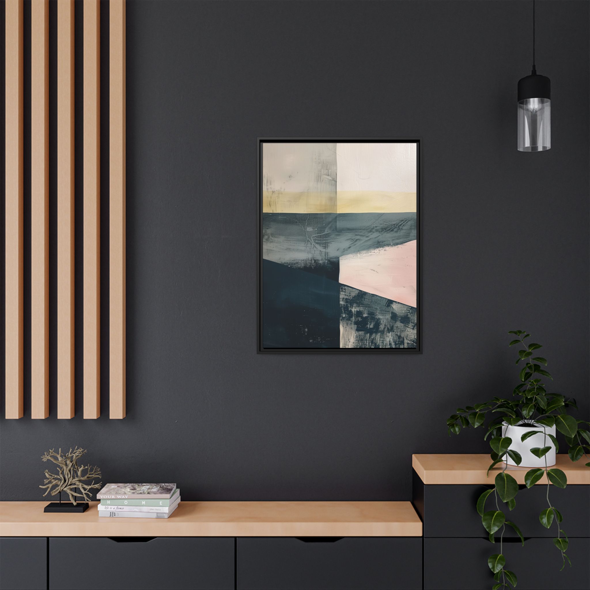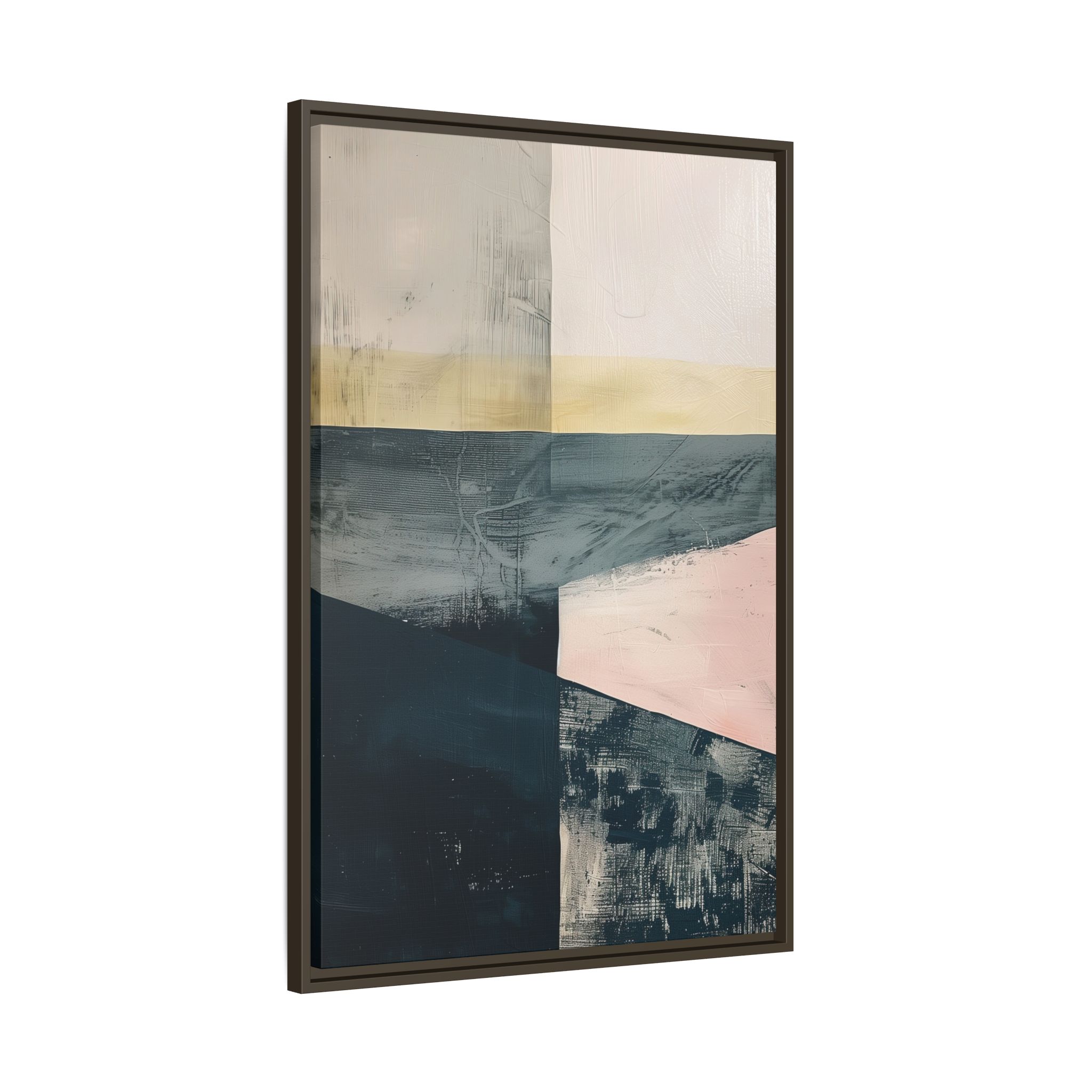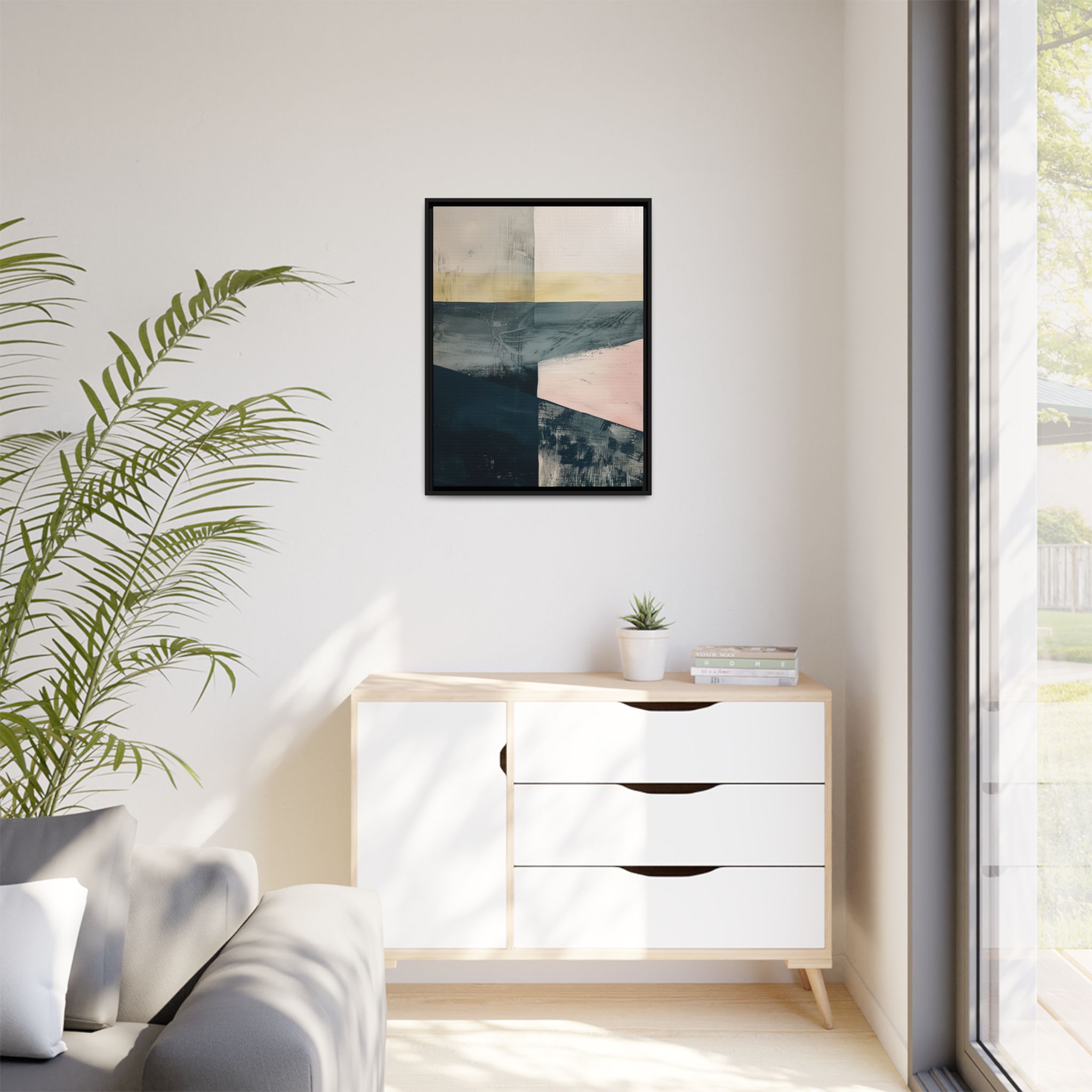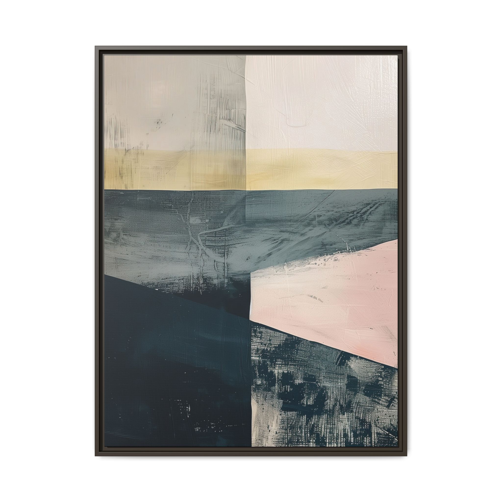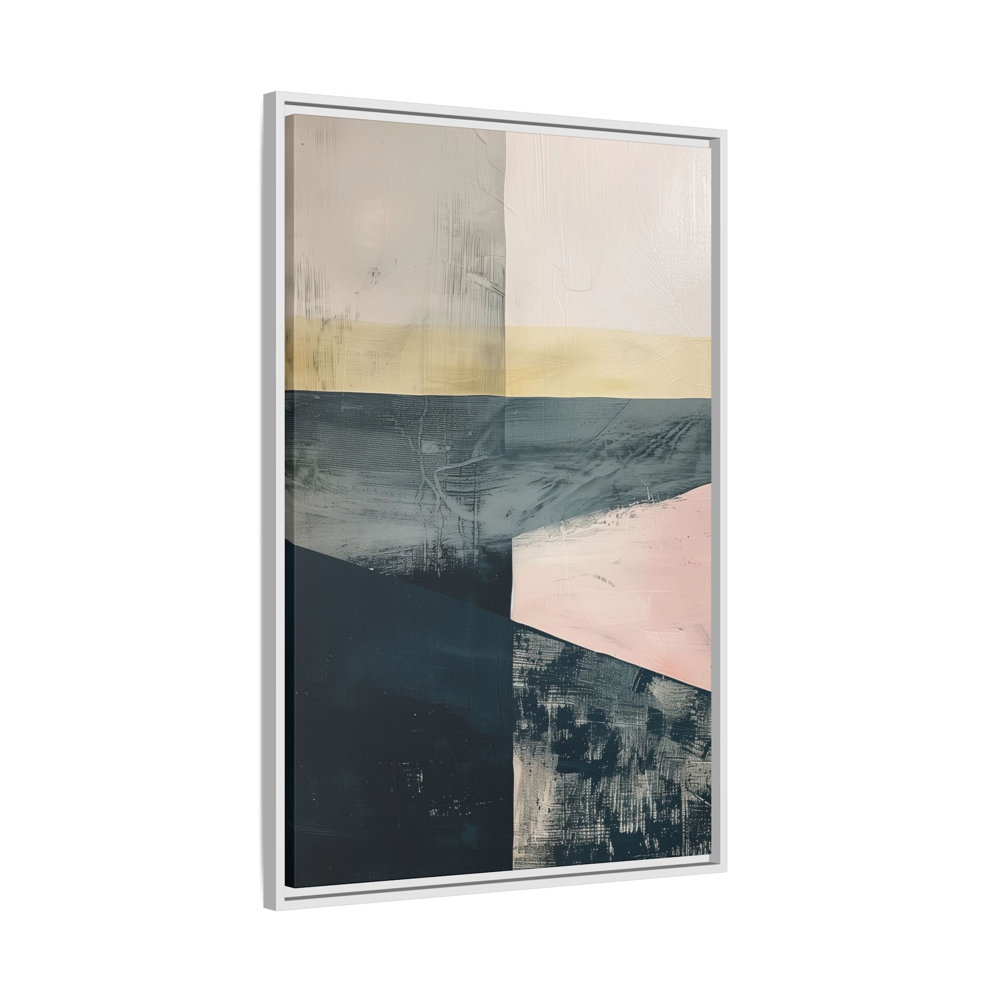 A minimalist art canvas featuring shapes and lines in a palette of pink, grey, navy blue, and white, creating a serene and modern abstract vibe. Perfect for adding a touch of sophistication to any room, this canvas is relevant for home decor enthusiasts, art lovers, and those looking to elevate their space. Ideal for gifting during birthdays, housewarmings, or as a special treat for yourself.