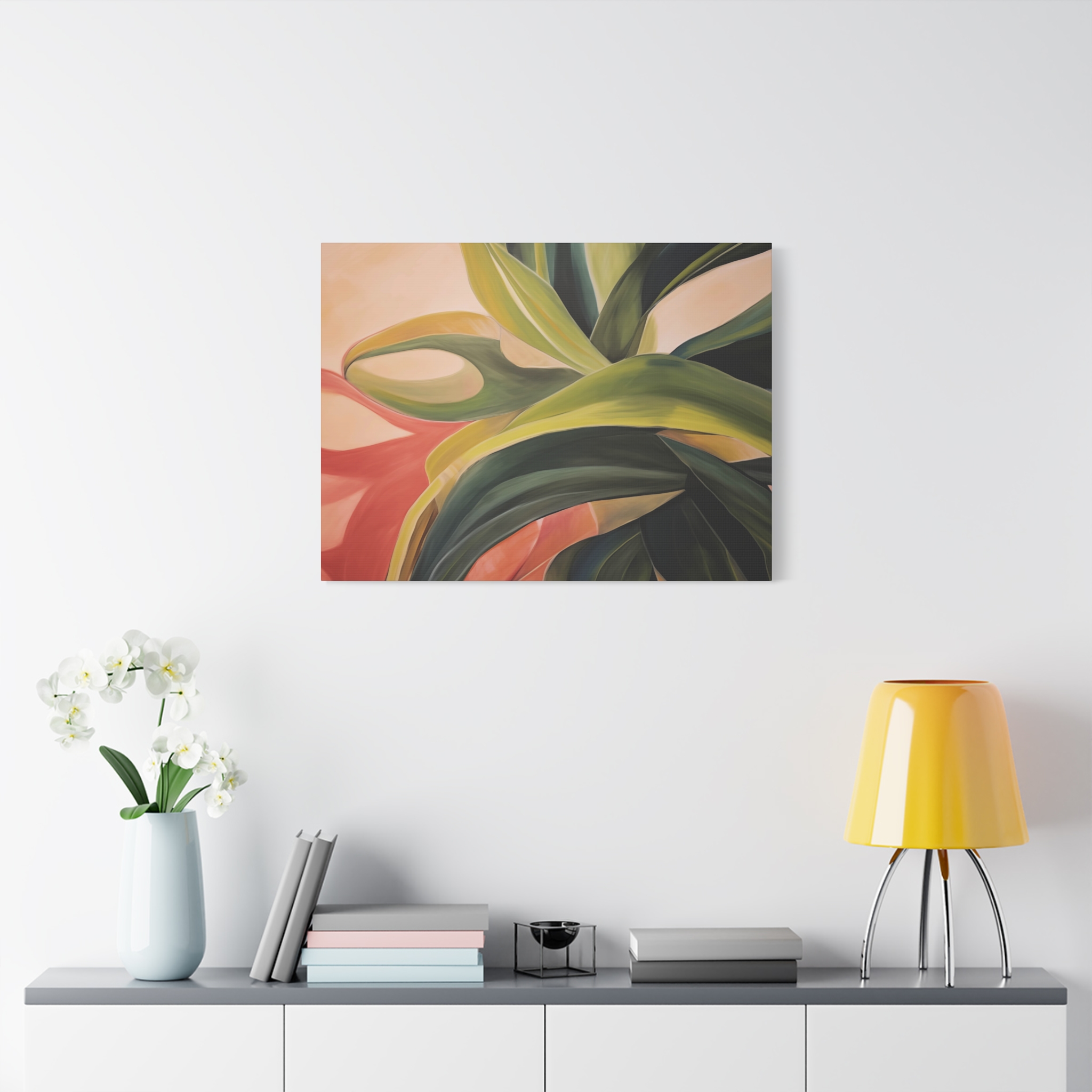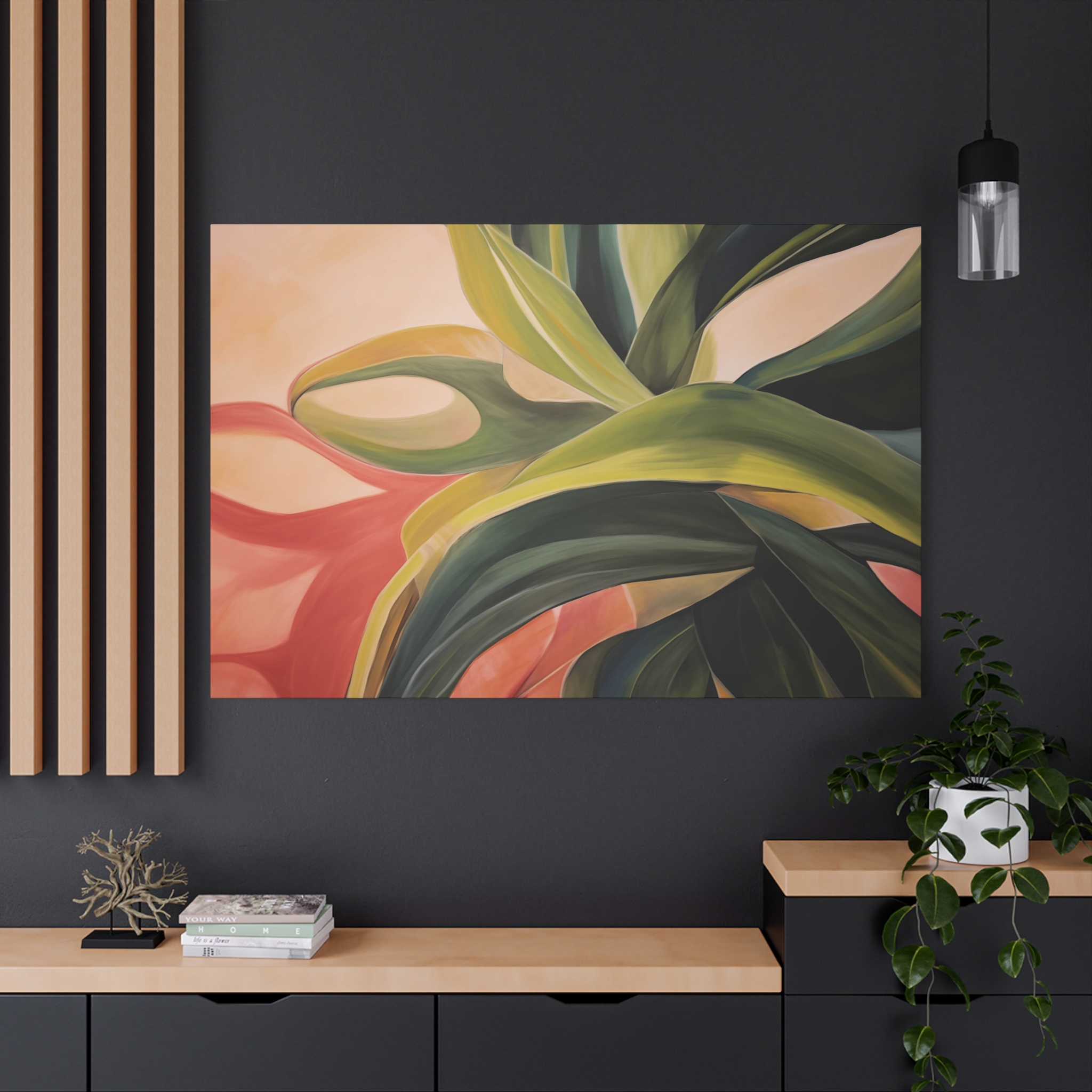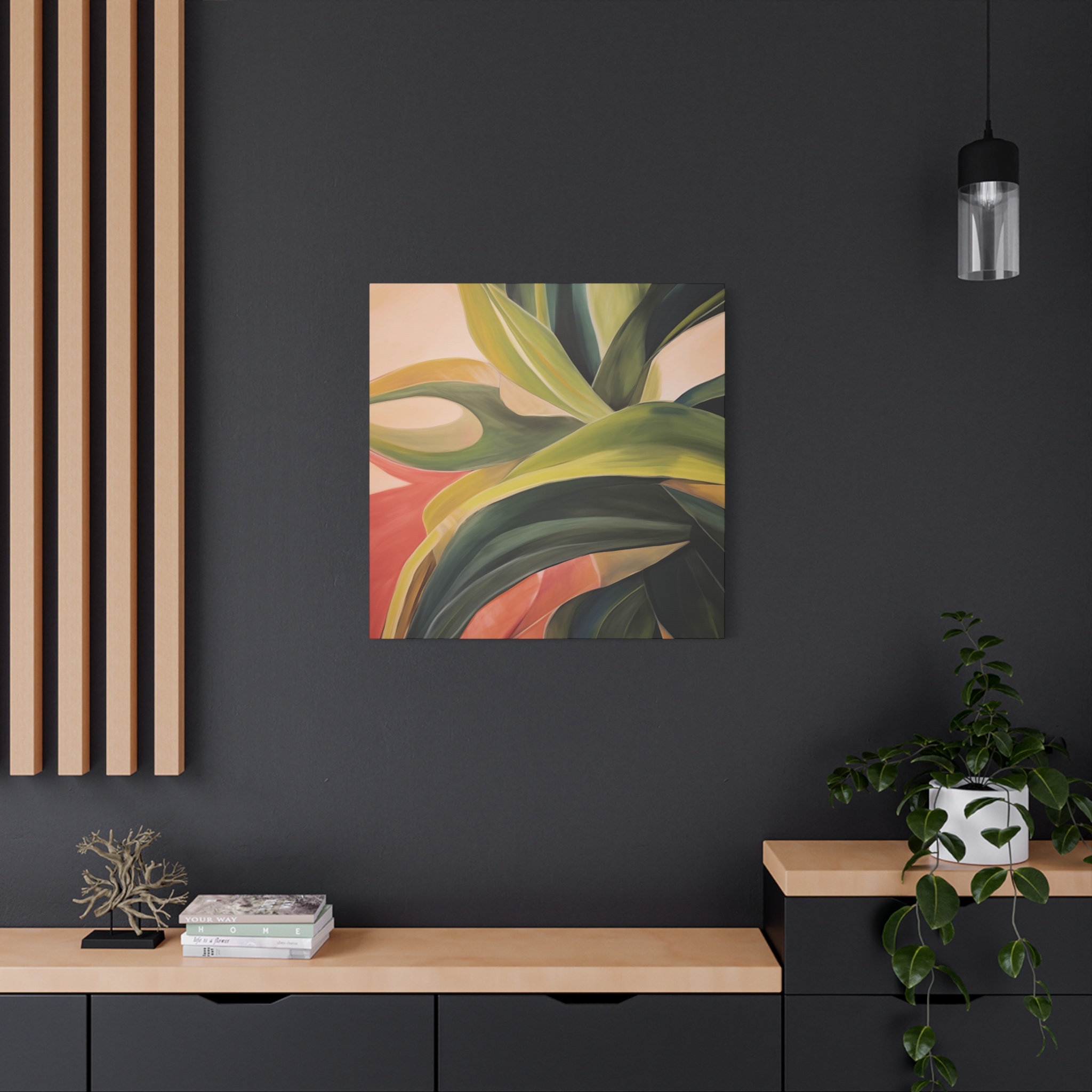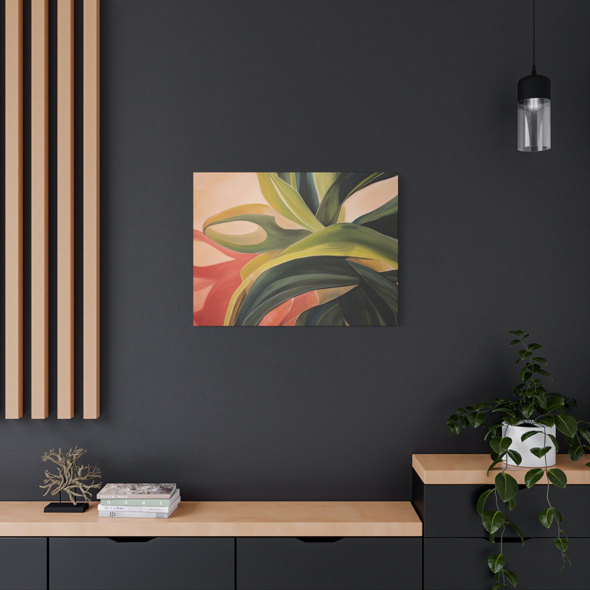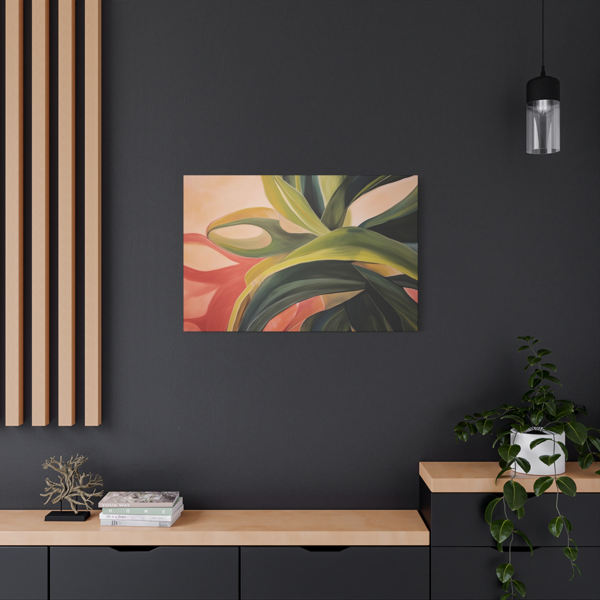 A nature botanical inspired art canvas featuring green shades and a tropical warm background, creating a serene and natural vibe. Perfect for adding a touch of sophistication to any room, this canvas is relevant for home decor enthusiasts, art lovers, and those looking to elevate their space. Ideal for gifting during birthdays, housewarmings, or as a special treat for yourself.