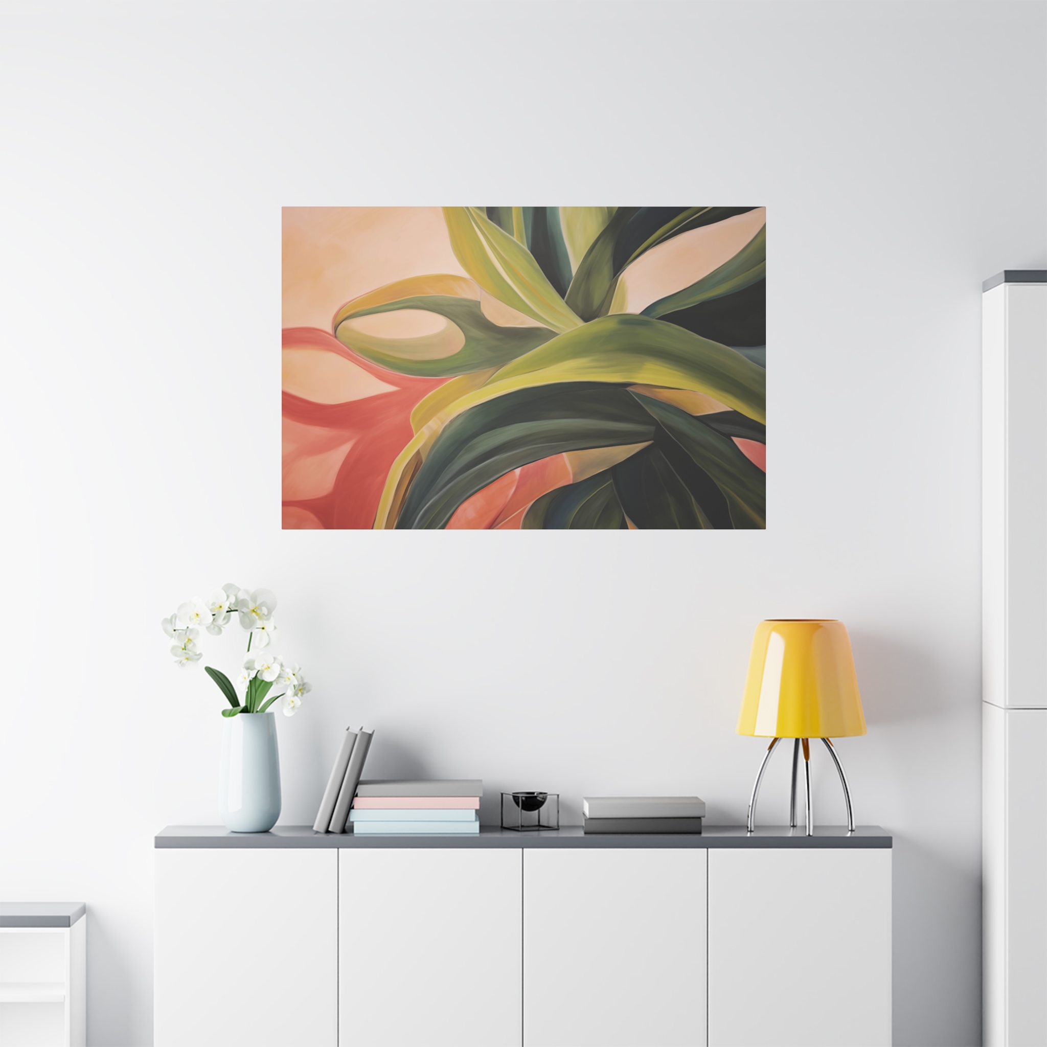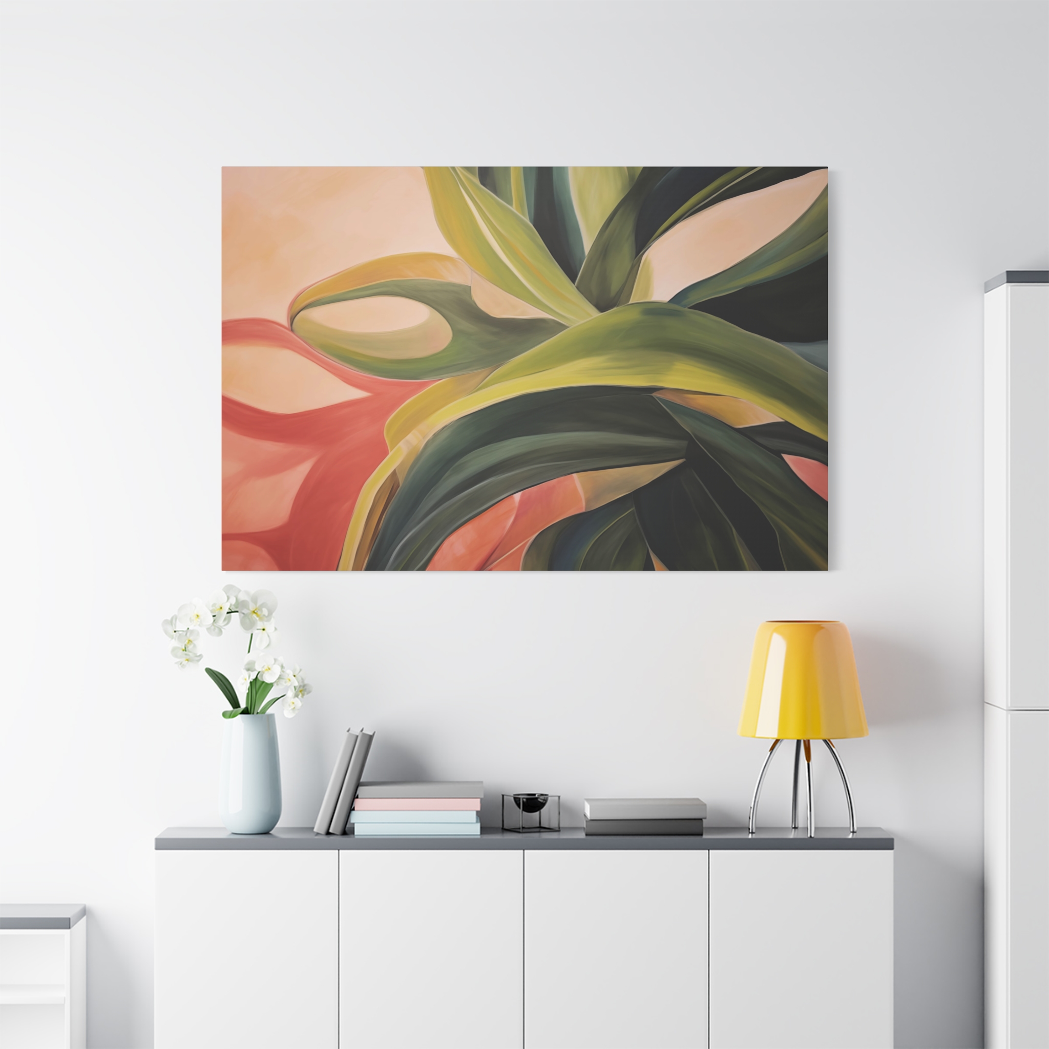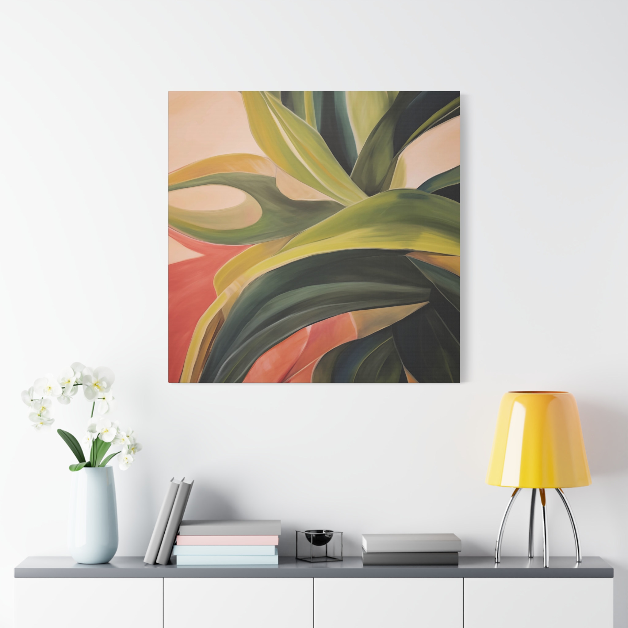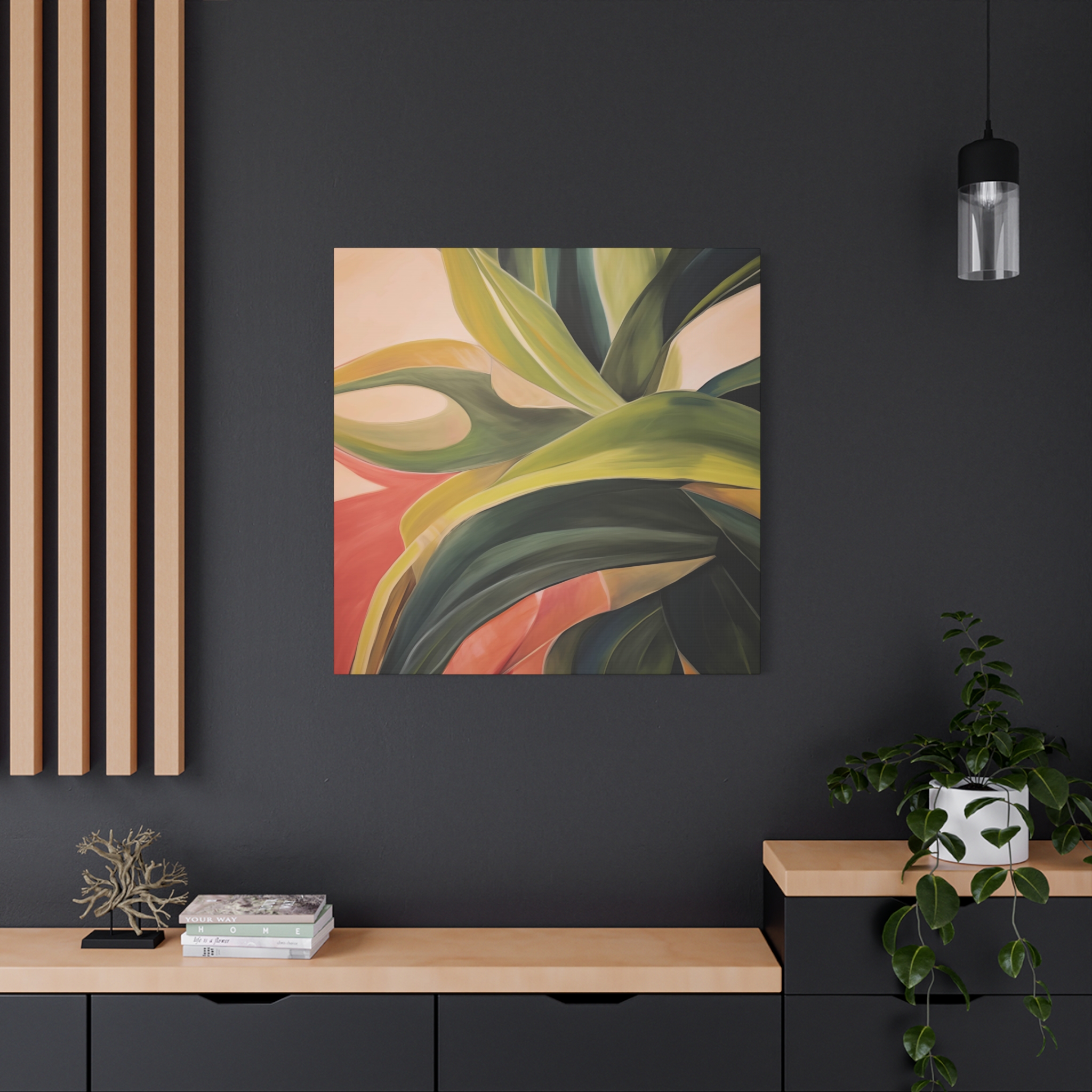 A nature botanical inspired art canvas featuring green shades and a tropical warm background, creating a serene and natural vibe. Perfect for adding a touch of sophistication to any room, this canvas is relevant for home decor enthusiasts, art lovers, and those looking to elevate their space. Ideal for gifting during birthdays, housewarmings, or as a special treat for yourself.