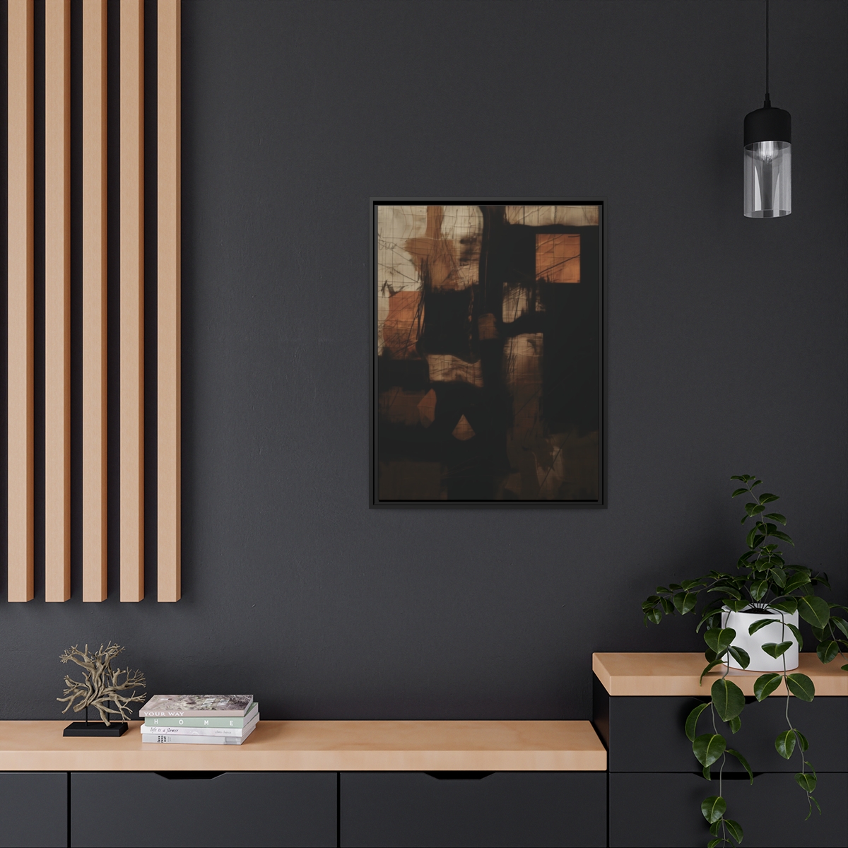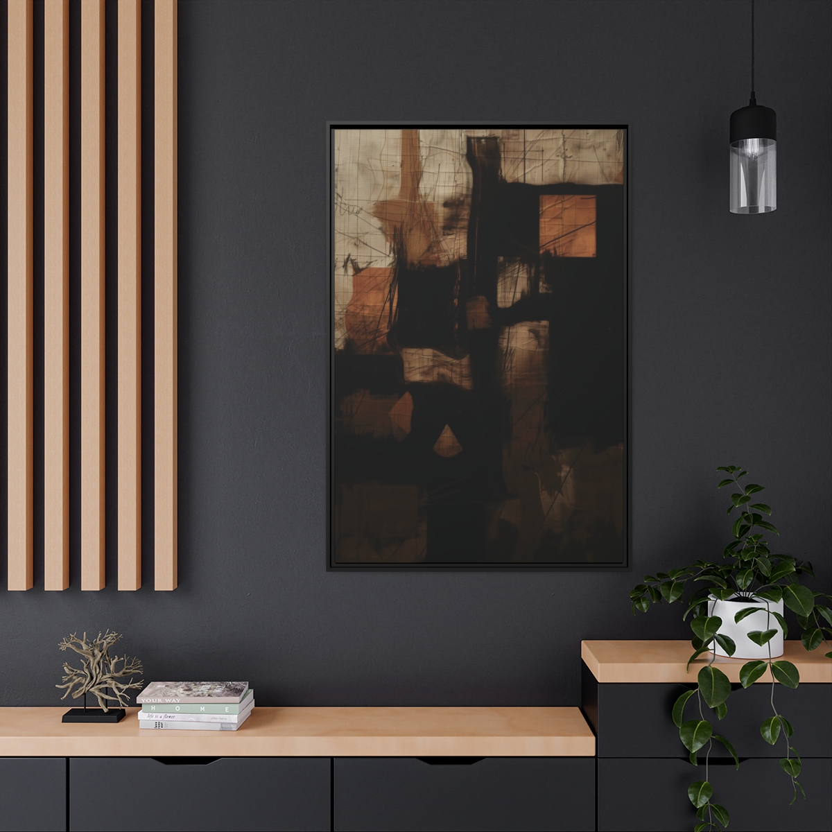 Custom digitally printed artwork on a quality canvas. .Every print in a black pinewood frame will look sleek and beautiful in any interior. The artwork will be printed on the cotton-polyester canvas with a special proprietary coating to make sure it stays vibrant for ages. Environmentally-conscious – it’s made from sustainably sourced materials (Forest Stewardship Council certified) and custom printed on demand no warehouse stocks and no waste. Choose between the designer specified sizes. The sawtooth hanging hardware is already attached.