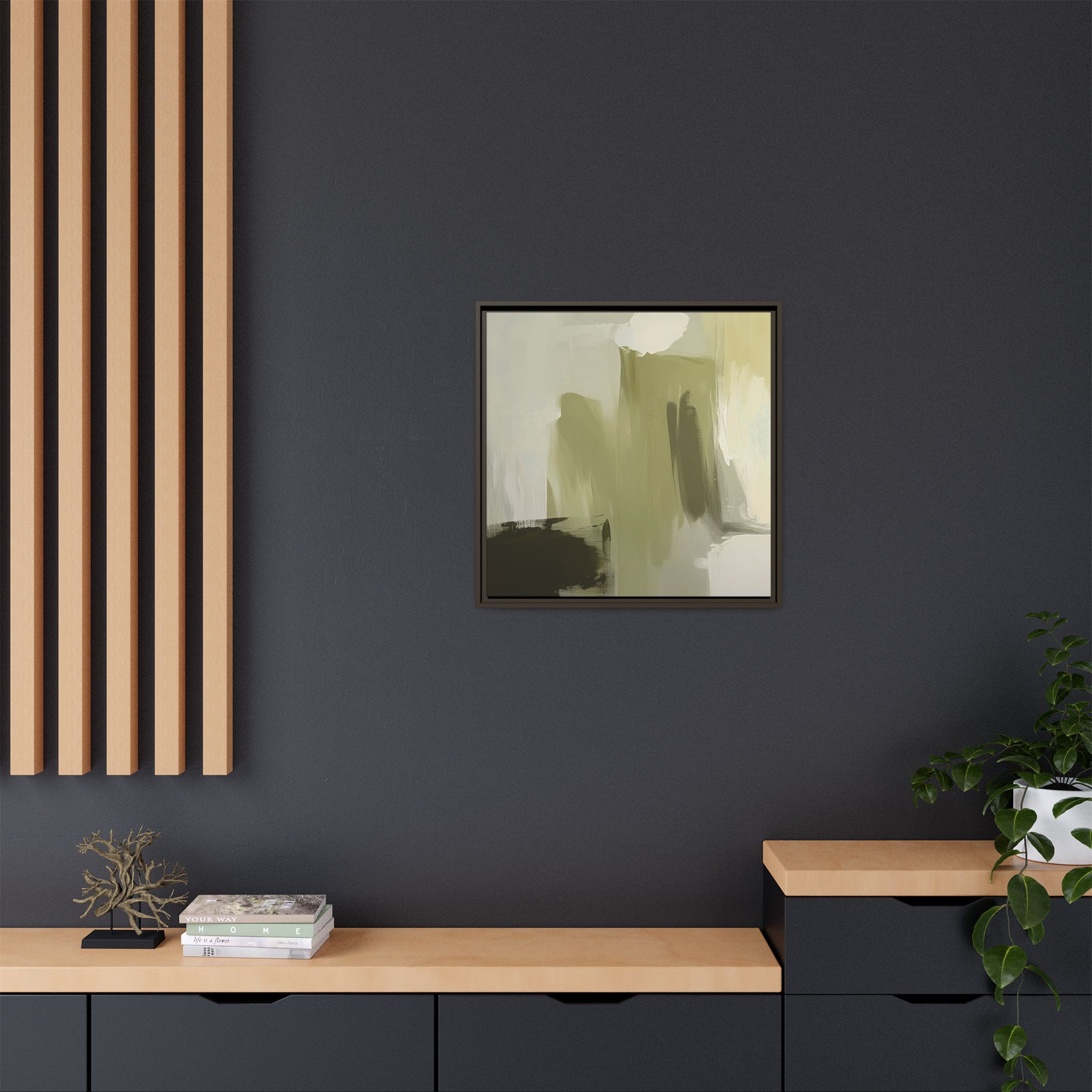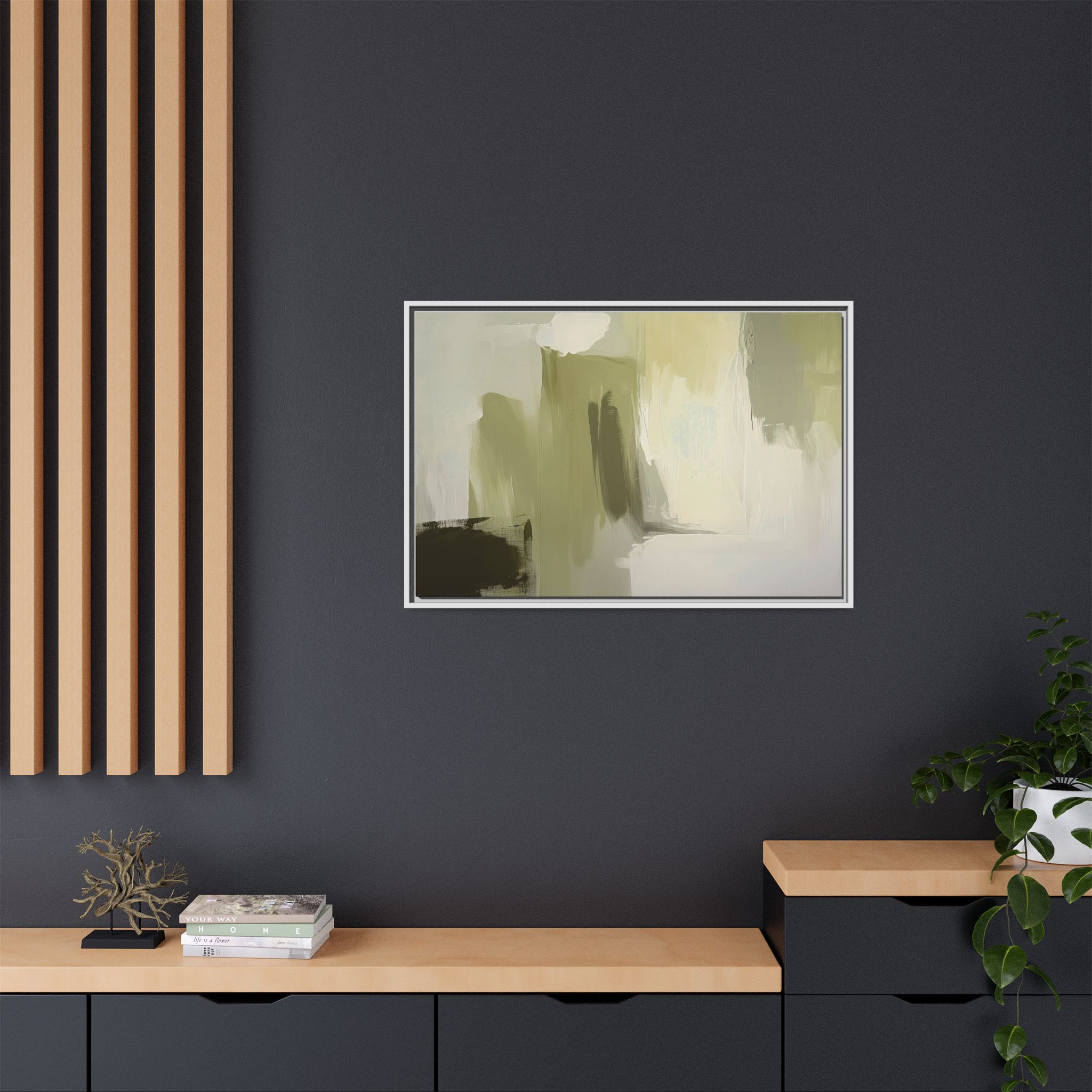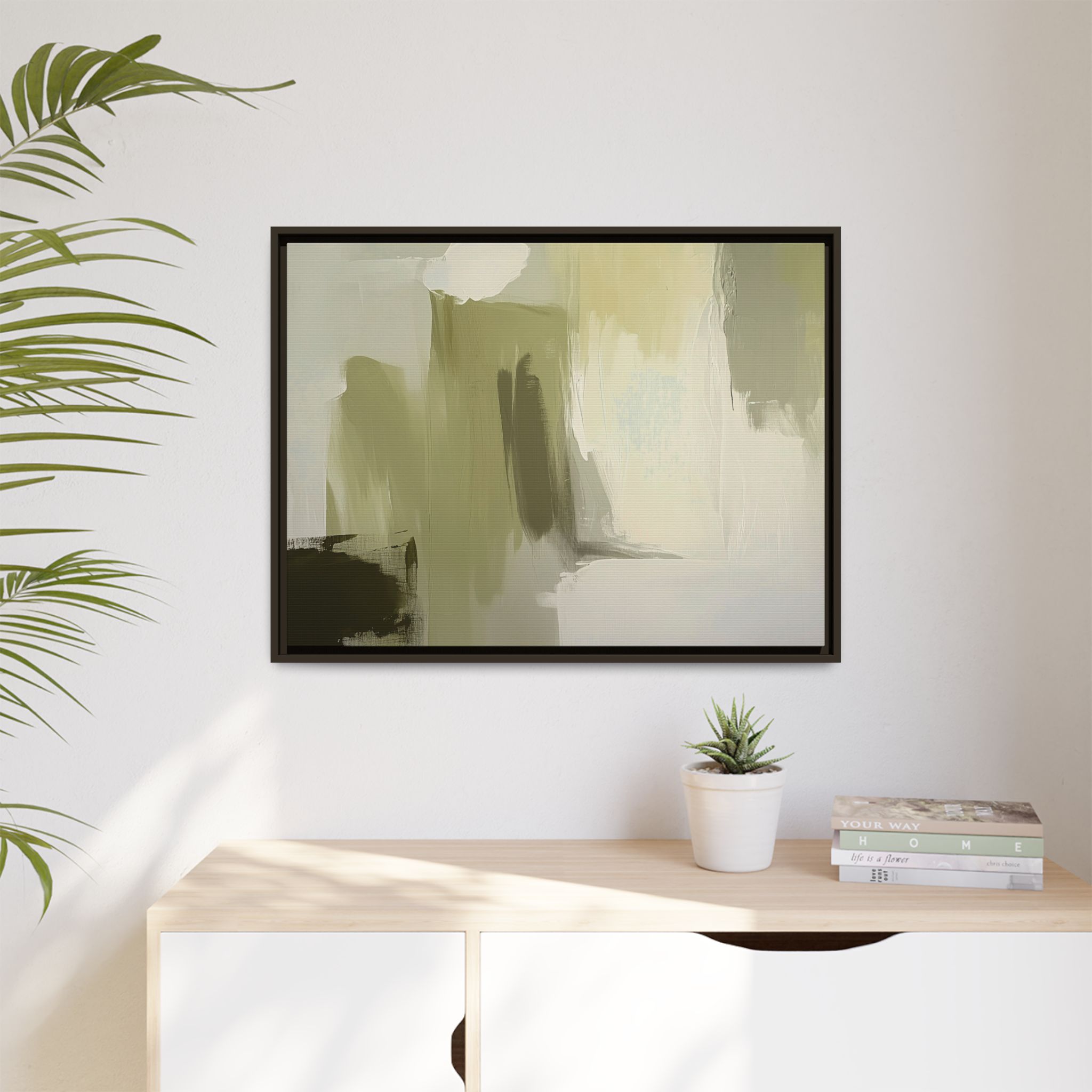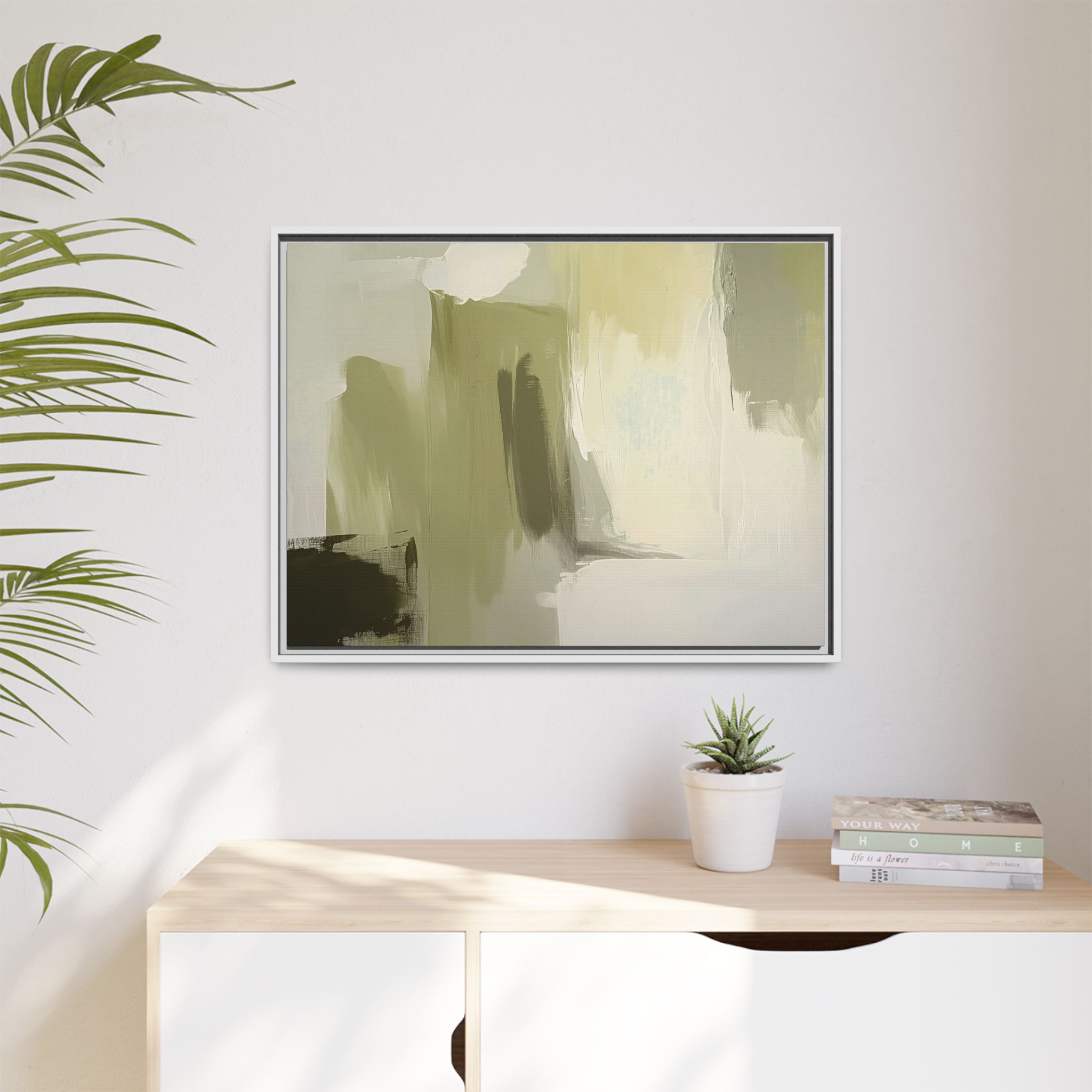 A minimalist abstract canvas print featuring brushed olive and cream shapes, thin lines, flat lighting, brush strokes, and subtle color transitions. This artwork gives a modern and sophisticated vibe, perfect for contemporary home decor enthusiasts and art lovers. Ideal for adding a touch of elegance to living rooms, bedrooms, or home offices. Relevant for gift-giving occasions like housewarming parties, birthdays, and holidays.