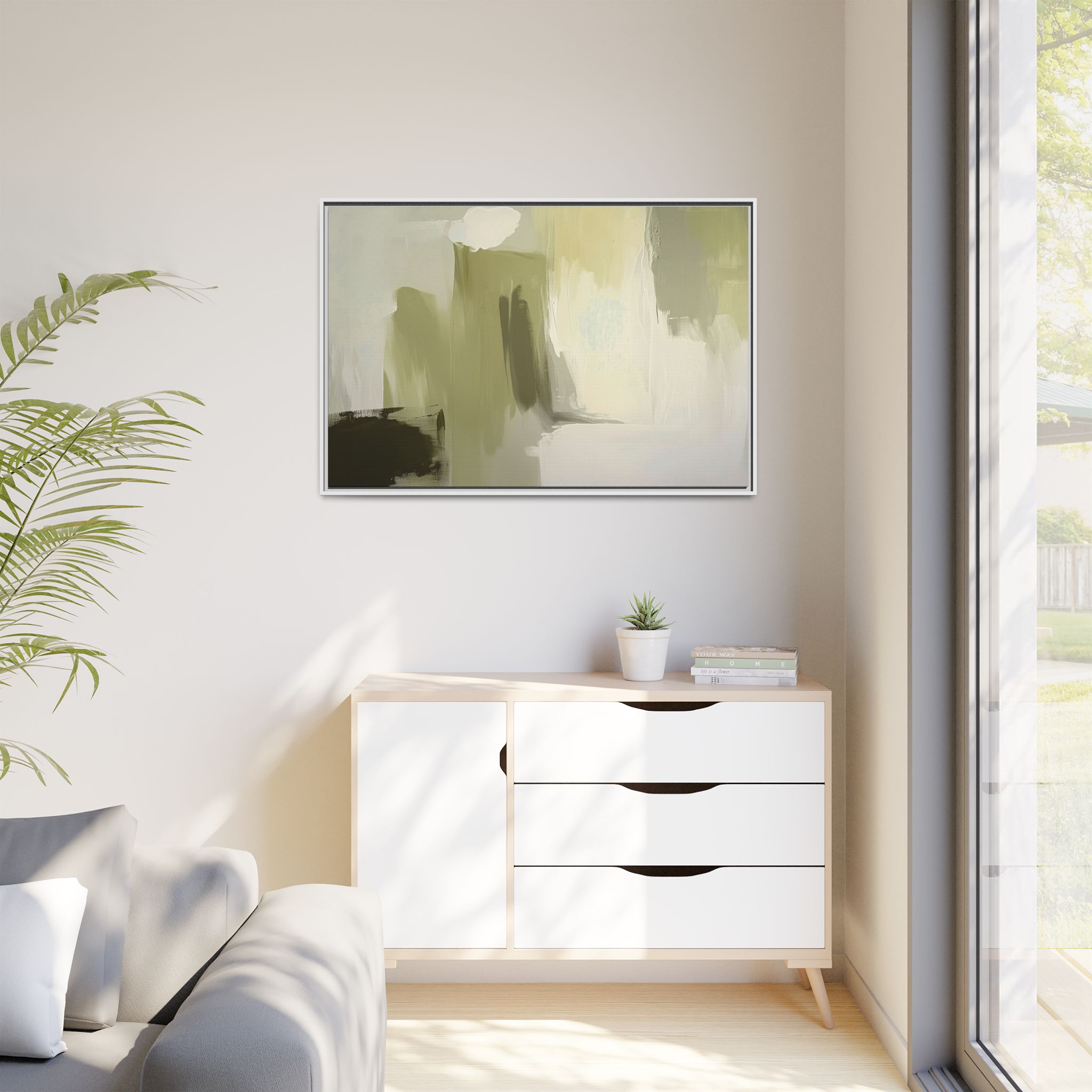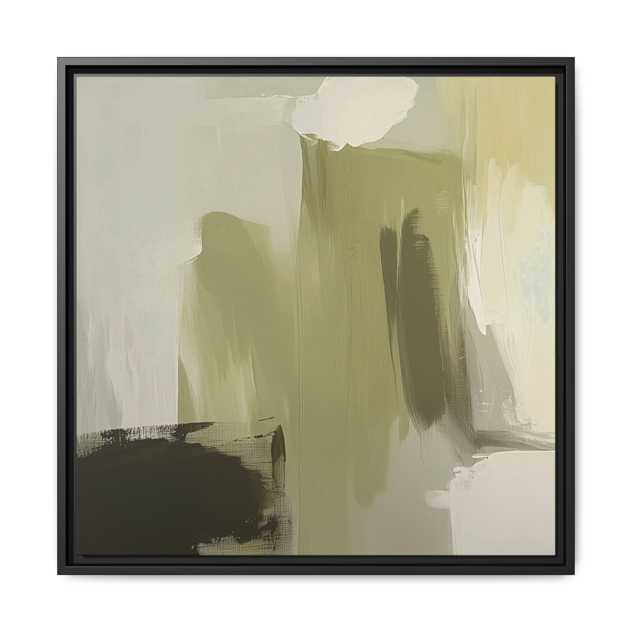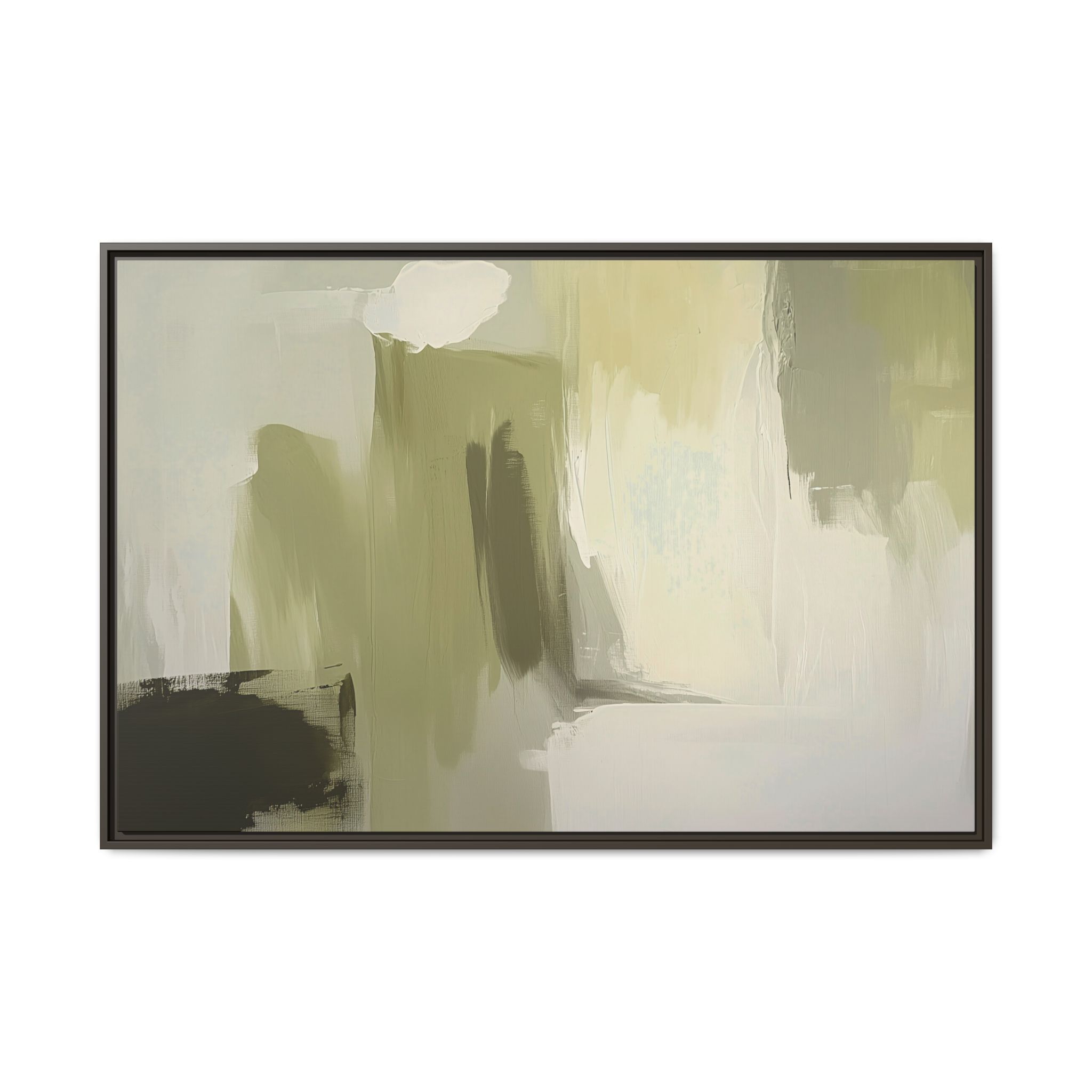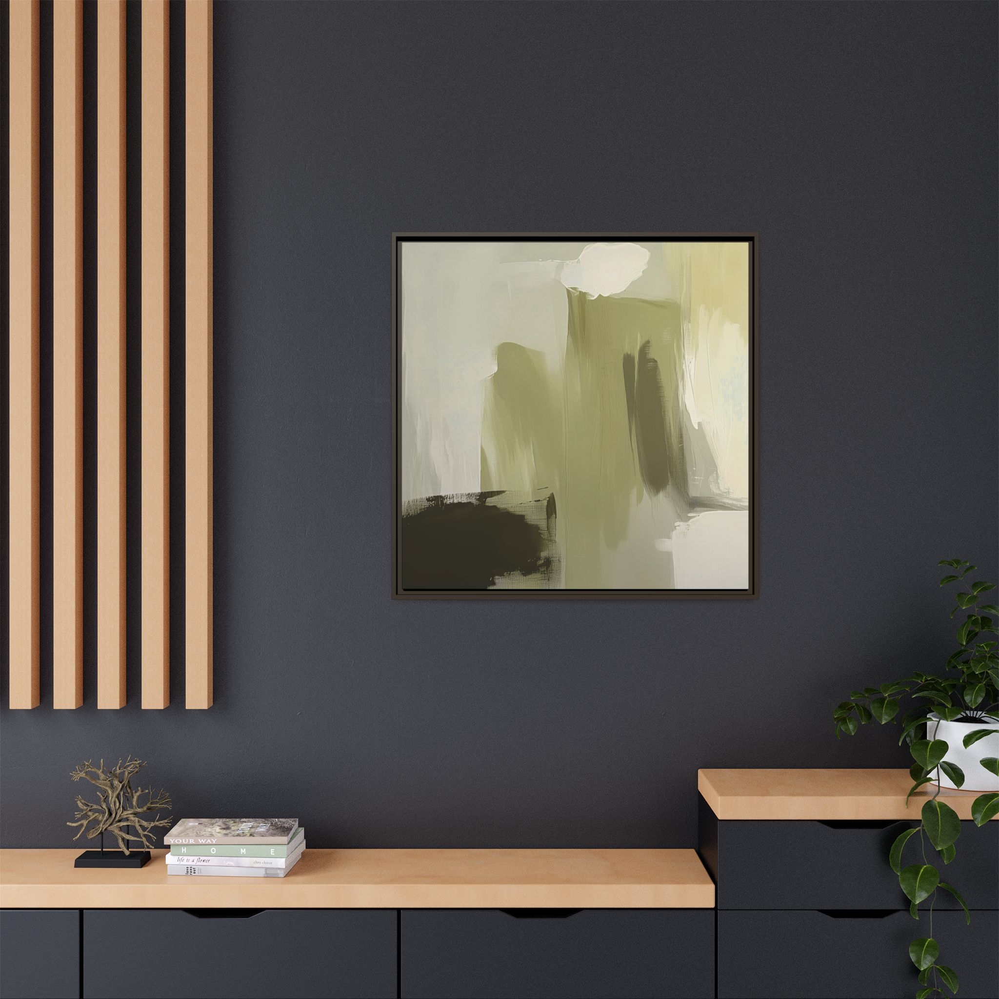 A minimalist abstract canvas print featuring brushed olive and cream shapes, thin lines, flat lighting, brush strokes, and subtle color transitions. This artwork gives a modern and sophisticated vibe, perfect for contemporary home decor enthusiasts and art lovers. Ideal for adding a touch of elegance to living rooms, bedrooms, or home offices. Relevant for gift-giving occasions like housewarming parties, birthdays, and holidays.