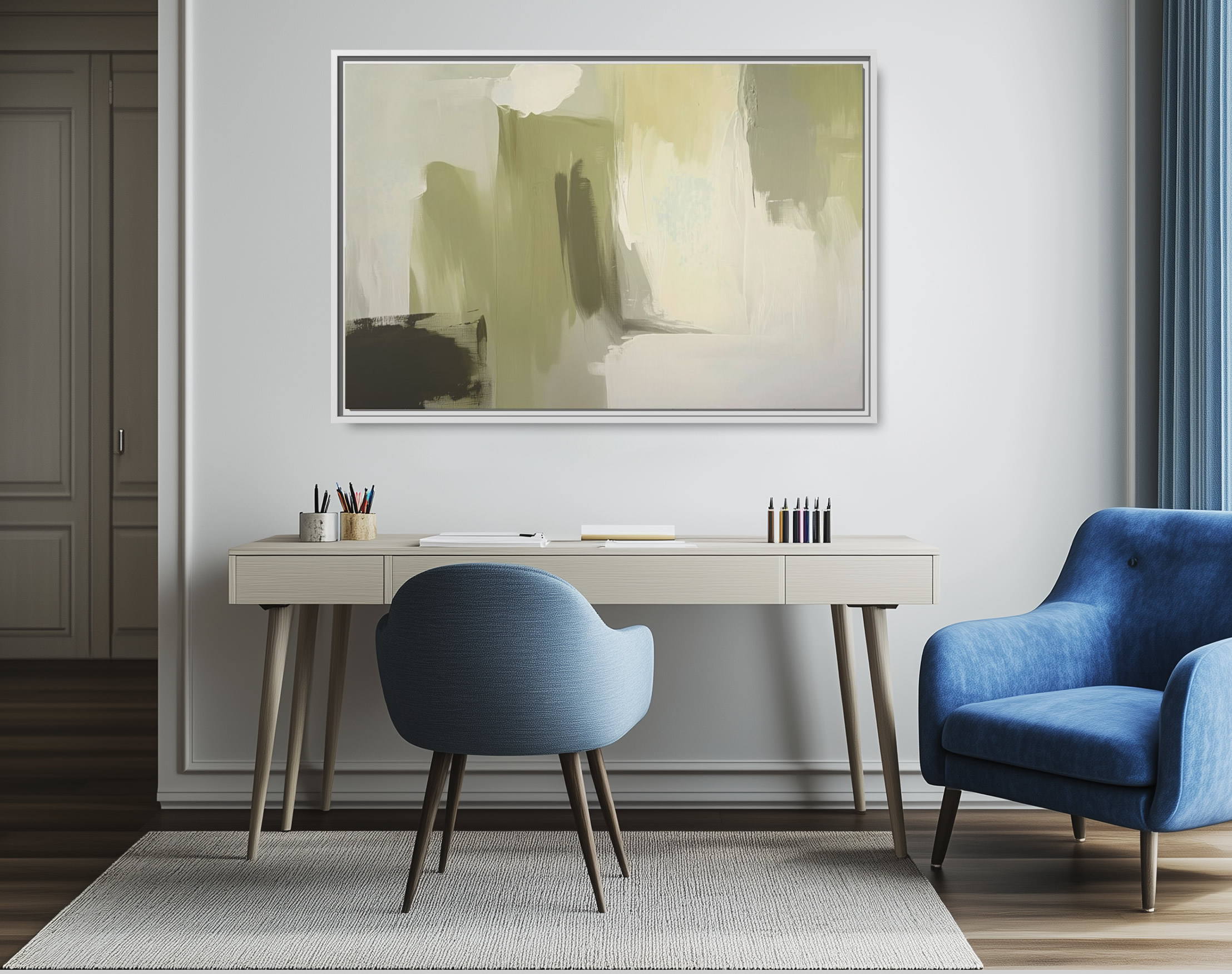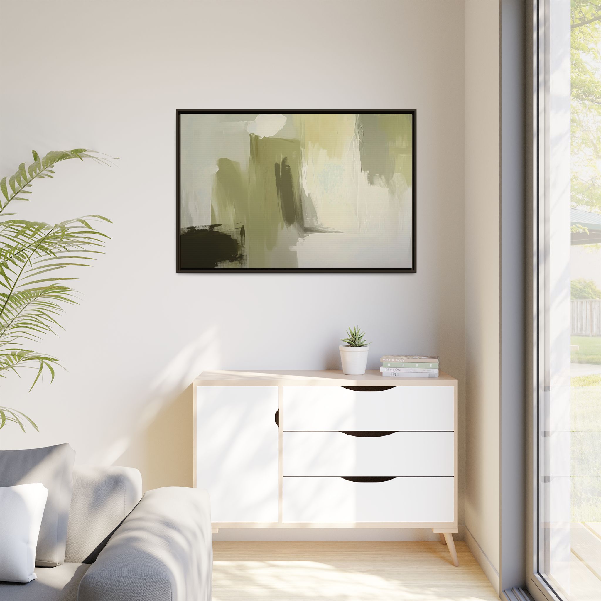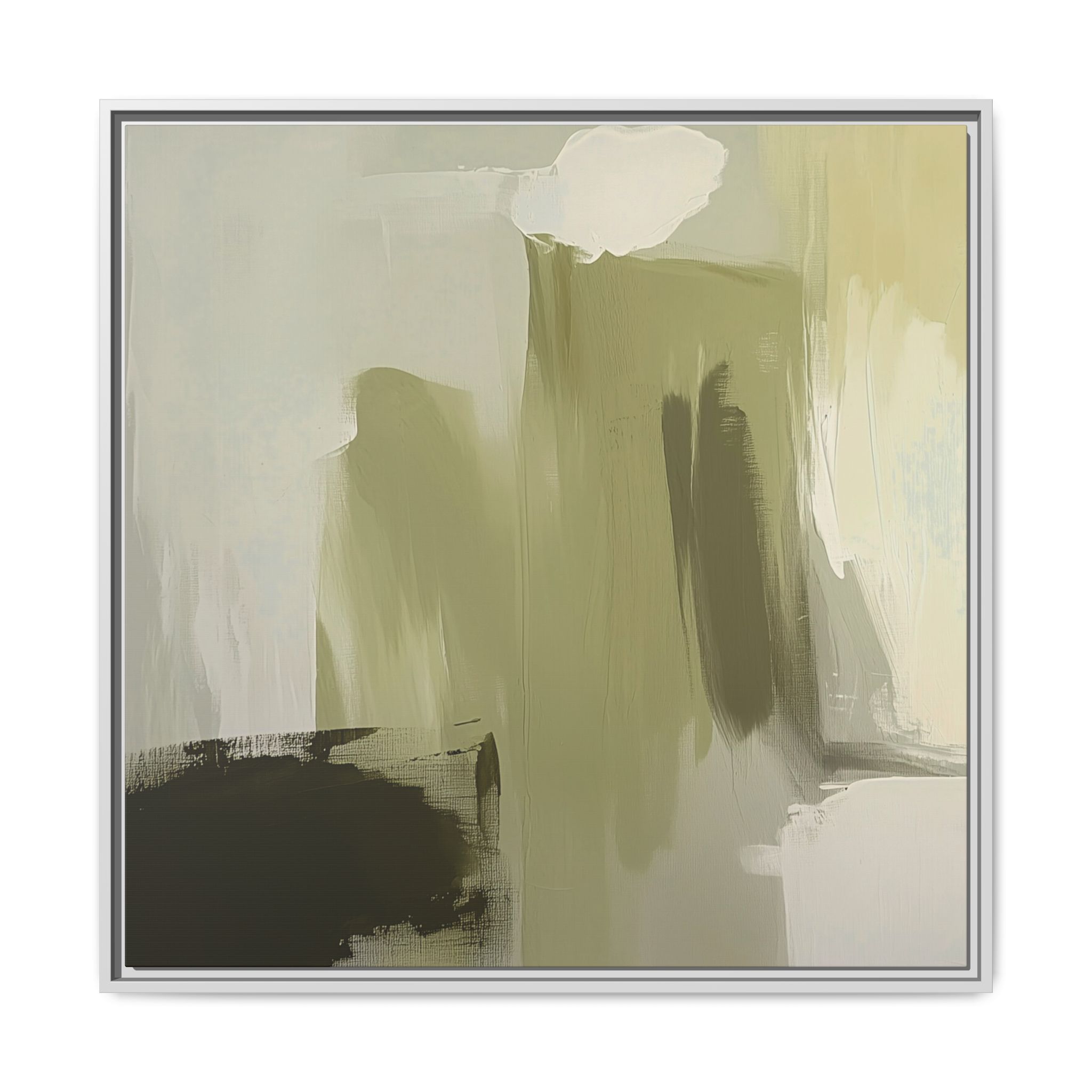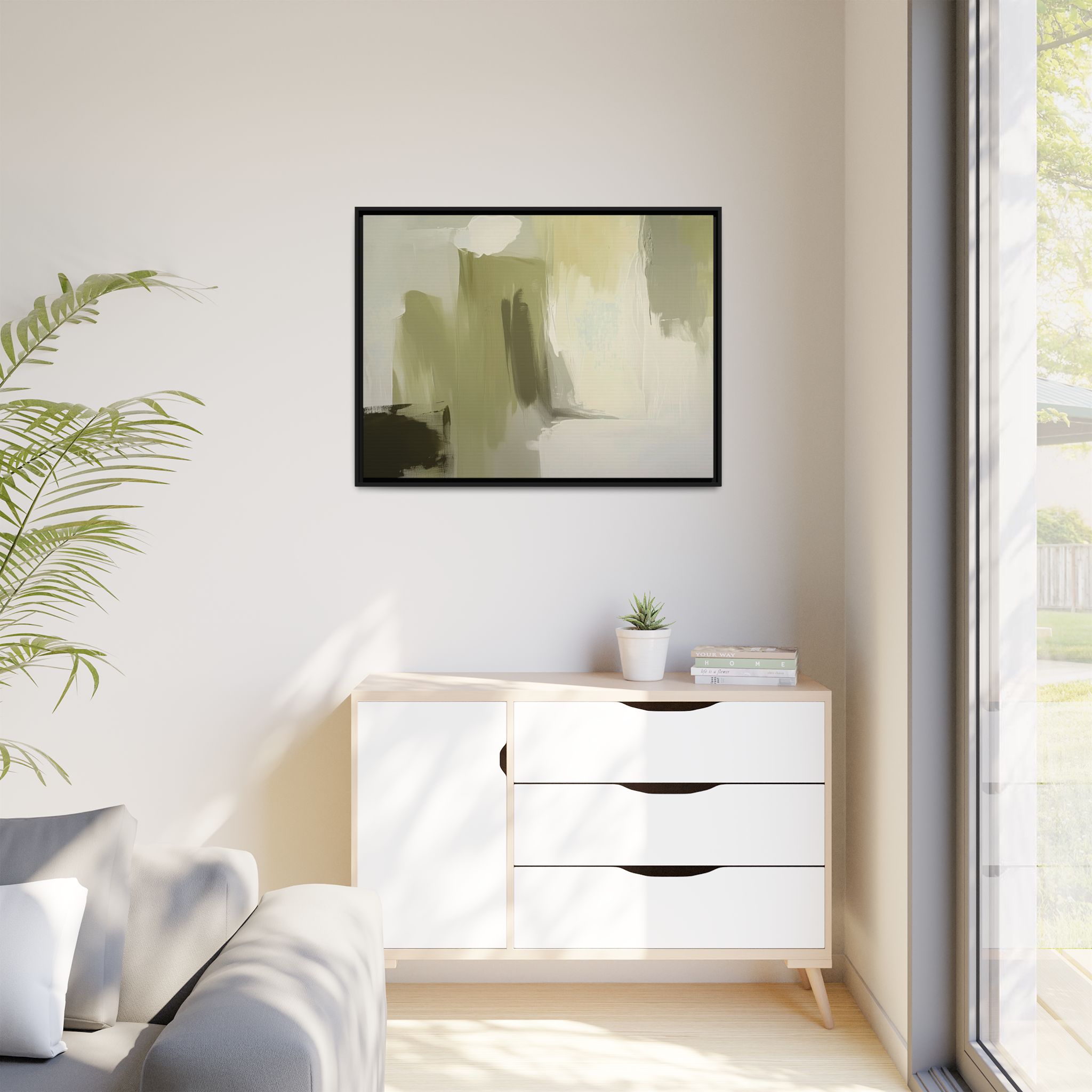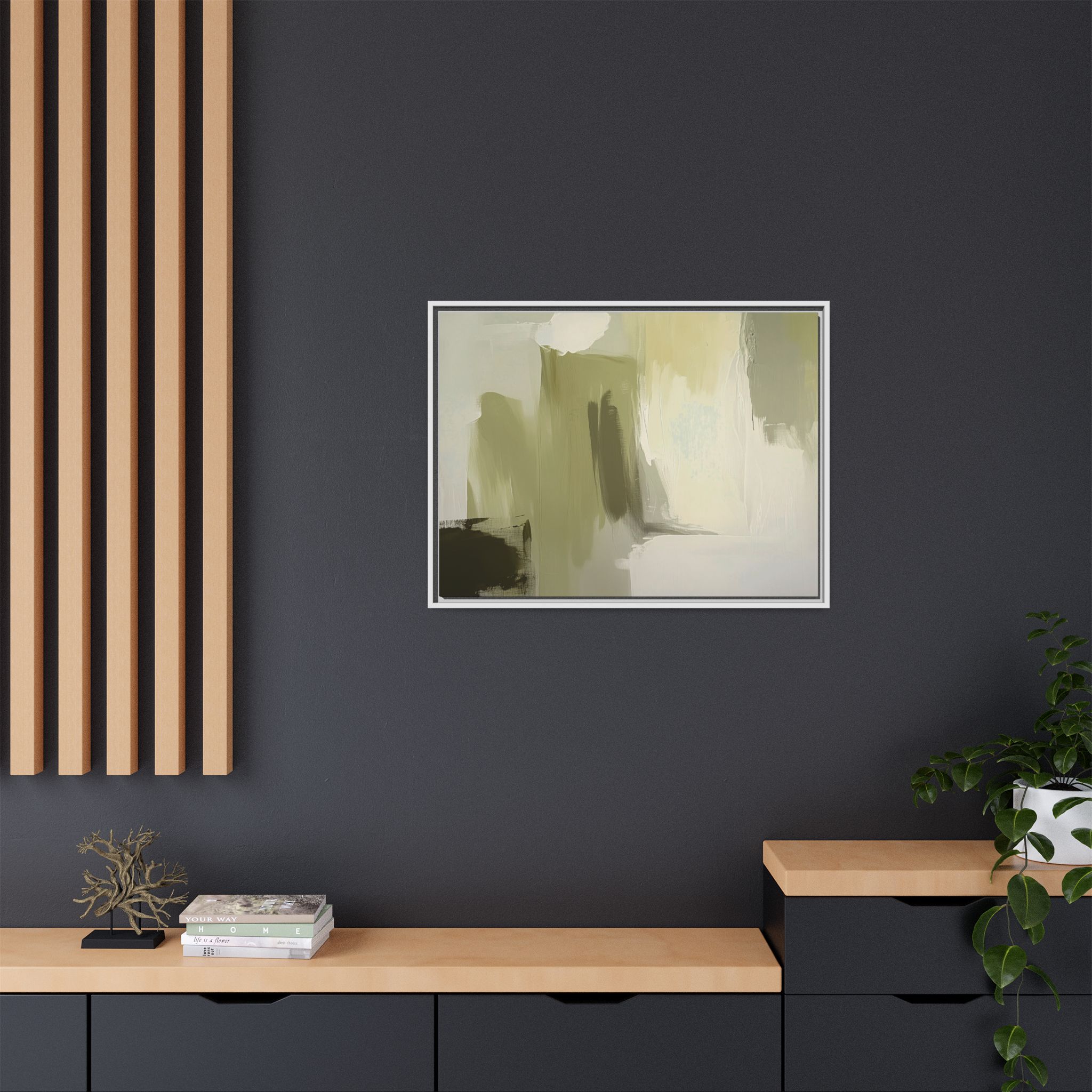 A minimalist abstract canvas print featuring brushed olive and cream shapes, thin lines, flat lighting, brush strokes, and subtle color transitions. This artwork gives a modern and sophisticated vibe, perfect for contemporary home decor enthusiasts and art lovers. Ideal for adding a touch of elegance to living rooms, bedrooms, or home offices. Relevant for gift-giving occasions like housewarming parties, birthdays, and holidays.