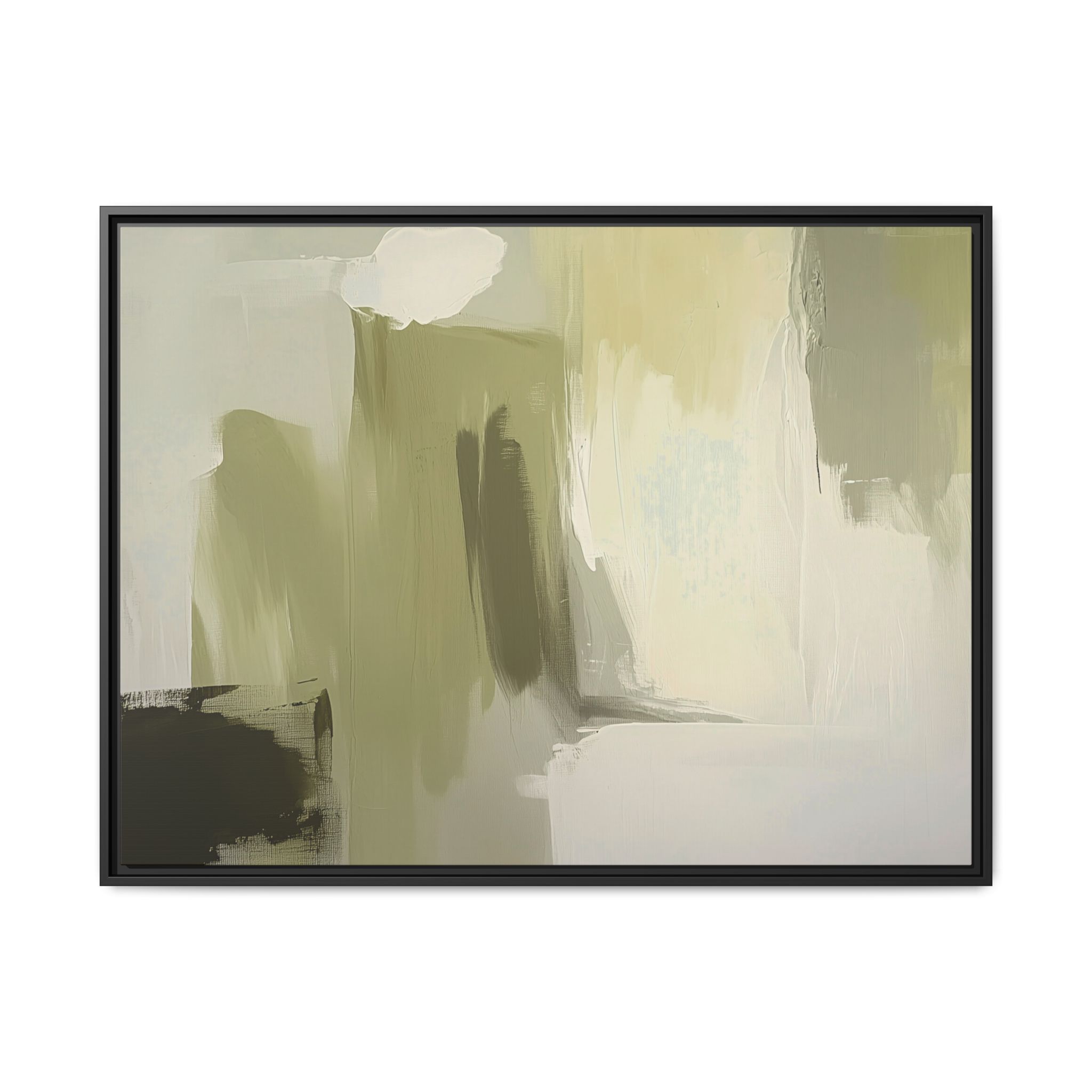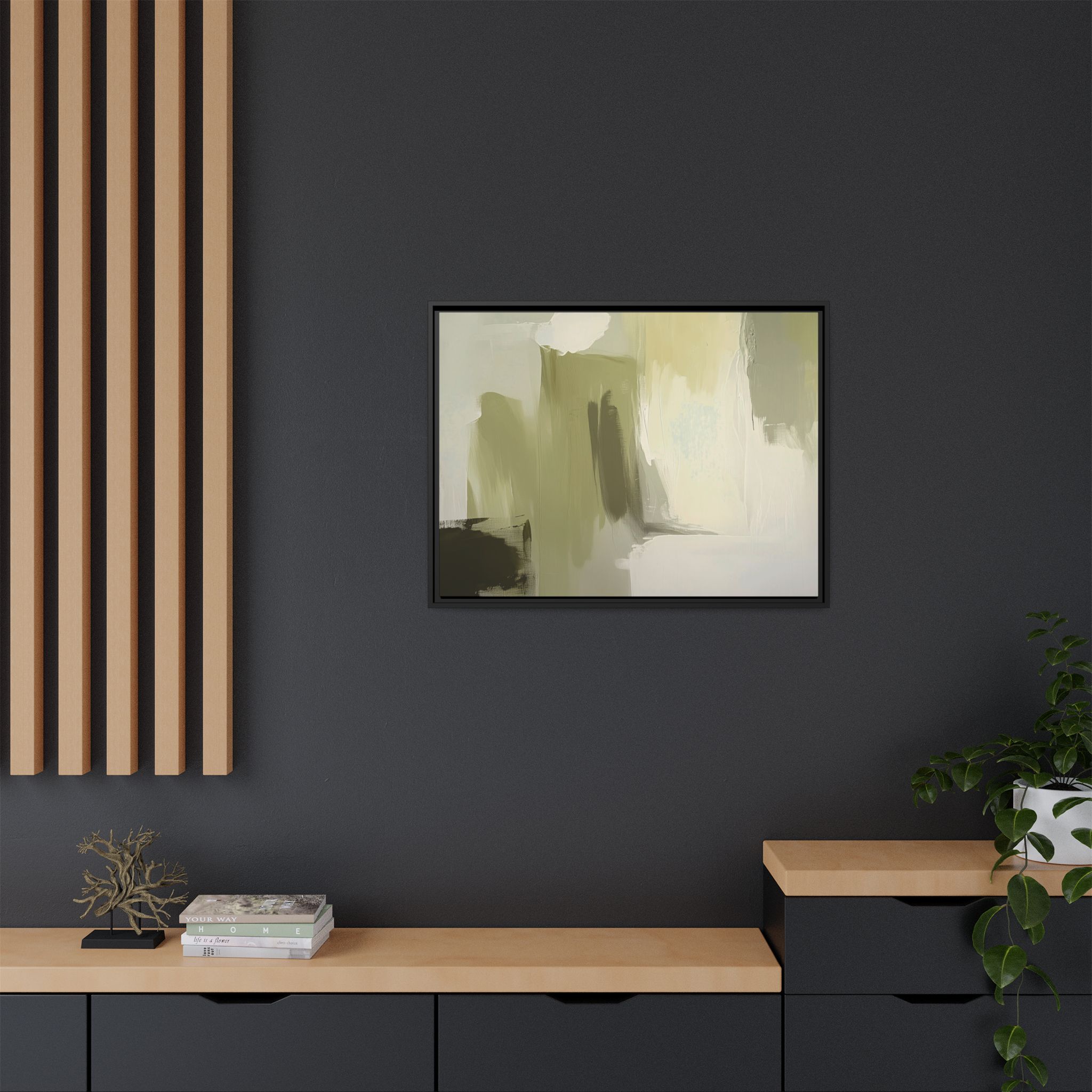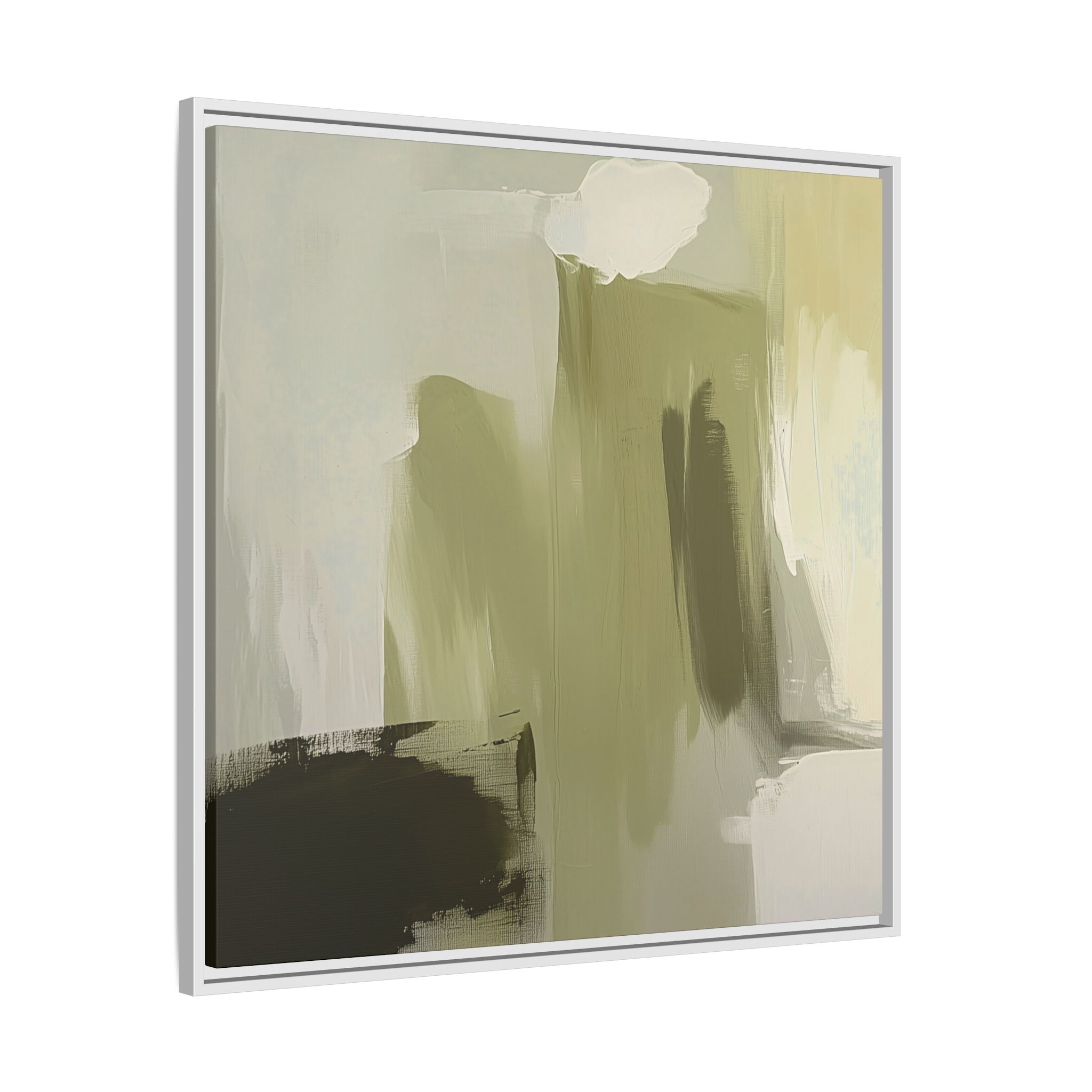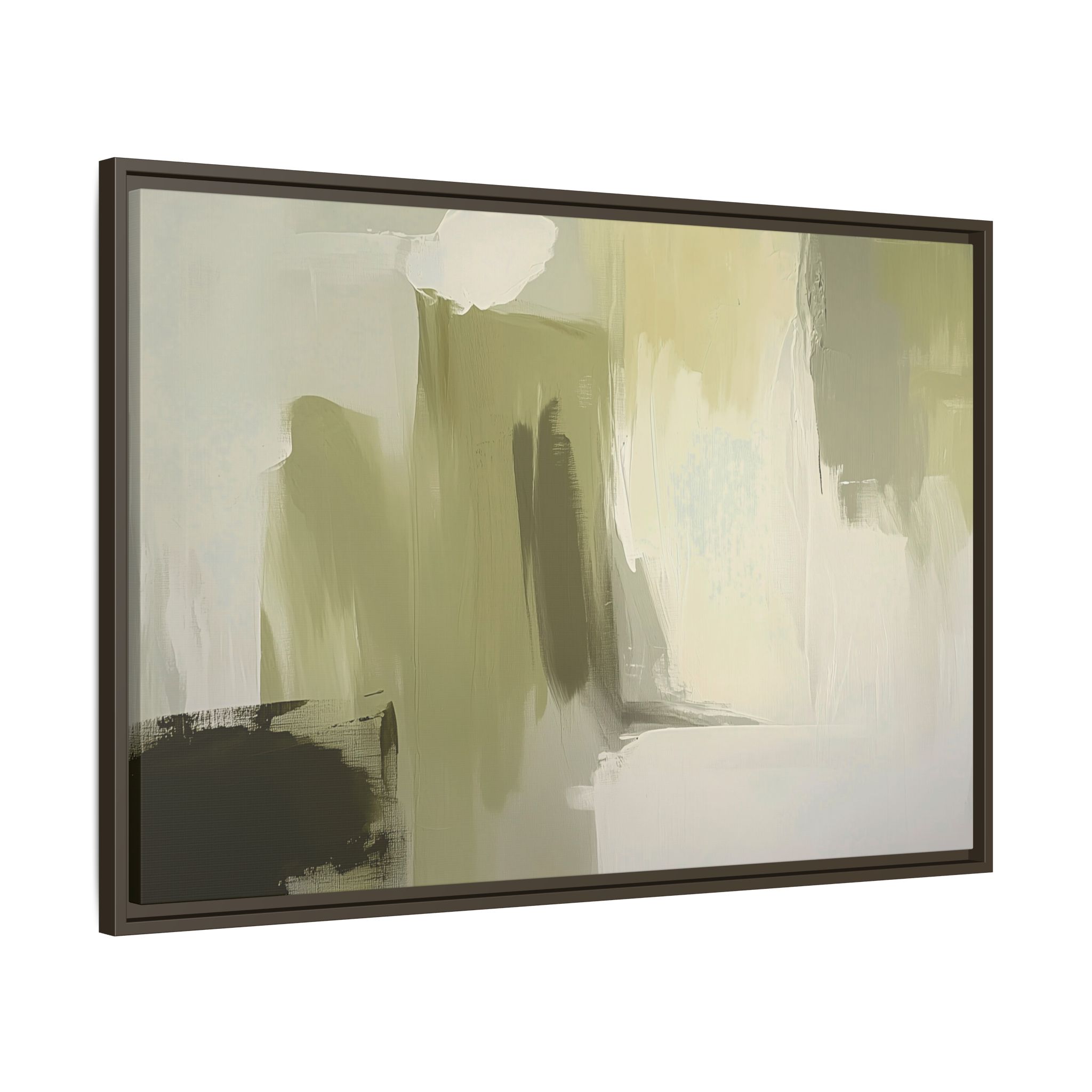A minimalist abstract canvas print featuring brushed olive and cream shapes, thin lines, flat lighting, brush strokes, and subtle color transitions. This artwork gives a modern and sophisticated vibe, perfect for contemporary home decor enthusiasts and art lovers. Ideal for adding a touch of elegance to living rooms, bedrooms, or home offices. Relevant for gift-giving occasions like housewarming parties, birthdays, and holidays.