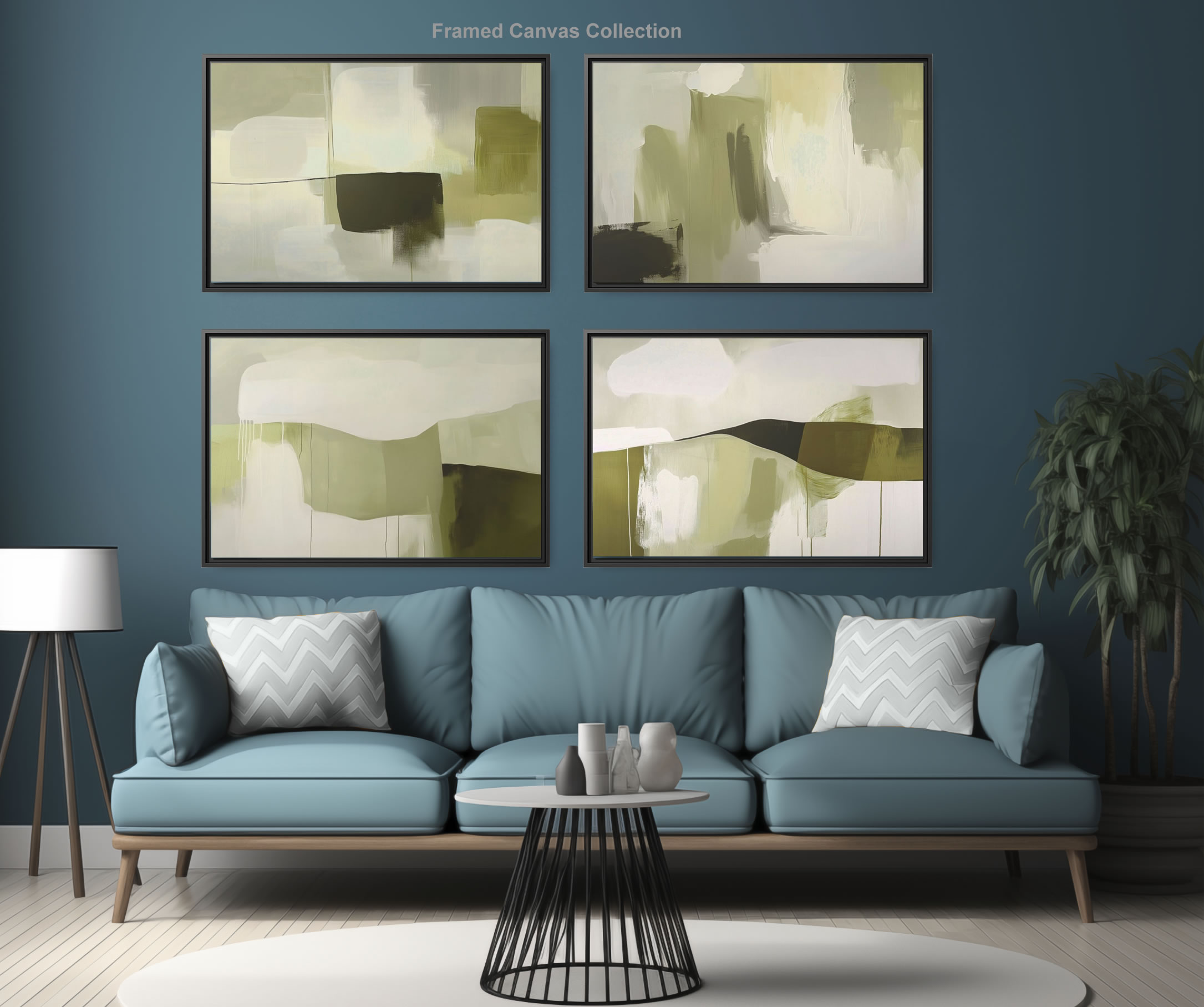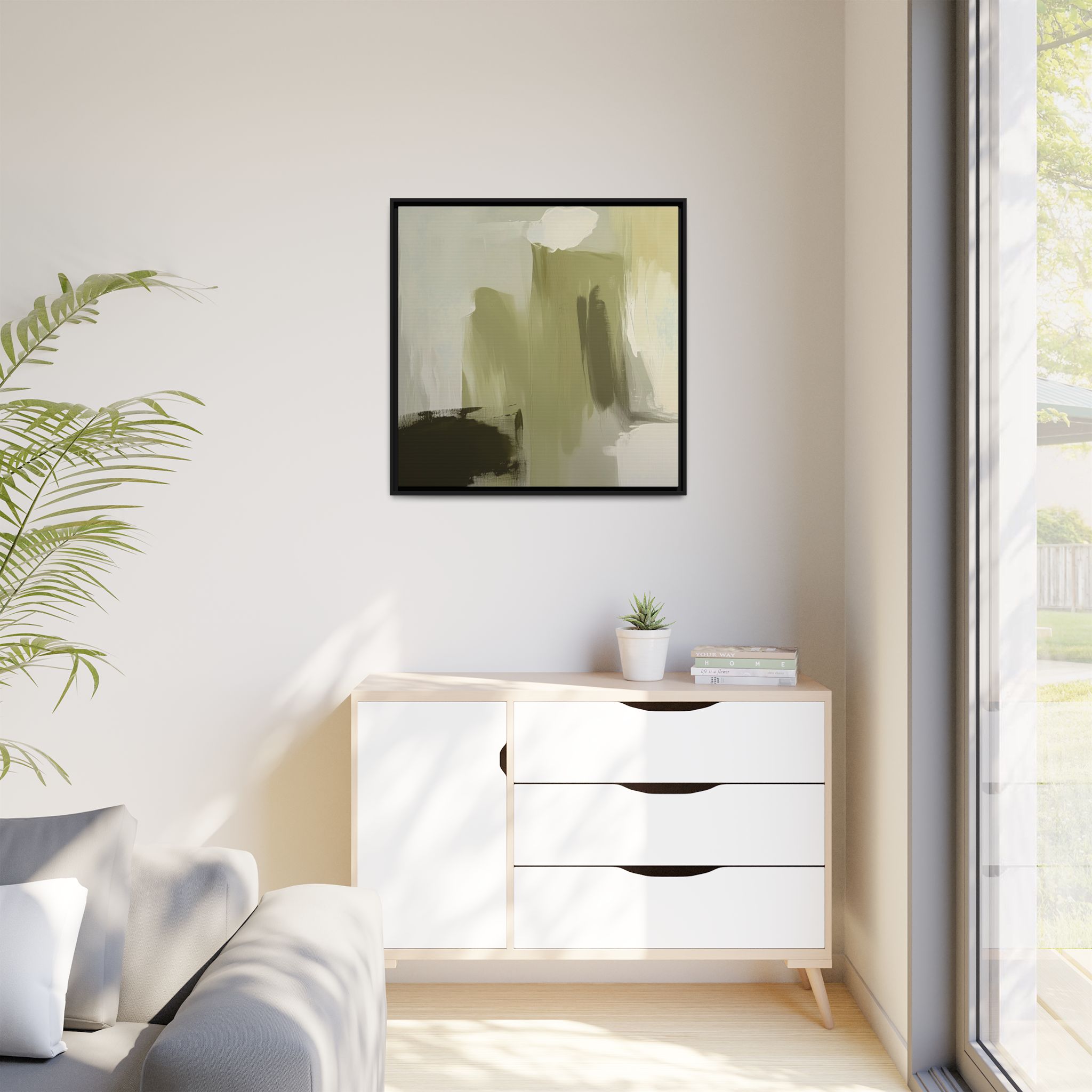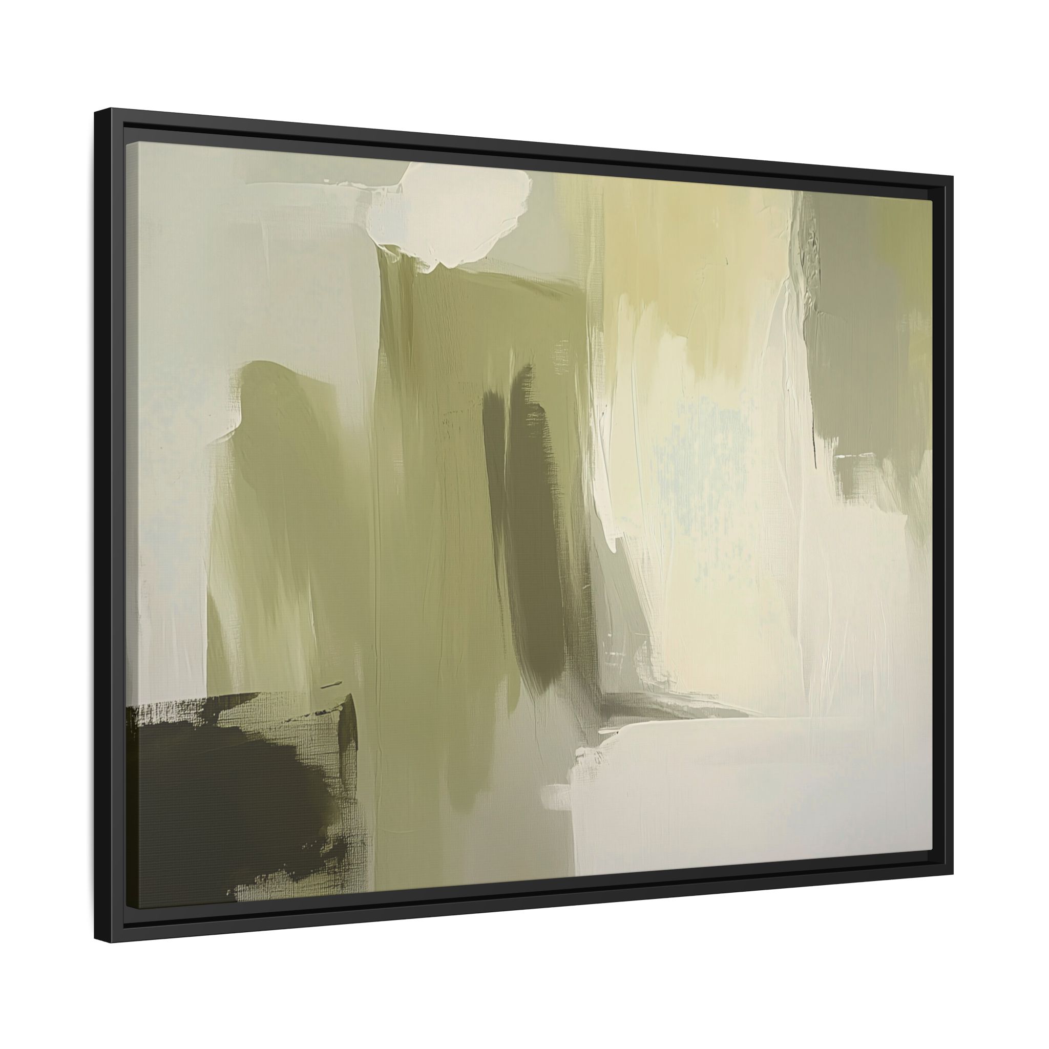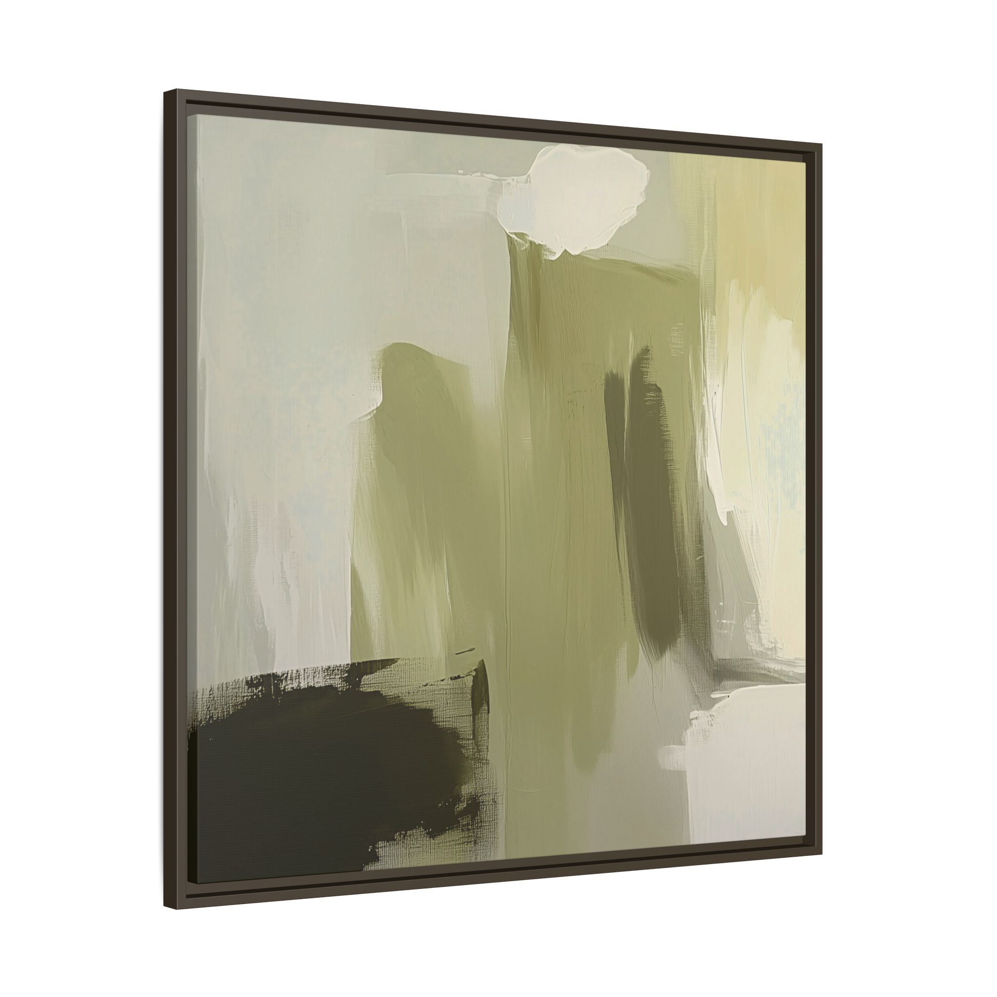 A minimalist abstract canvas print featuring brushed olive and cream shapes, thin lines, flat lighting, brush strokes, and subtle color transitions. This artwork gives a modern and sophisticated vibe, perfect for contemporary home decor enthusiasts and art lovers. Ideal for adding a touch of elegance to living rooms, bedrooms, or home offices. Relevant for gift-giving occasions like housewarming parties, birthdays, and holidays.
