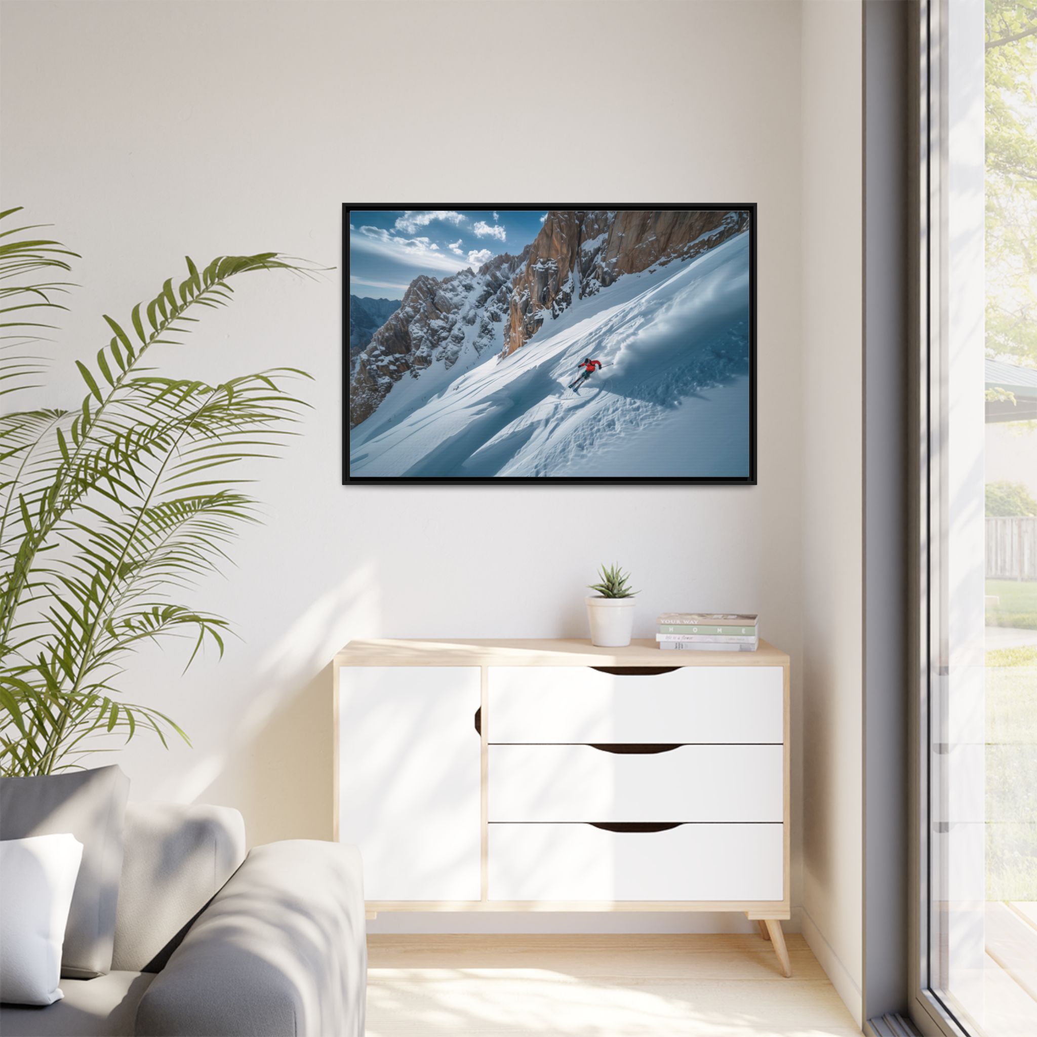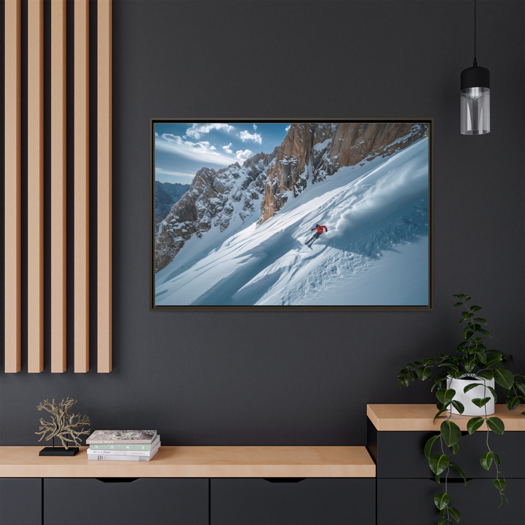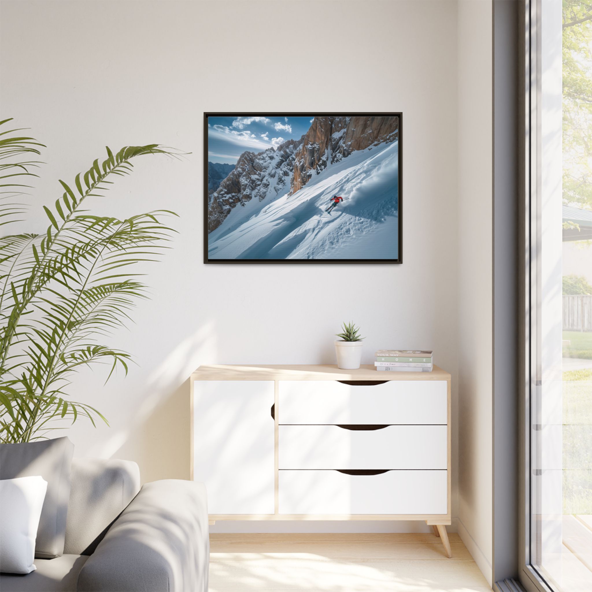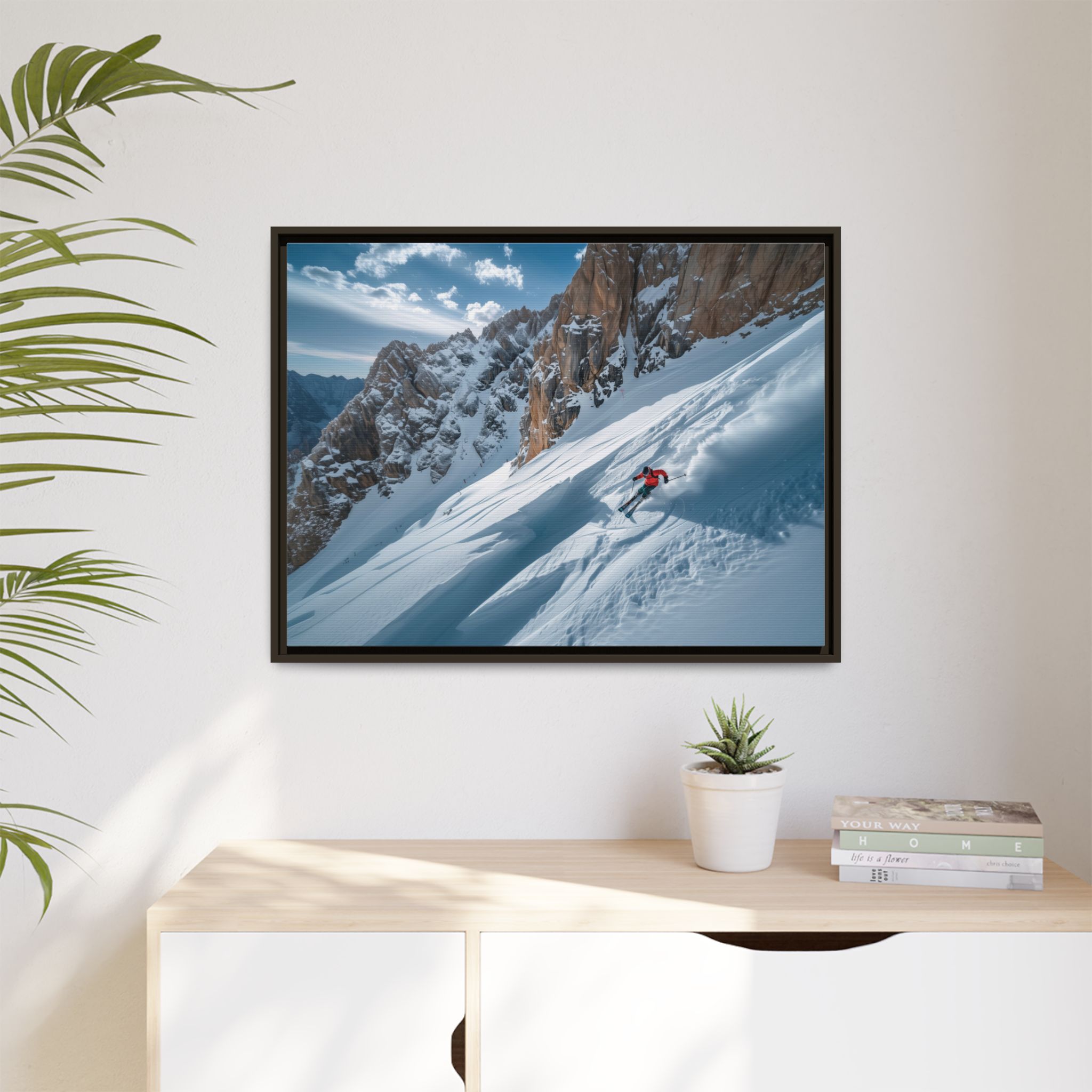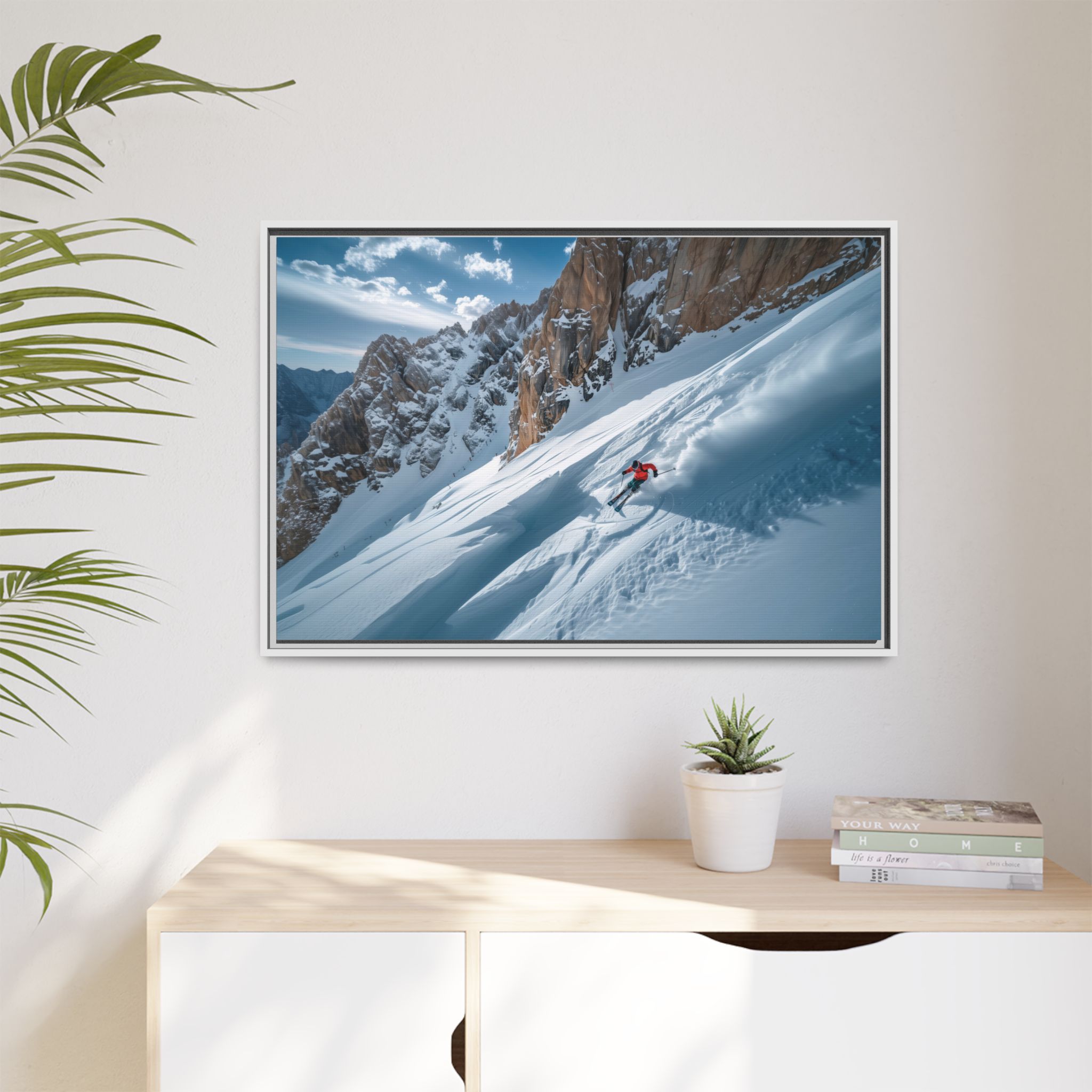 A dynamic action scene of a sole free skier, skiing down the slopes in deep snow, a beautiful action landscape with intensity and excitement. The high-speed motion creates swirling snow clouds around them as they land on a snowy mountain slope. Experience the excitement of skiing with this dynamic action style canvas print. Perfect for adrenaline junkies and winter sports enthusiasts, this canvas brings intensity and motion to any room. Ideal for winter decor, sports enthusiasts, and anyone looking to add a thrilling touch to their space.