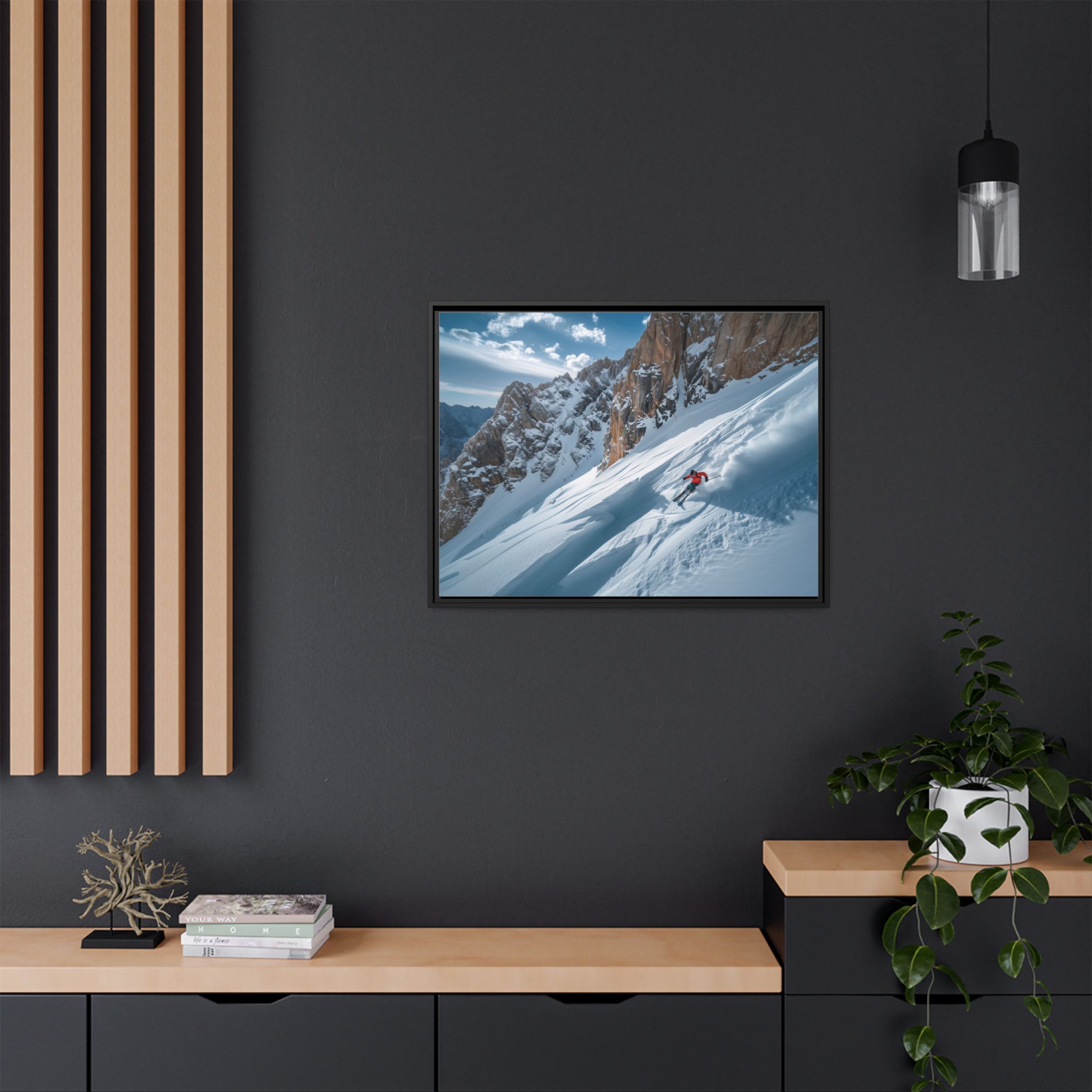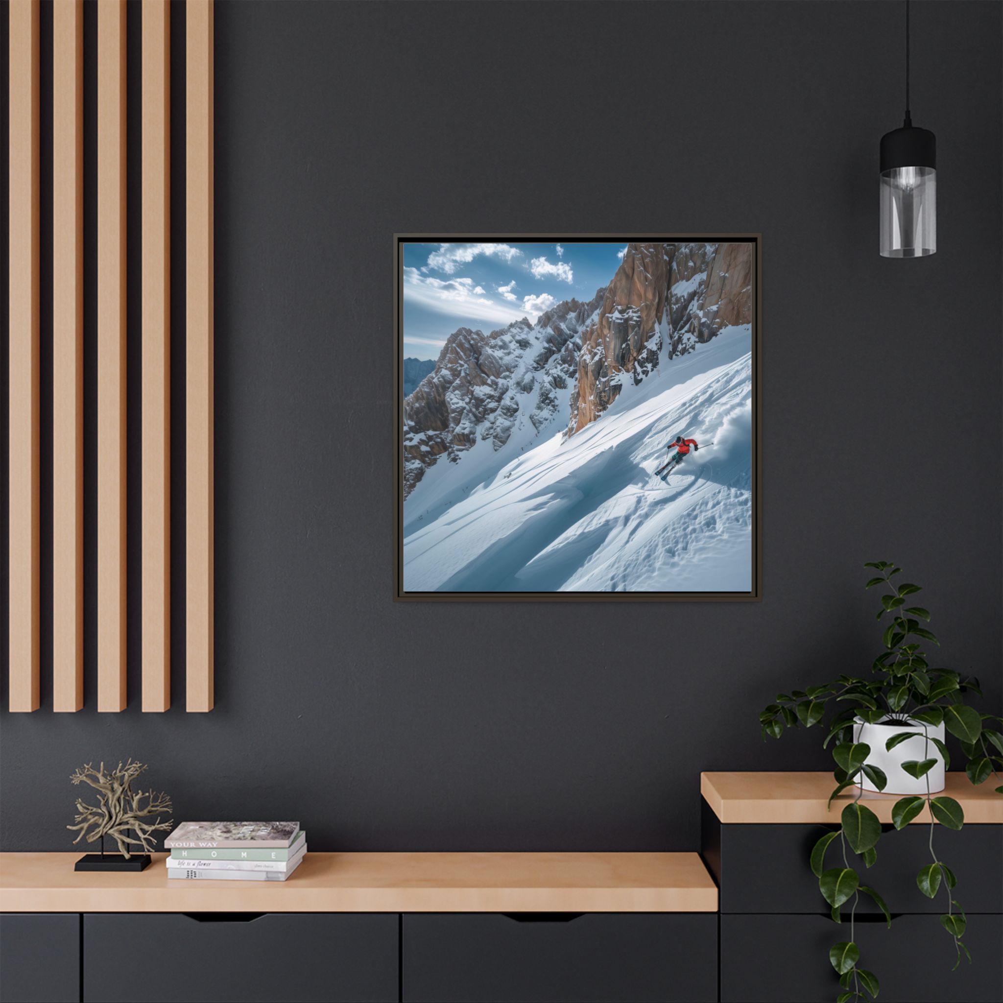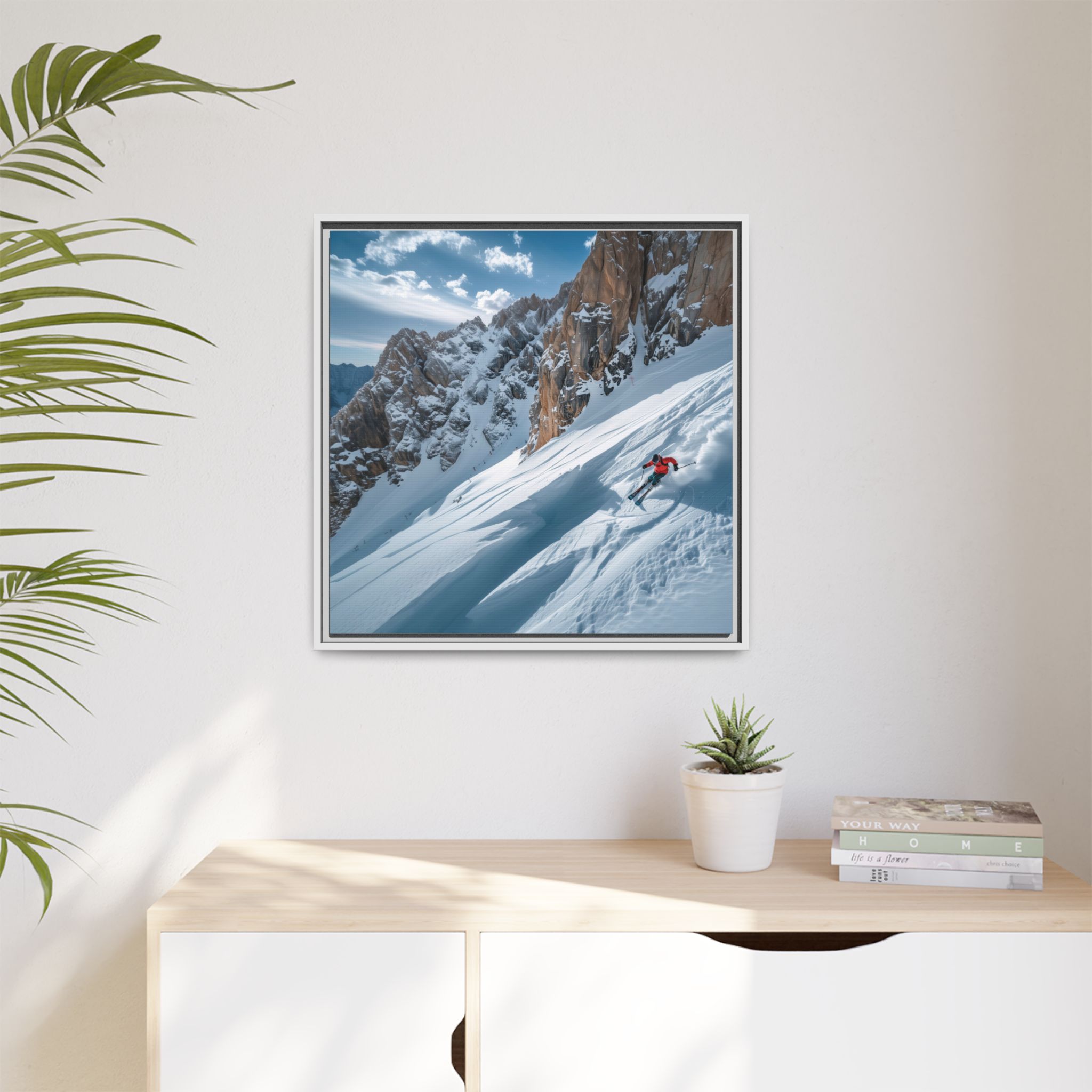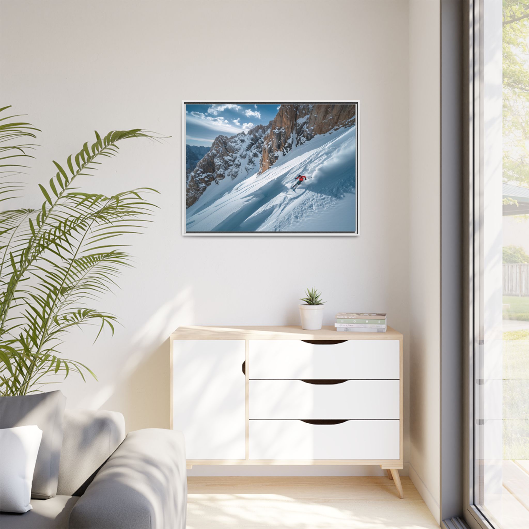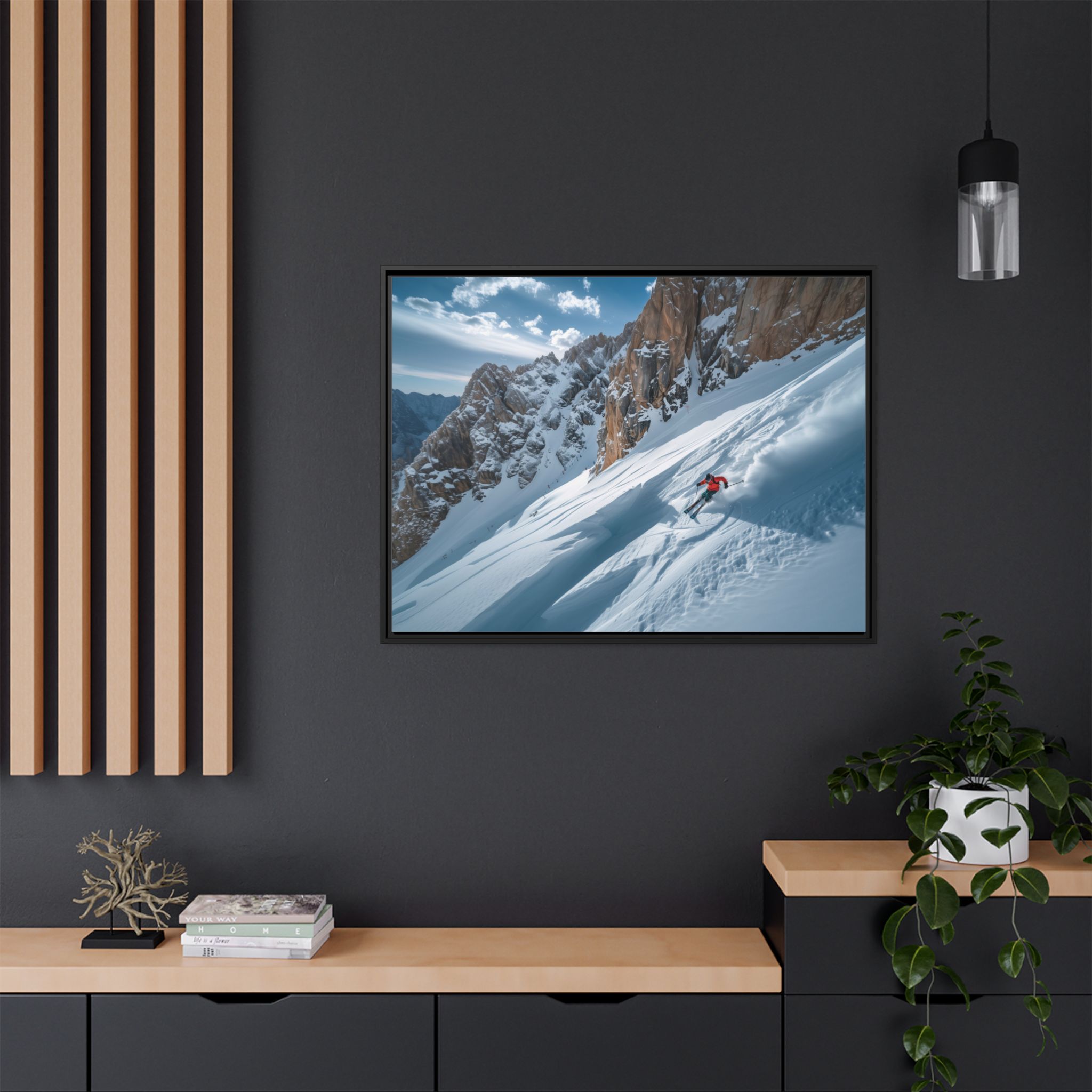 A dynamic action scene of a sole free skier, skiing down the slopes in deep snow, a beautiful action landscape with intensity and excitement. The high-speed motion creates swirling snow clouds around them as they land on a snowy mountain slope. Experience the excitement of skiing with this dynamic action style canvas print. Perfect for adrenaline junkies and winter sports enthusiasts, this canvas brings intensity and motion to any room. Ideal for winter decor, sports enthusiasts, and anyone looking to add a thrilling touch to their space.