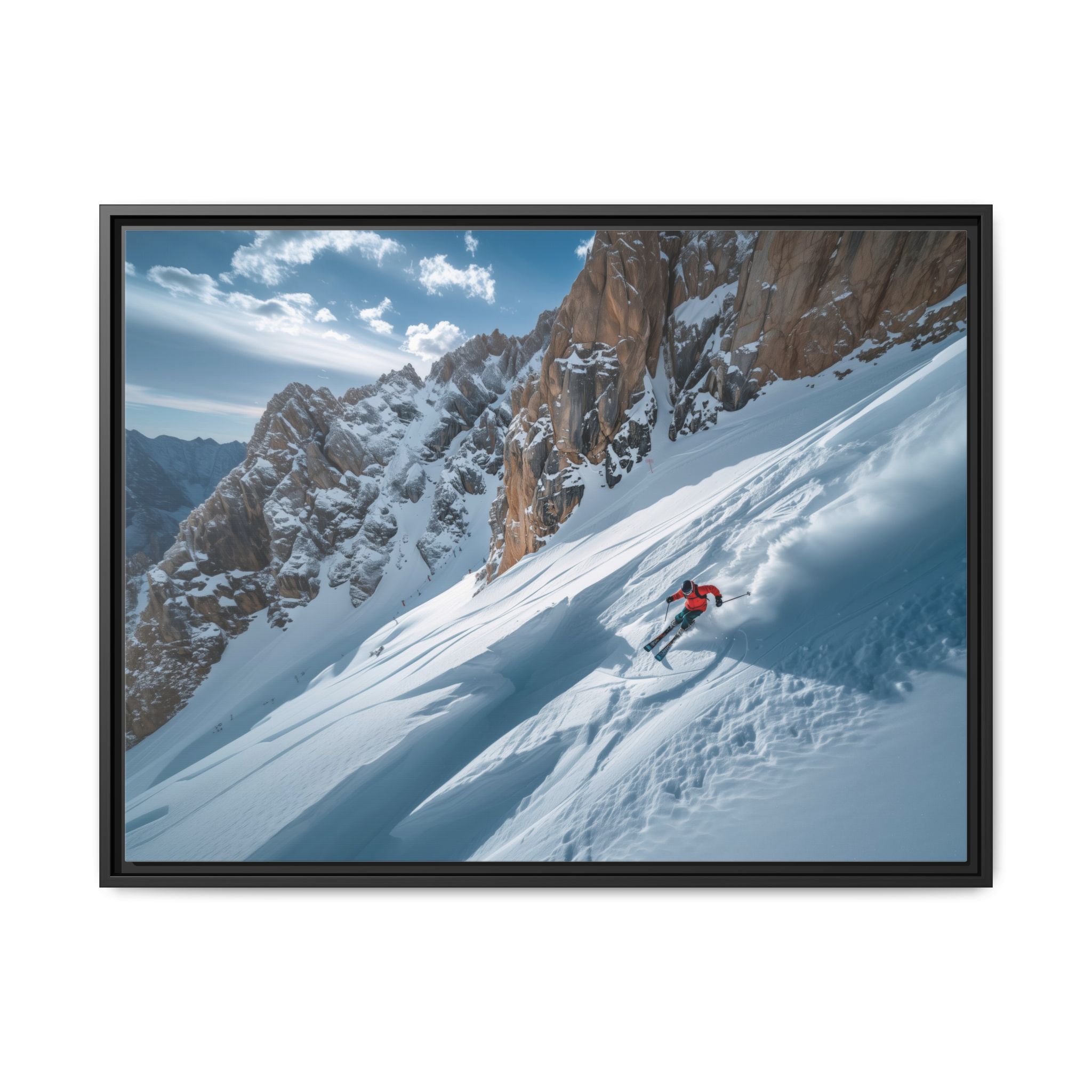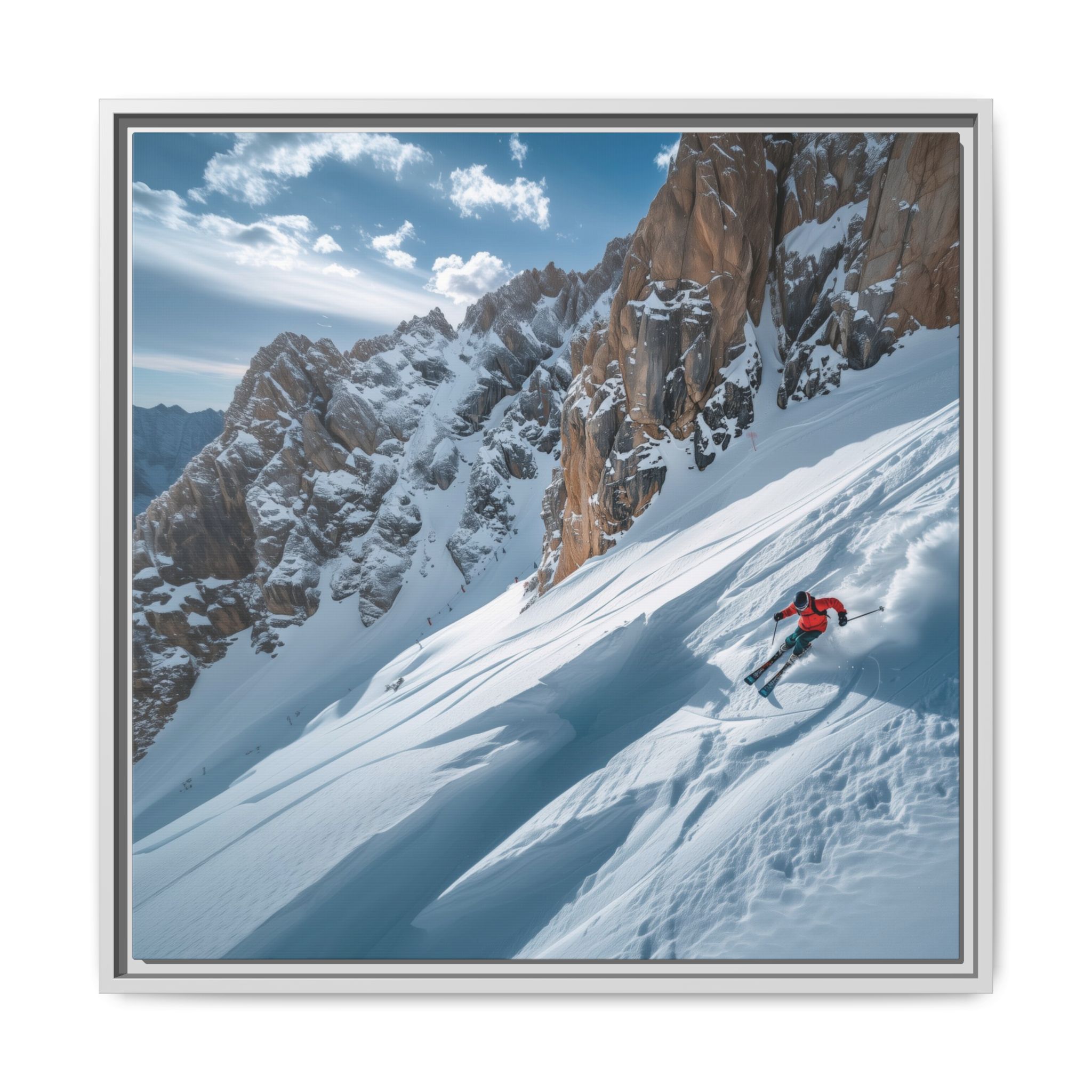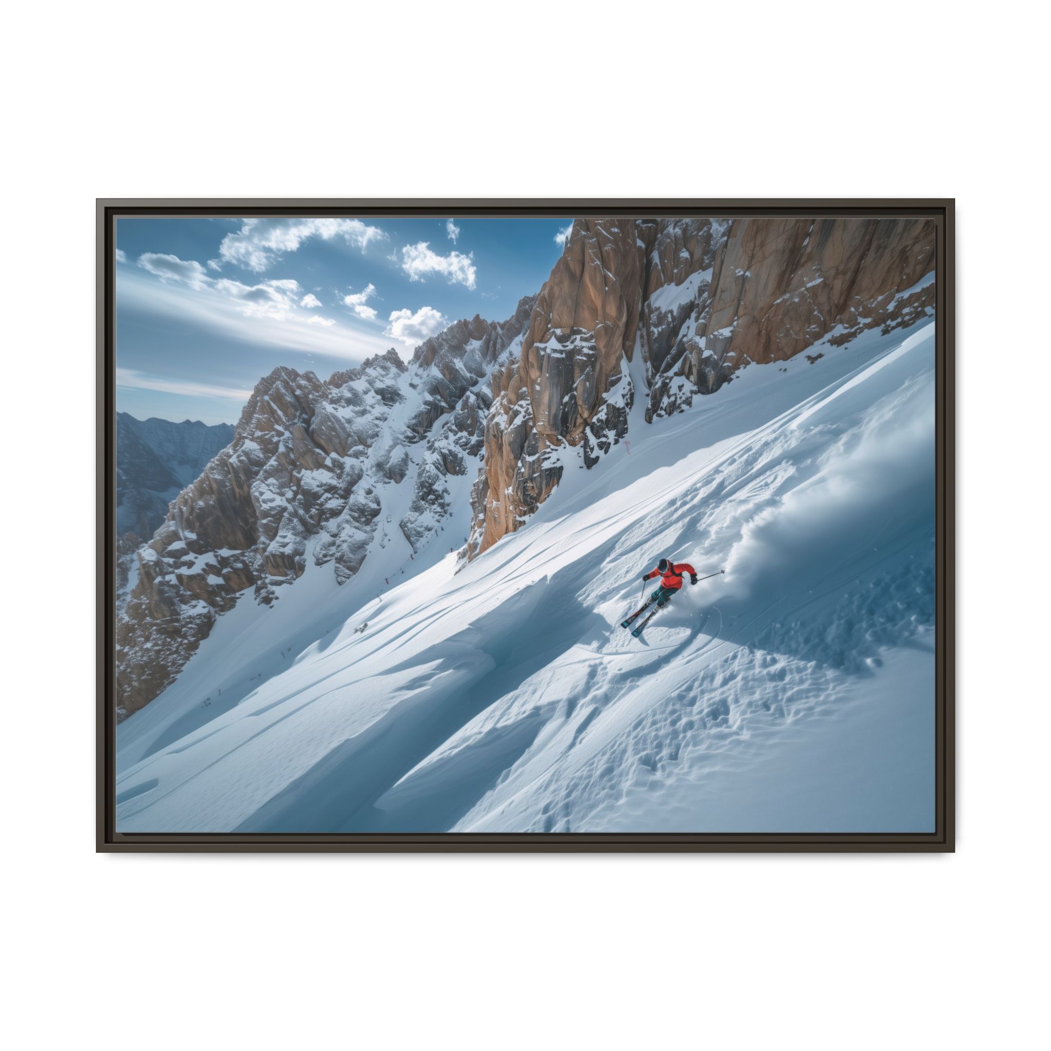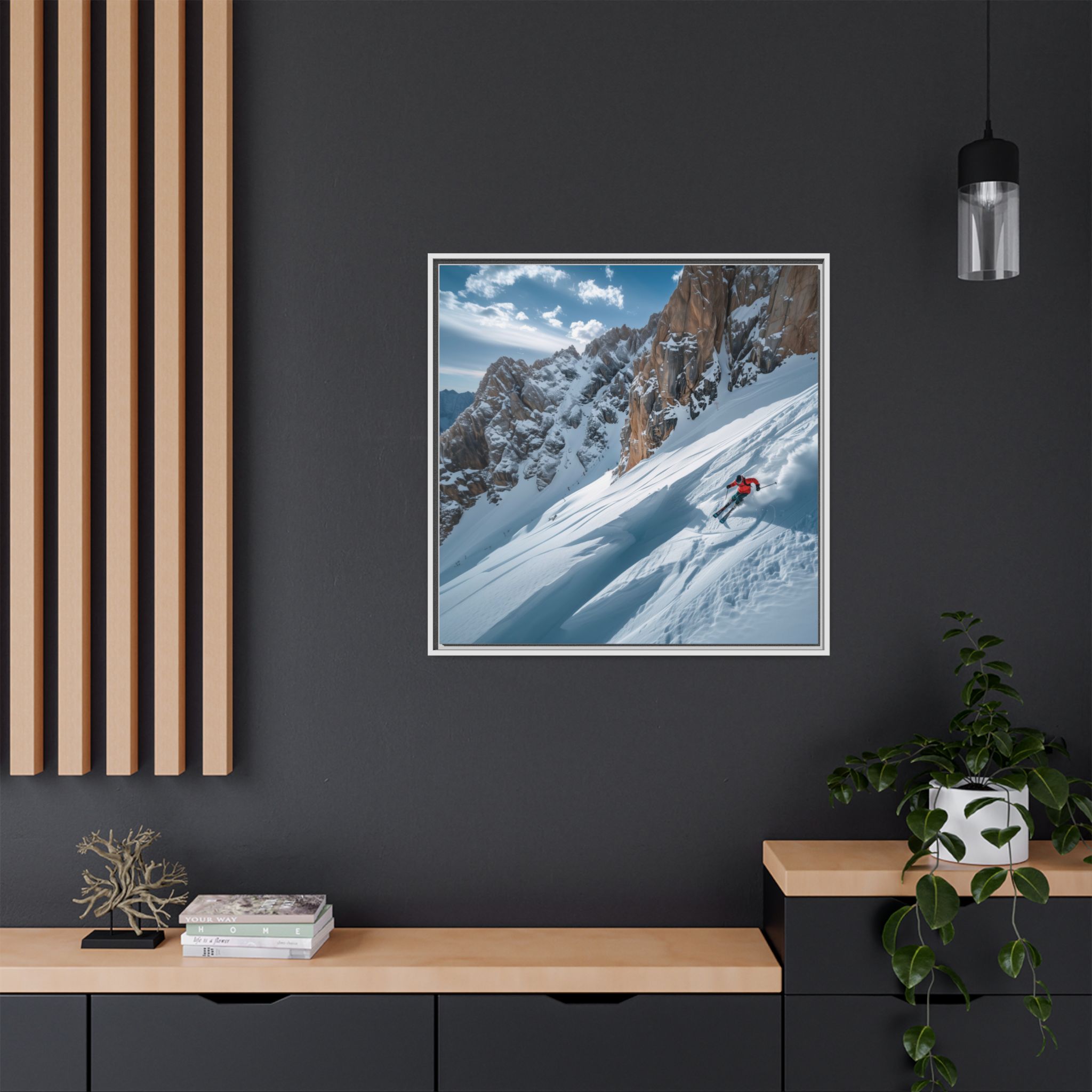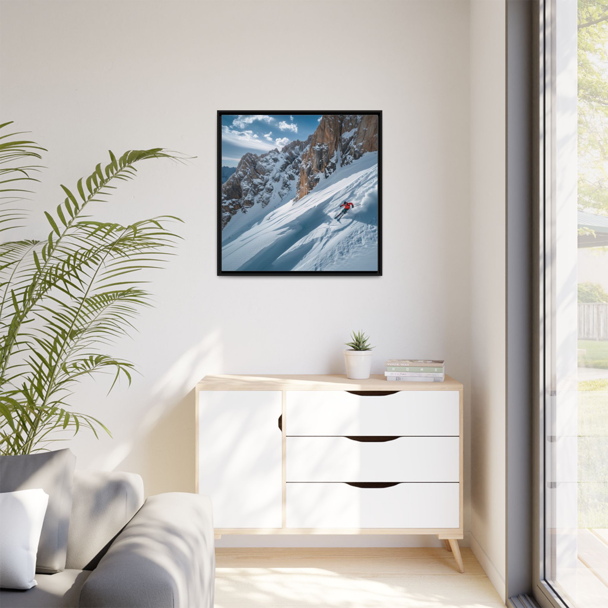 A dynamic action scene of a sole free skier, skiing down the slopes in deep snow, a beautiful action landscape with intensity and excitement. The high-speed motion creates swirling snow clouds around them as they land on a snowy mountain slope. Experience the excitement of skiing with this dynamic action style canvas print. Perfect for adrenaline junkies and winter sports enthusiasts, this canvas brings intensity and motion to any room. Ideal for winter decor, sports enthusiasts, and anyone looking to add a thrilling touch to their space.