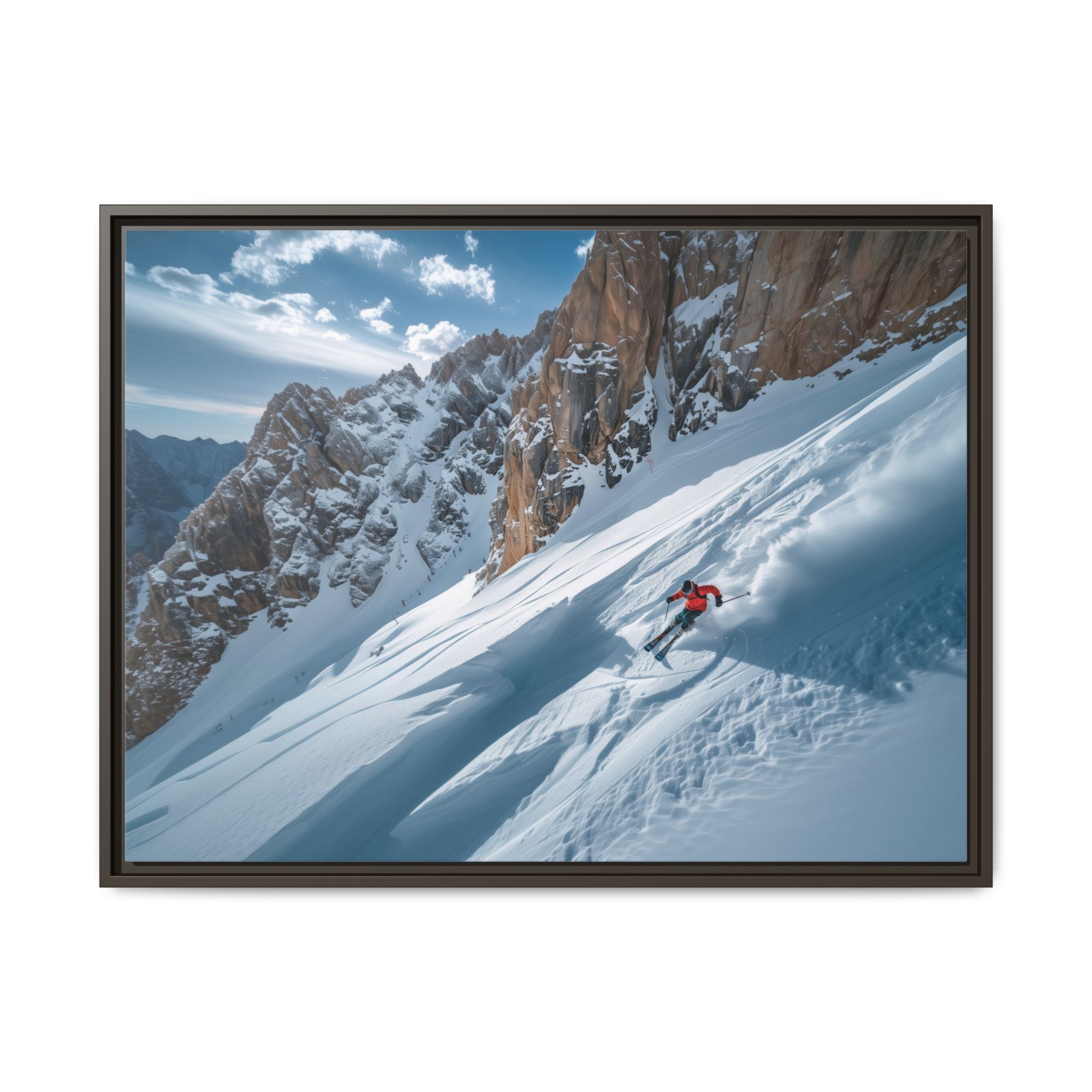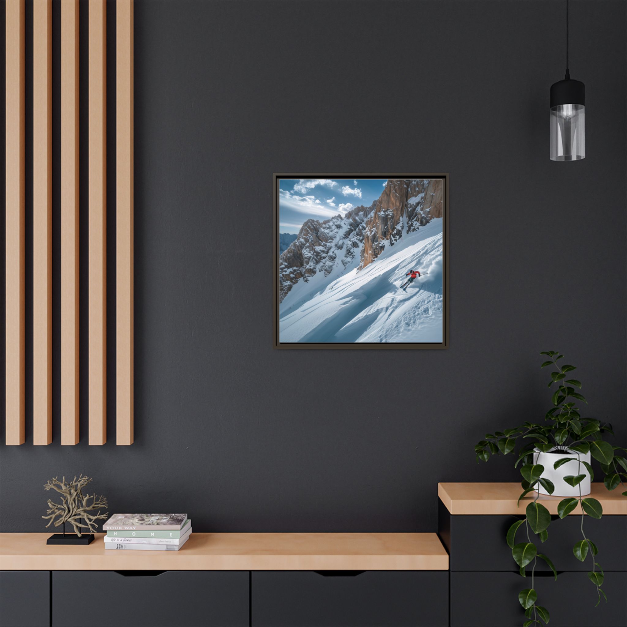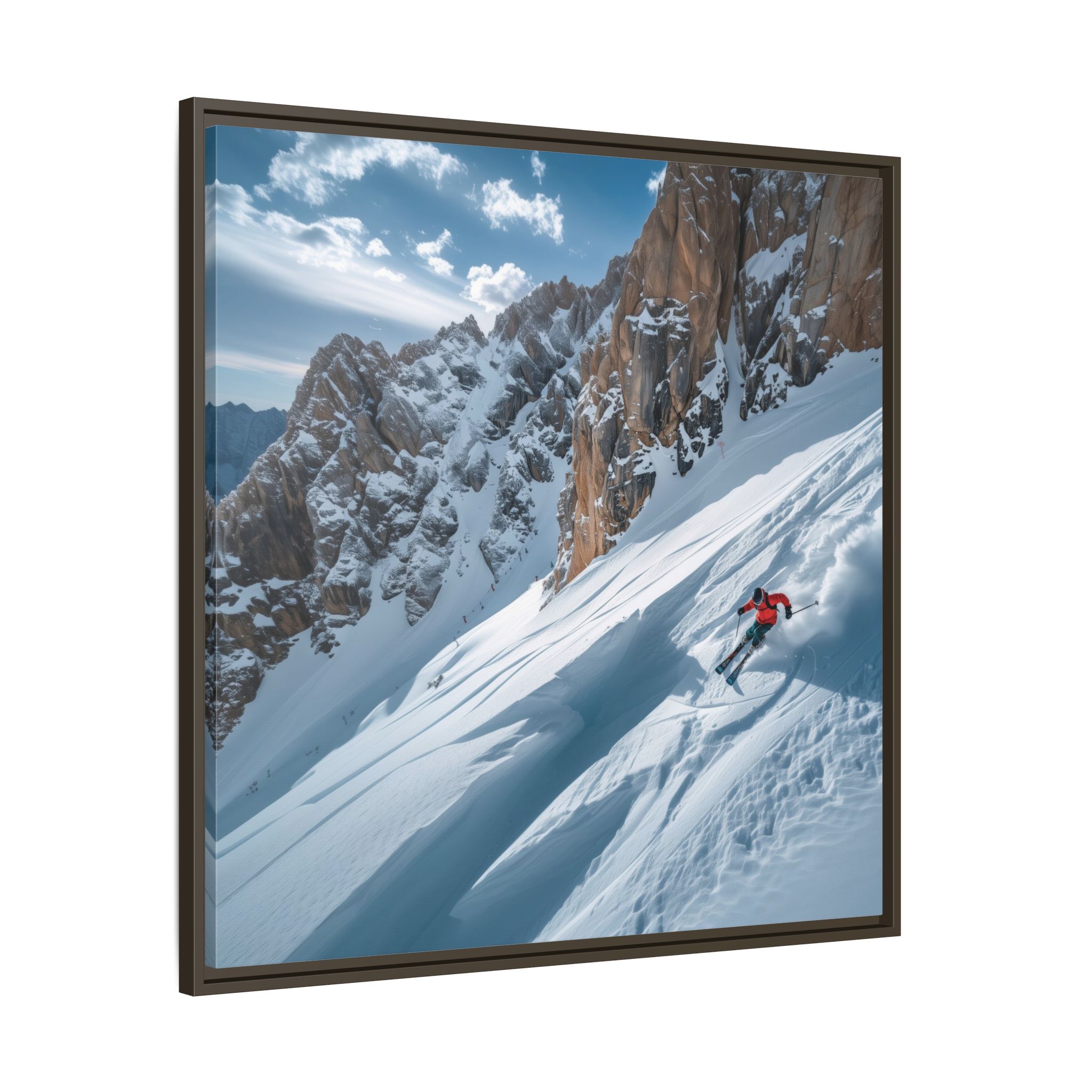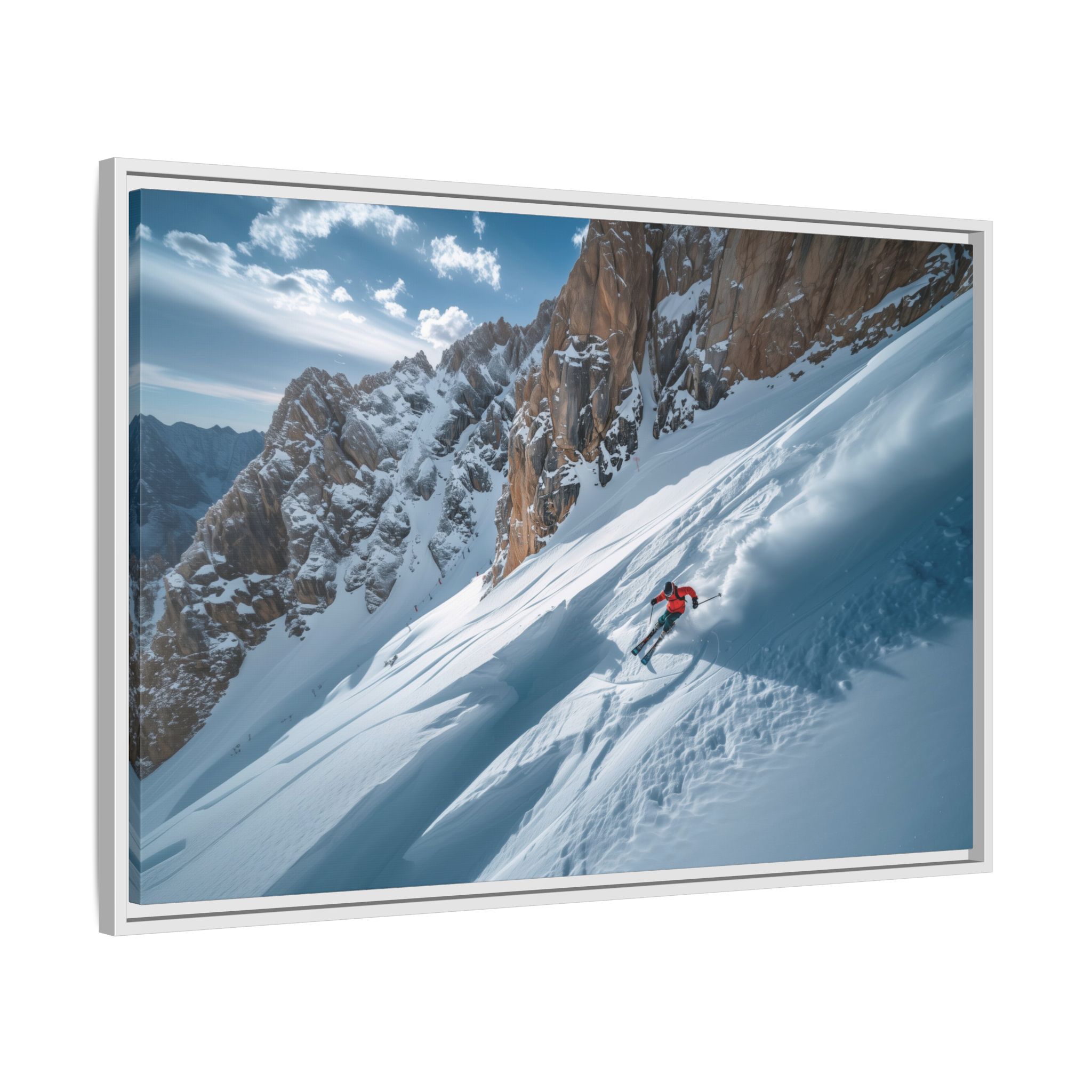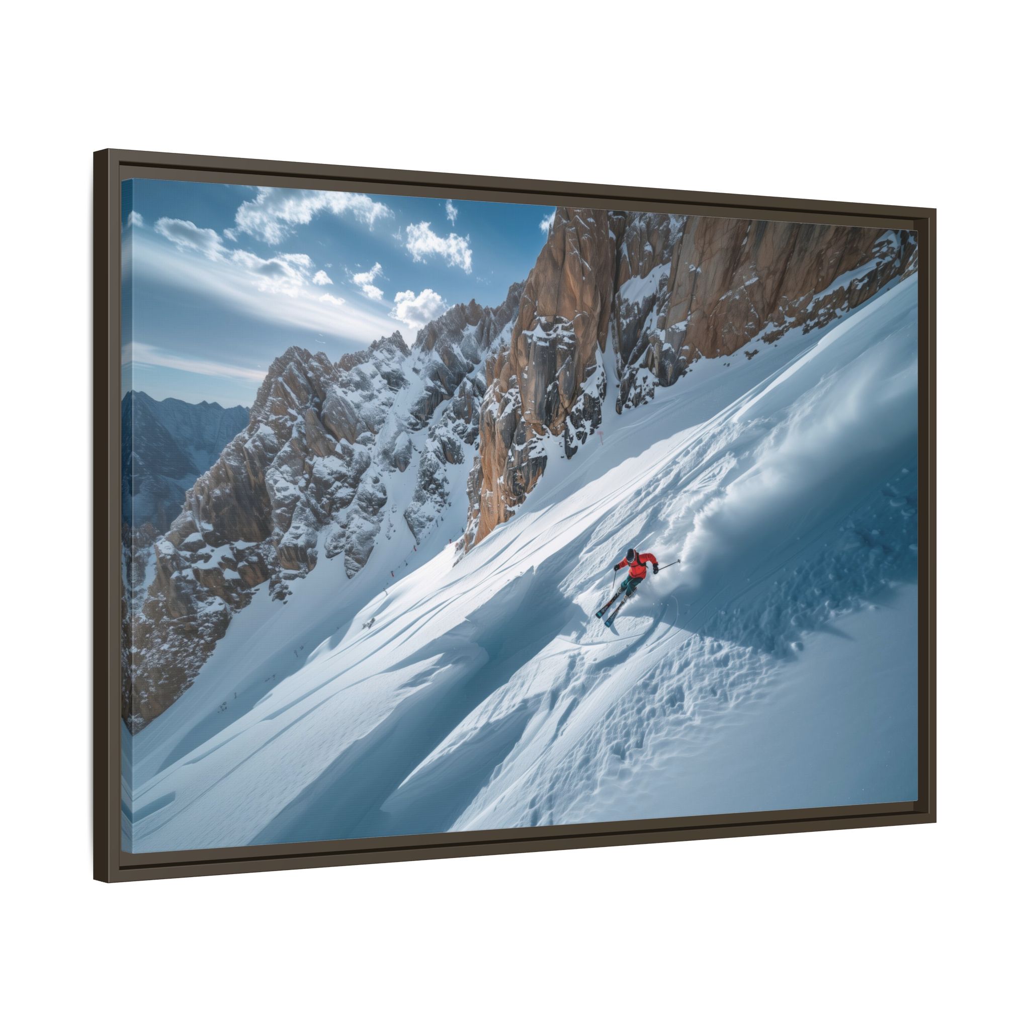 A dynamic action scene of a sole free skier, skiing down the slopes in deep snow, a beautiful action landscape with intensity and excitement. The high-speed motion creates swirling snow clouds around them as they land on a snowy mountain slope. Experience the excitement of skiing with this dynamic action style canvas print. Perfect for adrenaline junkies and winter sports enthusiasts, this canvas brings intensity and motion to any room. Ideal for winter decor, sports enthusiasts, and anyone looking to add a thrilling touch to their space.