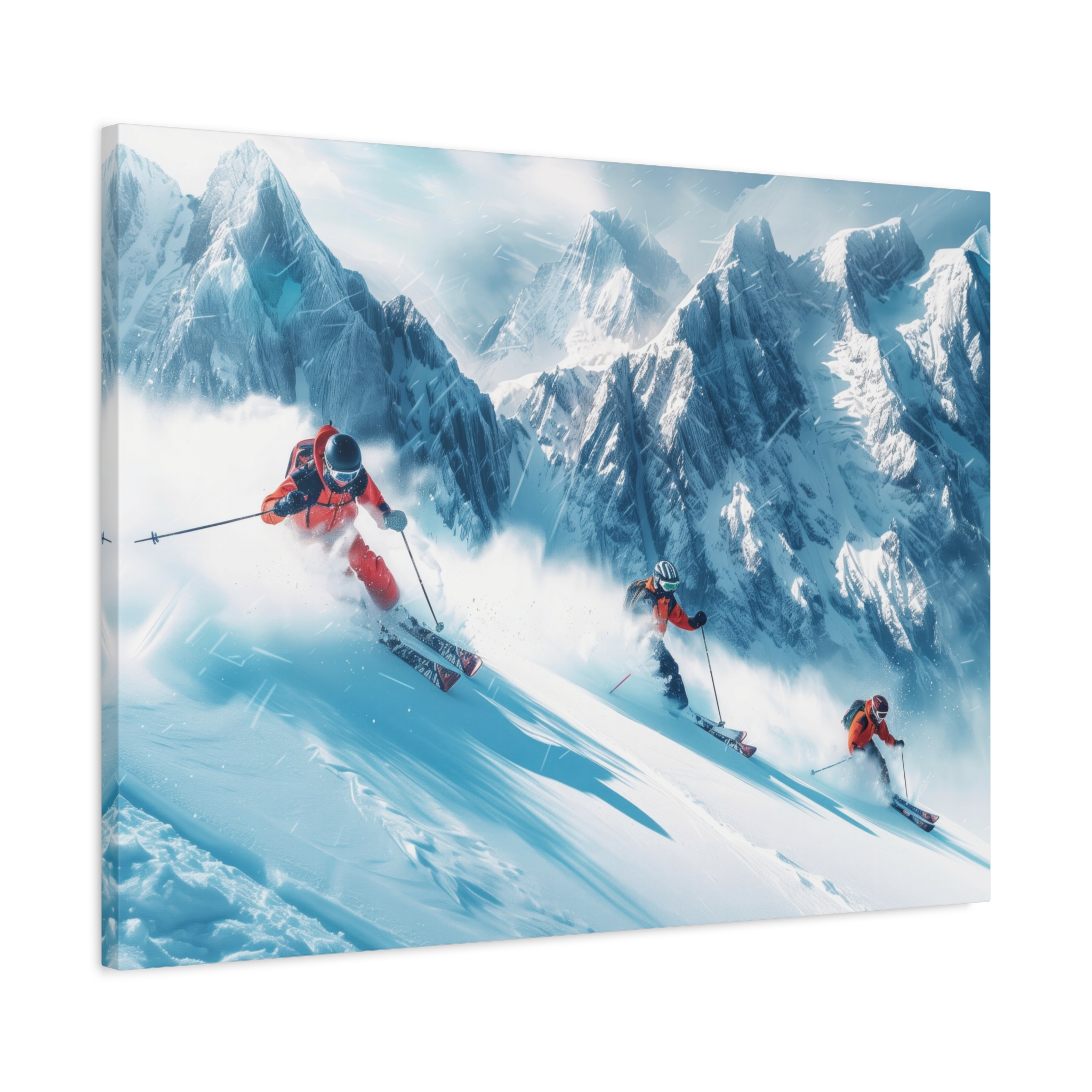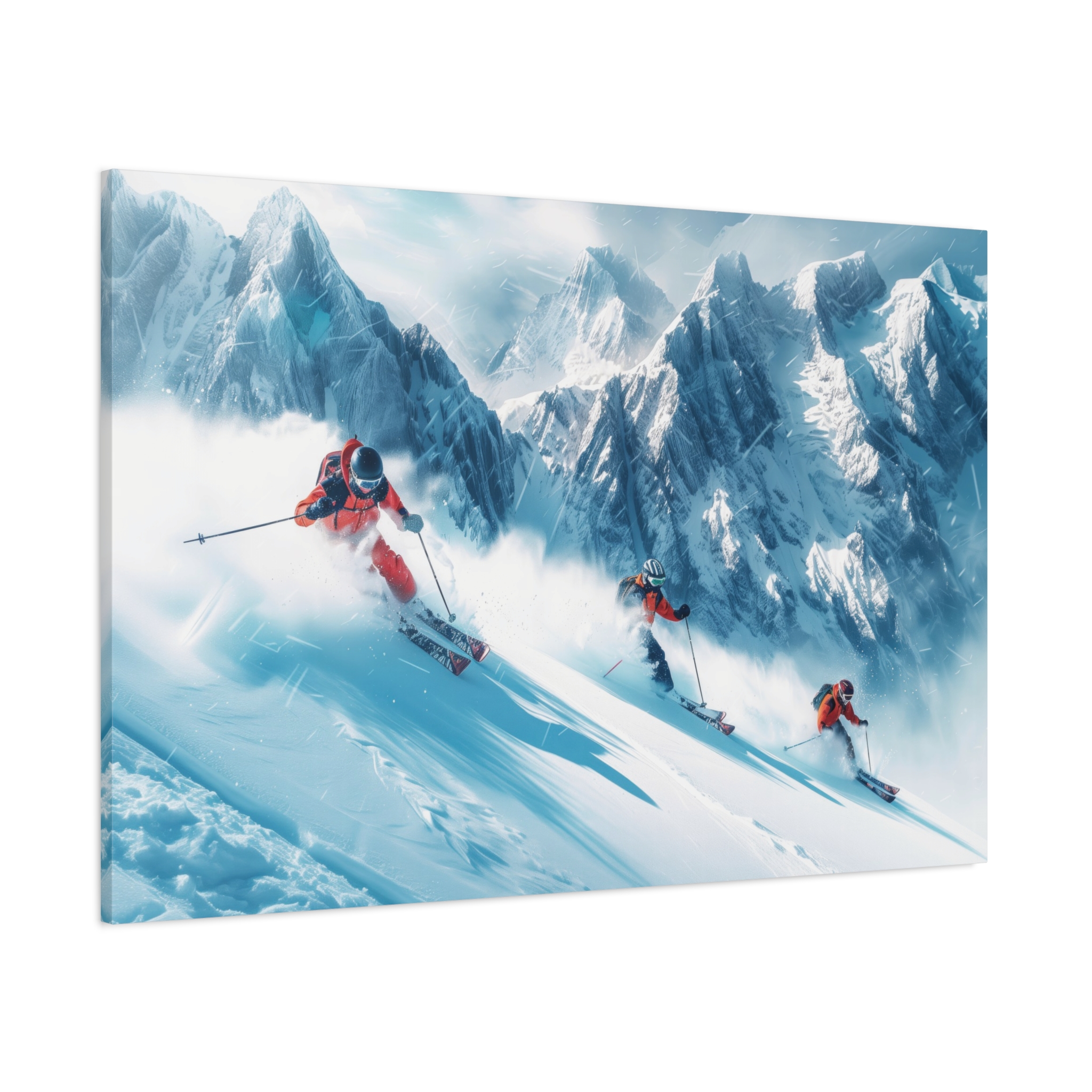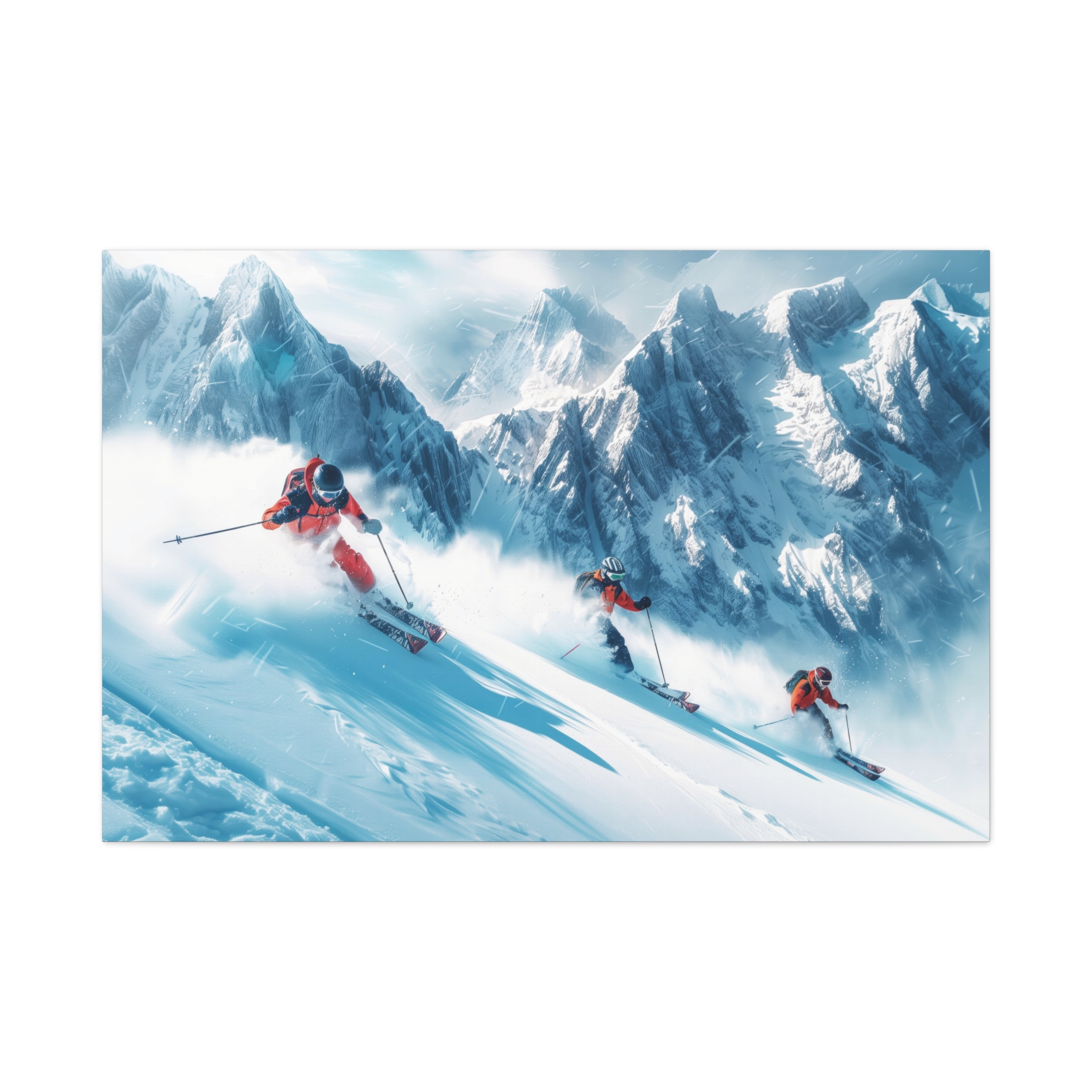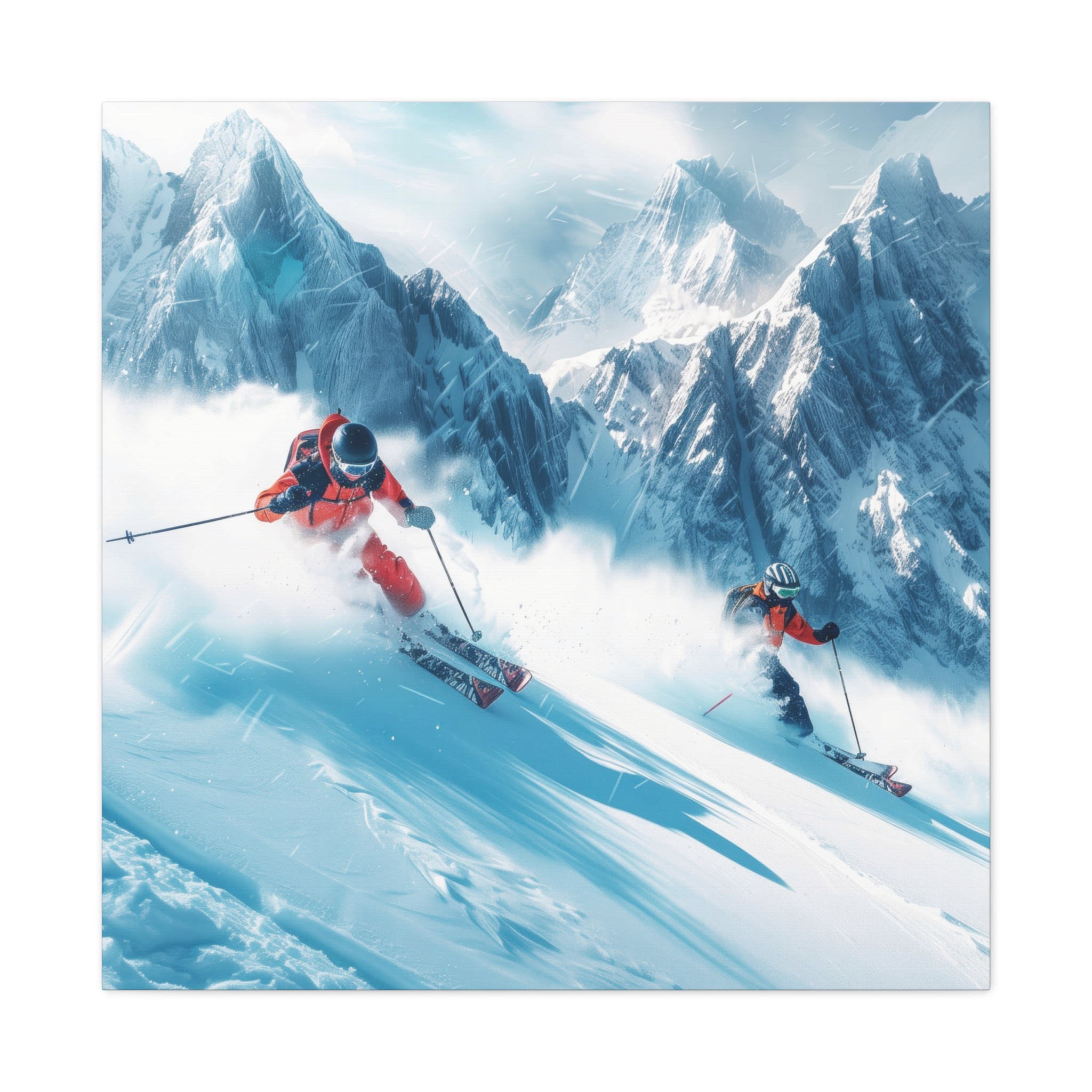A dynamic action scene of skiers free skiing down the slopes in deep snow, a beutiful action landscape with intensity and excitement. The high-speed motion creates swirling snow clouds around them as they land on a snowy mountain slope. Experience the excitement of skiing with this dynamic action style canvas print. Perfect for adrenaline junkies and winter sports enthusiasts, this canvas brings intensity and motion to any room. Ideal for winter decor, sports enthusiasts, and anyone looking to add a thrilling touch to their space.