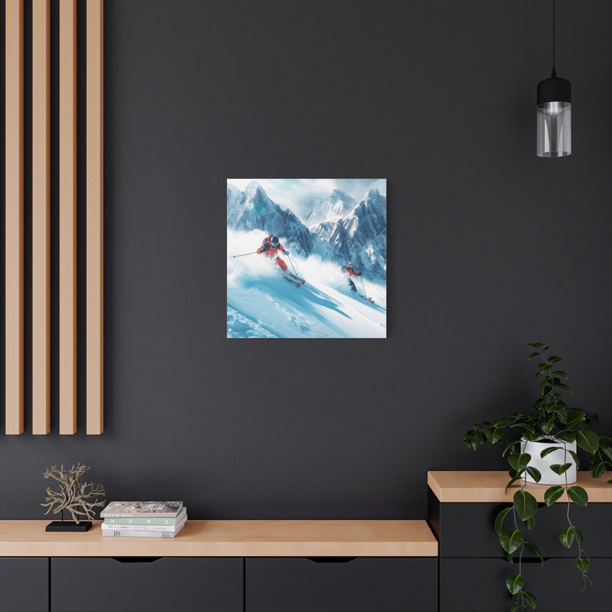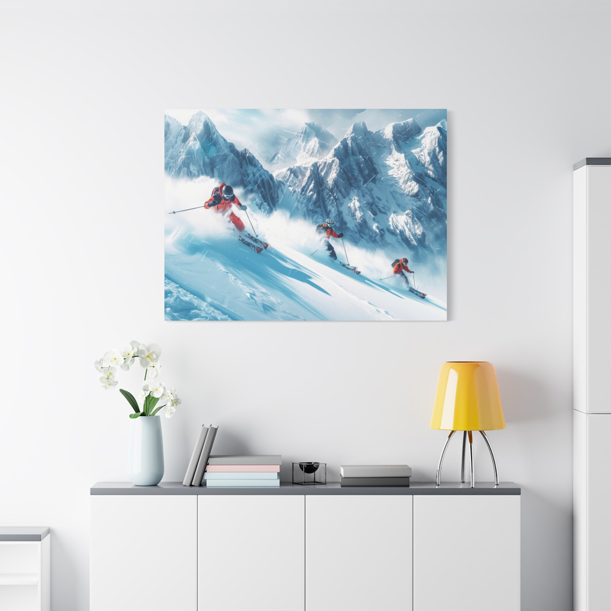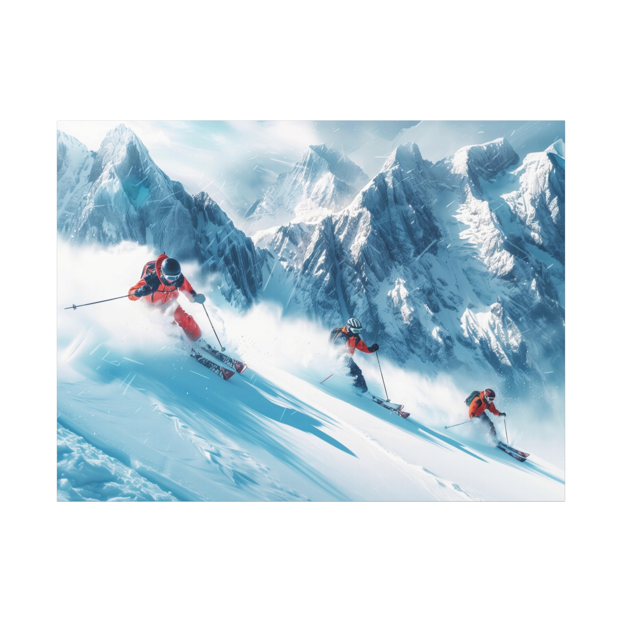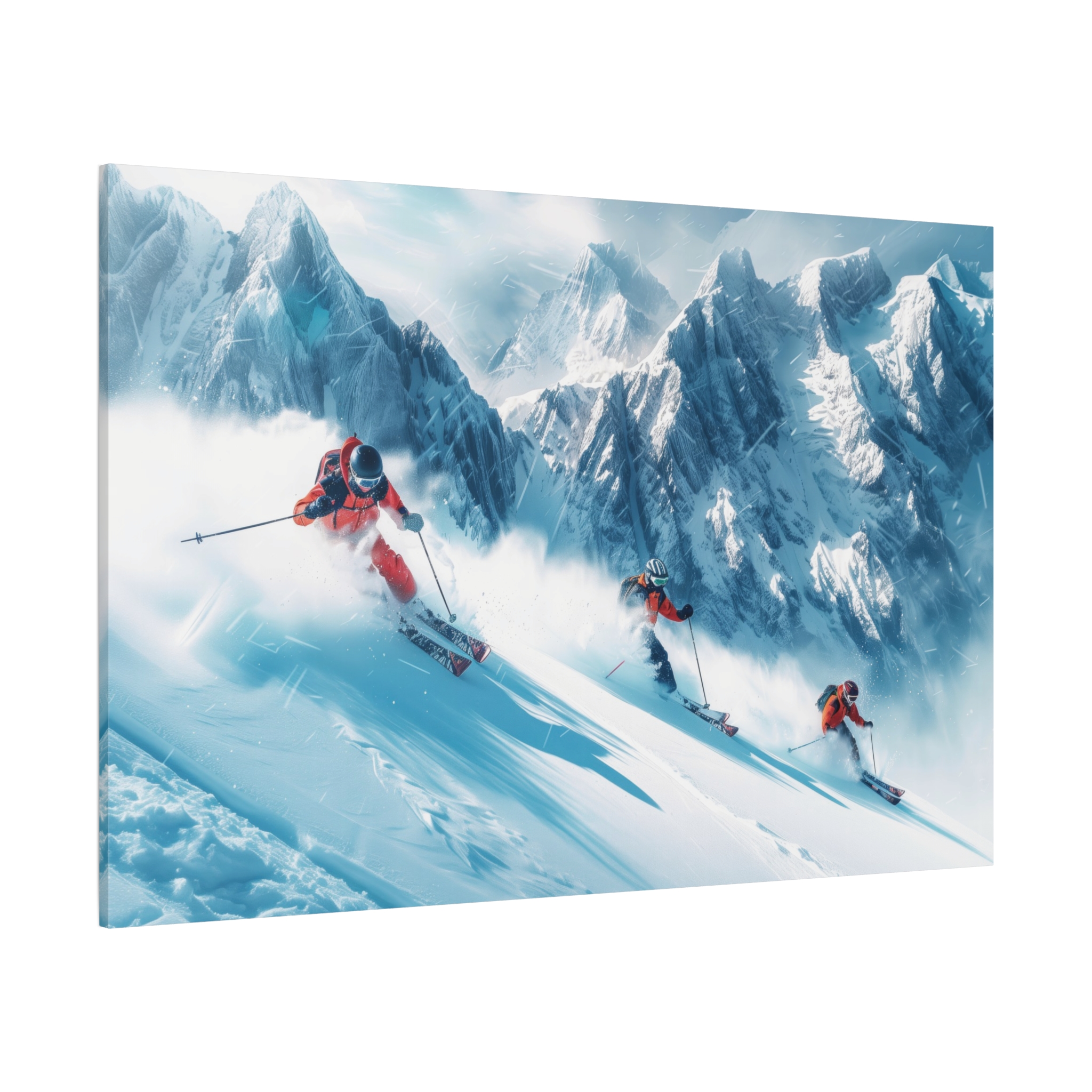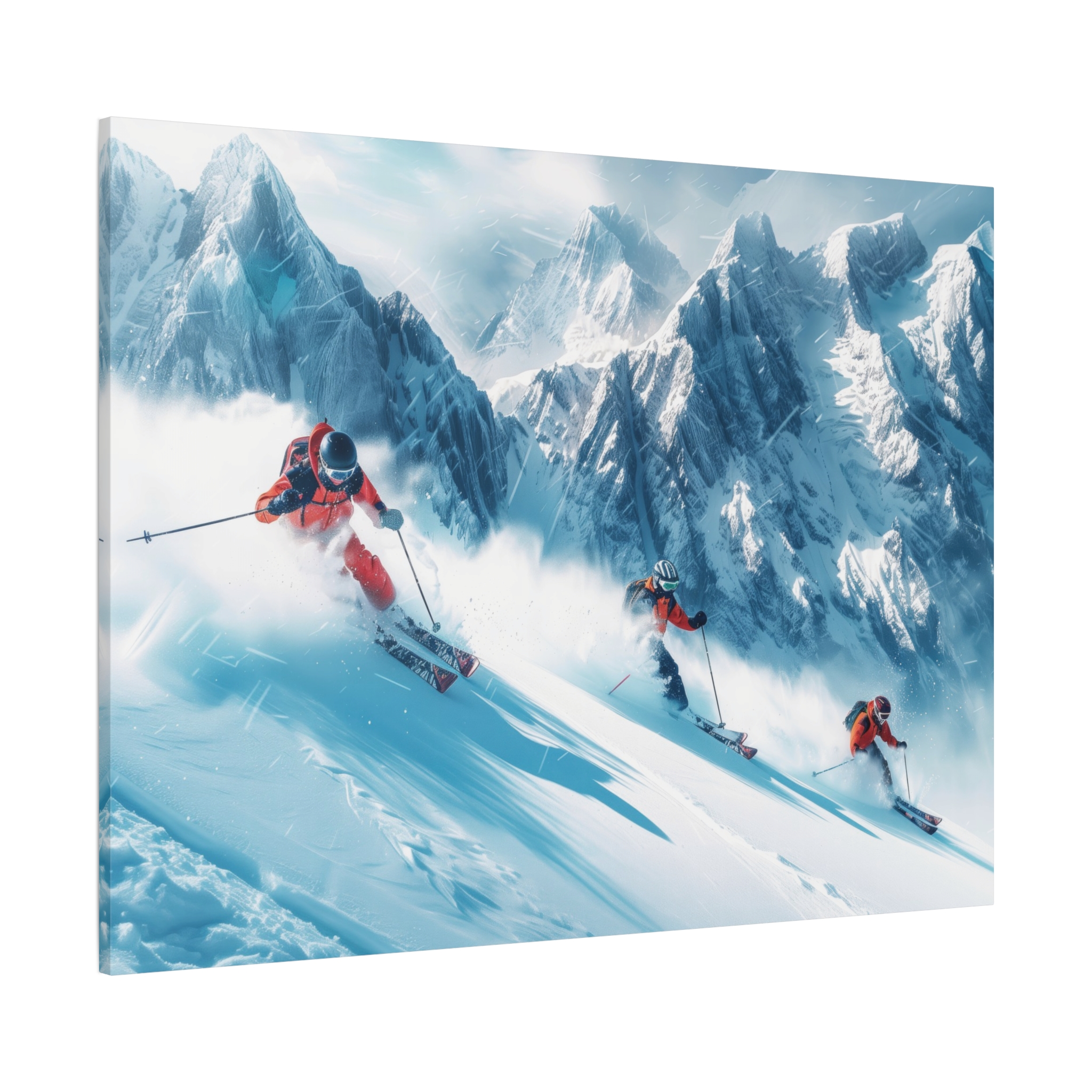 A dynamic action scene of skiers free skiing down the slopes in deep snow, a beutiful action landscape with intensity and excitement. The high-speed motion creates swirling snow clouds around them as they land on a snowy mountain slope. Experience the excitement of skiing with this dynamic action style canvas print. Perfect for adrenaline junkies and winter sports enthusiasts, this canvas brings intensity and motion to any room. Ideal for winter decor, sports enthusiasts, and anyone looking to add a thrilling touch to their space.