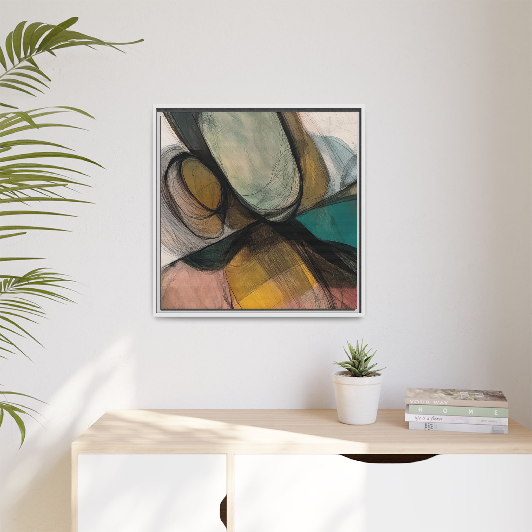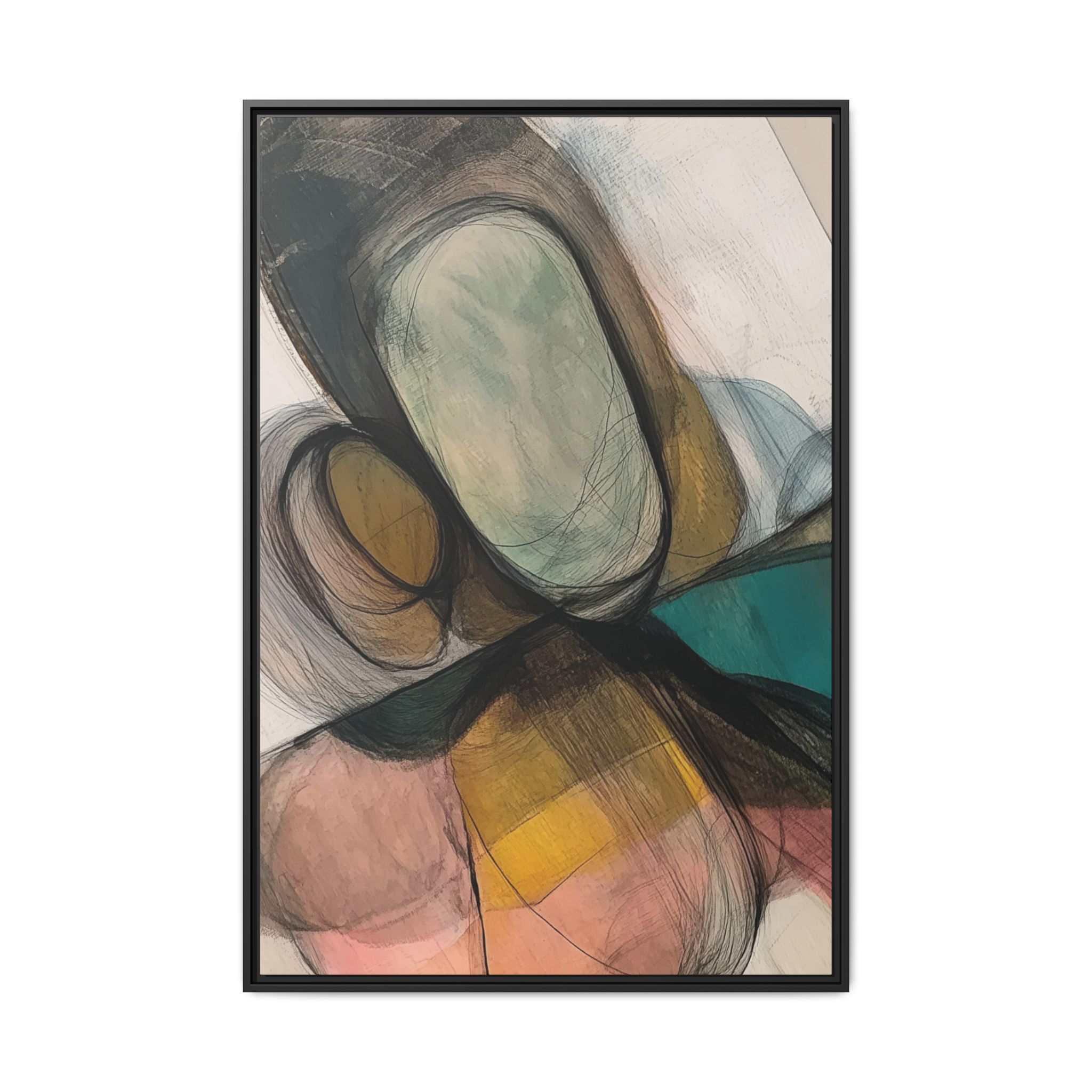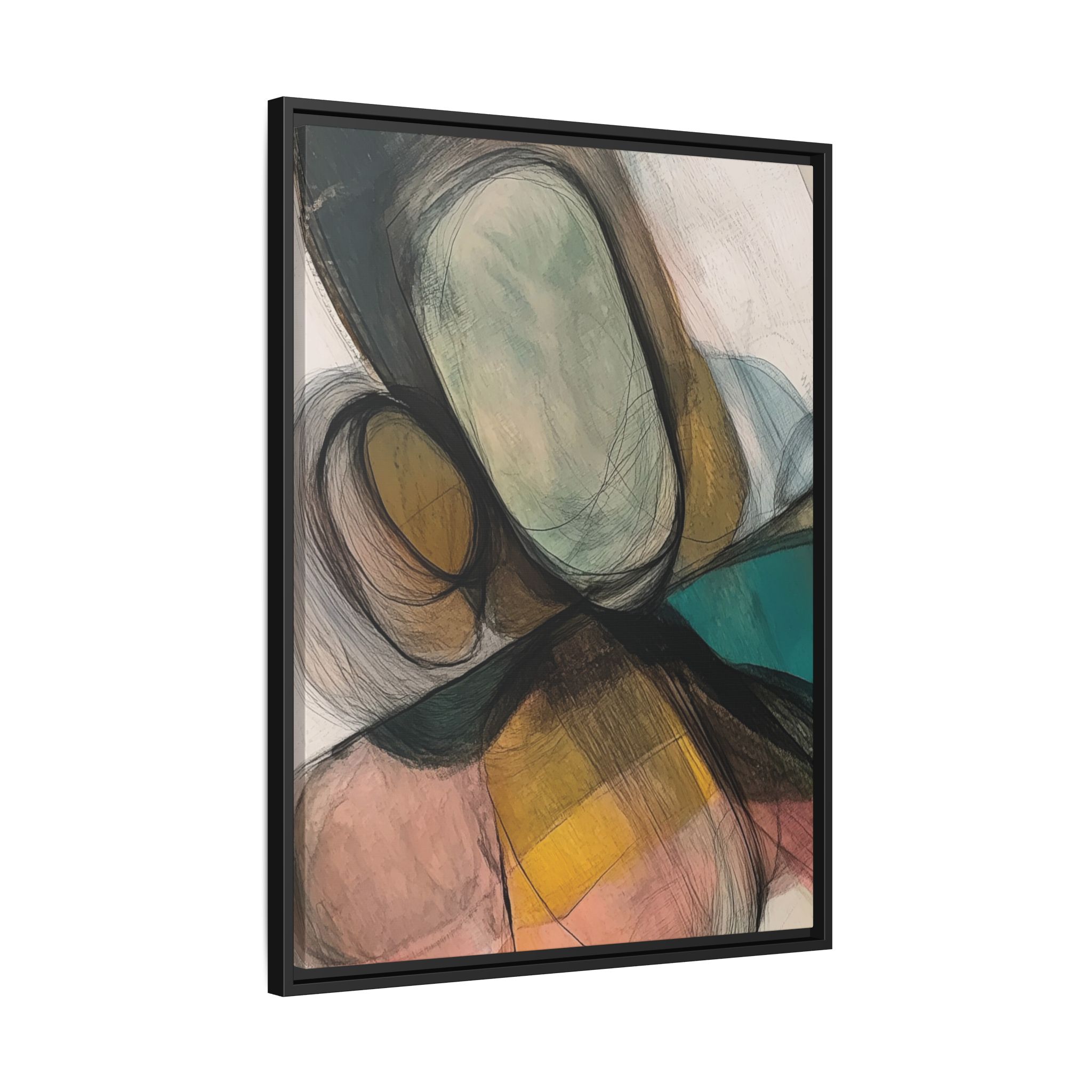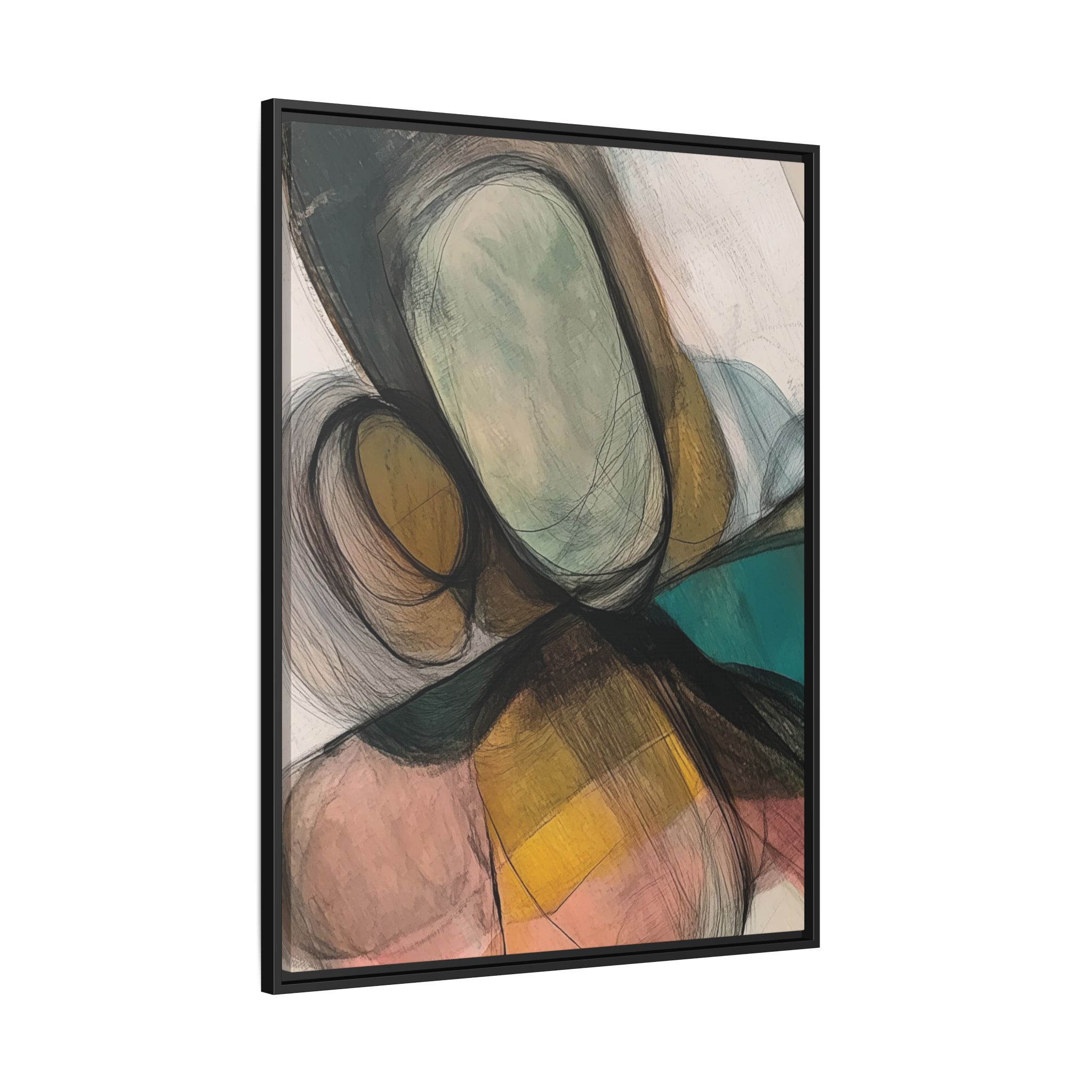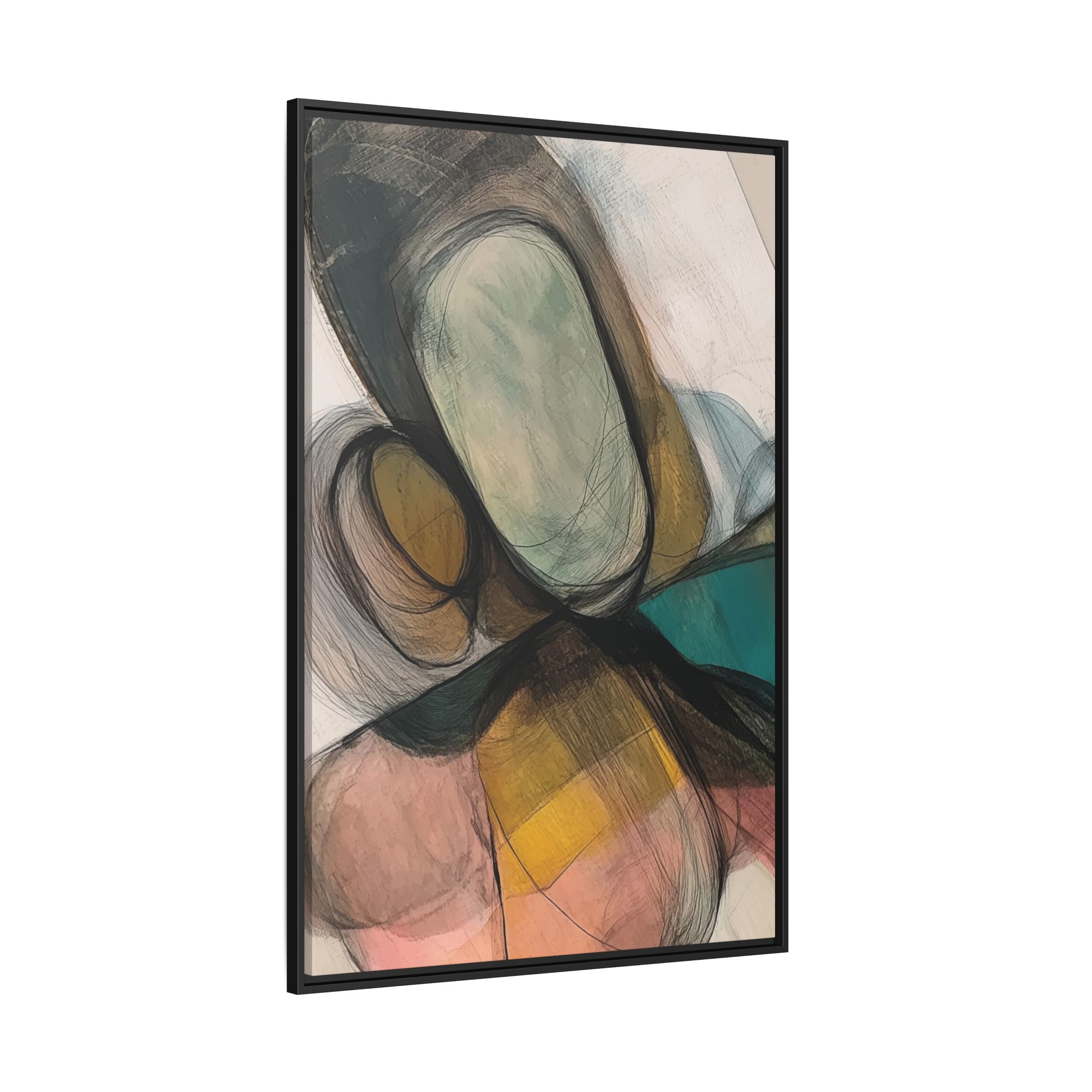 A modern art canvas featuring an abstract composition of shapes and lines, with a soft color palette inspired by nature. This minimalist design with a fresh multilayer feel is perfect for designers looking to add a touch of elegance to their space. The artwork can be rotated and presented in portrait and landscape direction to adapt to your design project. Ideal for home decoration, offices, and as a unique home design gifts.
