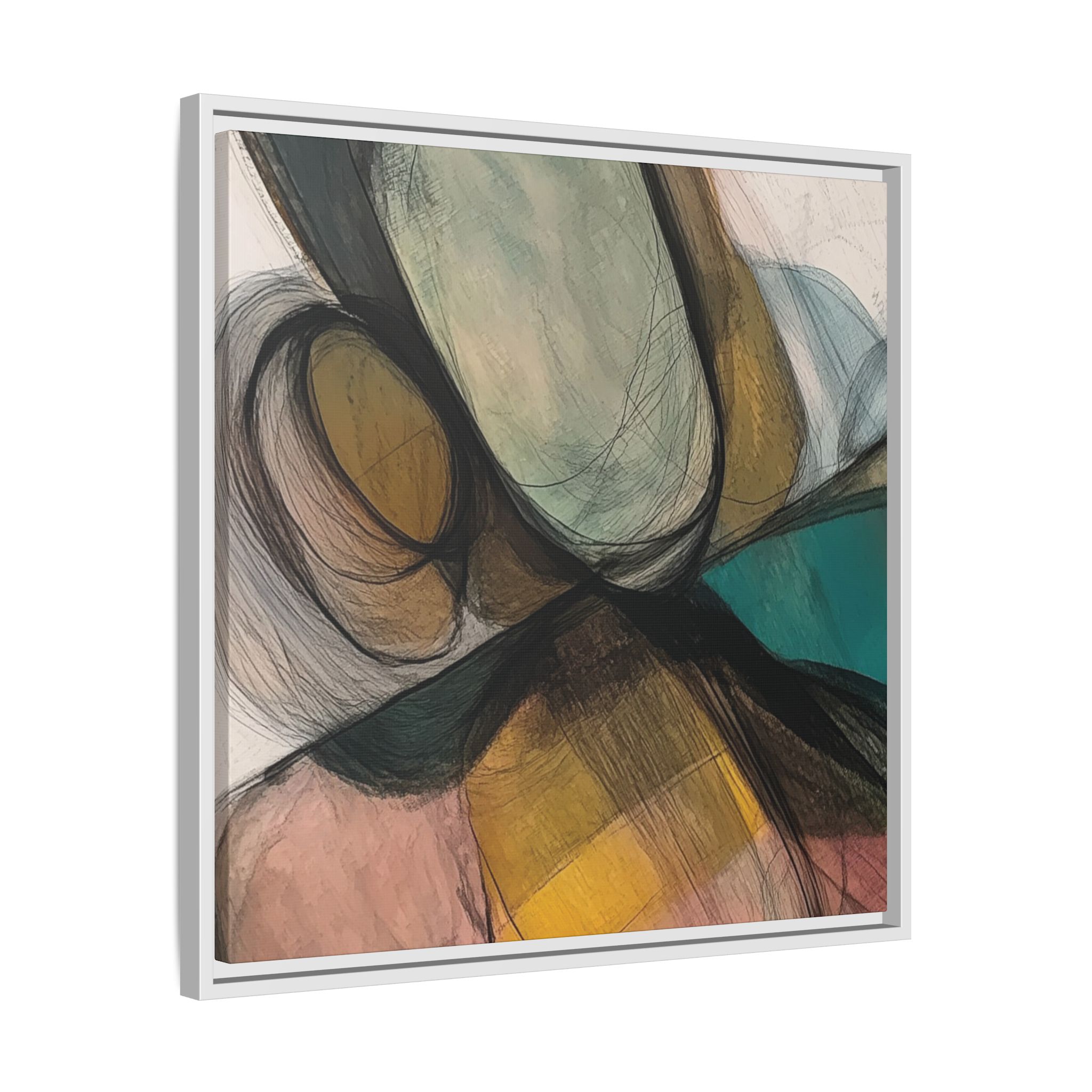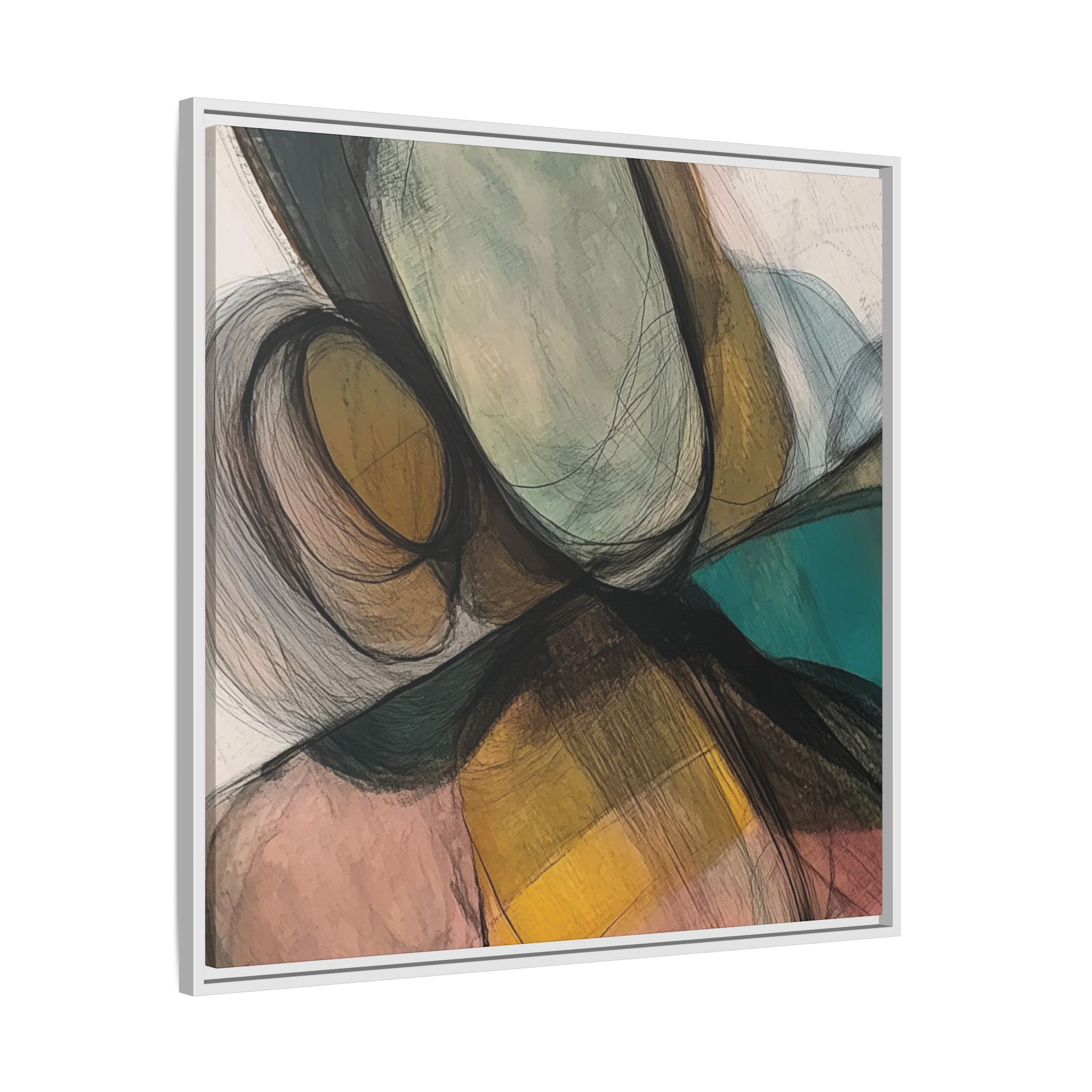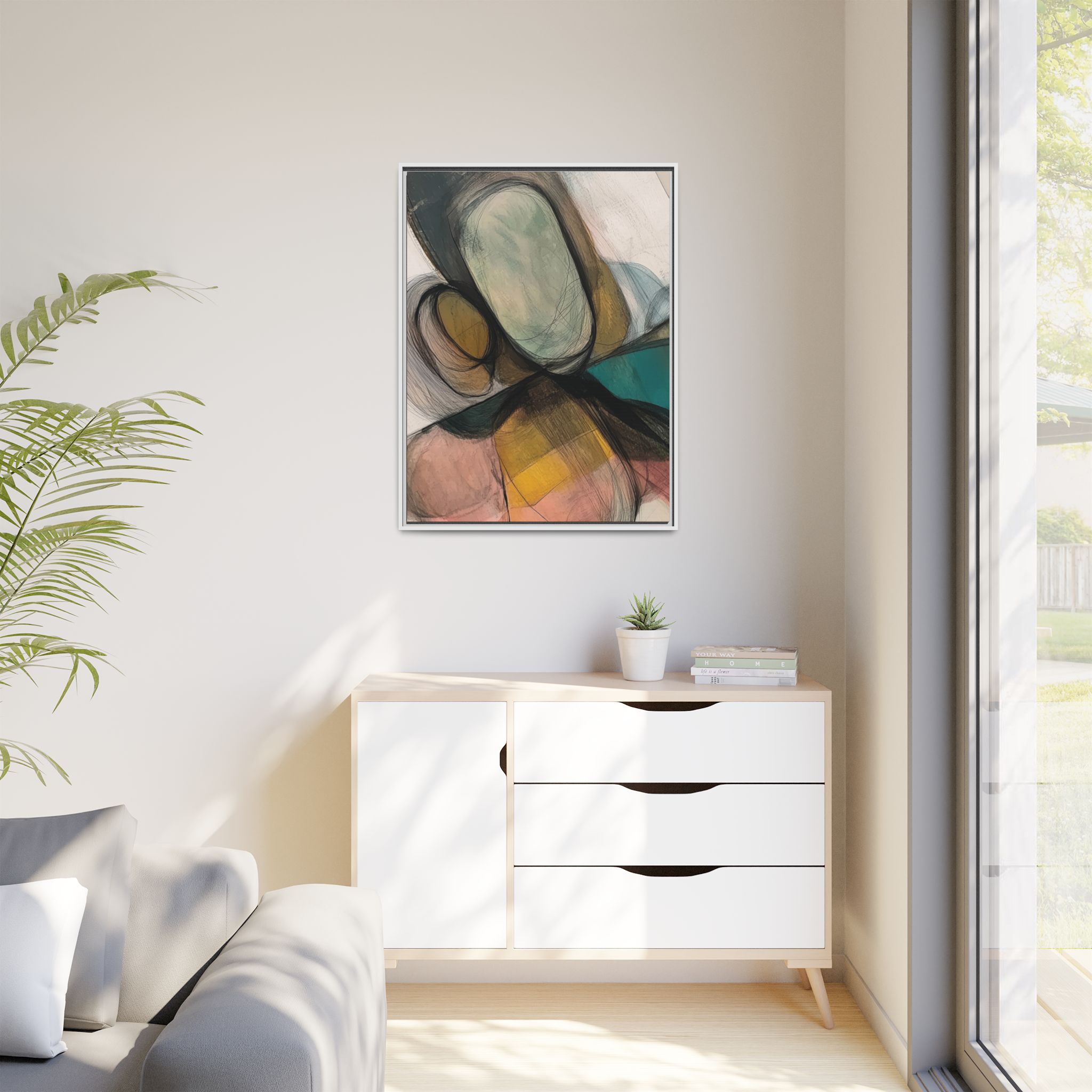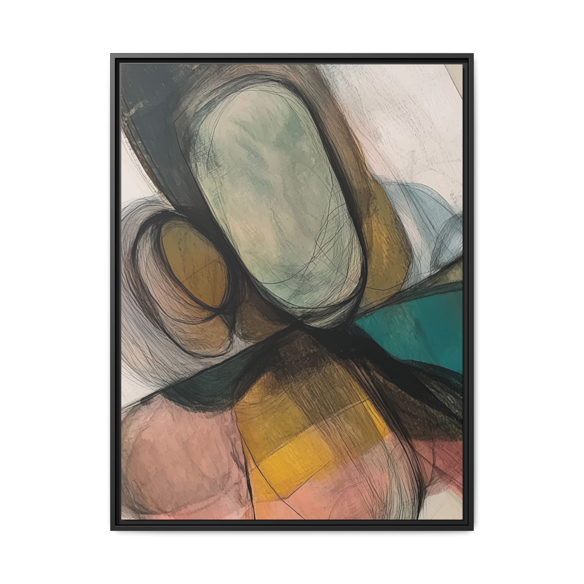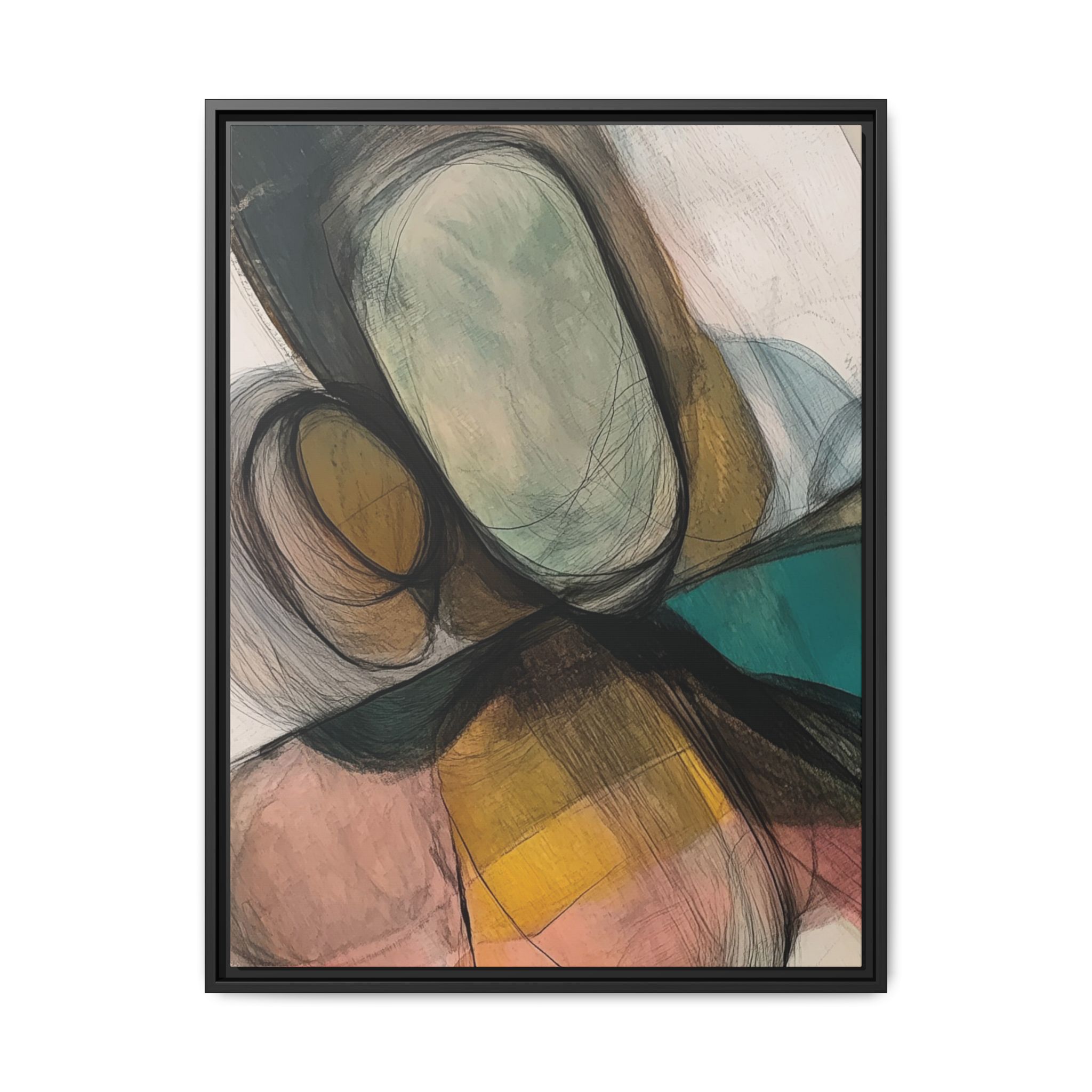 A modern art canvas featuring an abstract composition of shapes and lines, with a soft color palette inspired by nature. This minimalist design with a fresh multilayer feel is perfect for designers looking to add a touch of elegance to their space. The artwork can be rotated and presented in portrait and landscape direction to adapt to your design project. Ideal for home decoration, offices, and as a unique home design gifts.