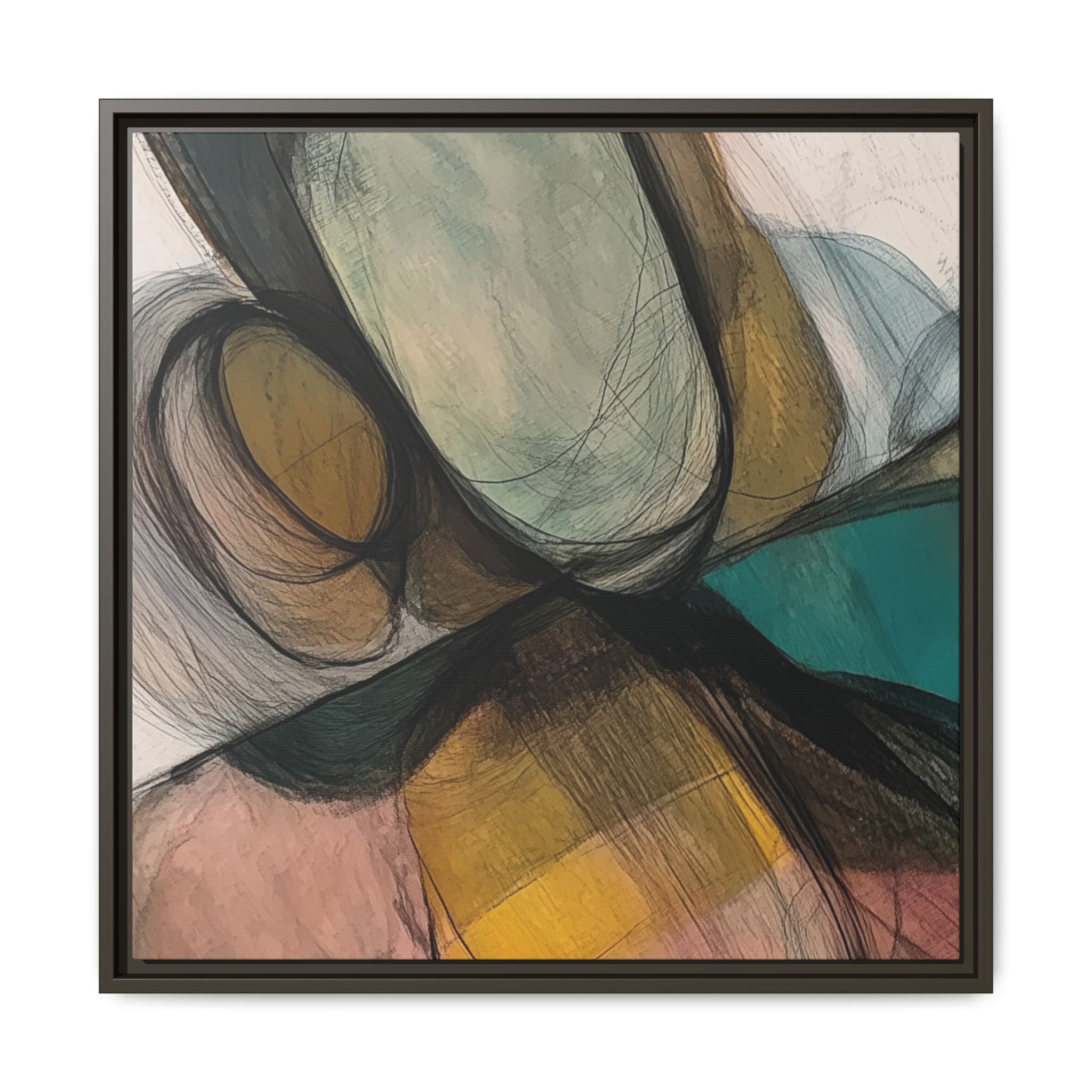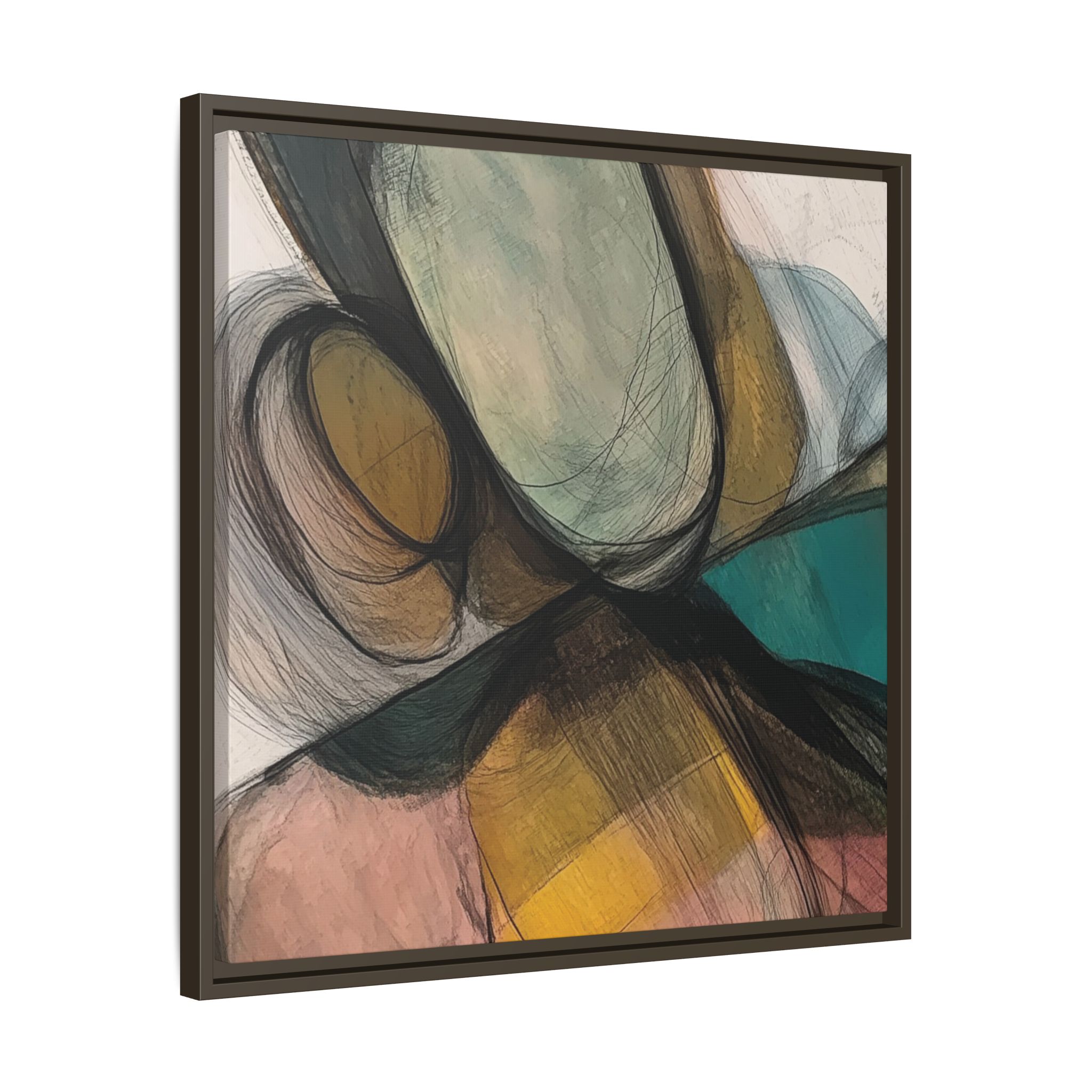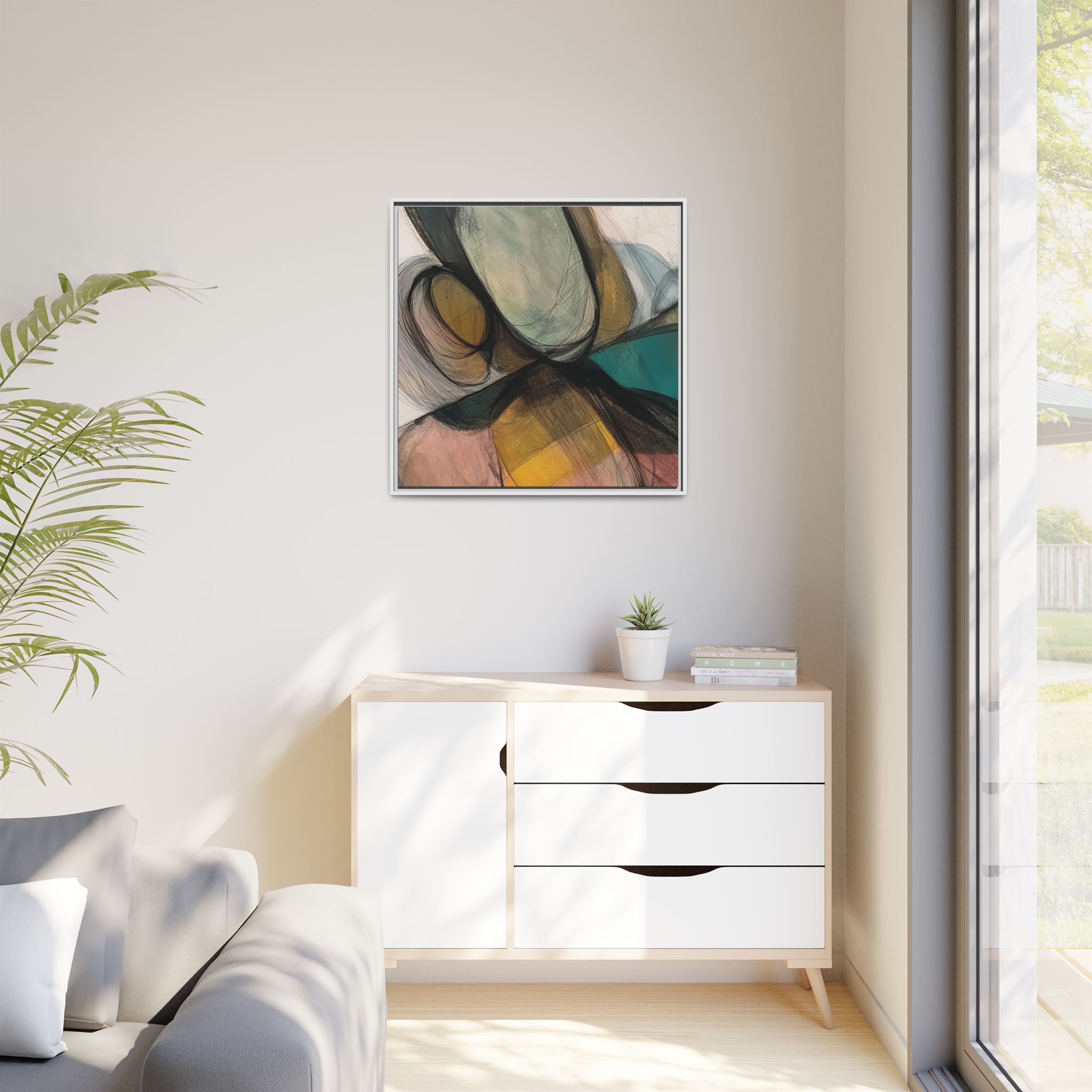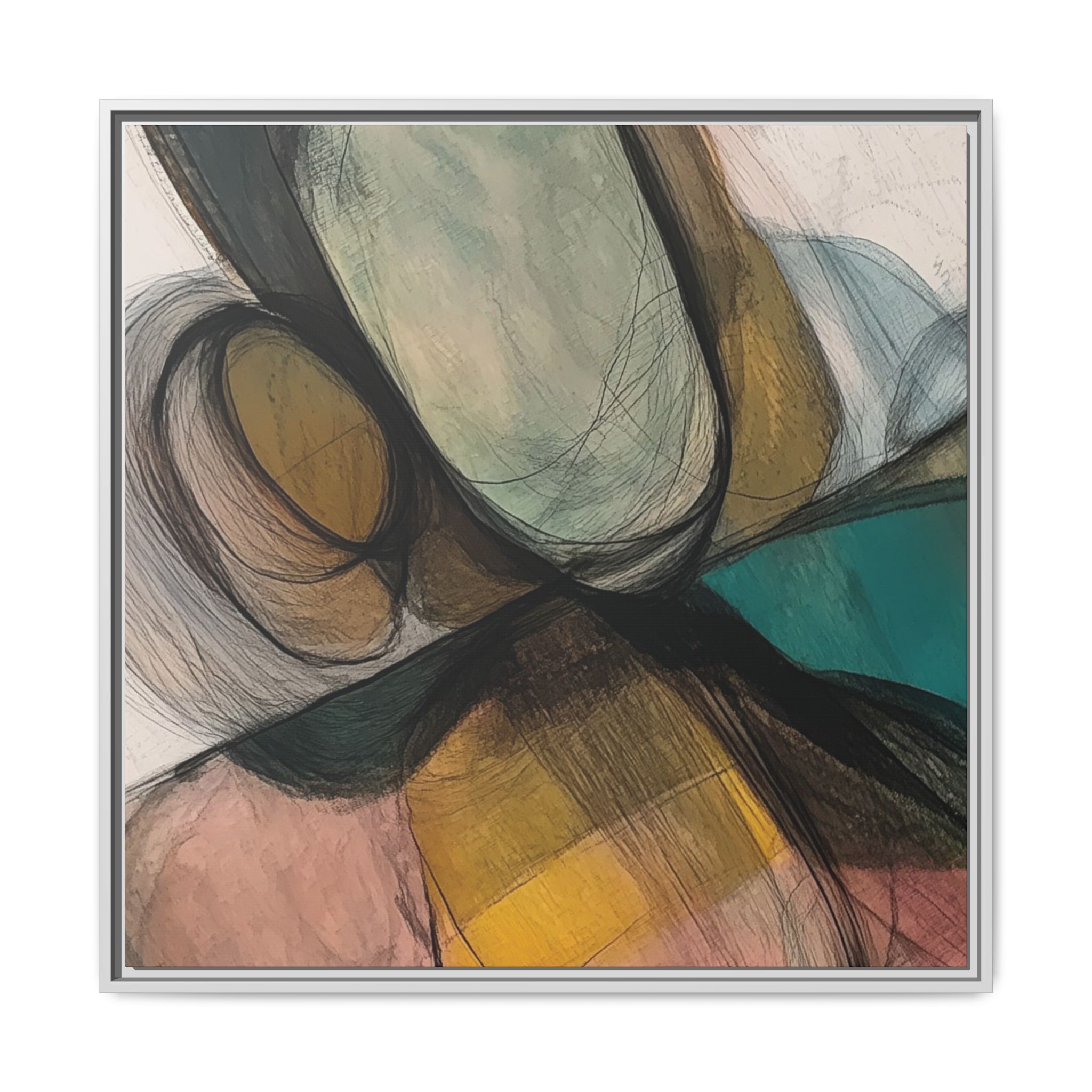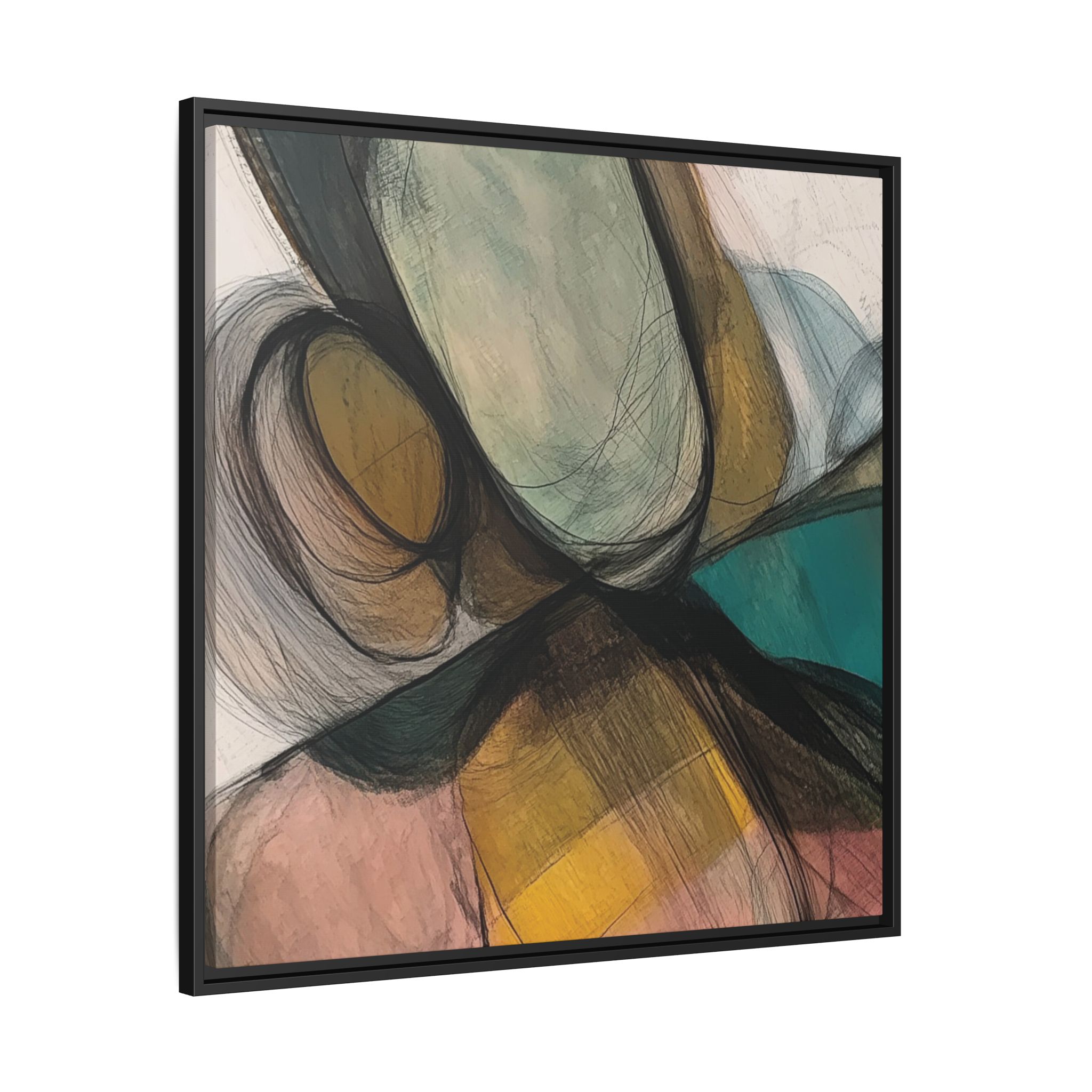 A modern art canvas featuring an abstract composition of shapes and lines, with a soft color palette inspired by nature. This minimalist design with a fresh multilayer feel is perfect for designers looking to add a touch of elegance to their space. The artwork can be rotated and presented in portrait and landscape direction to adapt to your design project. Ideal for home decoration, offices, and as a unique home design gifts.