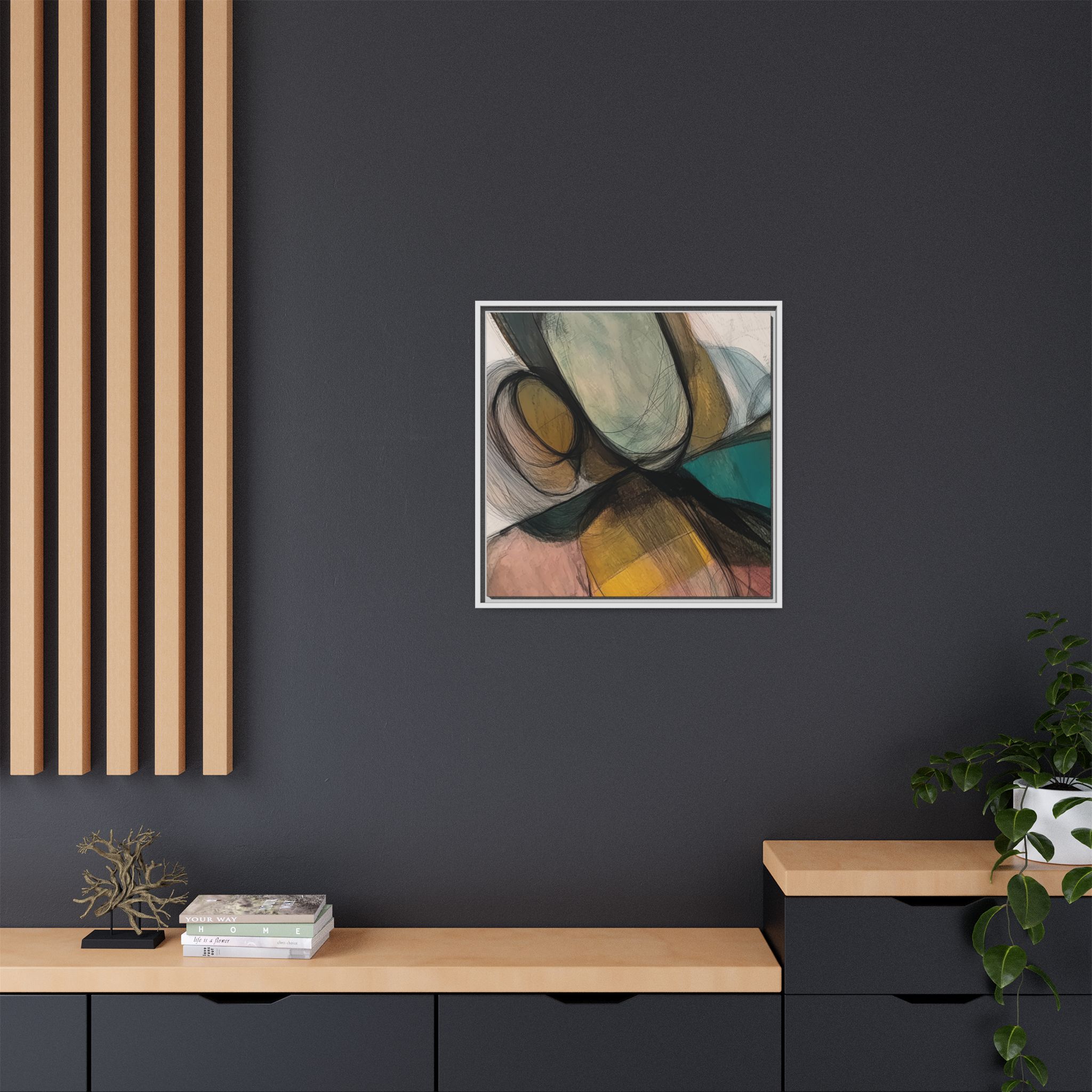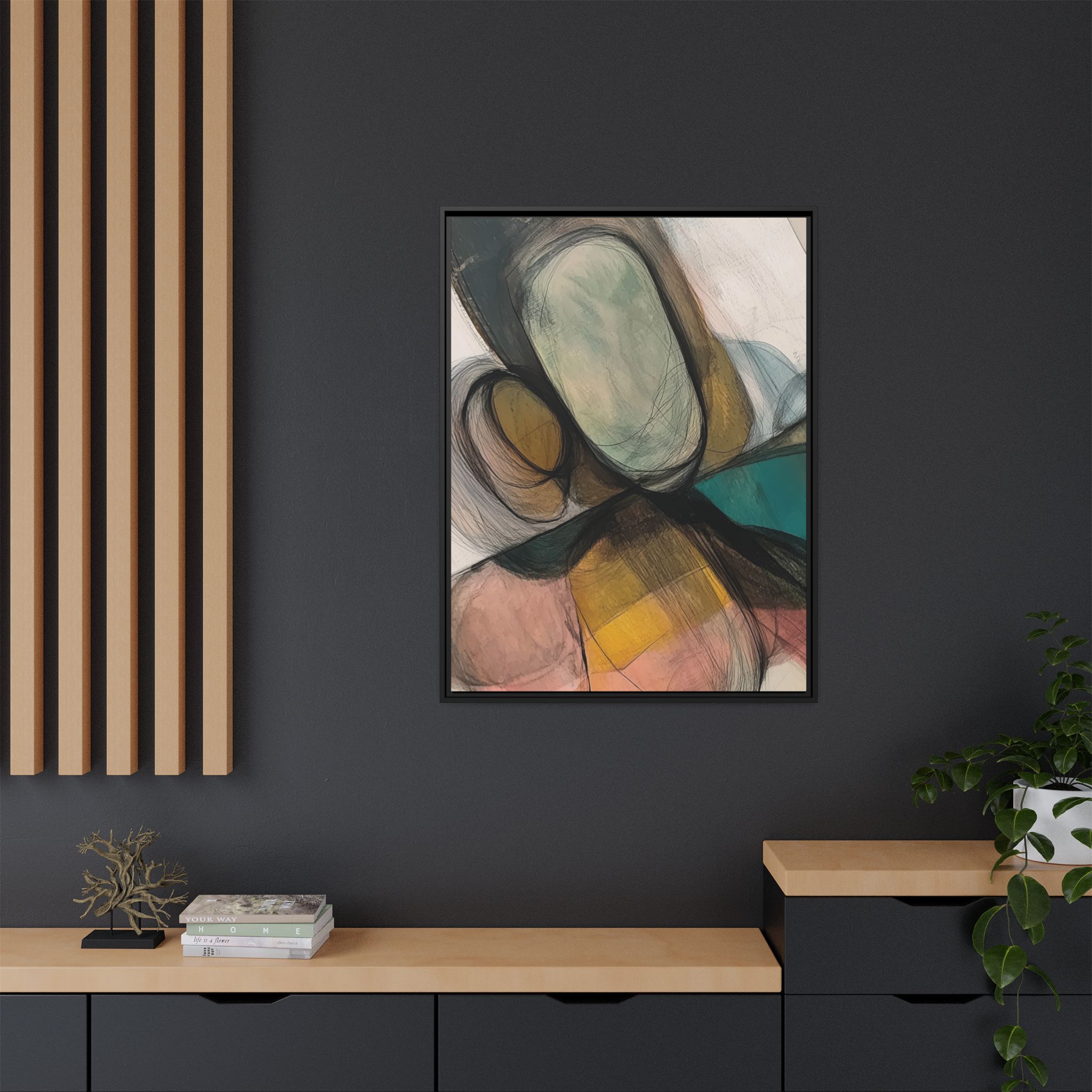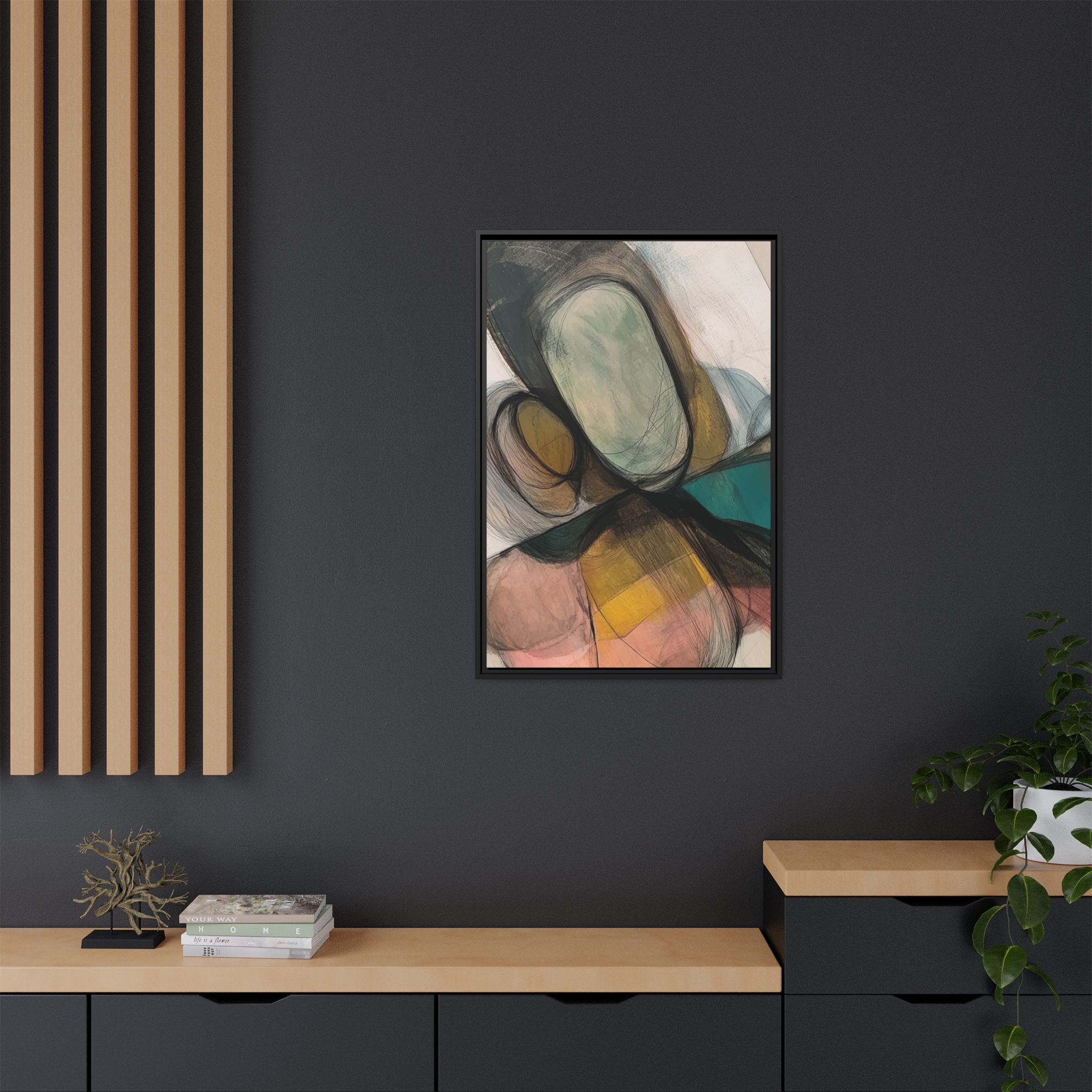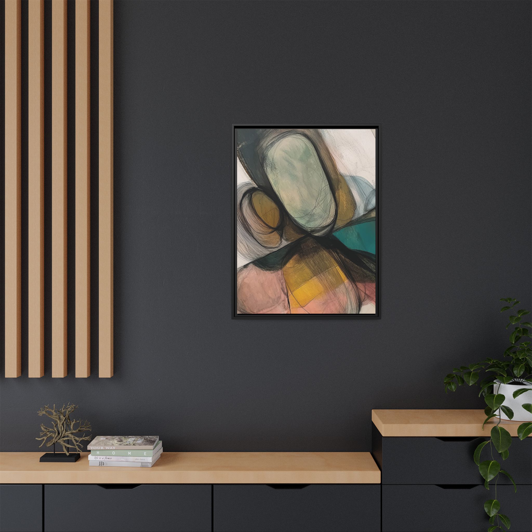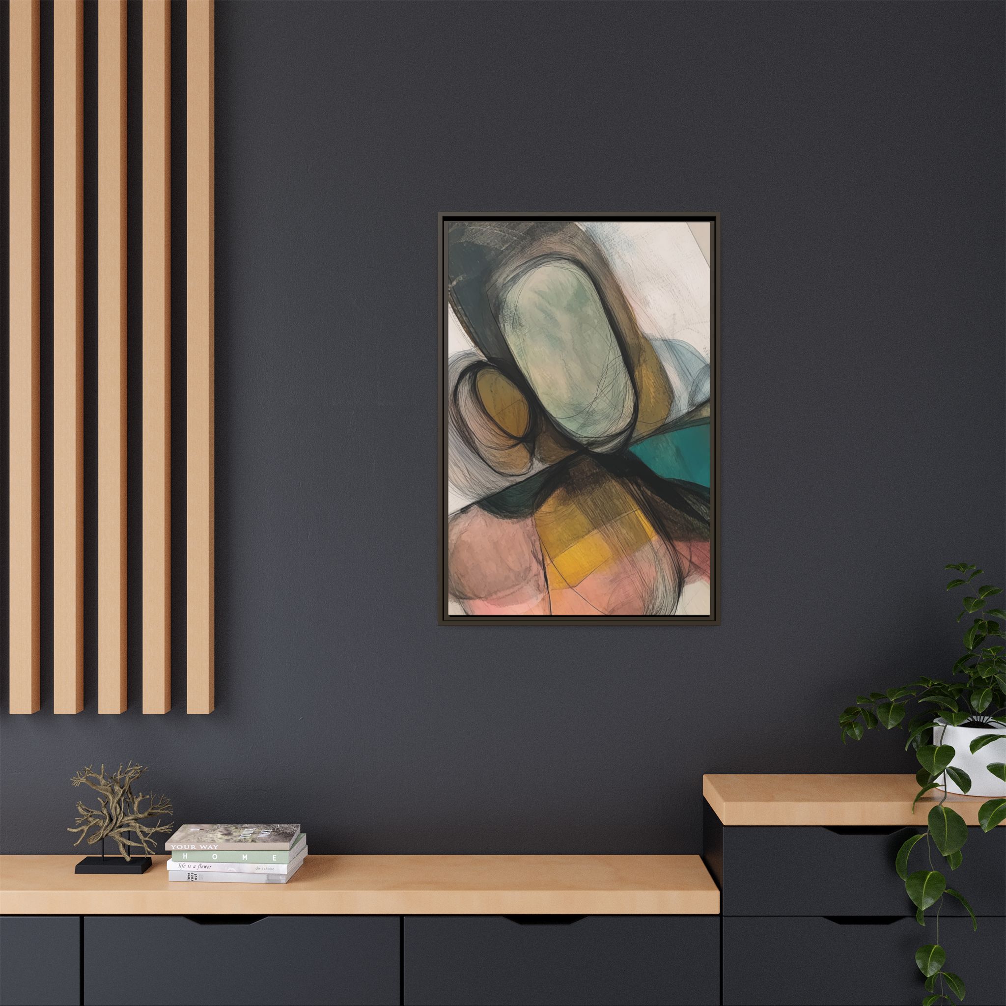Custom digitally printed artwork on a quality canvas. .Every print in a black pinewood frame will look sleek and beautiful in any interior. The artwork will be printed on the cotton-polyester canvas with a special proprietary coating to make sure it stays vibrant for ages. Environmentally-conscious – it’s made from sustainably sourced materials (Forest Stewardship Council certified) and custom printed on demand no warehouse stocks and no waste. Choose between the designer specified sizes. The sawtooth hanging hardware is already attached.