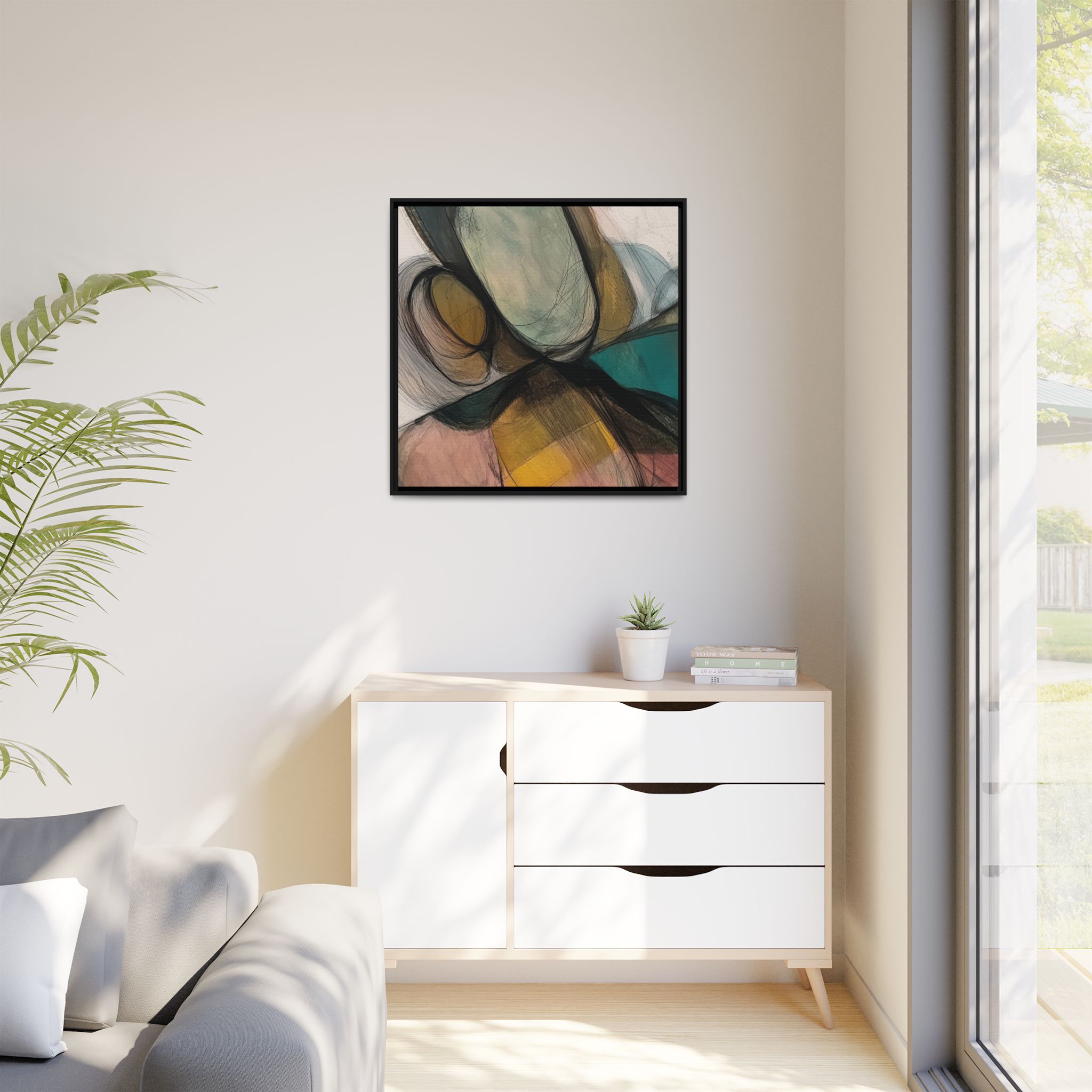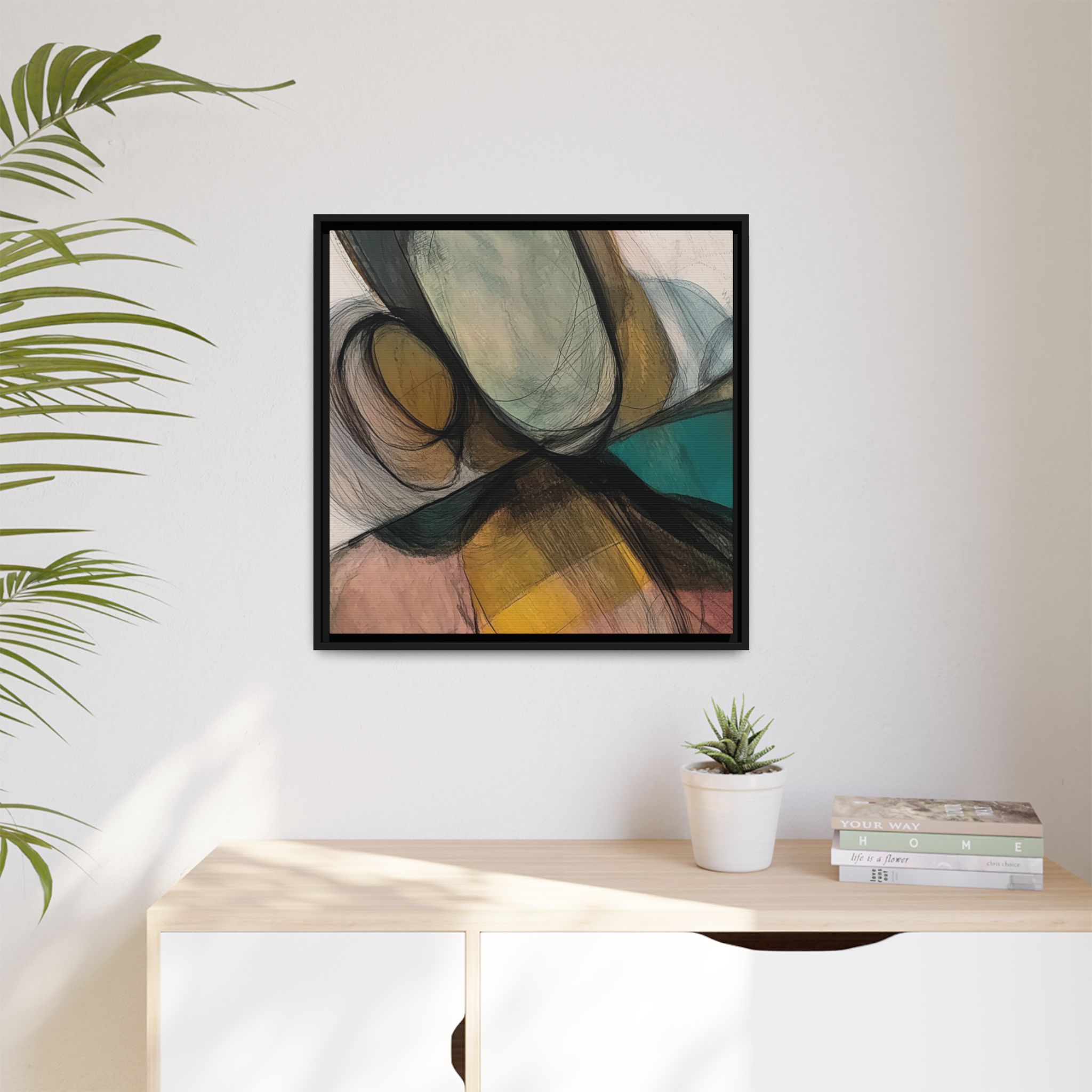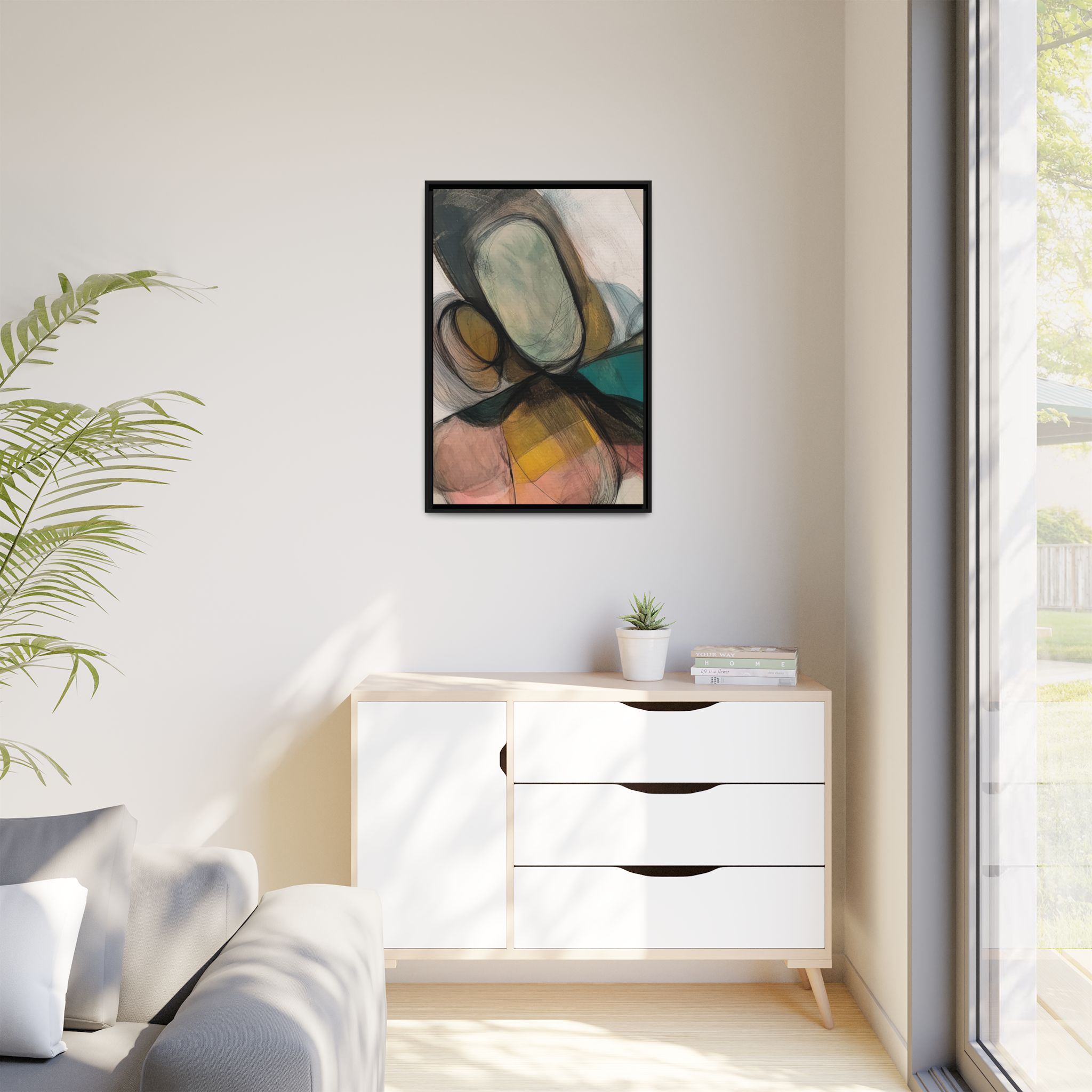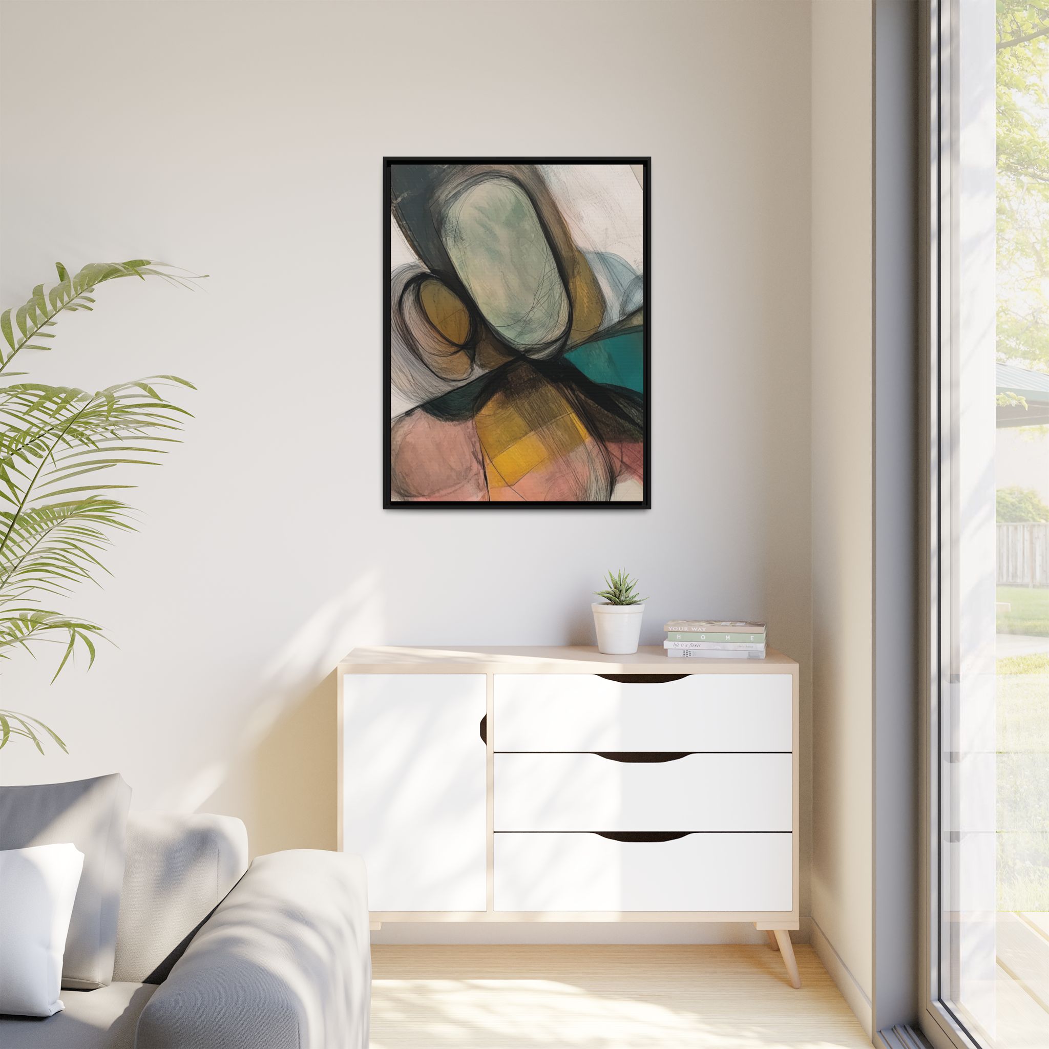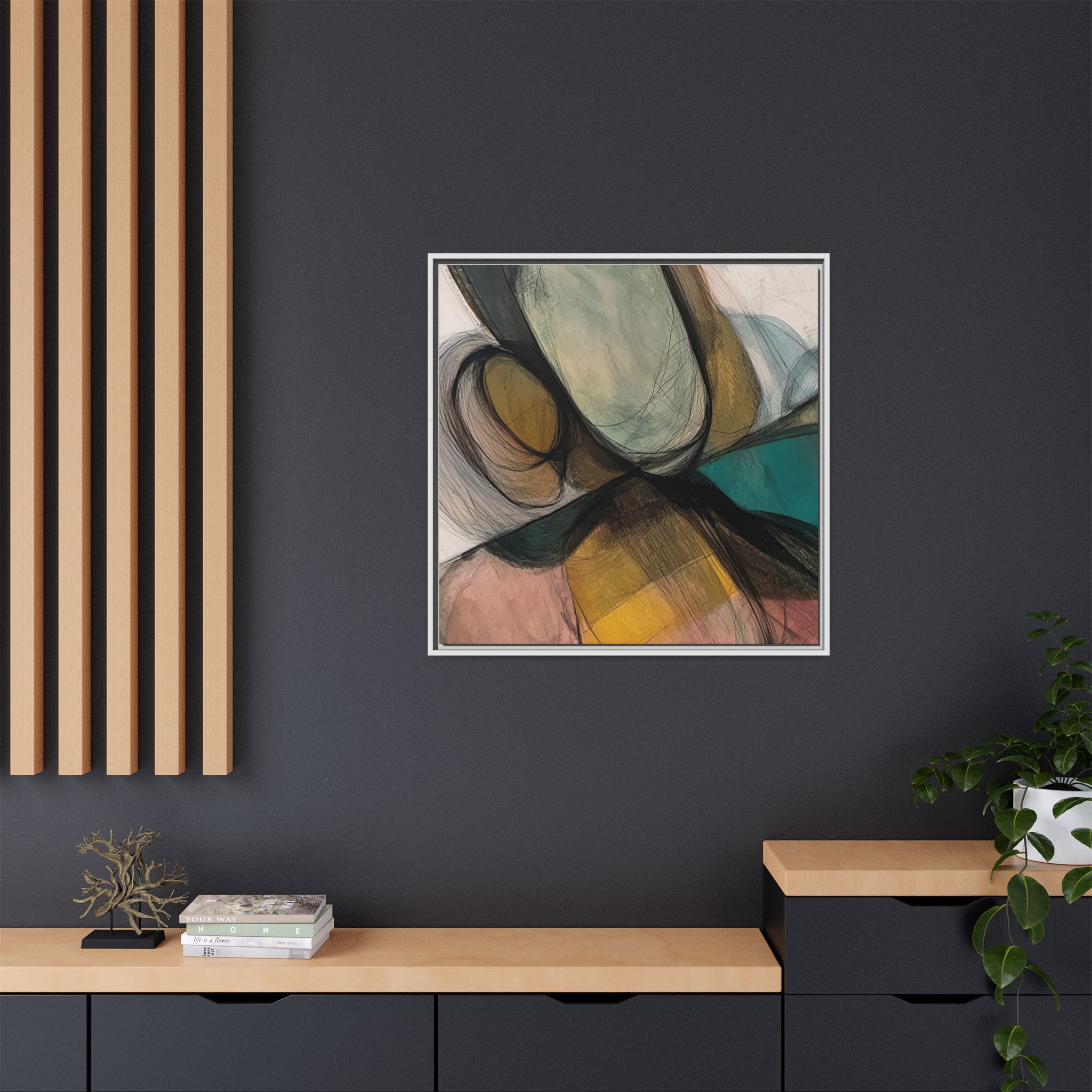 Custom digitally printed artwork on a quality canvas. .Every print in a black pinewood frame will look sleek and beautiful in any interior. The artwork will be printed on the cotton-polyester canvas with a special proprietary coating to make sure it stays vibrant for ages. Environmentally-conscious – it’s made from sustainably sourced materials (Forest Stewardship Council certified) and custom printed on demand no warehouse stocks and no waste. Choose between the designer specified sizes. The sawtooth hanging hardware is already attached.