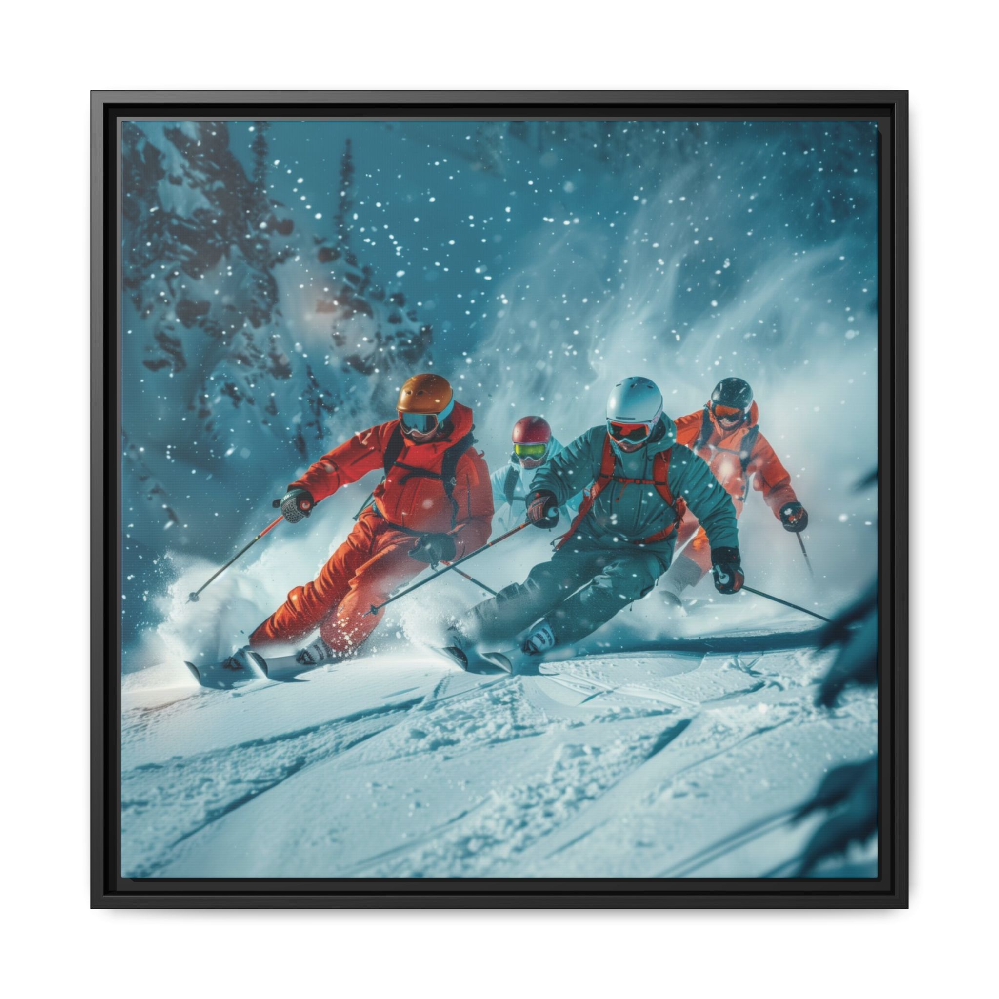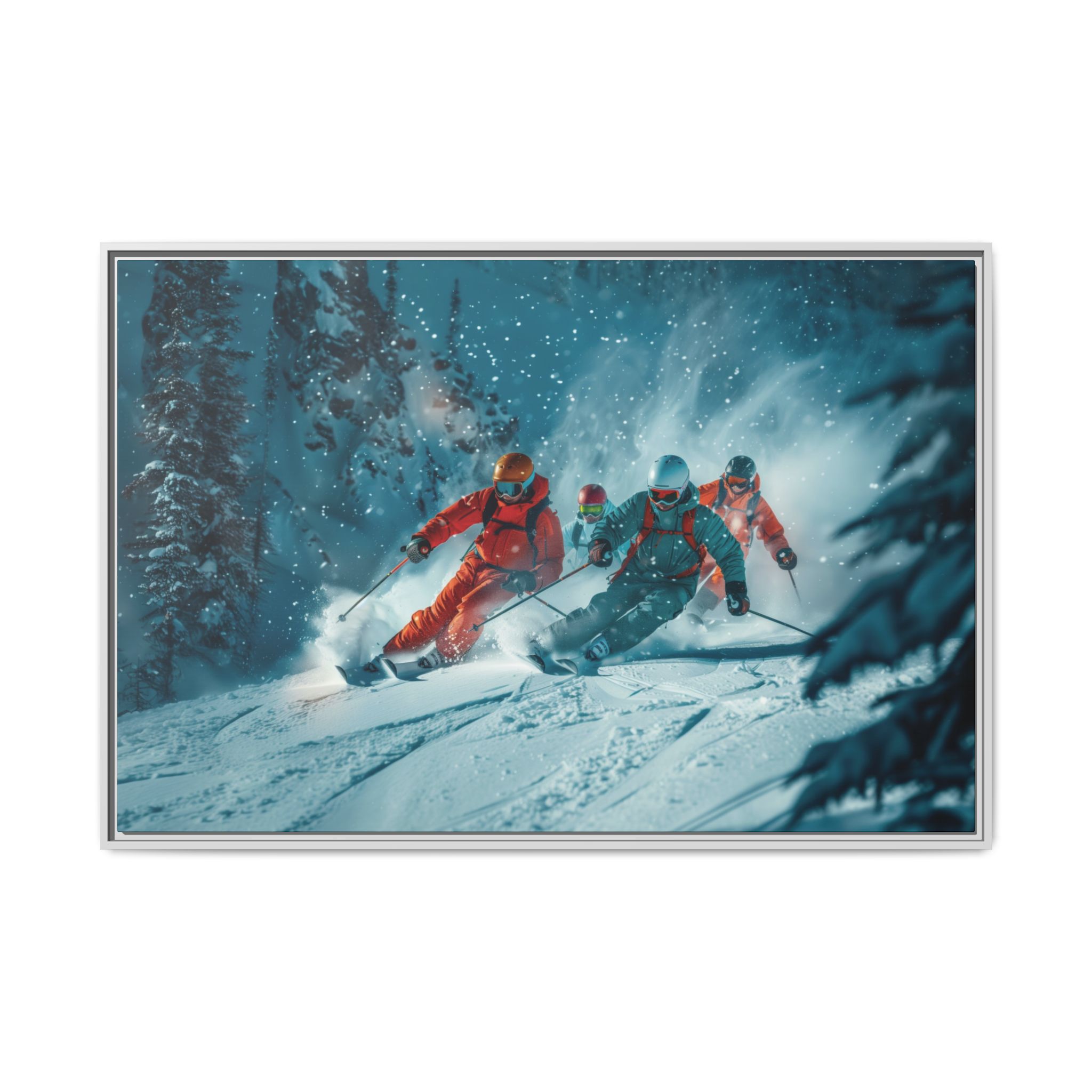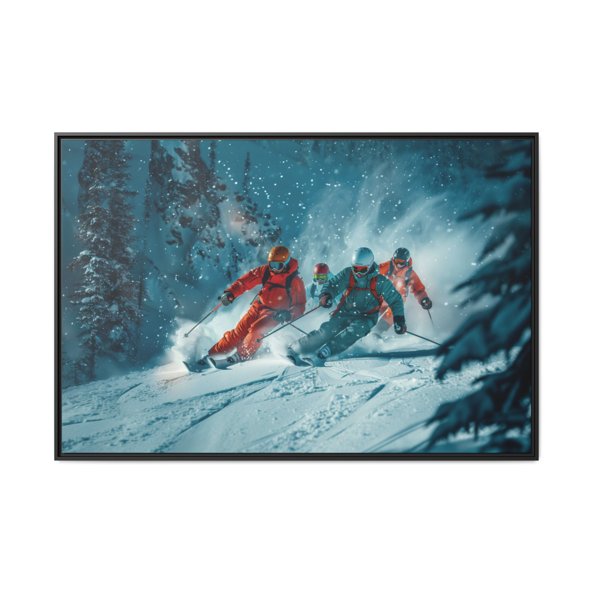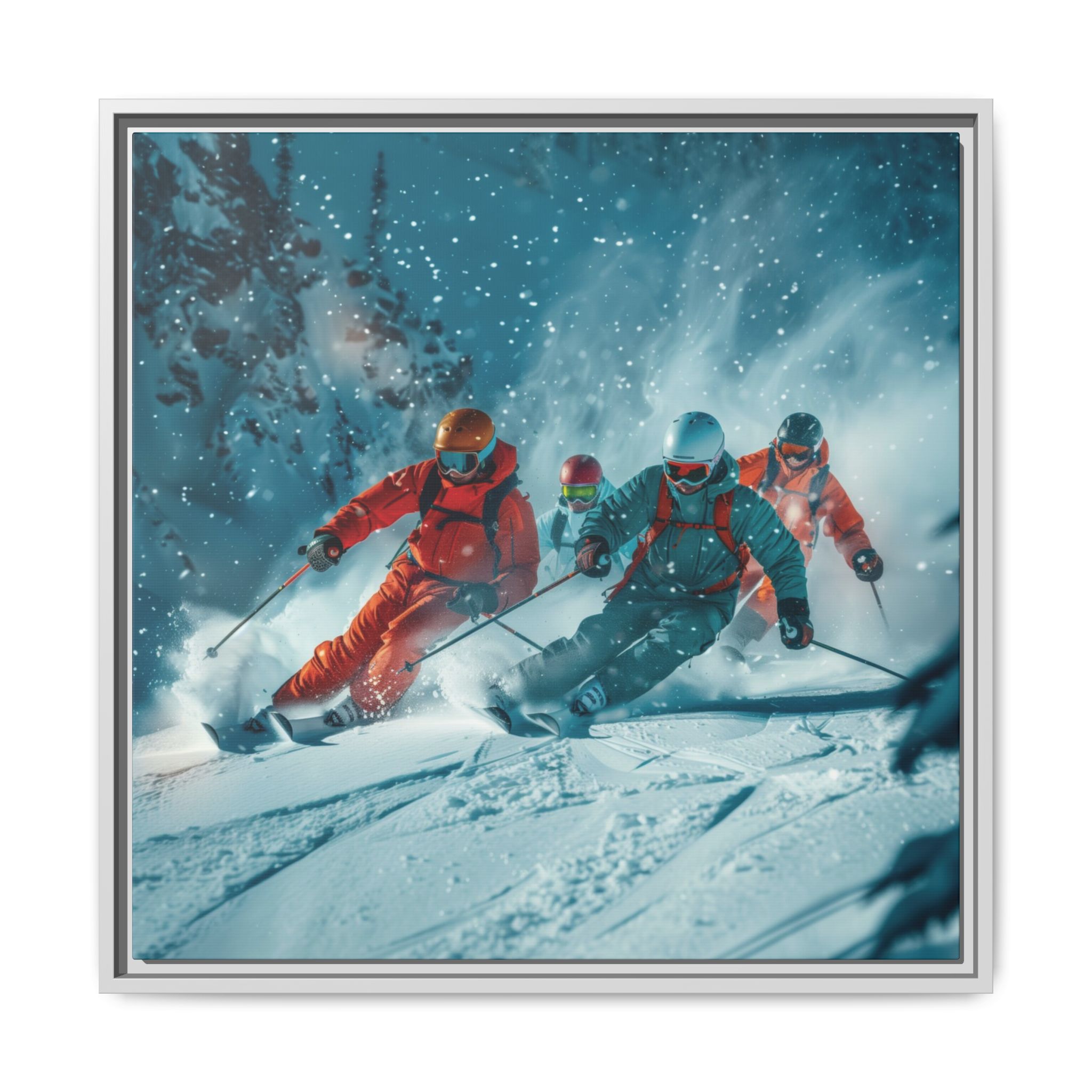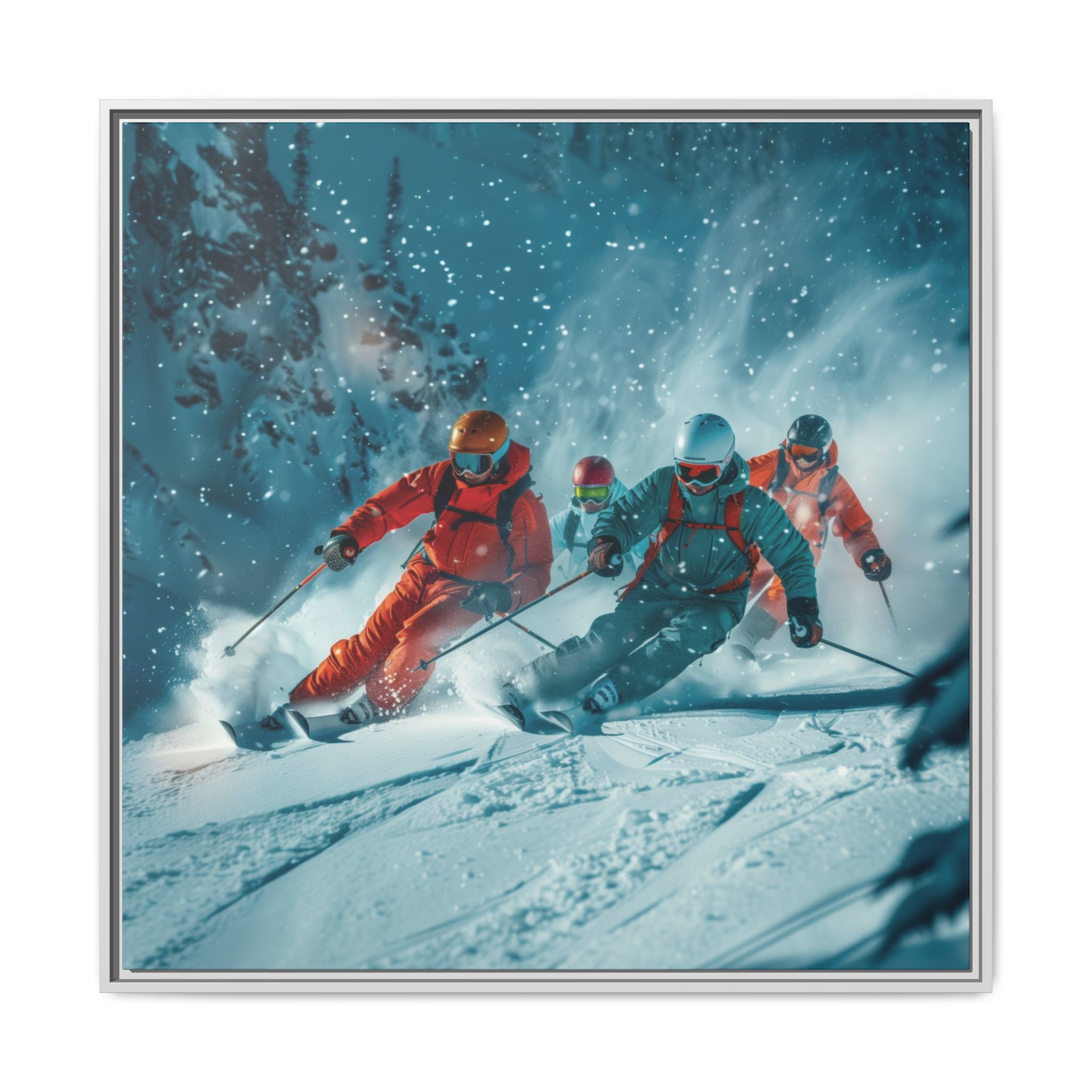 A dynamic action scene of skiers free skiing down the slopes in deep snow, a beutiful action landscape with intensity and excitement. The high-speed motion creates swirling snow clouds around them as they land on a snowy mountain slope. Experience the excitement of skiing with this dynamic action style canvas print. Perfect for adrenaline junkies and winter sports enthusiasts, this canvas brings intensity and motion to any room. Ideal for winter decor, sports enthusiasts, and anyone looking to add a thrilling touch to their space.