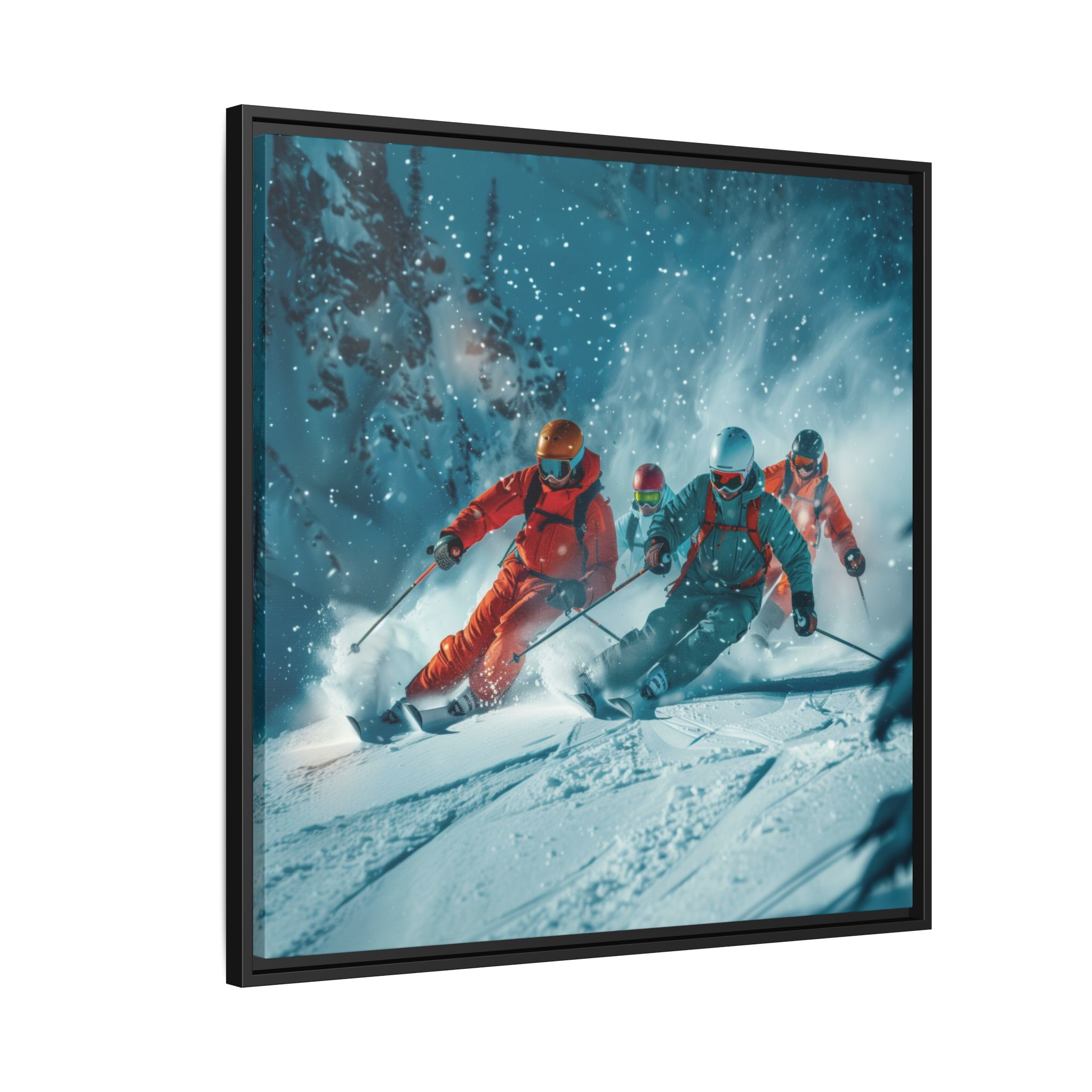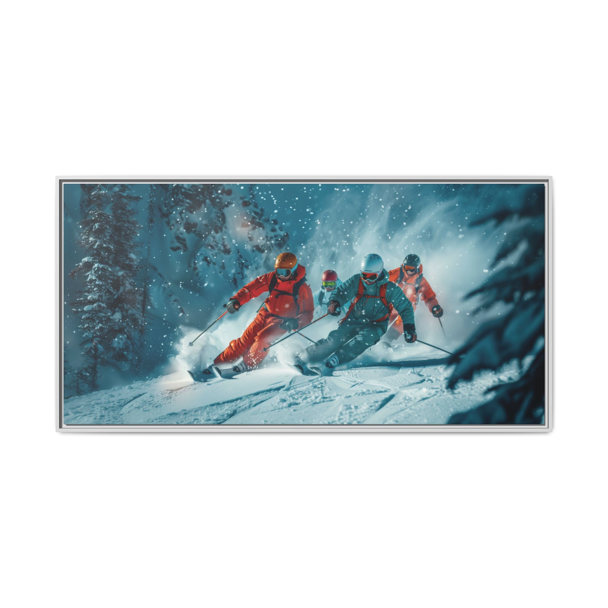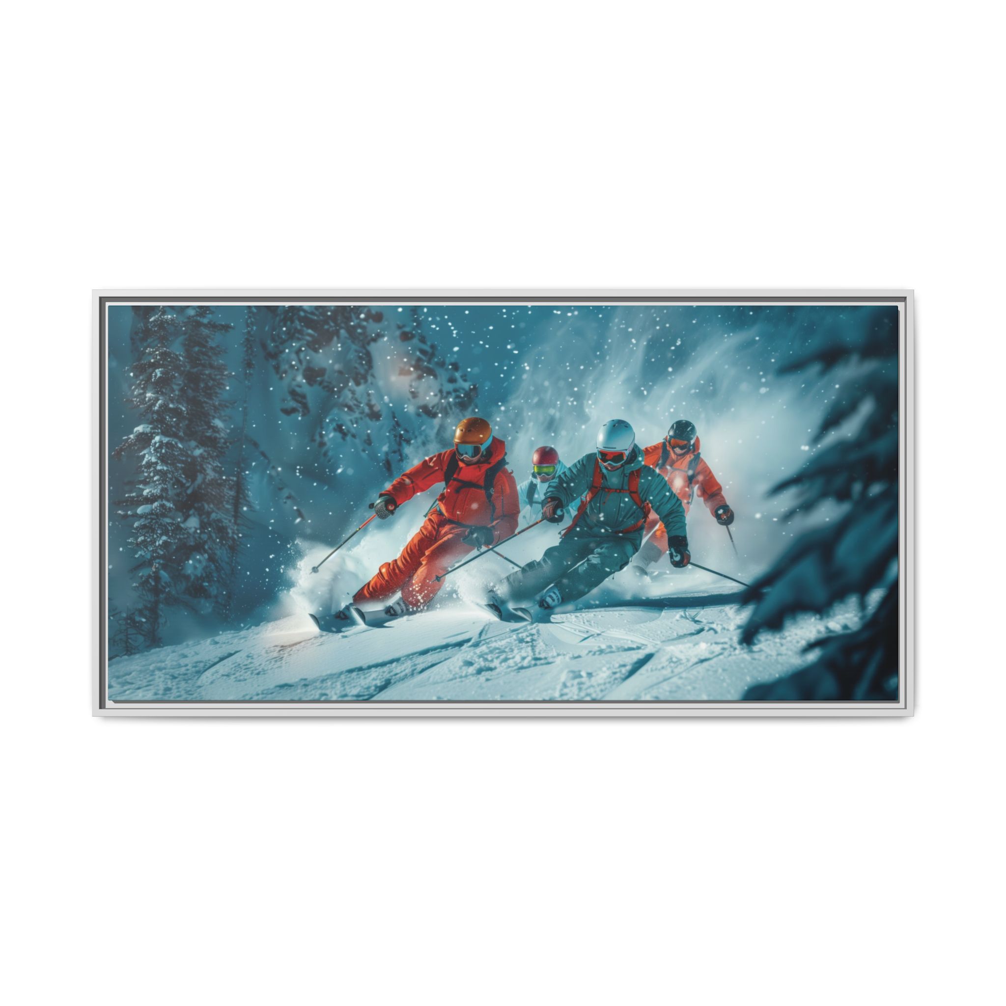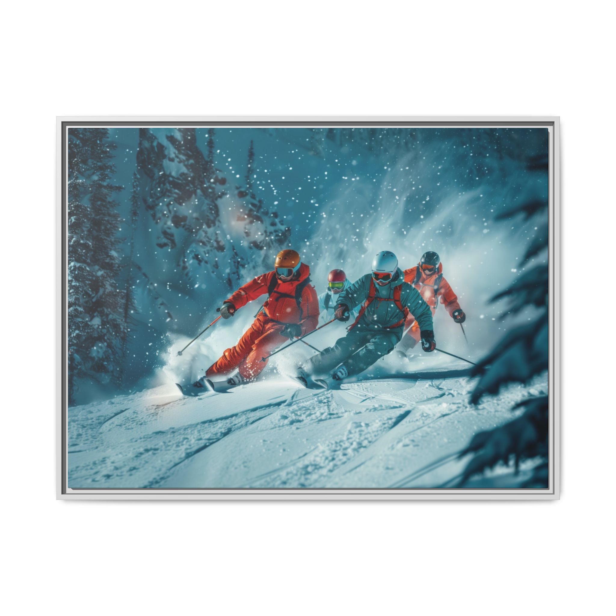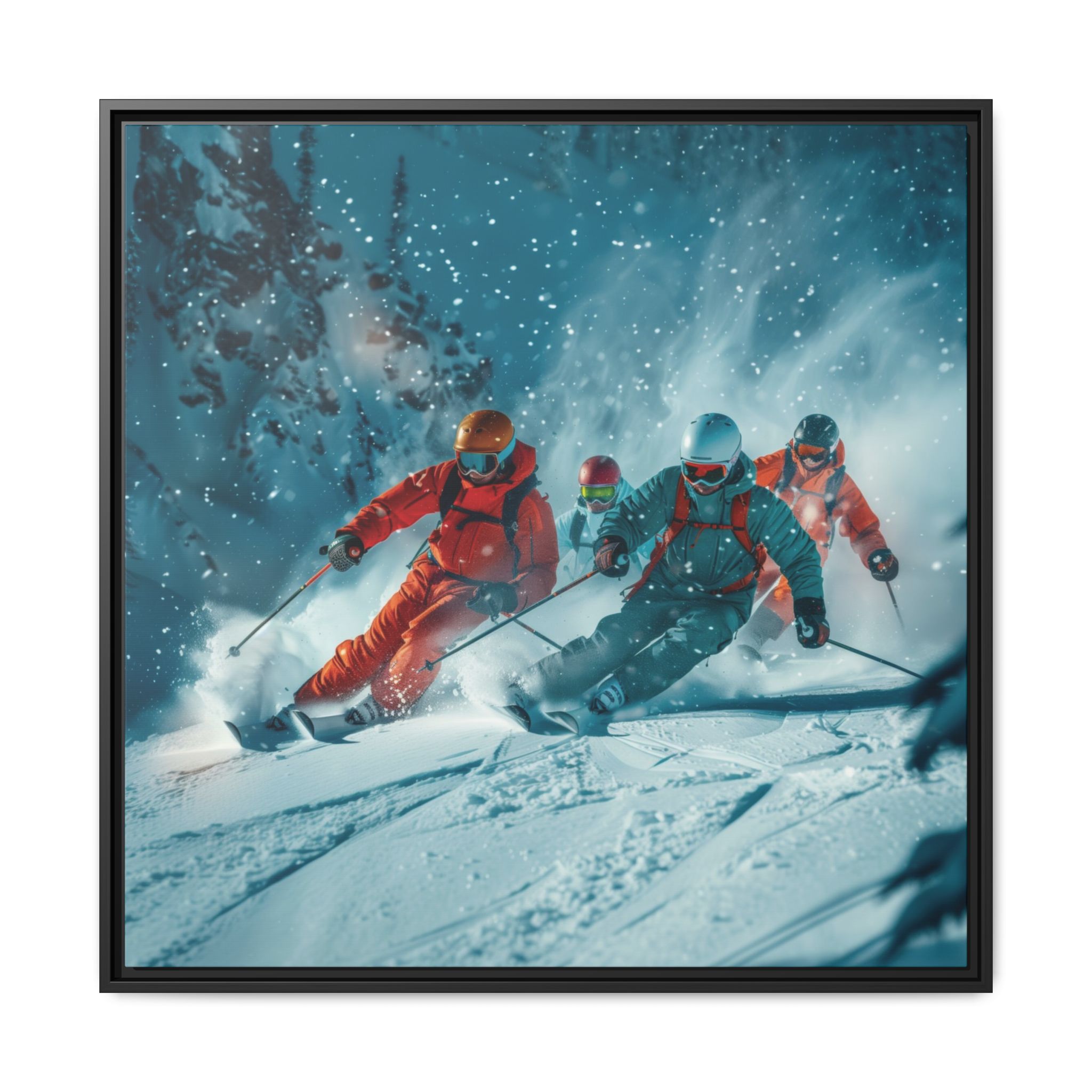 A dynamic action scene of skiers free skiing down the slopes in deep snow, a beutiful action landscape with intensity and excitement. The high-speed motion creates swirling snow clouds around them as they land on a snowy mountain slope. Experience the excitement of skiing with this dynamic action style canvas print. Perfect for adrenaline junkies and winter sports enthusiasts, this canvas brings intensity and motion to any room. Ideal for winter decor, sports enthusiasts, and anyone looking to add a thrilling touch to their space.