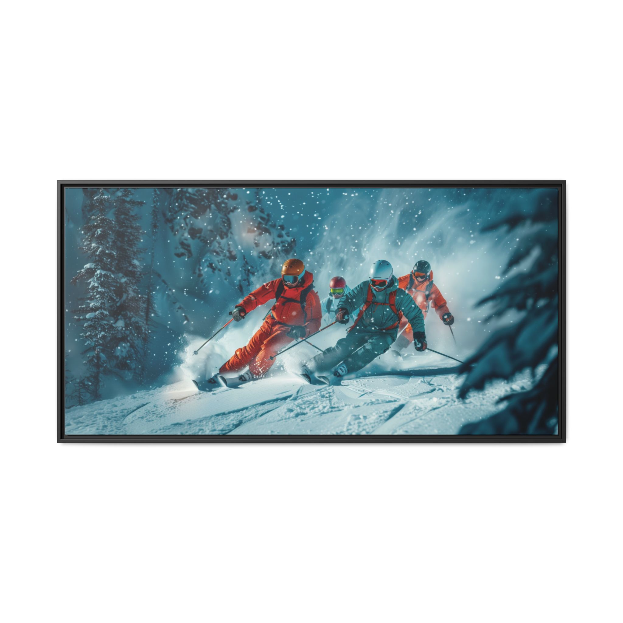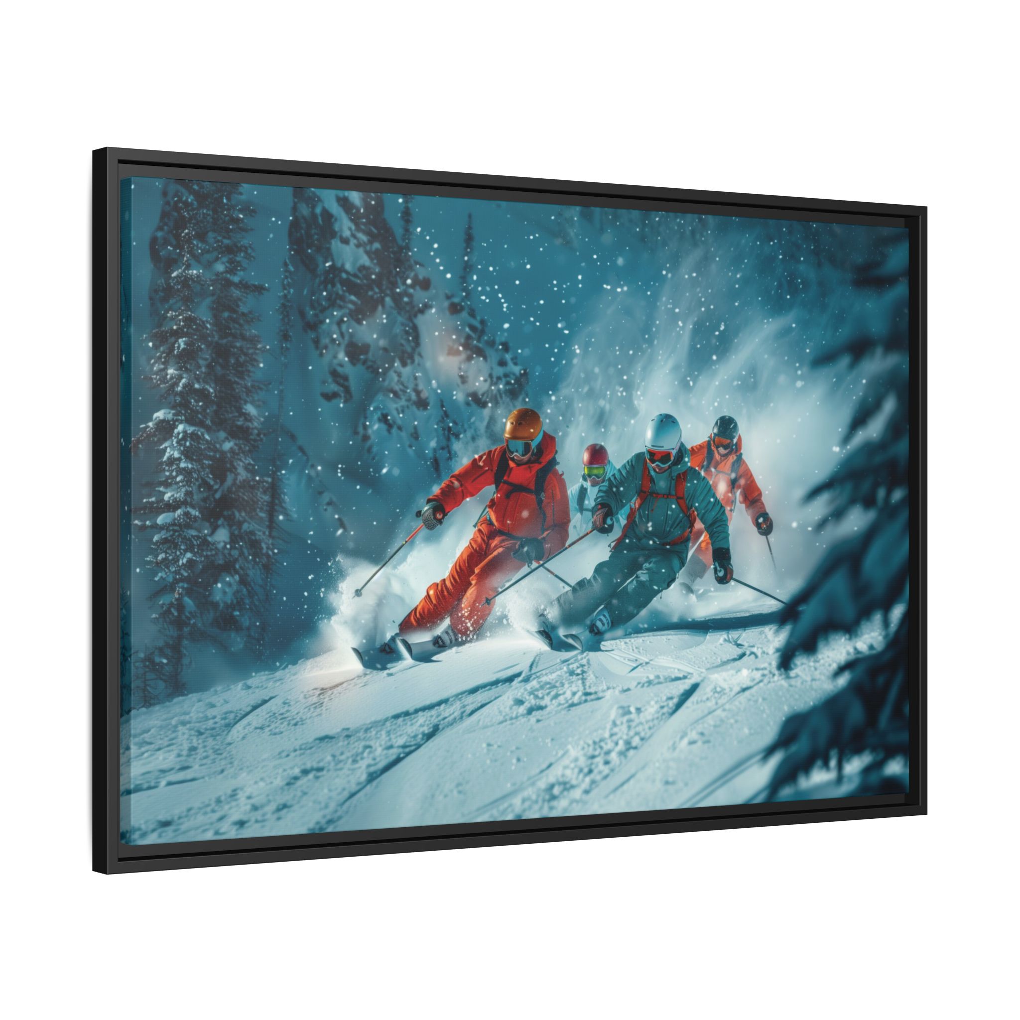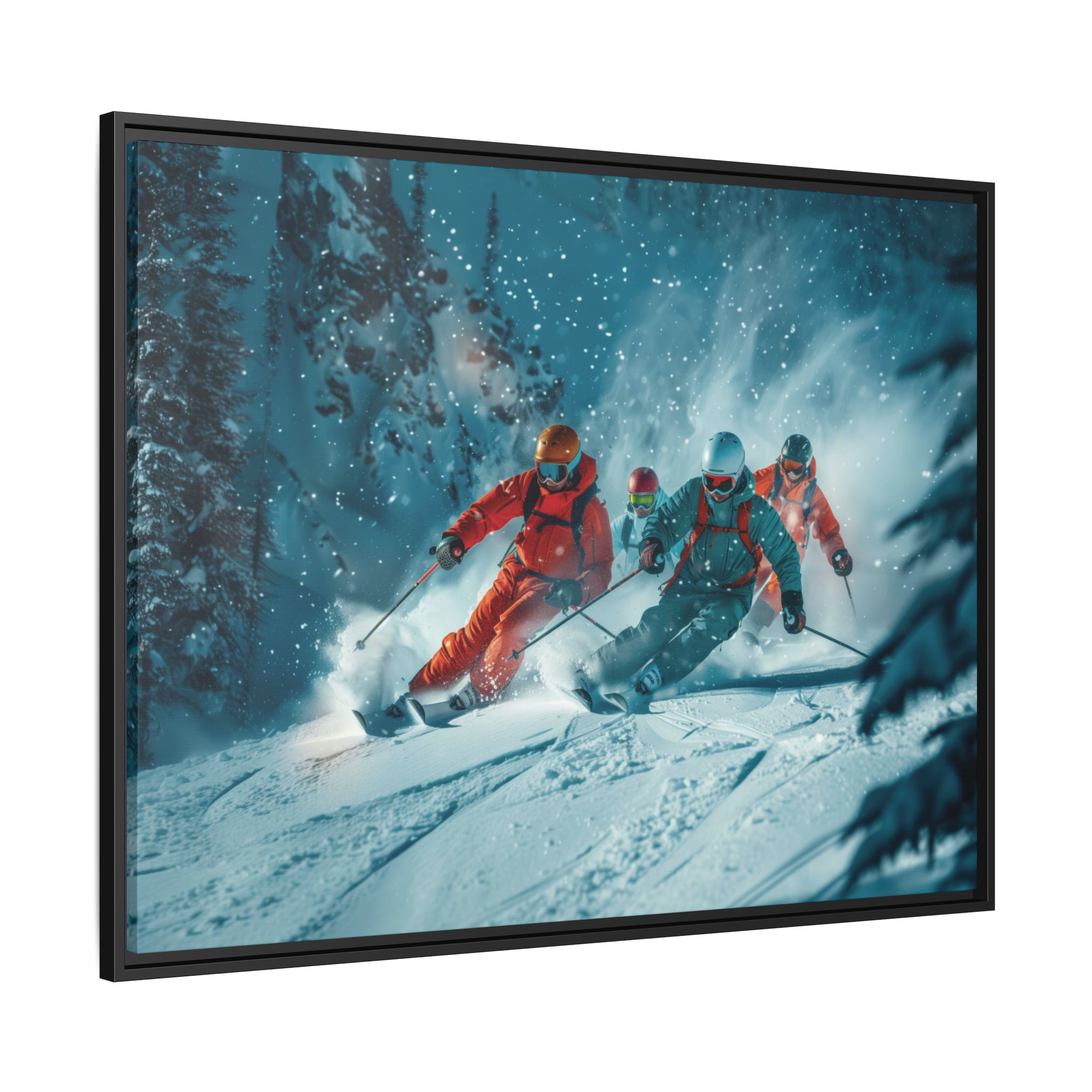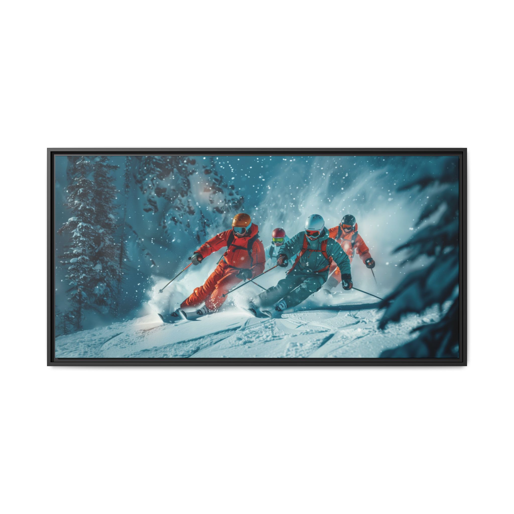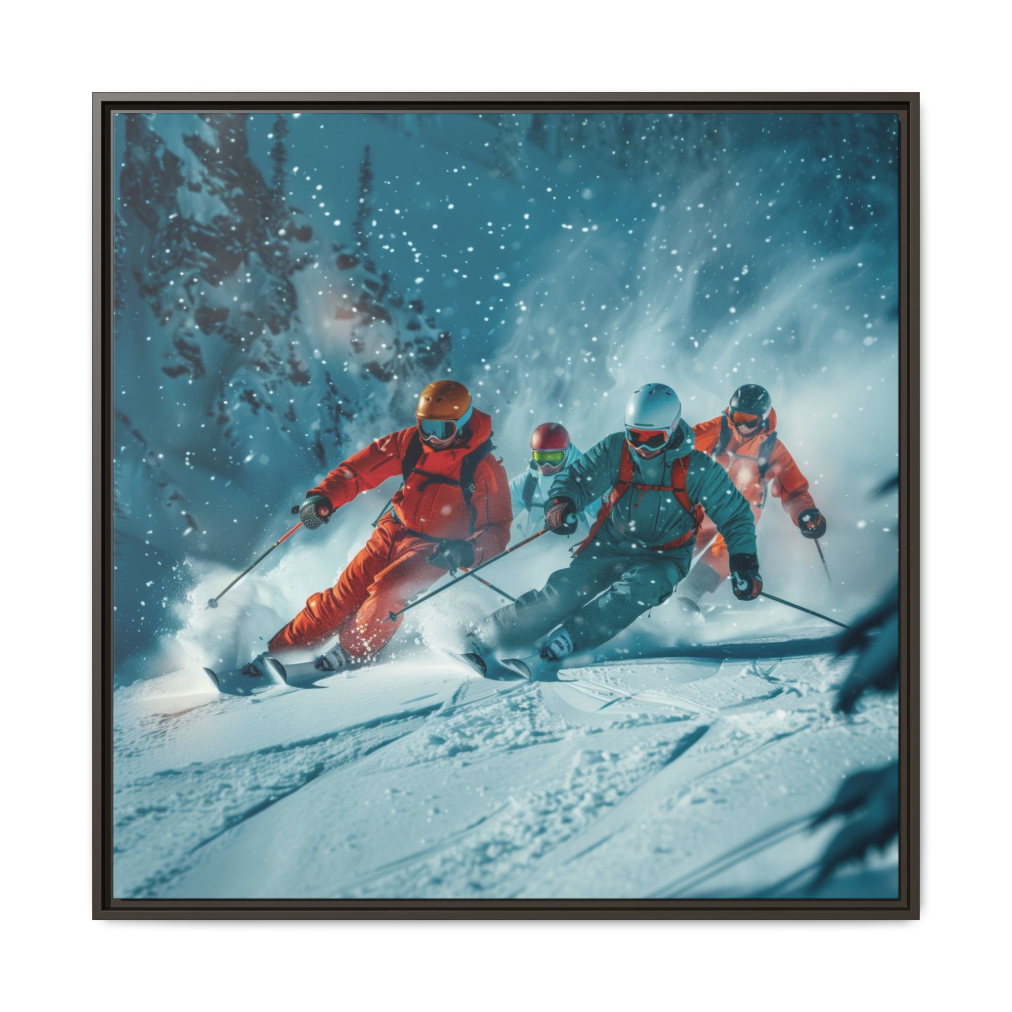 A dynamic action scene of skiers free skiing down the slopes in deep snow, a beutiful action landscape with intensity and excitement. The high-speed motion creates swirling snow clouds around them as they land on a snowy mountain slope. Experience the excitement of skiing with this dynamic action style canvas print. Perfect for adrenaline junkies and winter sports enthusiasts, this canvas brings intensity and motion to any room. Ideal for winter decor, sports enthusiasts, and anyone looking to add a thrilling touch to their space.
