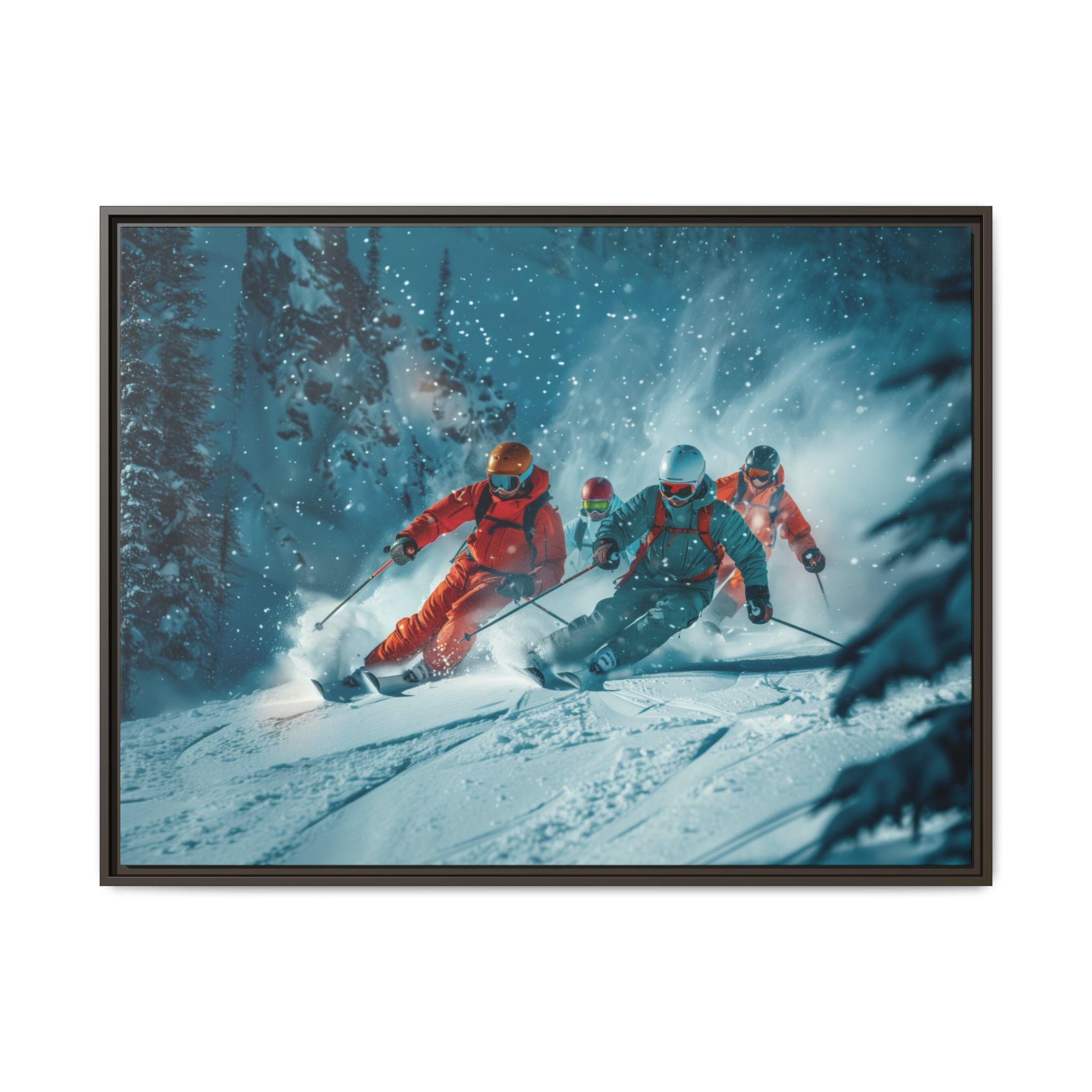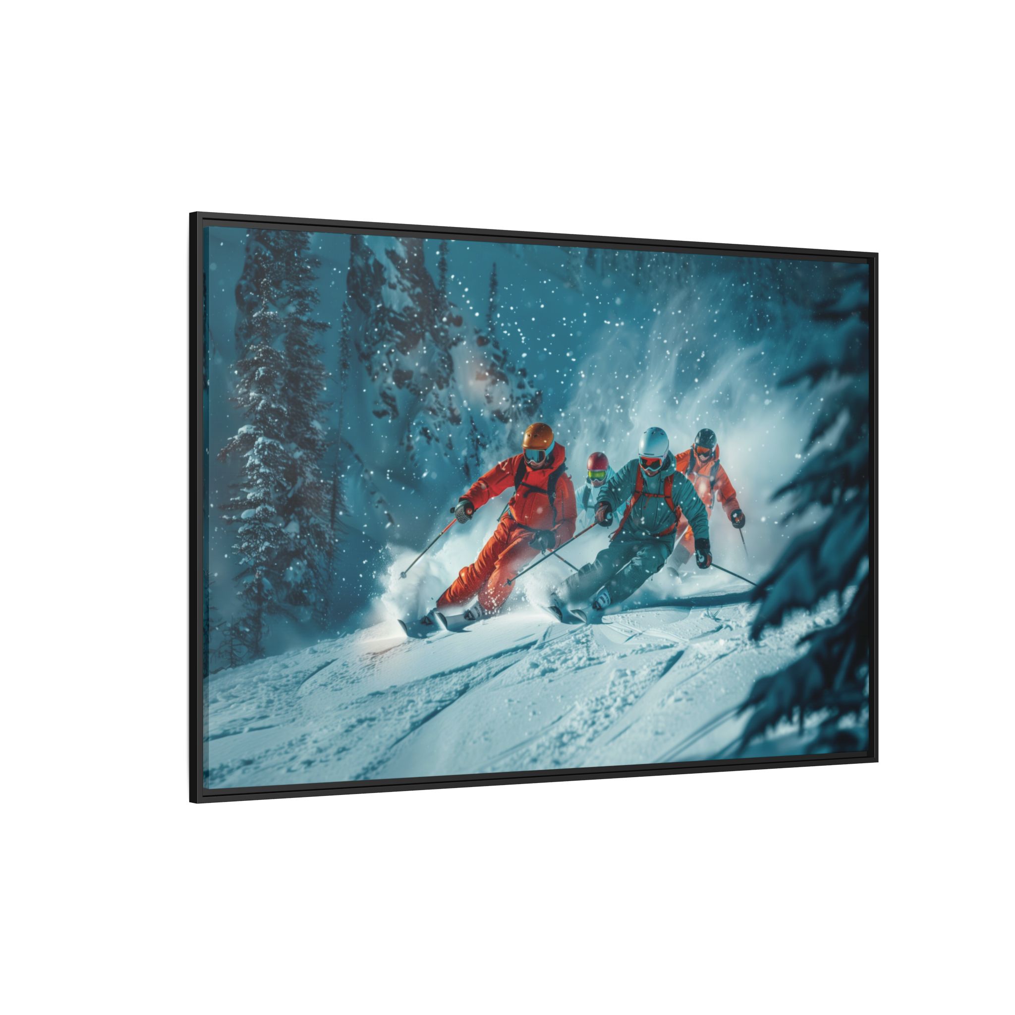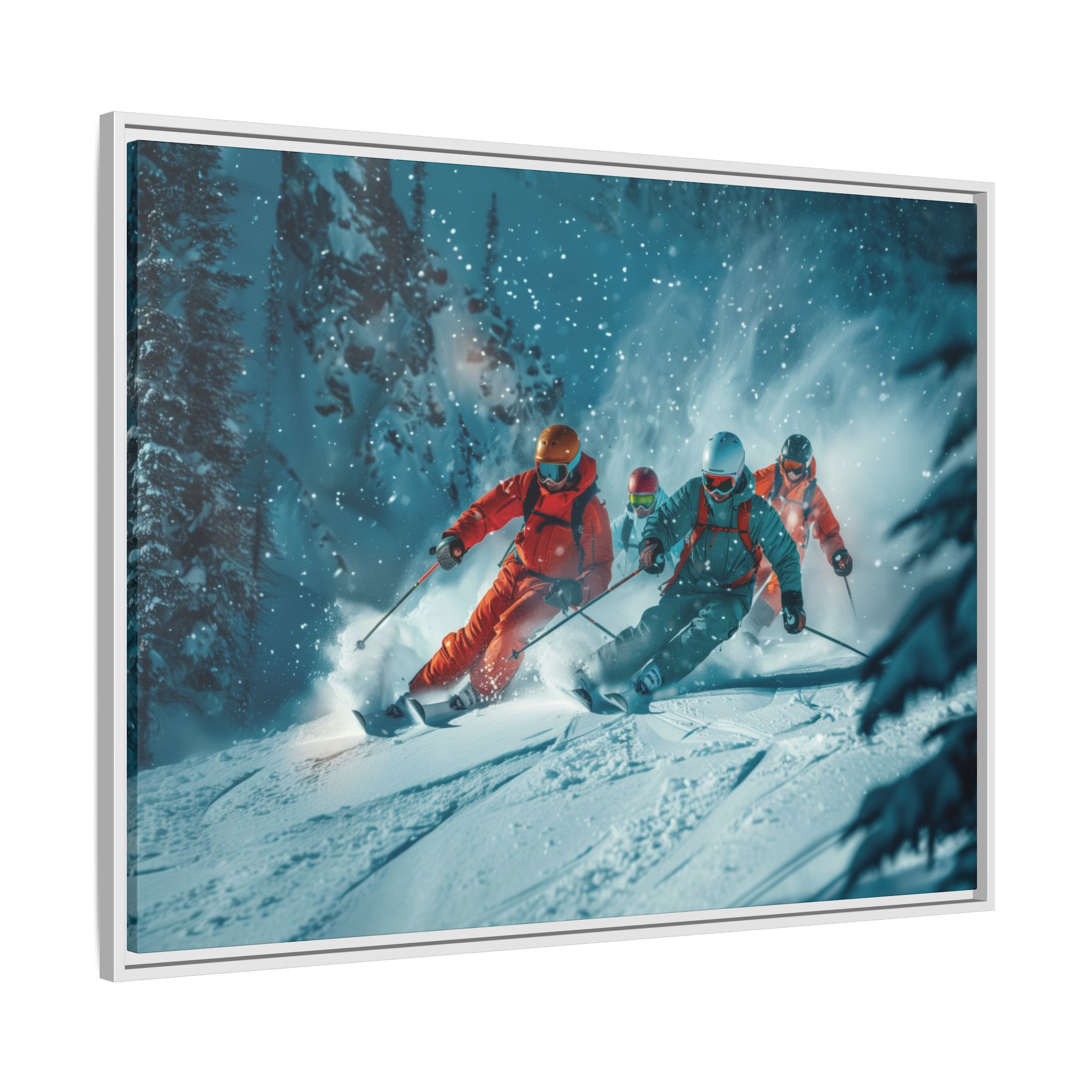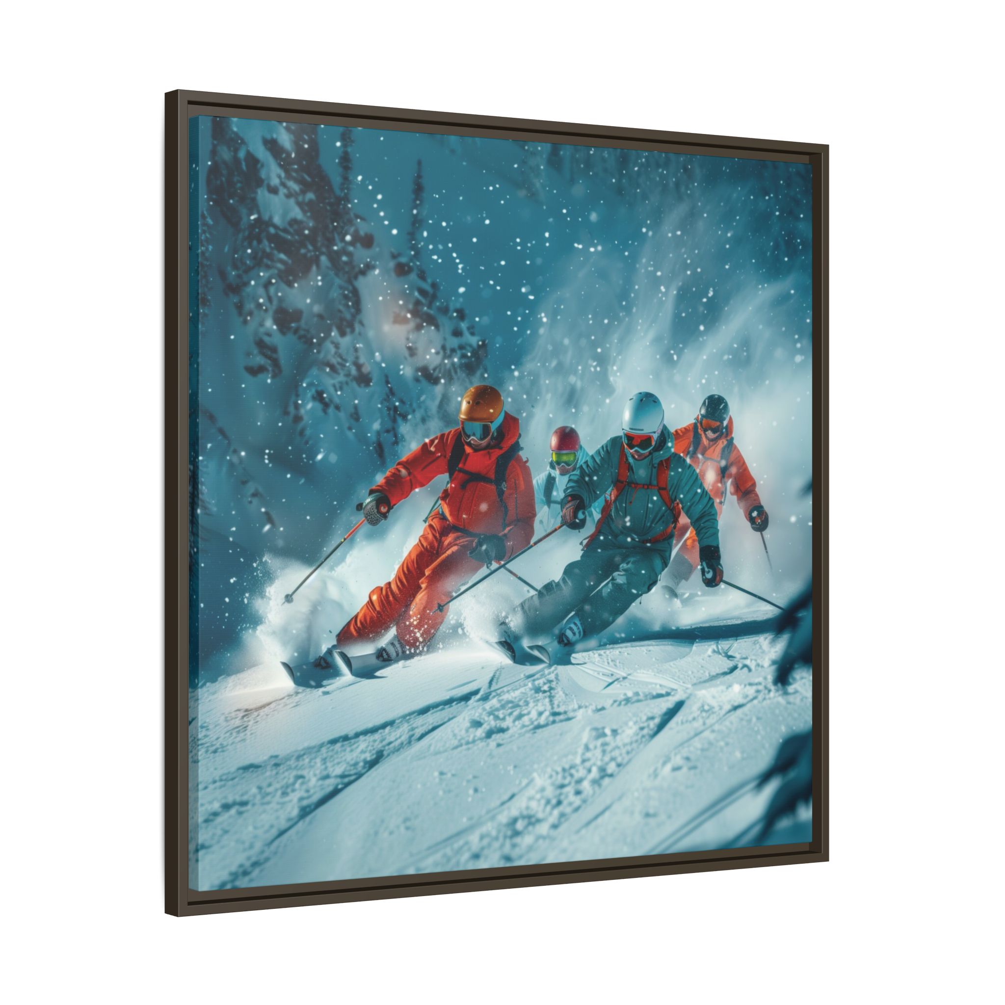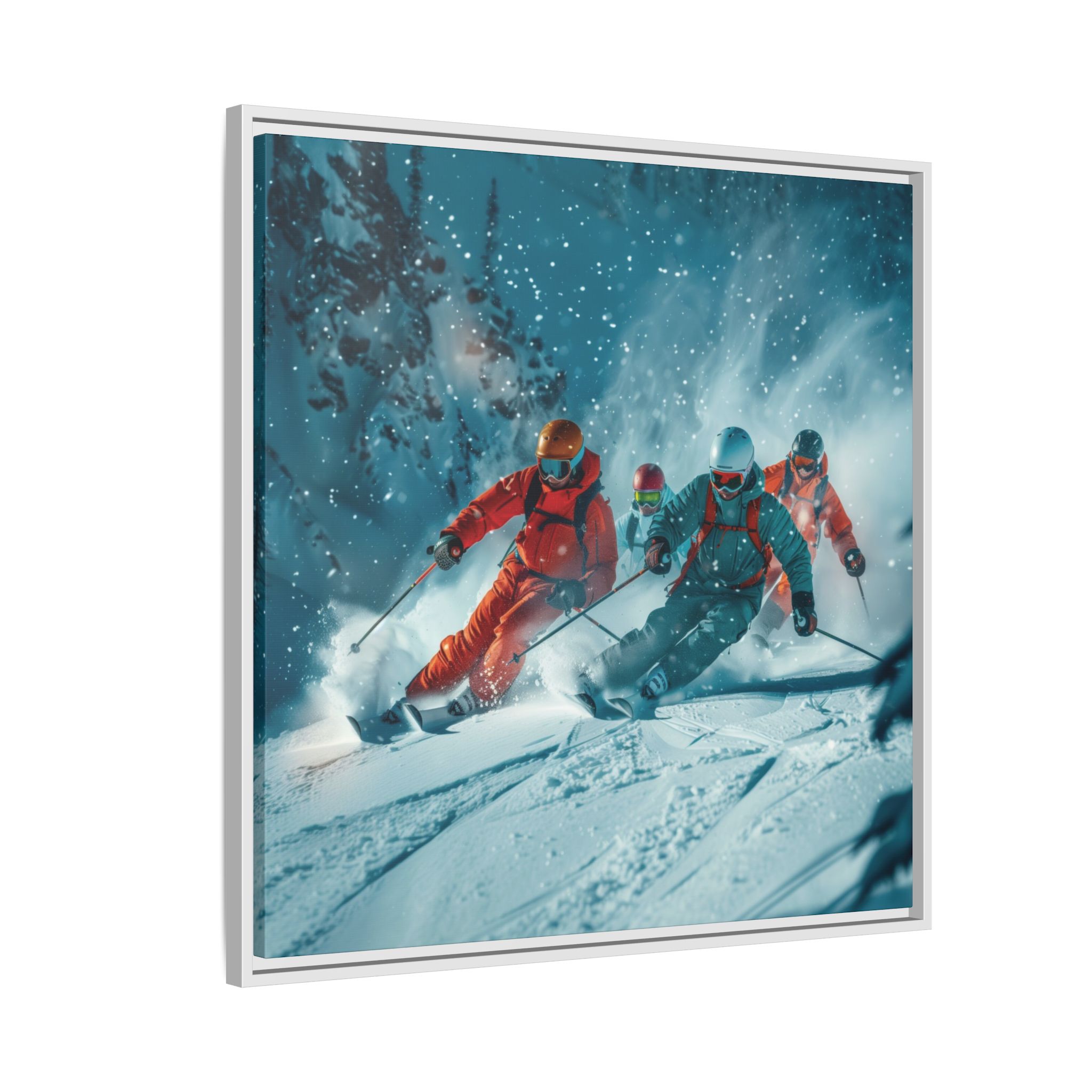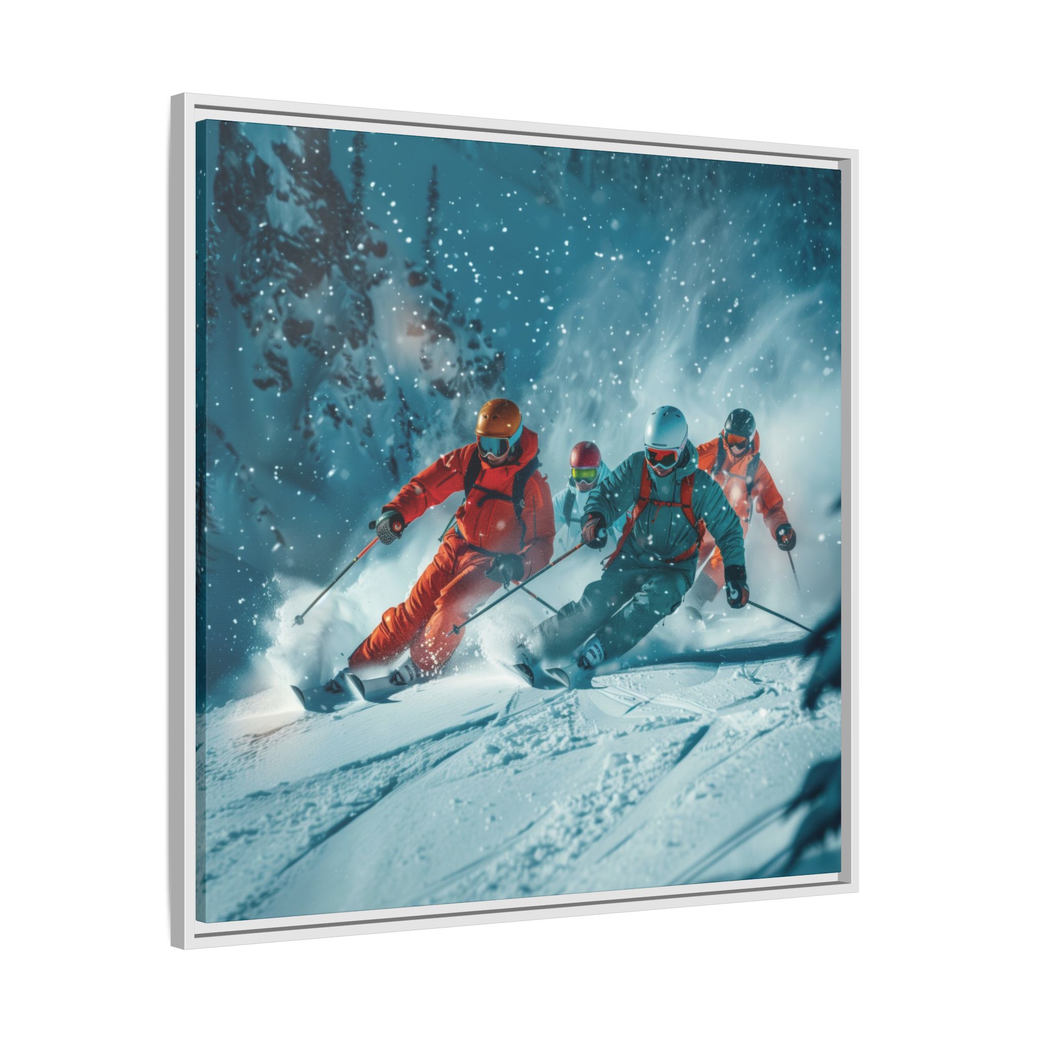 A dynamic action scene of skiers free skiing down the slopes in deep snow, a beutiful action landscape with intensity and excitement. The high-speed motion creates swirling snow clouds around them as they land on a snowy mountain slope. Experience the excitement of skiing with this dynamic action style canvas print. Perfect for adrenaline junkies and winter sports enthusiasts, this canvas brings intensity and motion to any room. Ideal for winter decor, sports enthusiasts, and anyone looking to add a thrilling touch to their space.