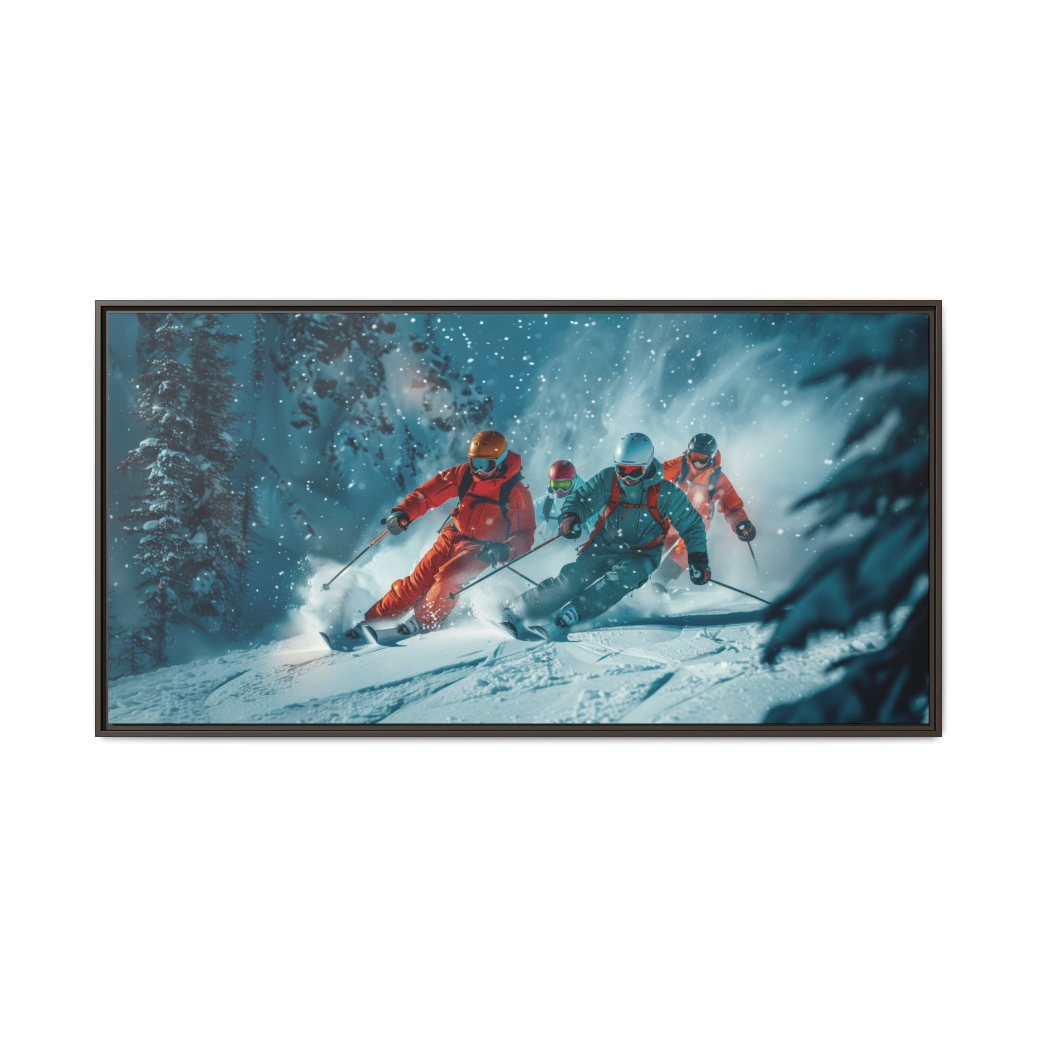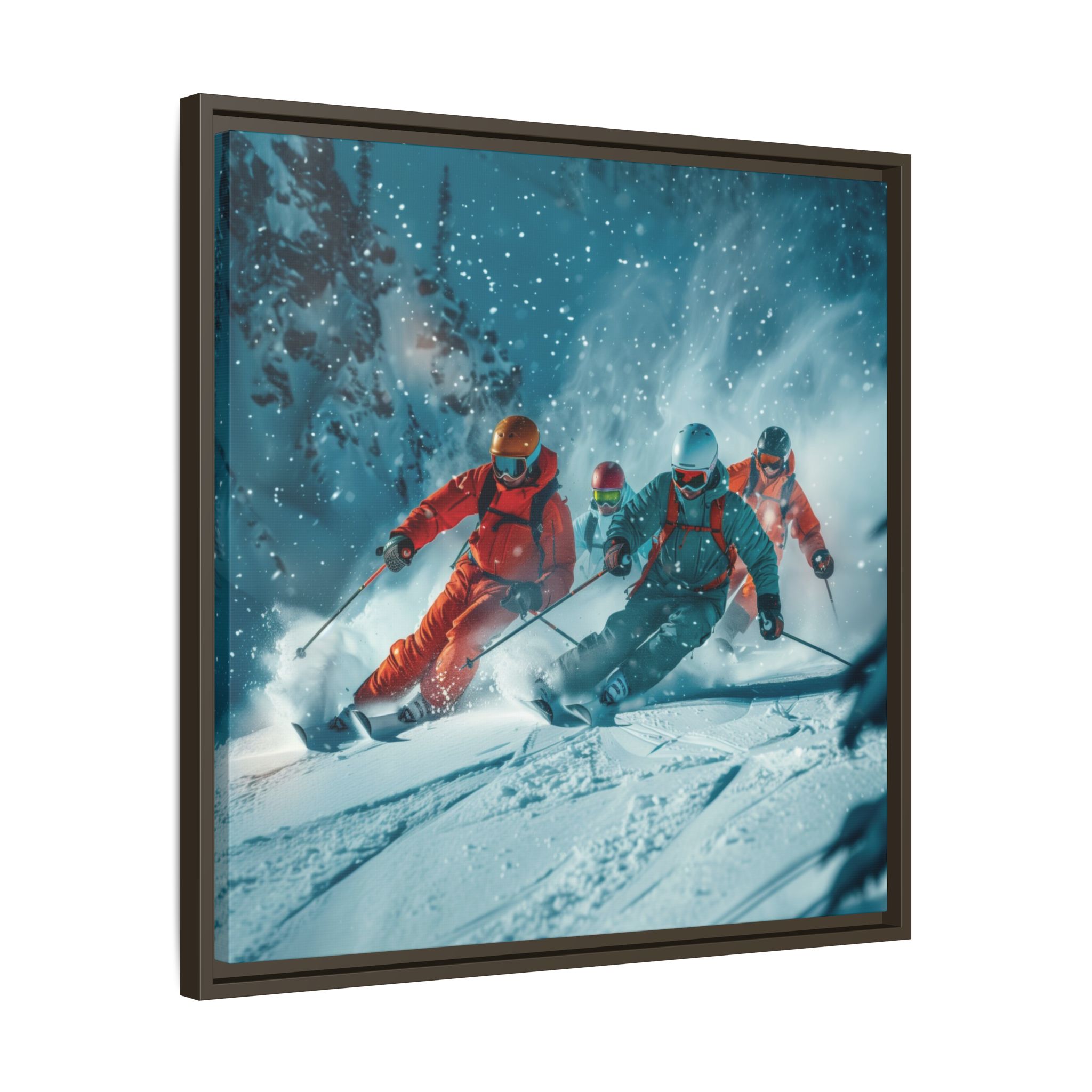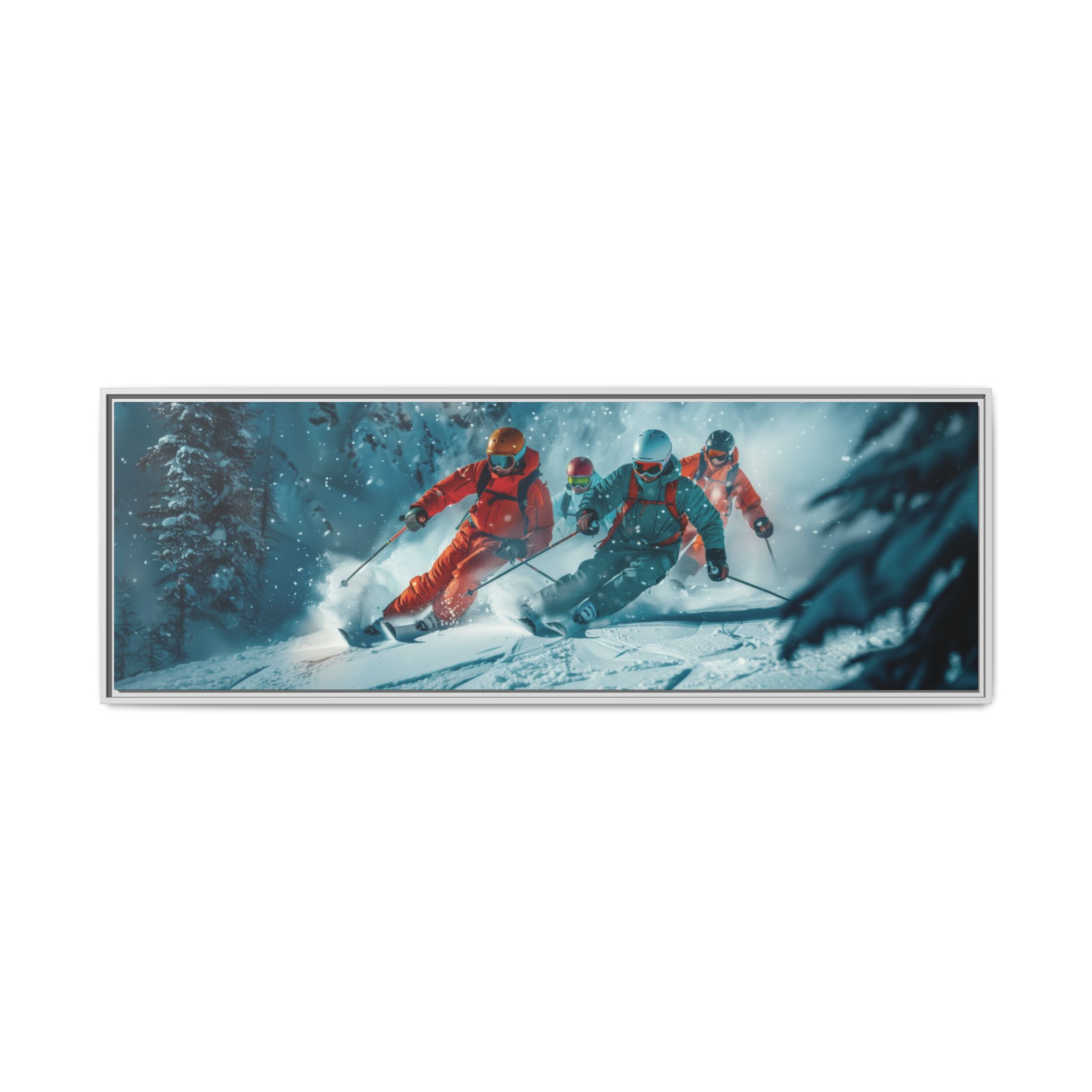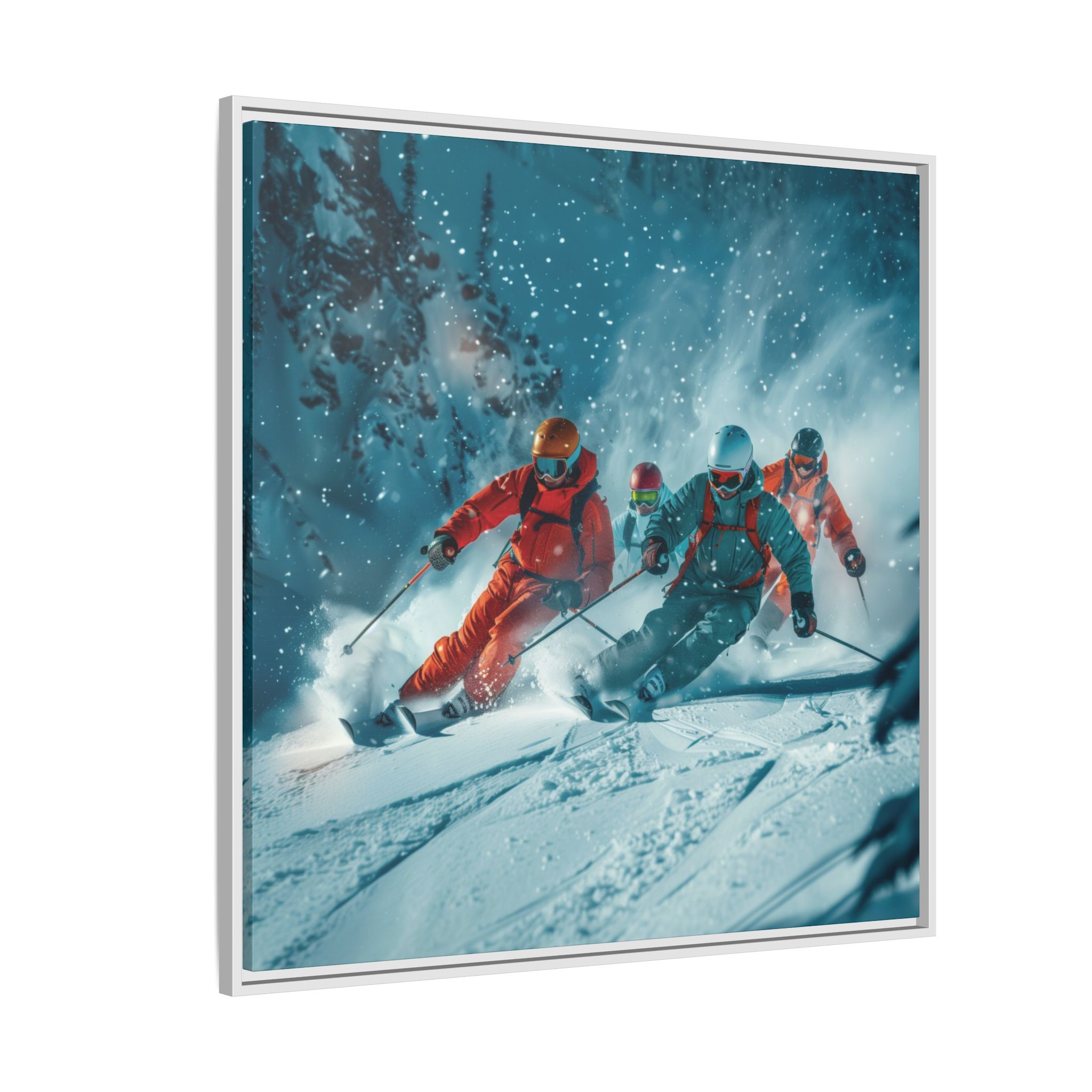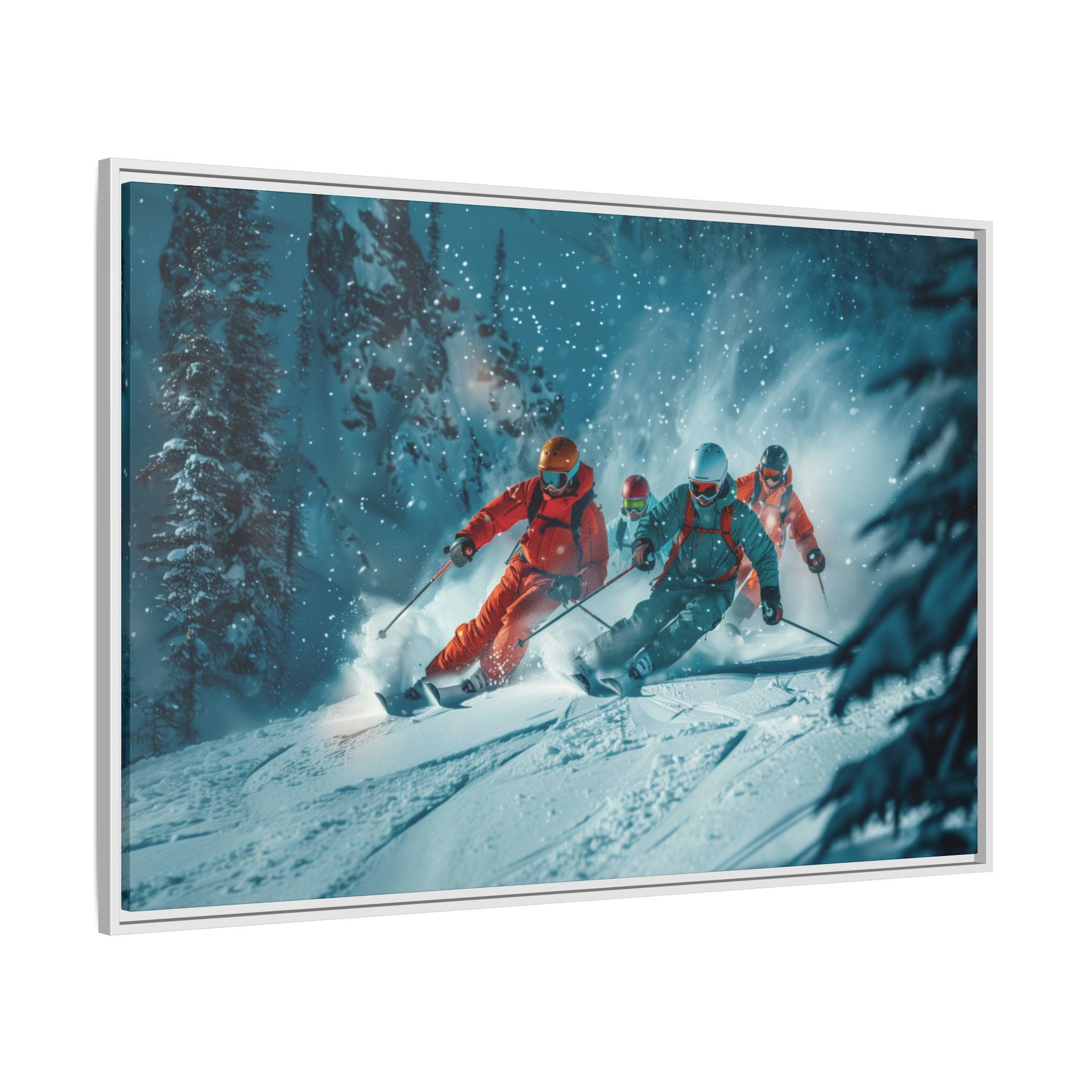 A dynamic action scene of skiers free skiing down the slopes in deep snow, a beutiful action landscape with intensity and excitement. The high-speed motion creates swirling snow clouds around them as they land on a snowy mountain slope. Experience the excitement of skiing with this dynamic action style canvas print. Perfect for adrenaline junkies and winter sports enthusiasts, this canvas brings intensity and motion to any room. Ideal for winter decor, sports enthusiasts, and anyone looking to add a thrilling touch to their space.