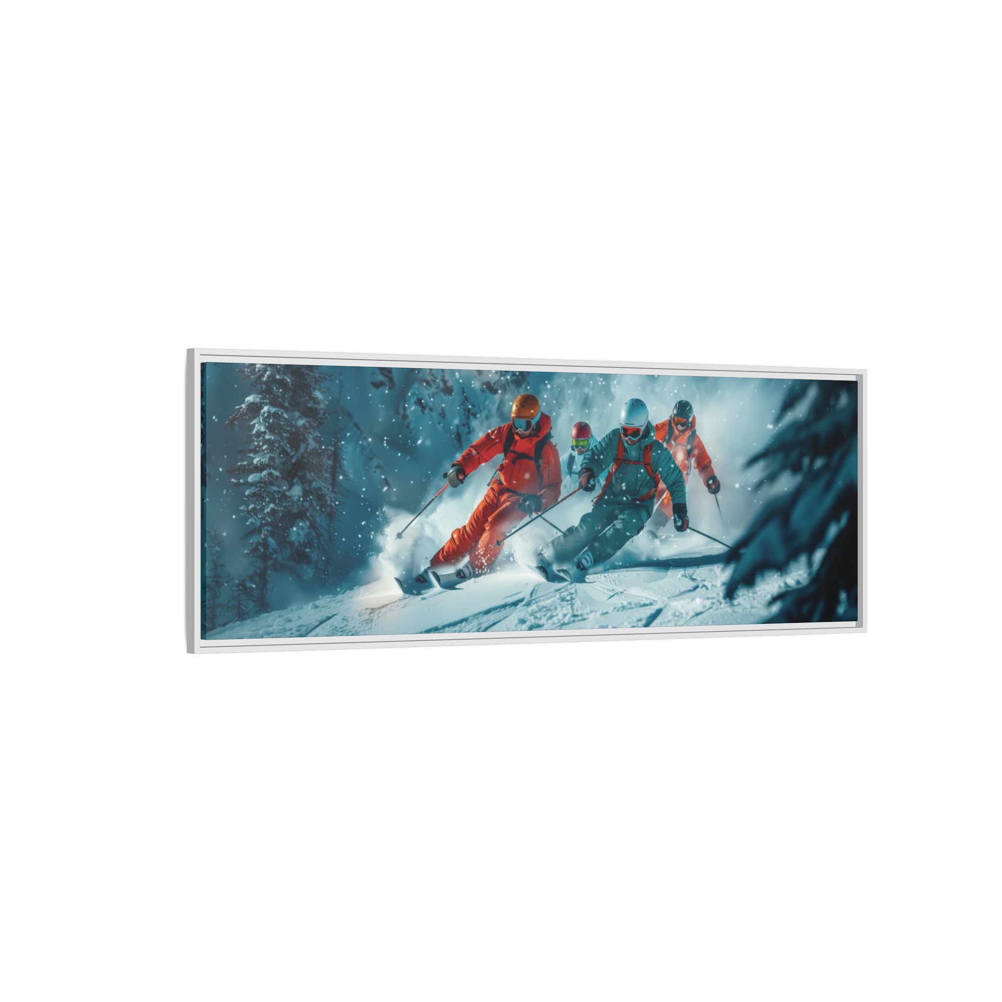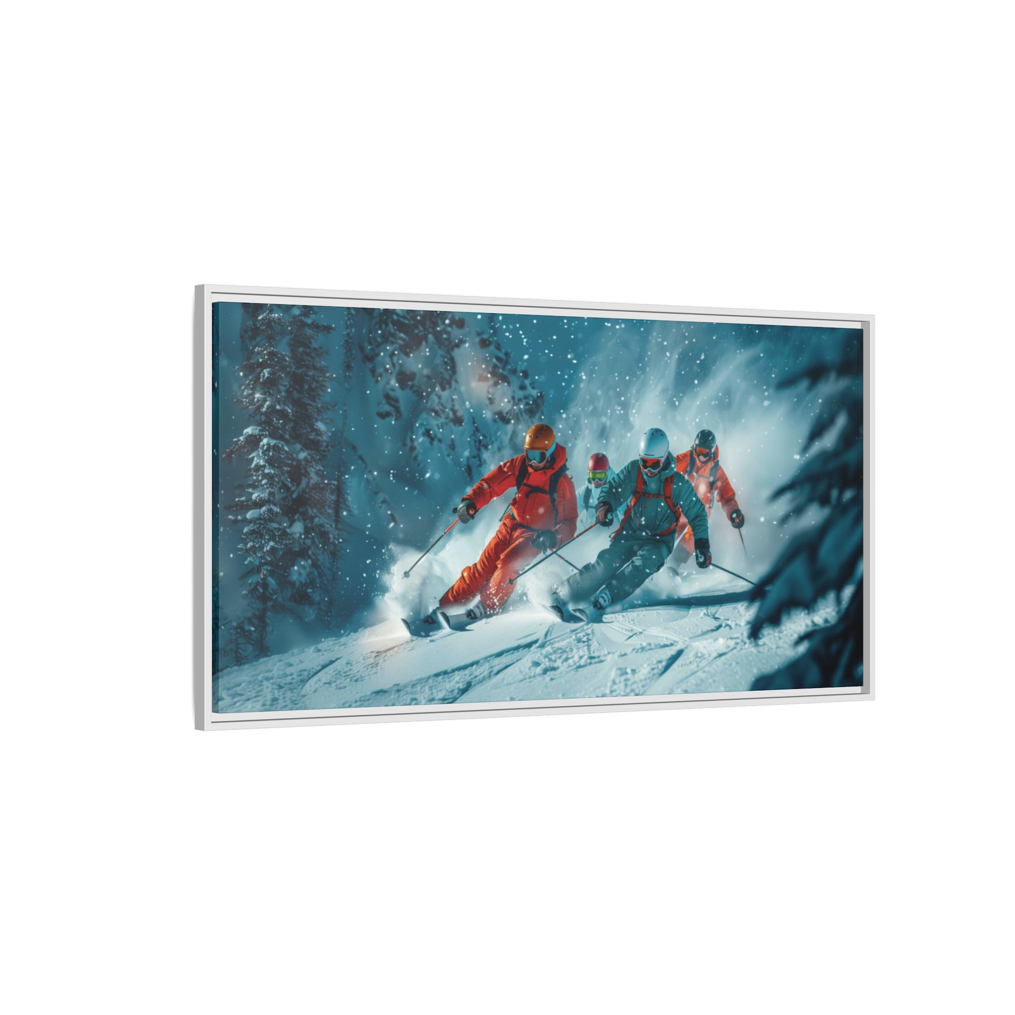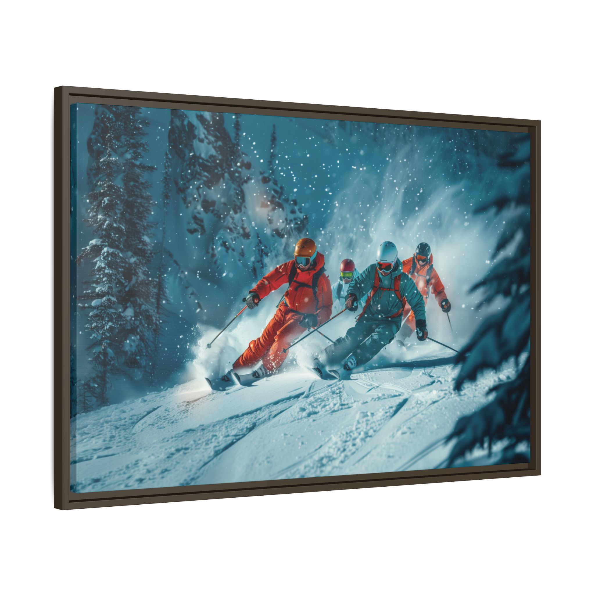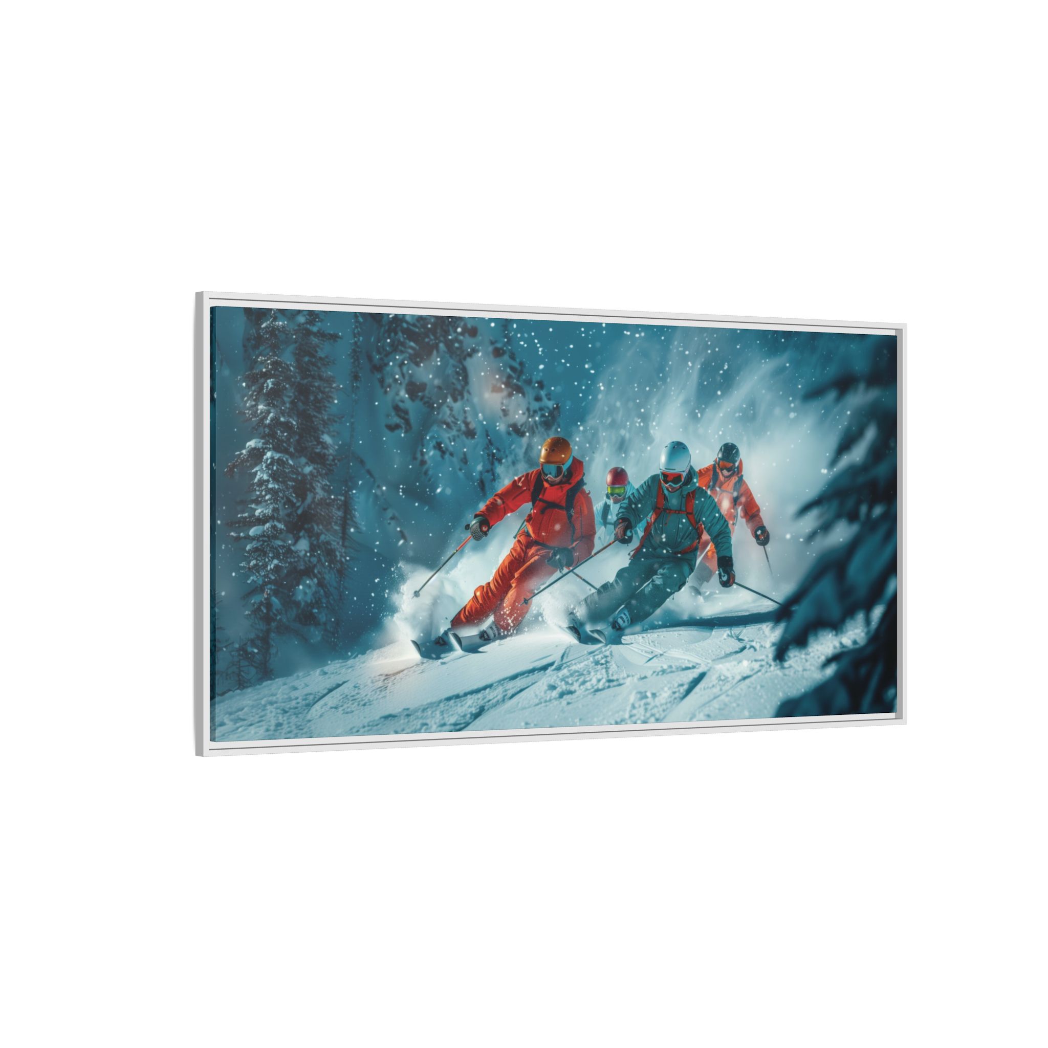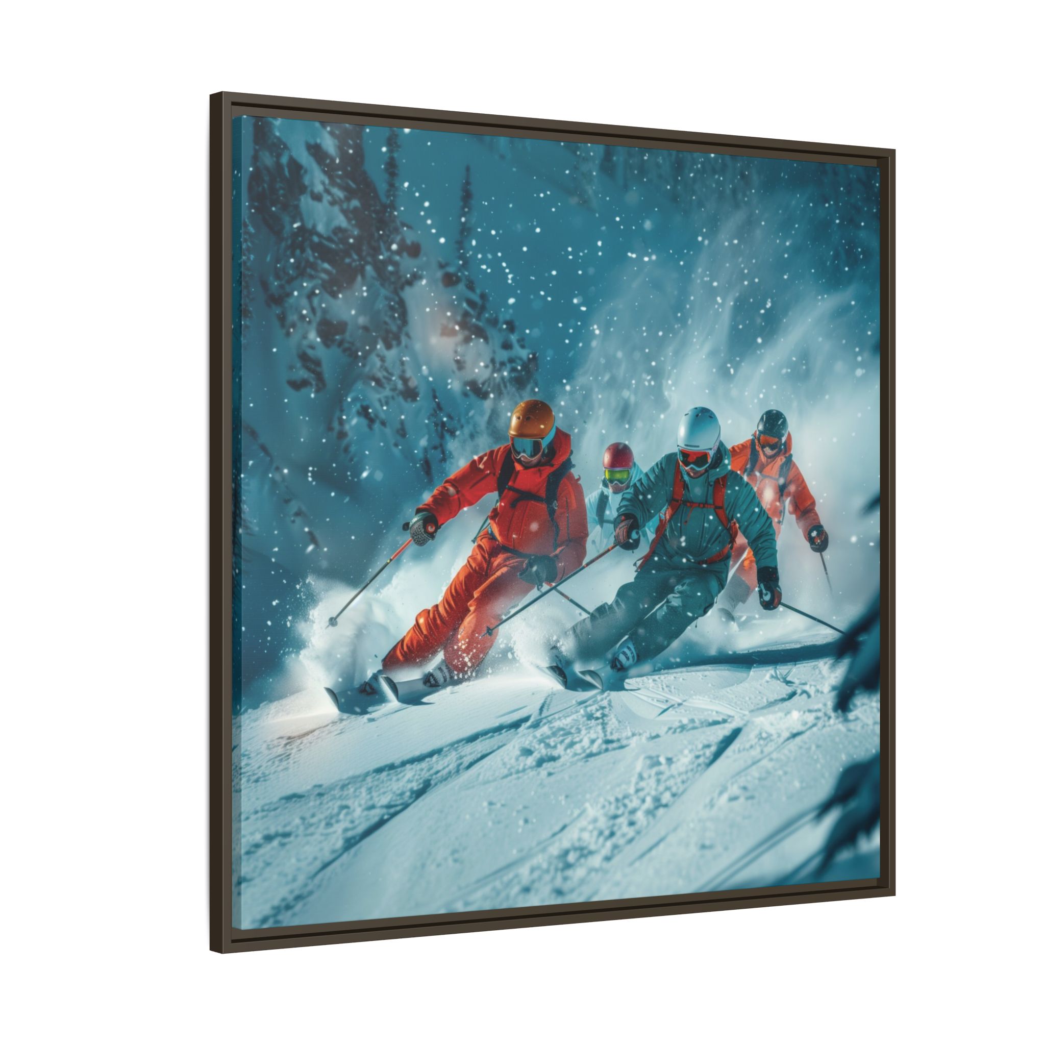 A dynamic action scene of skiers free skiing down the slopes in deep snow, a beutiful action landscape with intensity and excitement. The high-speed motion creates swirling snow clouds around them as they land on a snowy mountain slope. Experience the excitement of skiing with this dynamic action style canvas print. Perfect for adrenaline junkies and winter sports enthusiasts, this canvas brings intensity and motion to any room. Ideal for winter decor, sports enthusiasts, and anyone looking to add a thrilling touch to their space.