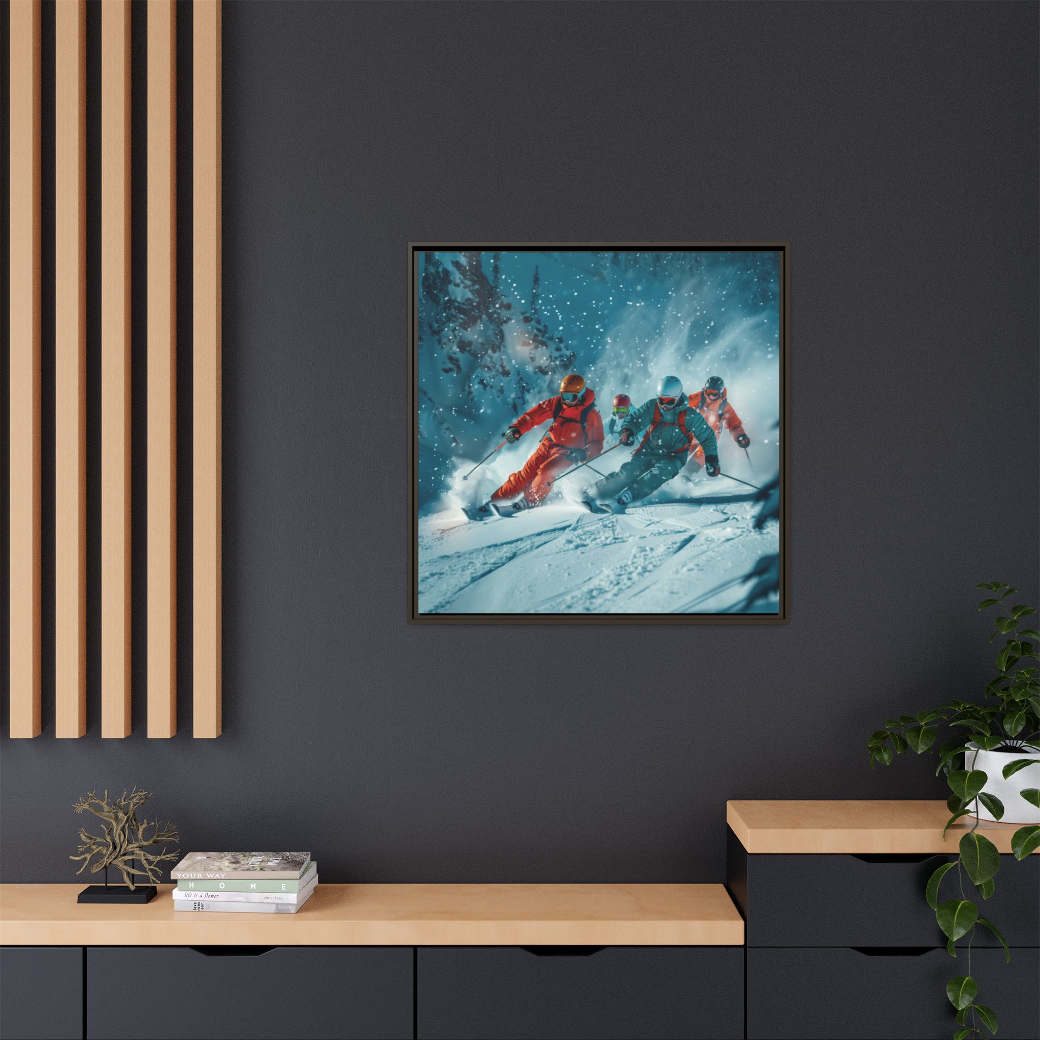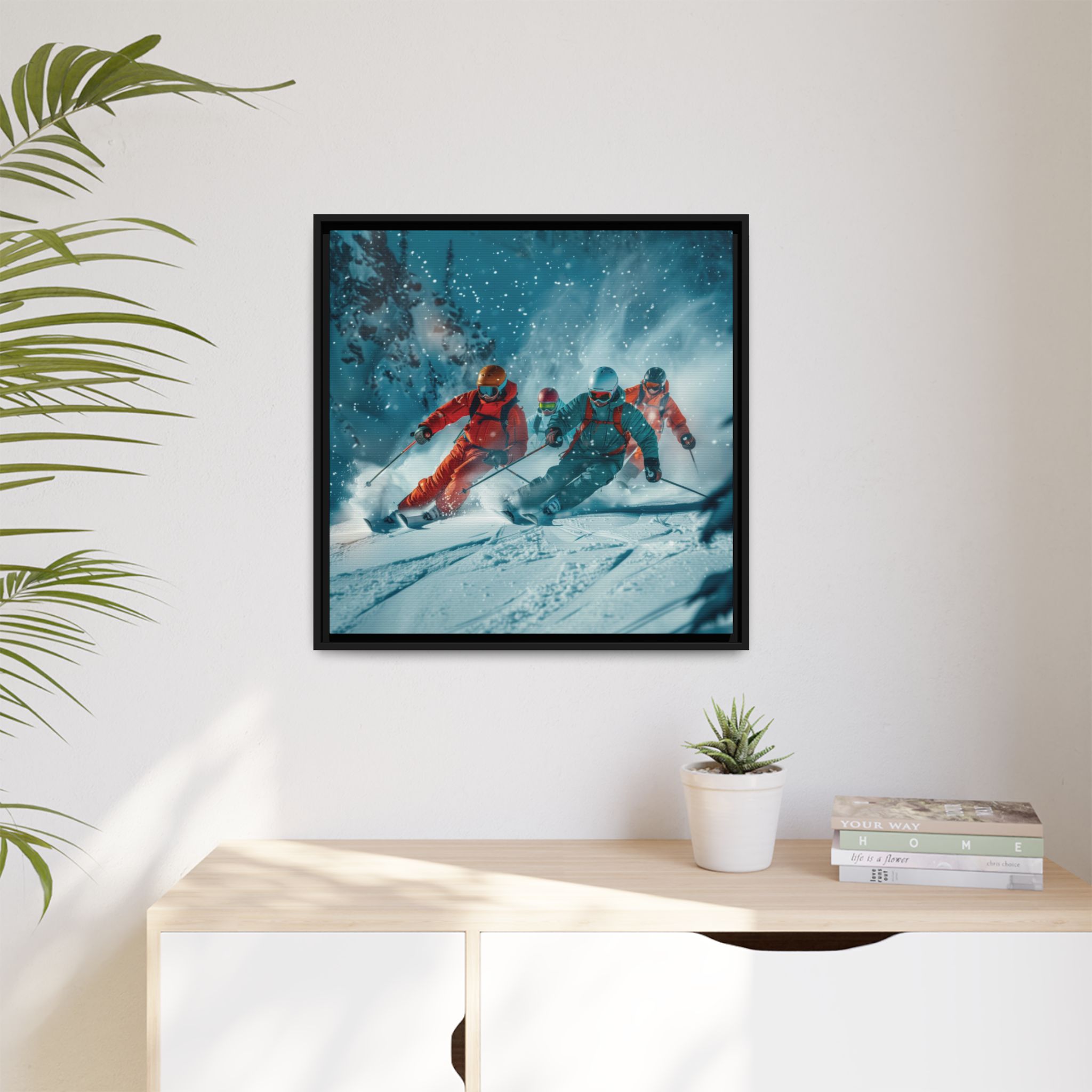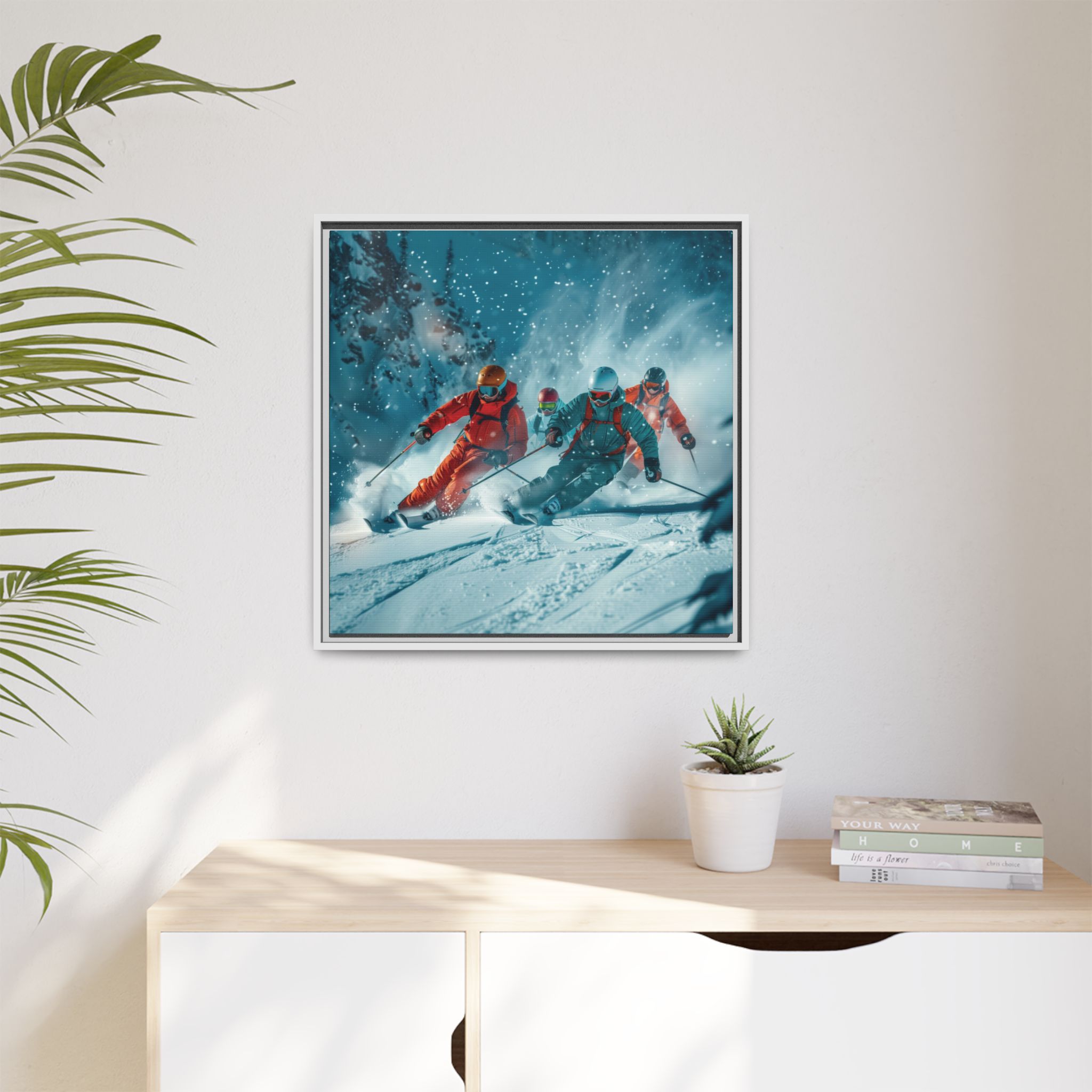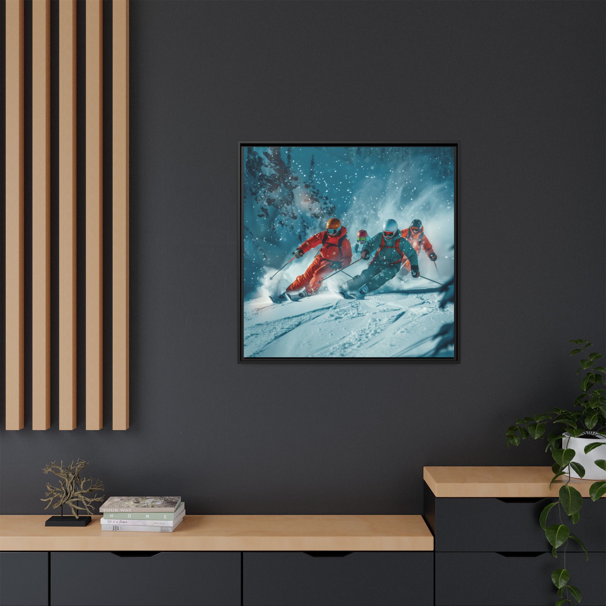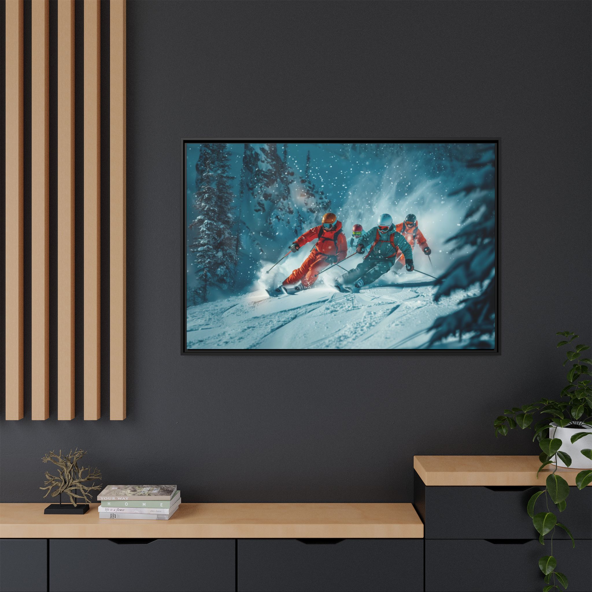 A dynamic action scene of skiers free skiing down the slopes in deep snow, a beutiful action landscape with intensity and excitement. The high-speed motion creates swirling snow clouds around them as they land on a snowy mountain slope. Experience the excitement of skiing with this dynamic action style canvas print. Perfect for adrenaline junkies and winter sports enthusiasts, this canvas brings intensity and motion to any room. Ideal for winter decor, sports enthusiasts, and anyone looking to add a thrilling touch to their space.