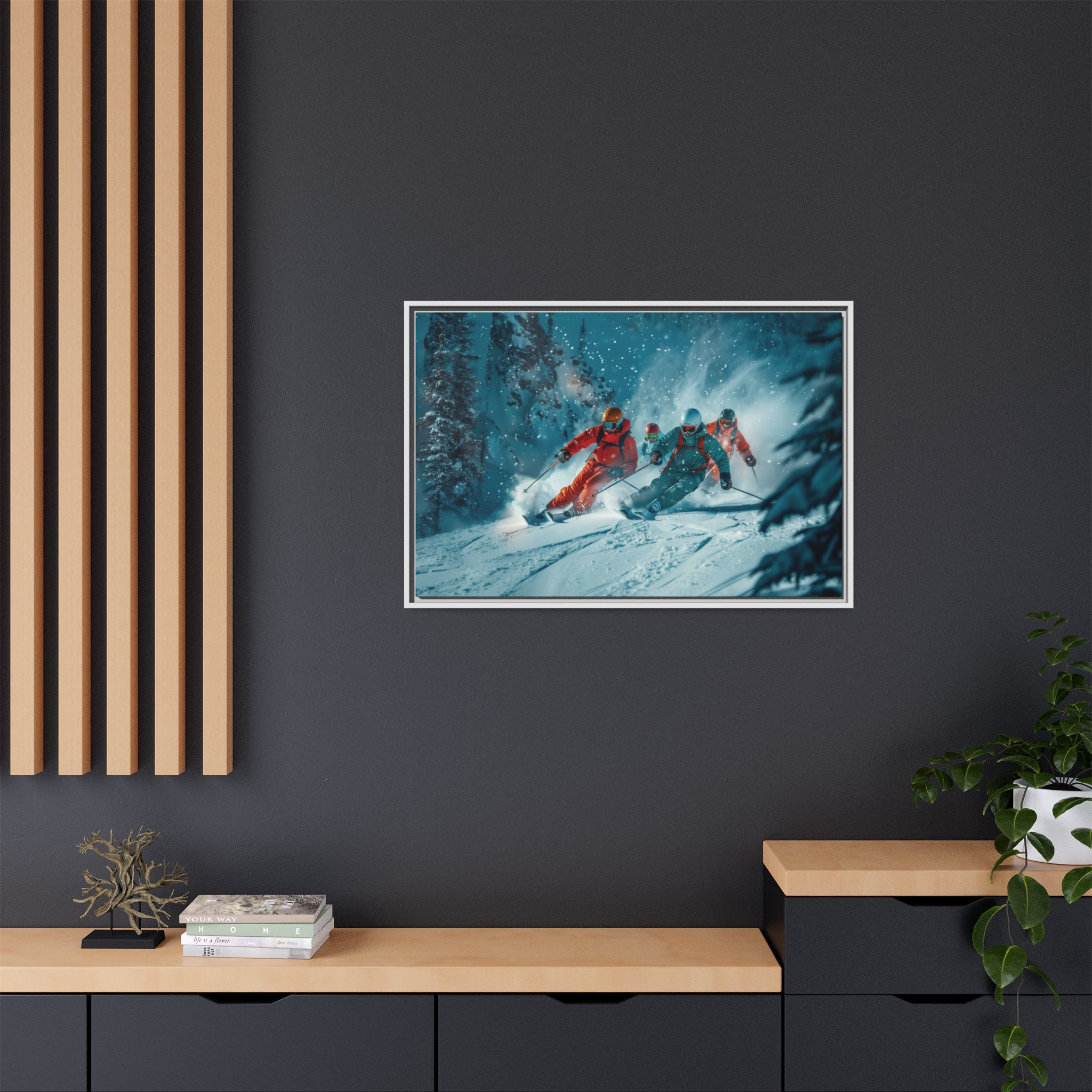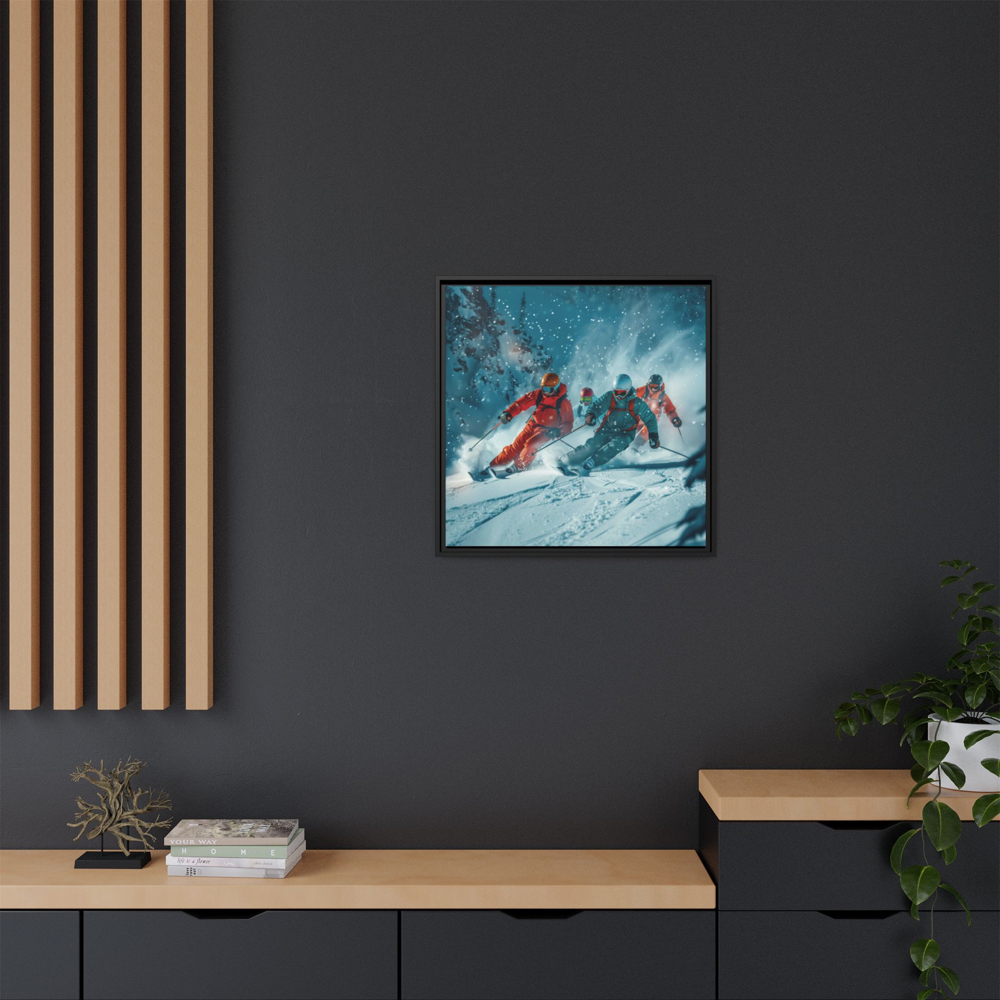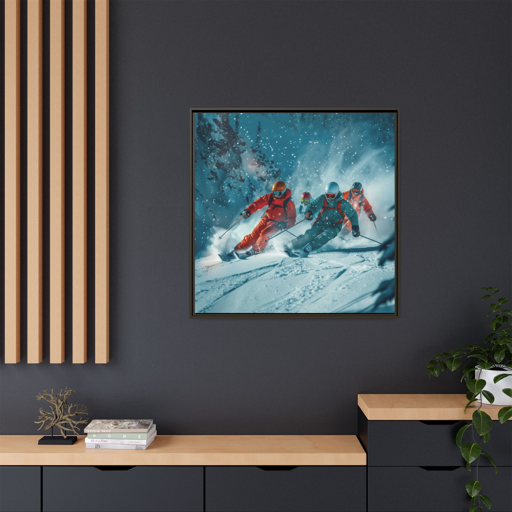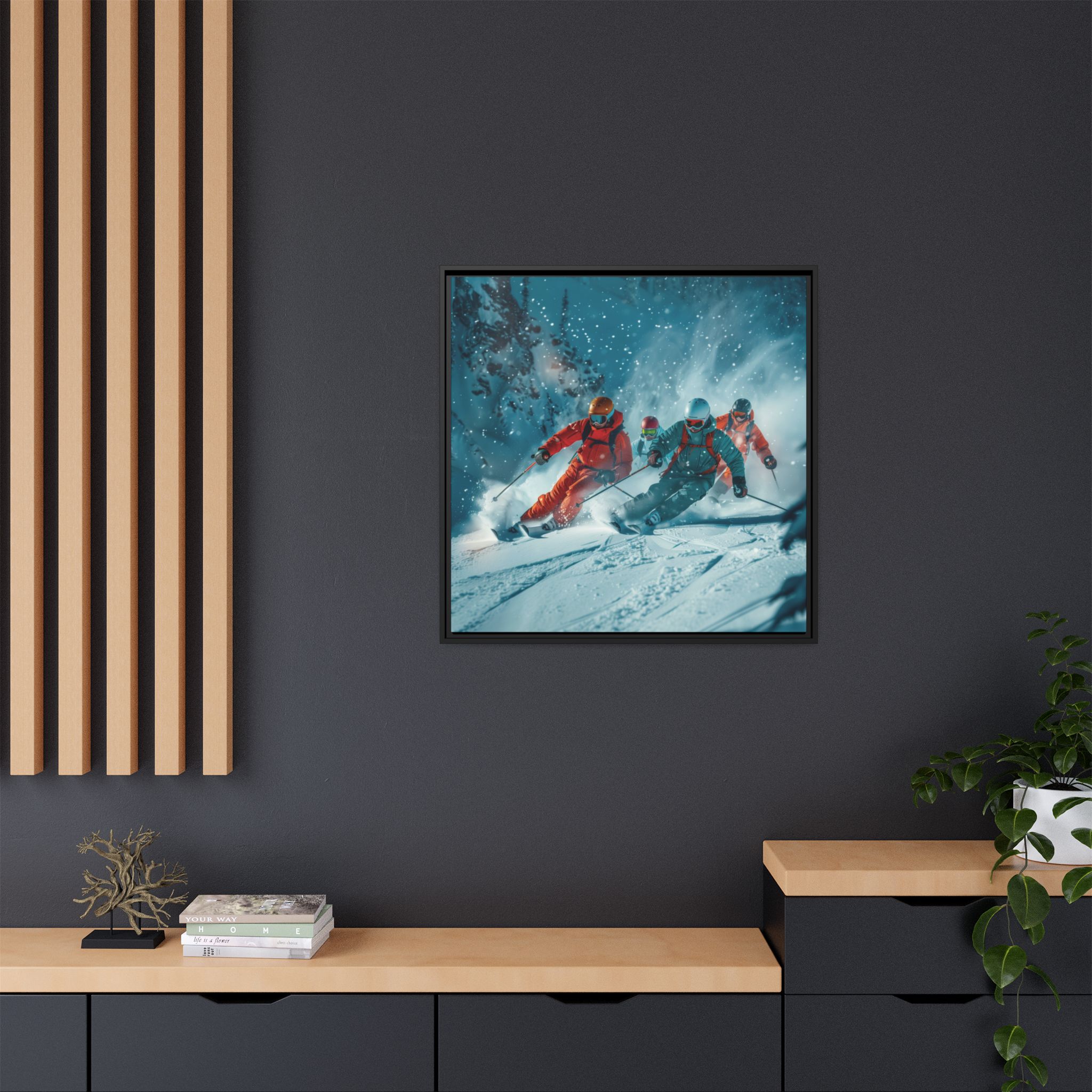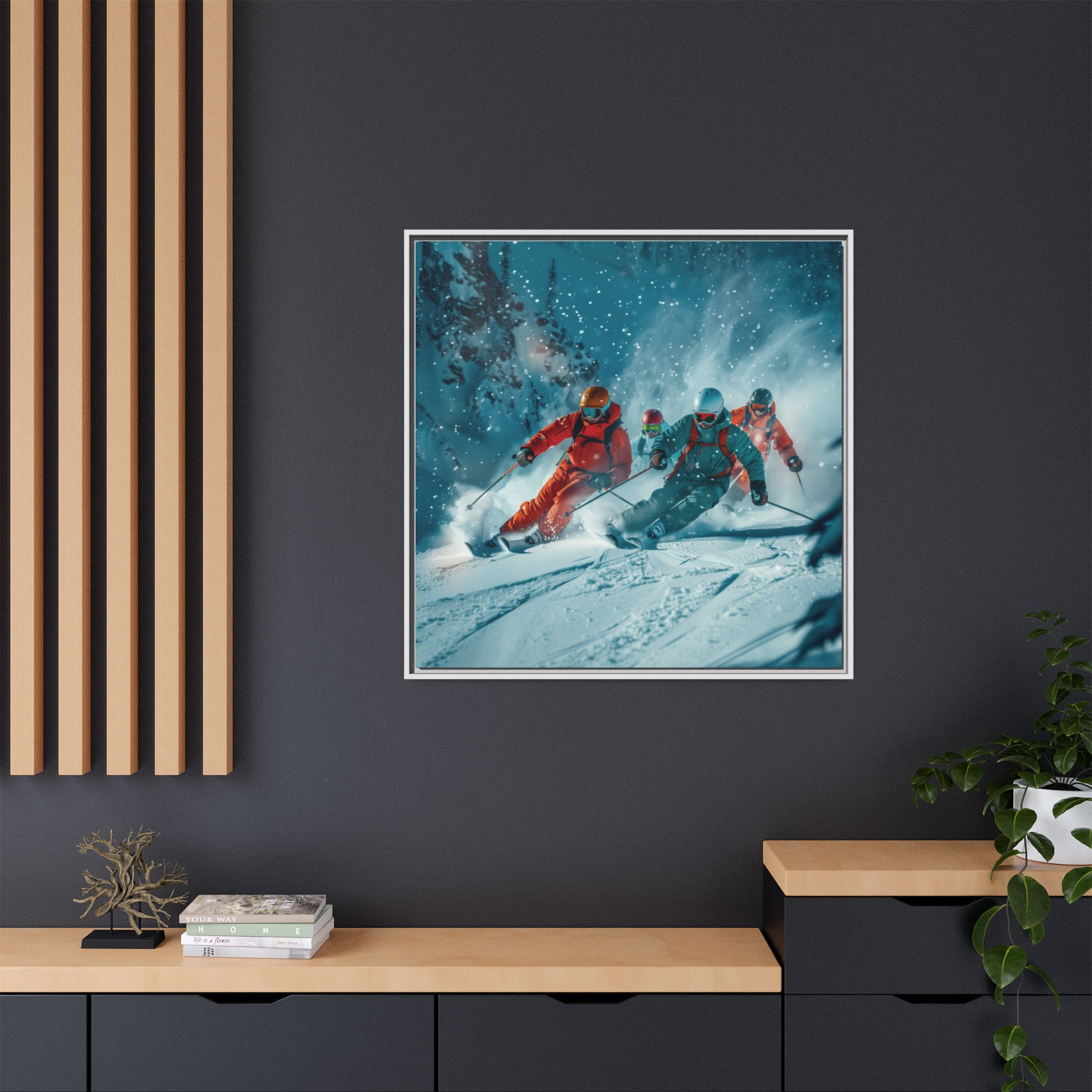 A dynamic action scene of skiers free skiing down the slopes in deep snow, a beutiful action landscape with intensity and excitement. The high-speed motion creates swirling snow clouds around them as they land on a snowy mountain slope. Experience the excitement of skiing with this dynamic action style canvas print. Perfect for adrenaline junkies and winter sports enthusiasts, this canvas brings intensity and motion to any room. Ideal for winter decor, sports enthusiasts, and anyone looking to add a thrilling touch to their space.