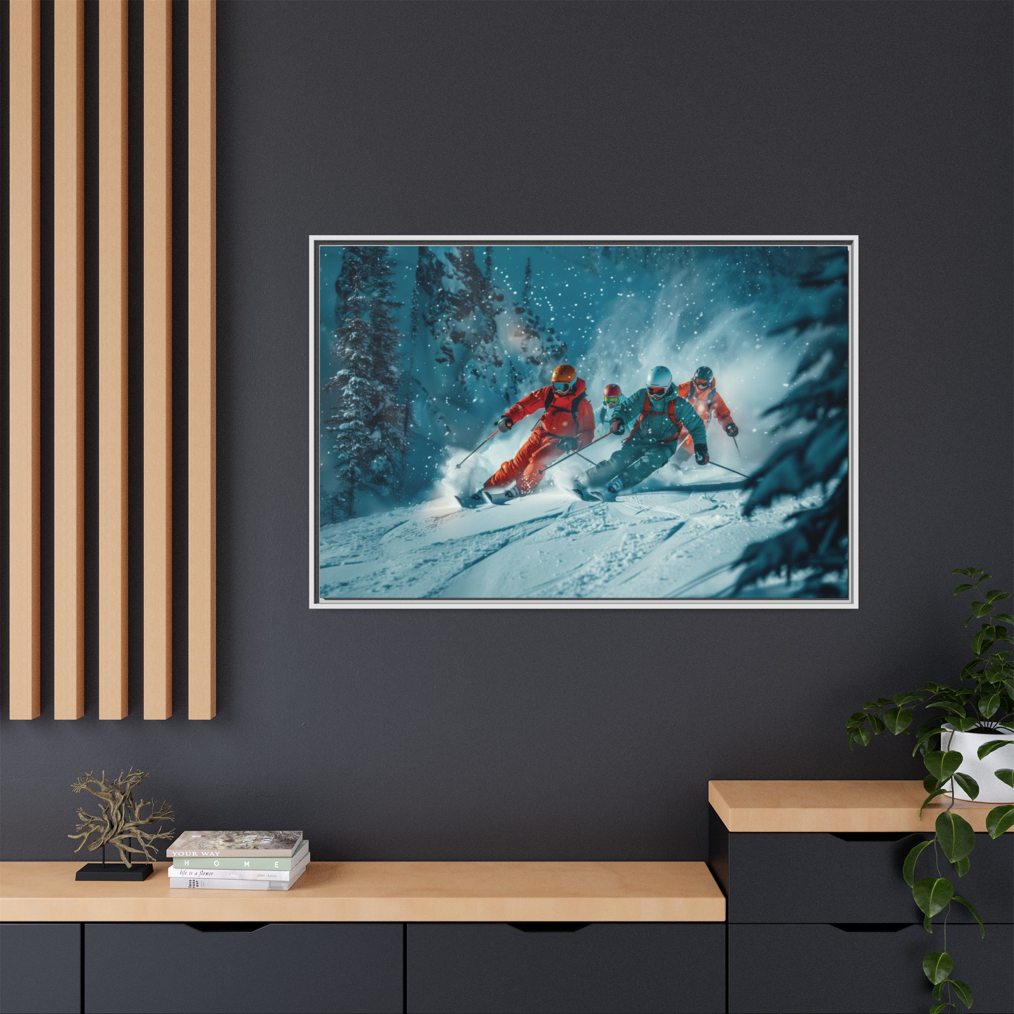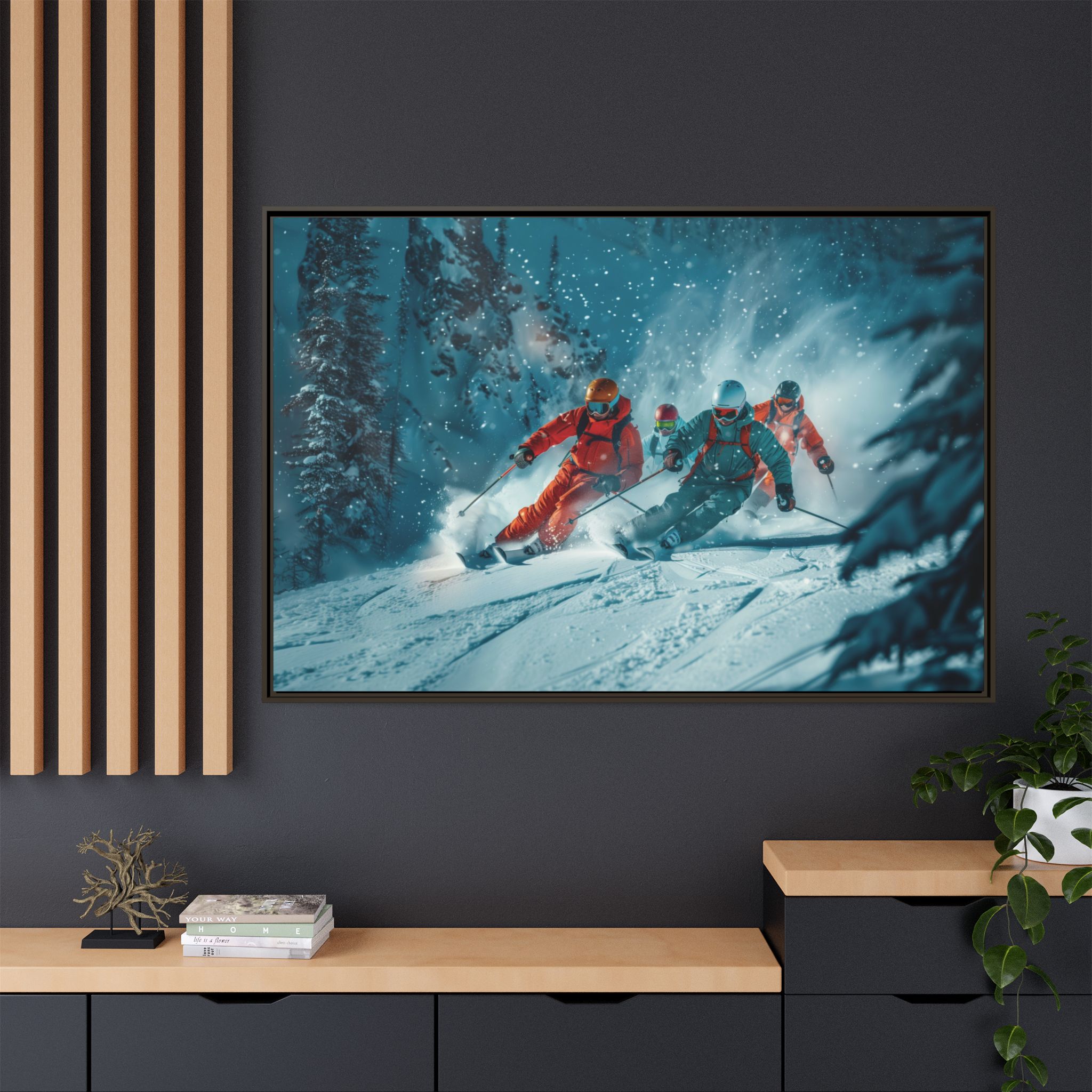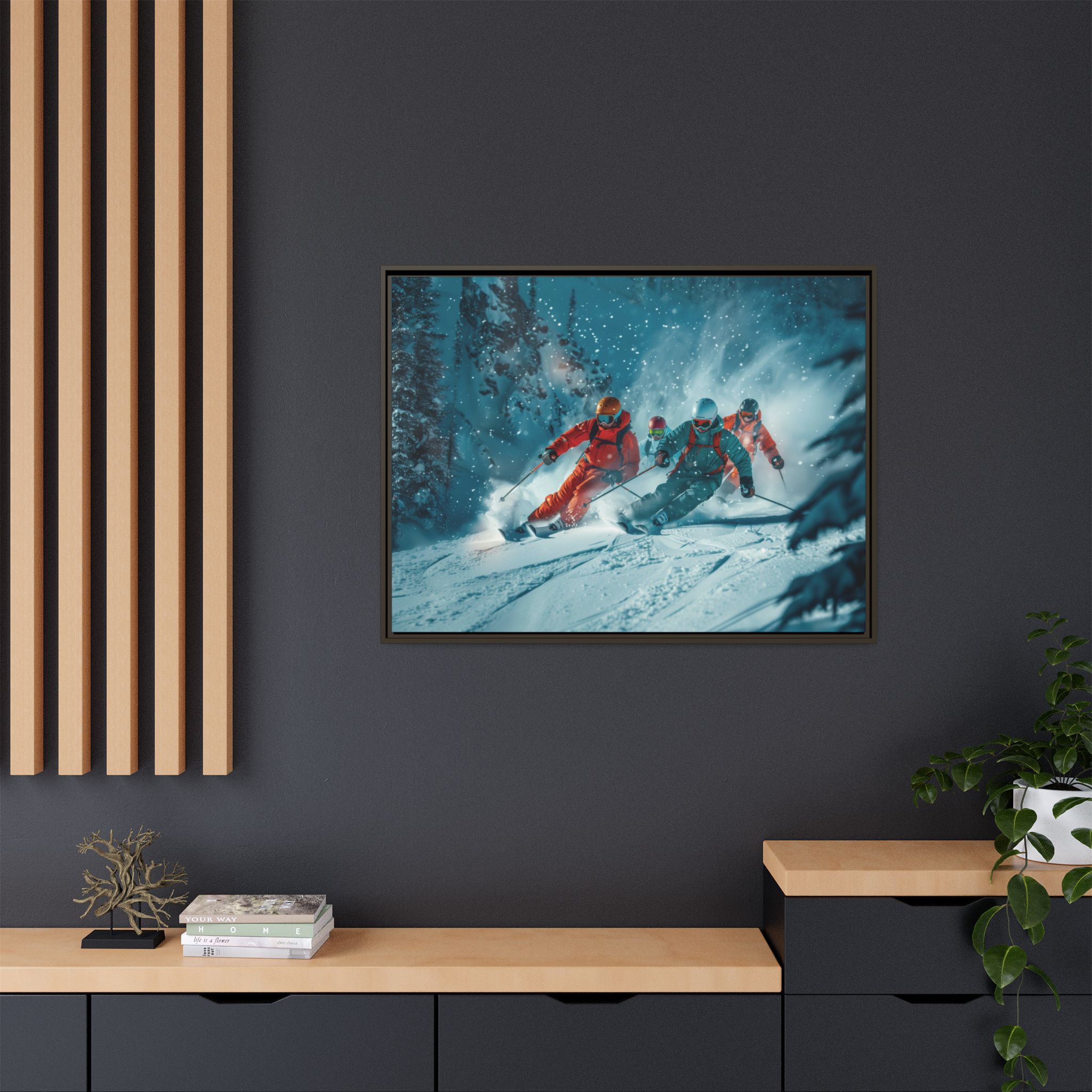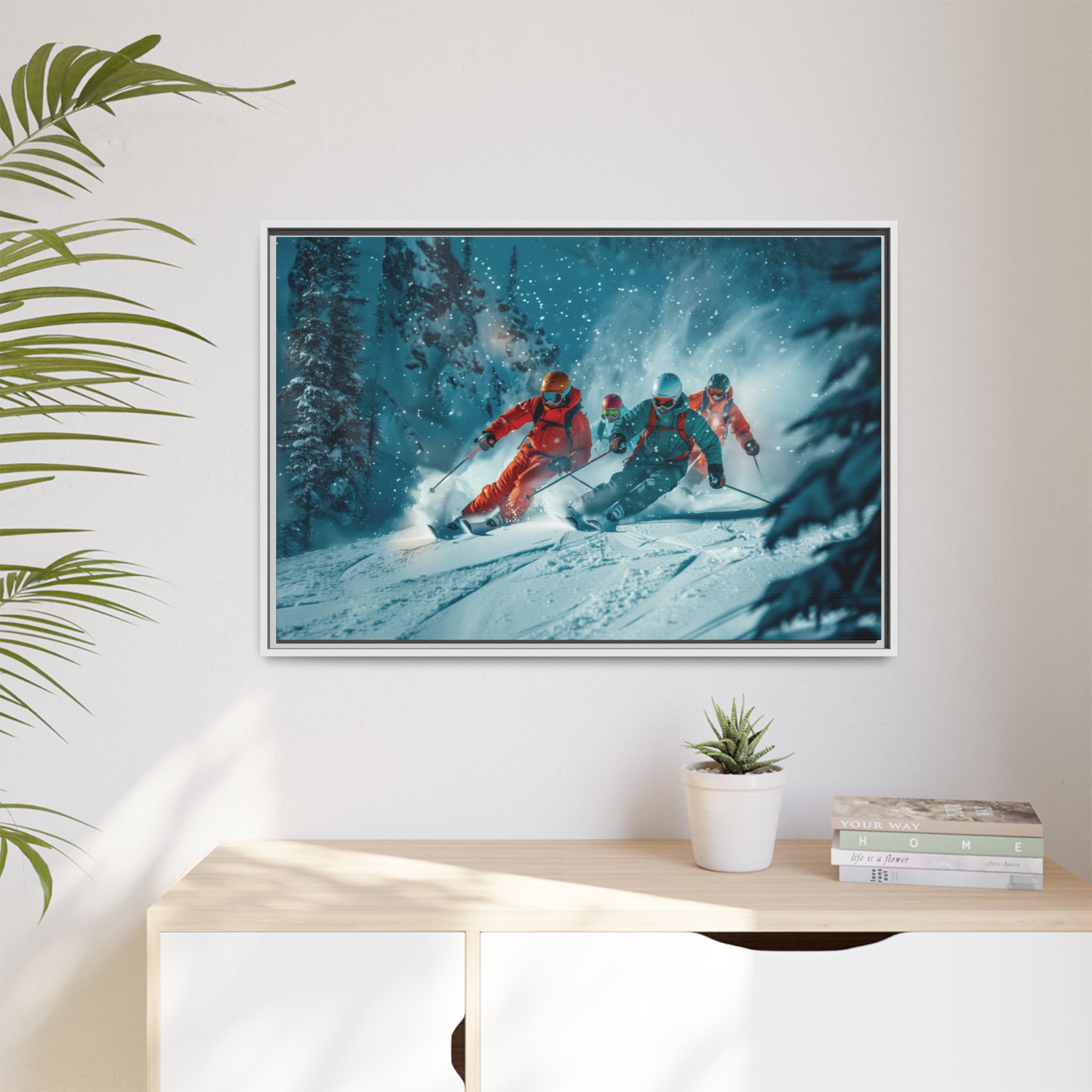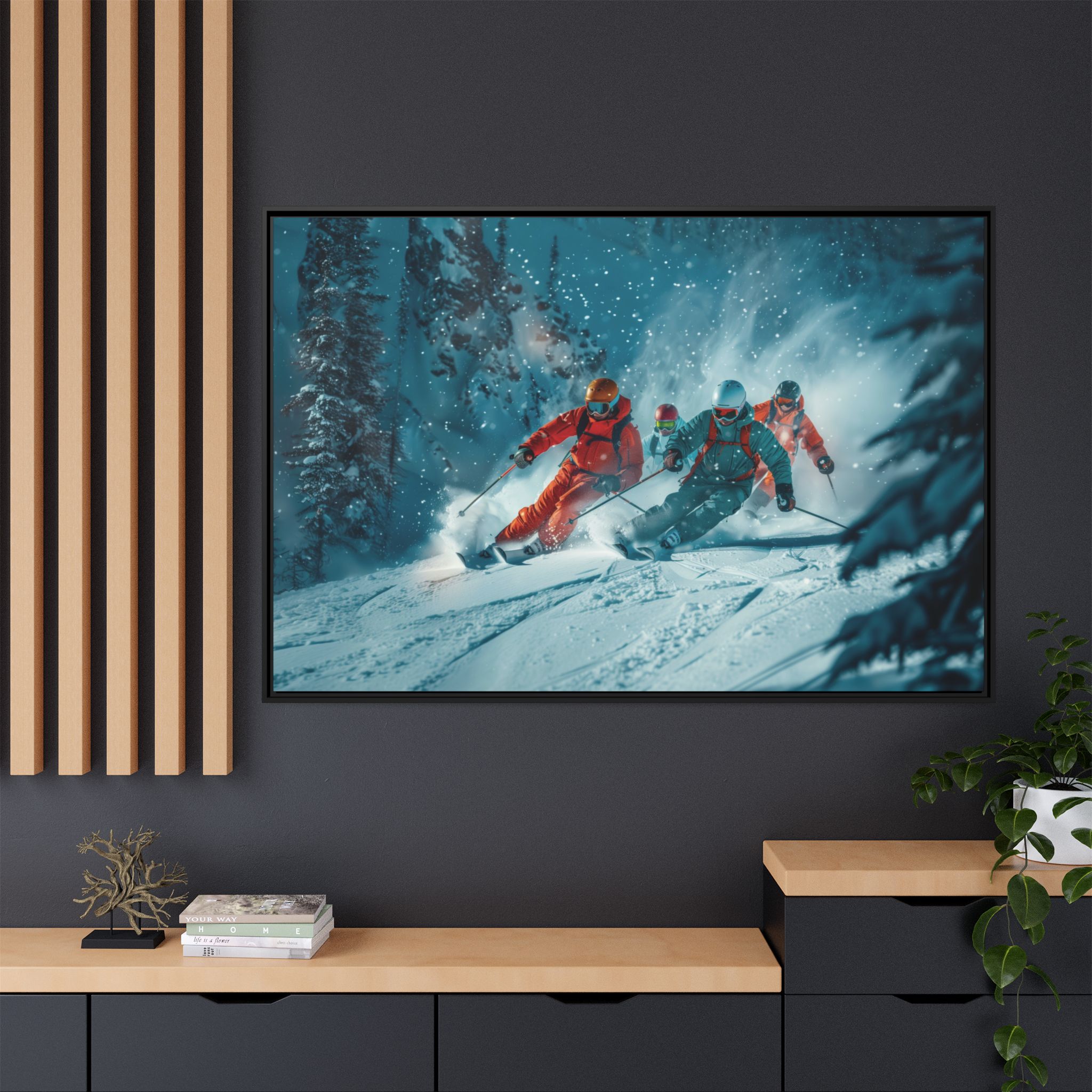 A dynamic action scene of skiers free skiing down the slopes in deep snow, a beutiful action landscape with intensity and excitement. The high-speed motion creates swirling snow clouds around them as they land on a snowy mountain slope. Experience the excitement of skiing with this dynamic action style canvas print. Perfect for adrenaline junkies and winter sports enthusiasts, this canvas brings intensity and motion to any room. Ideal for winter decor, sports enthusiasts, and anyone looking to add a thrilling touch to their space.
